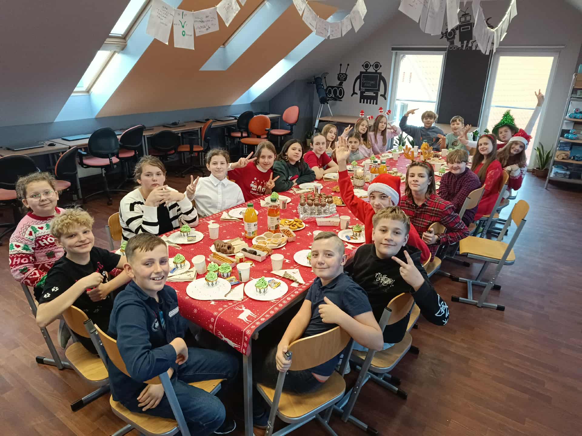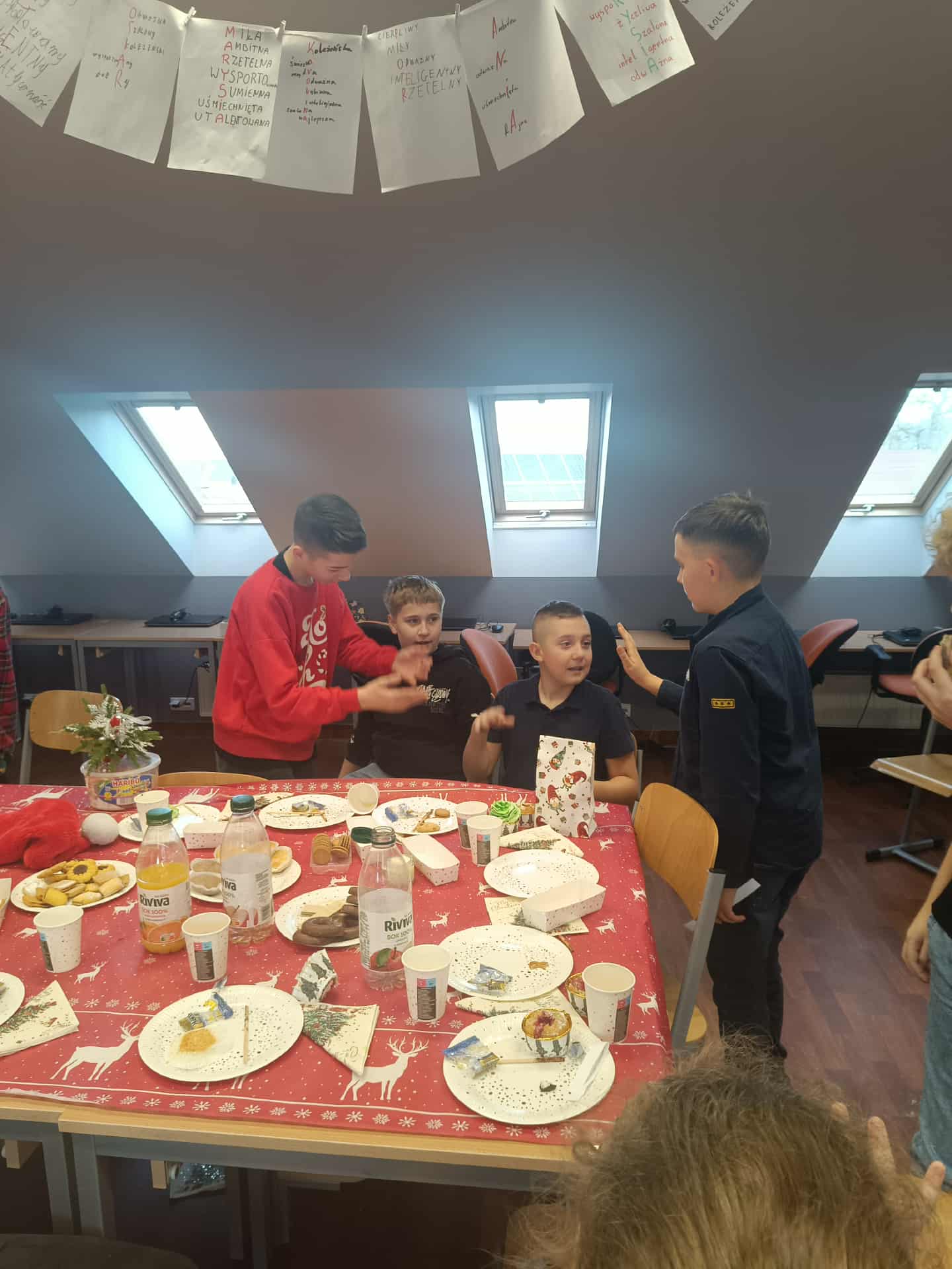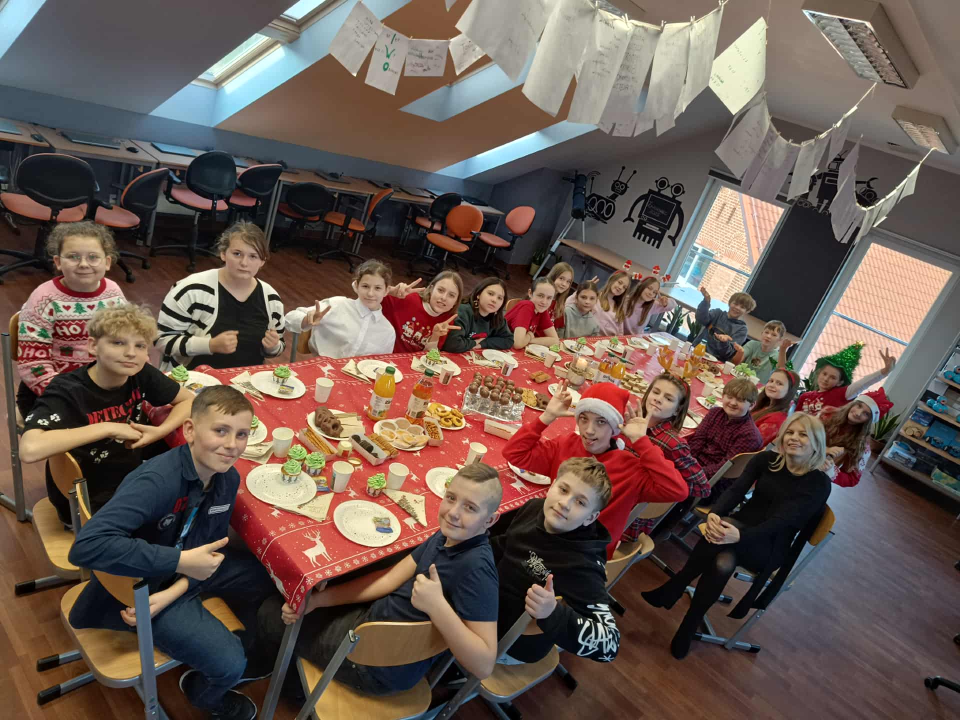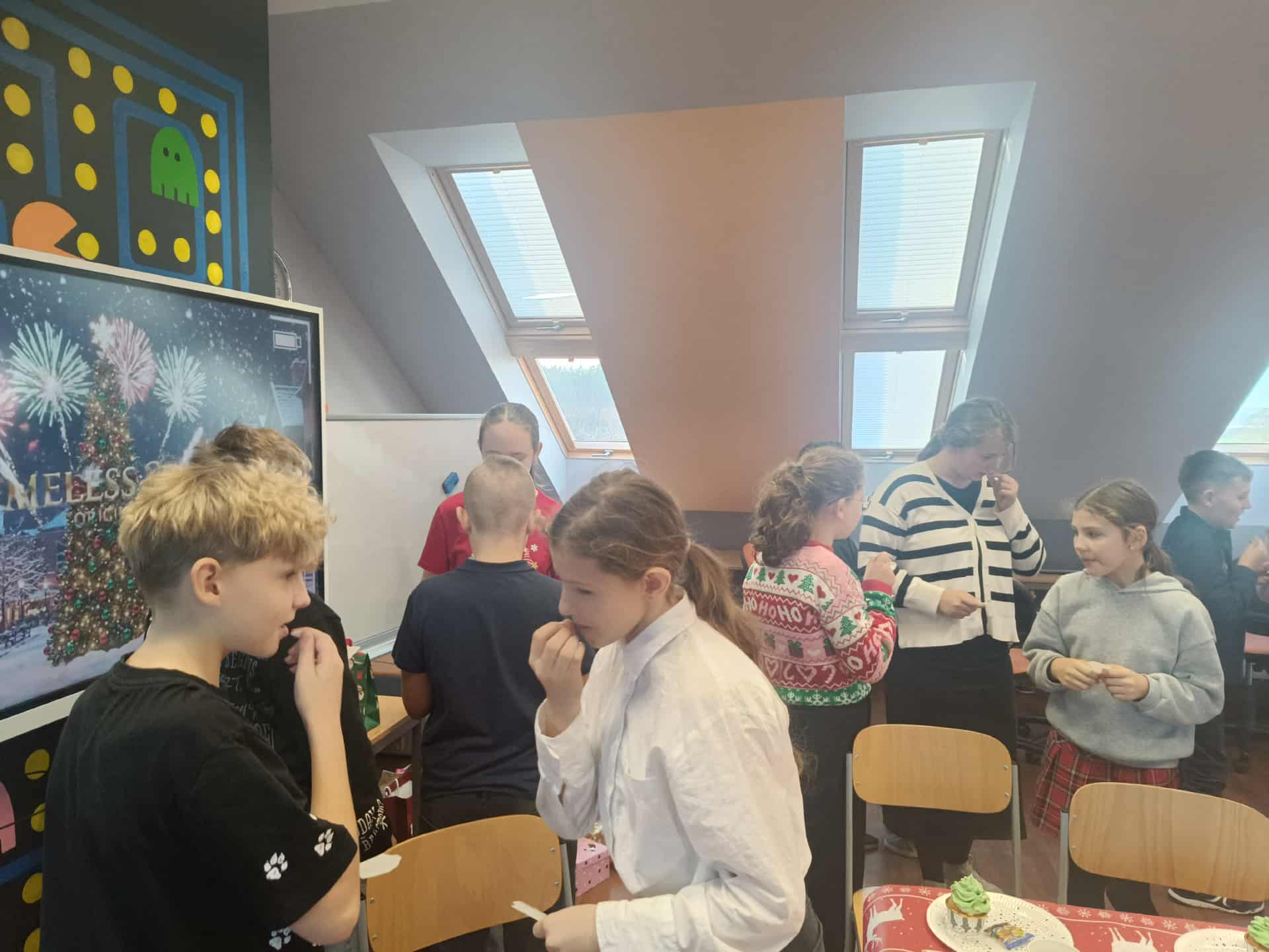 W klasach 4–8 unosił się zapach świąt – nie tylko pierników i domowych słodkości, ale przede wszystkim 𝐳𝐚𝐩𝐚𝐜𝐡 𝐛𝐥𝐢𝐬𝐤𝐨𝐬́𝐜𝐢. Stoły, przy których na co dzień siedzimy osobno, dziś połączyły nas w krąg rozmów, uśmiechów i cichych wzruszeń. Lampki migotały jakby wolniej, a czas – na moment – pozwolił nam być naprawdę 𝐫𝐚𝐳𝐞𝐦 ✨