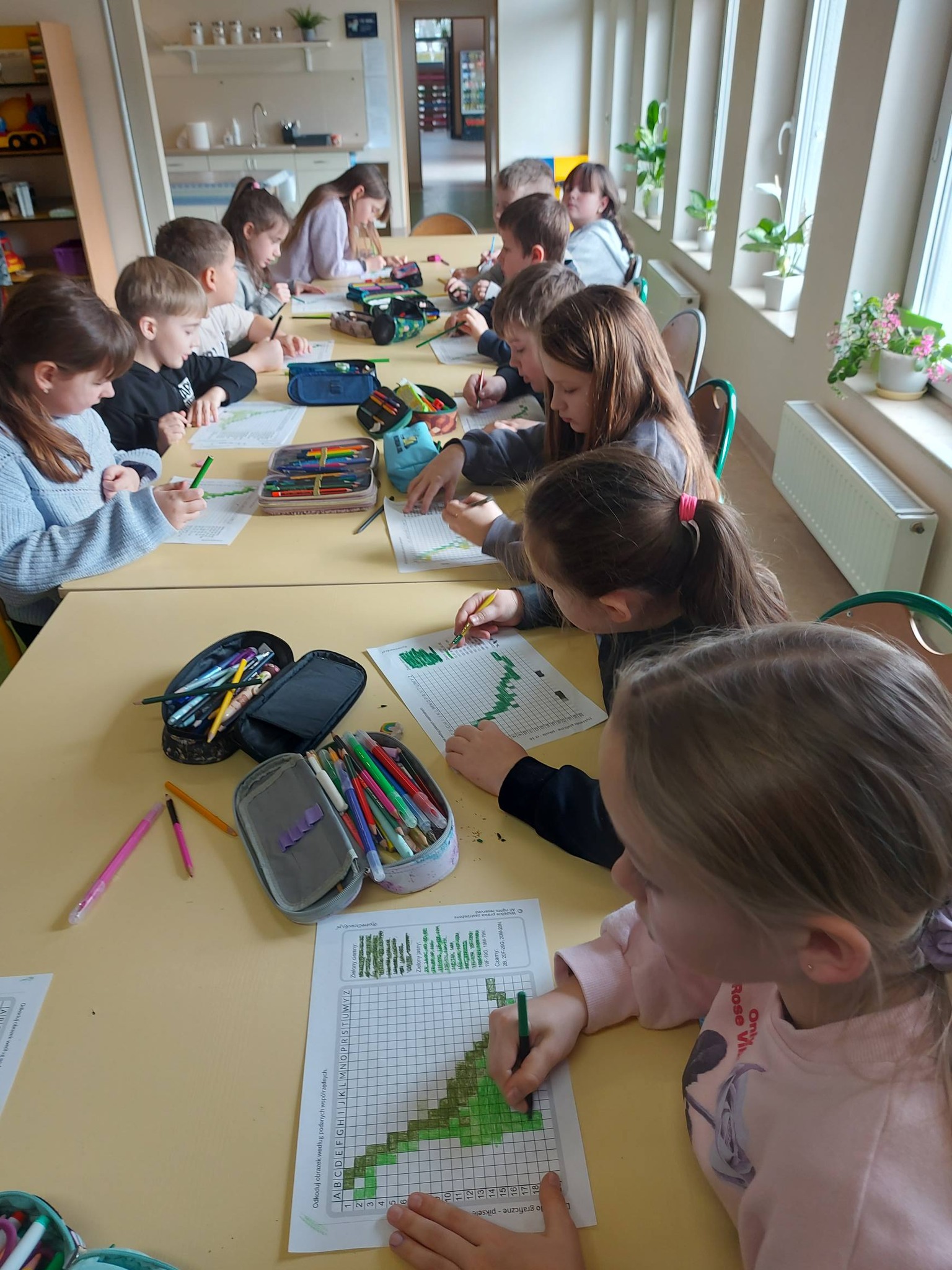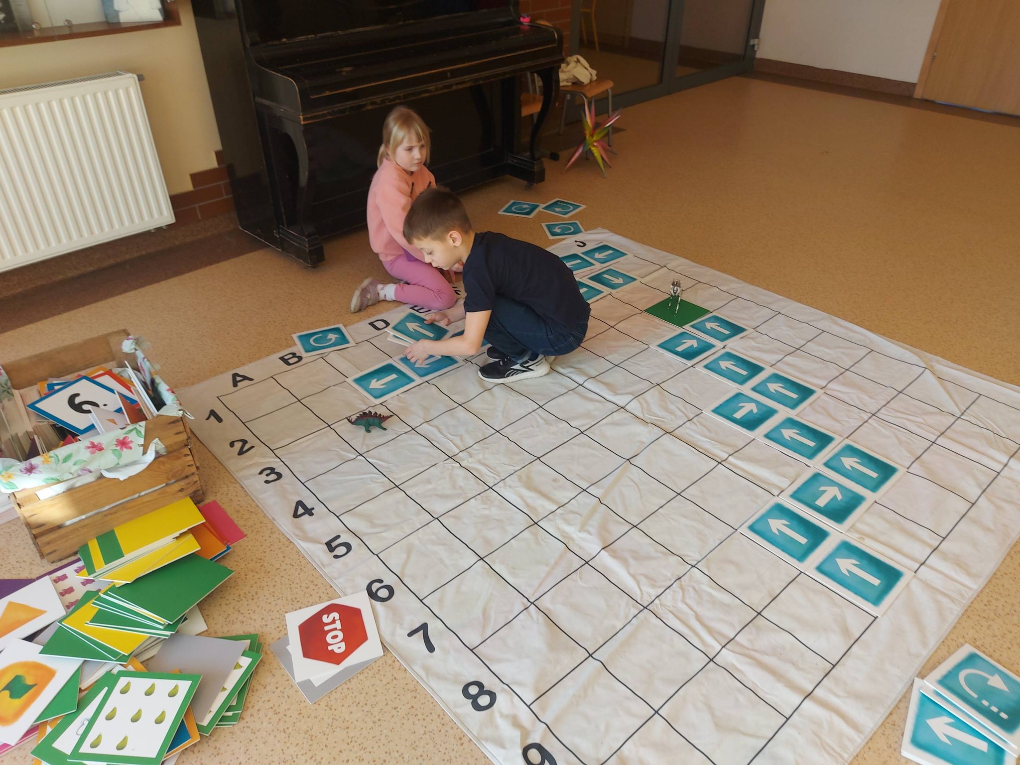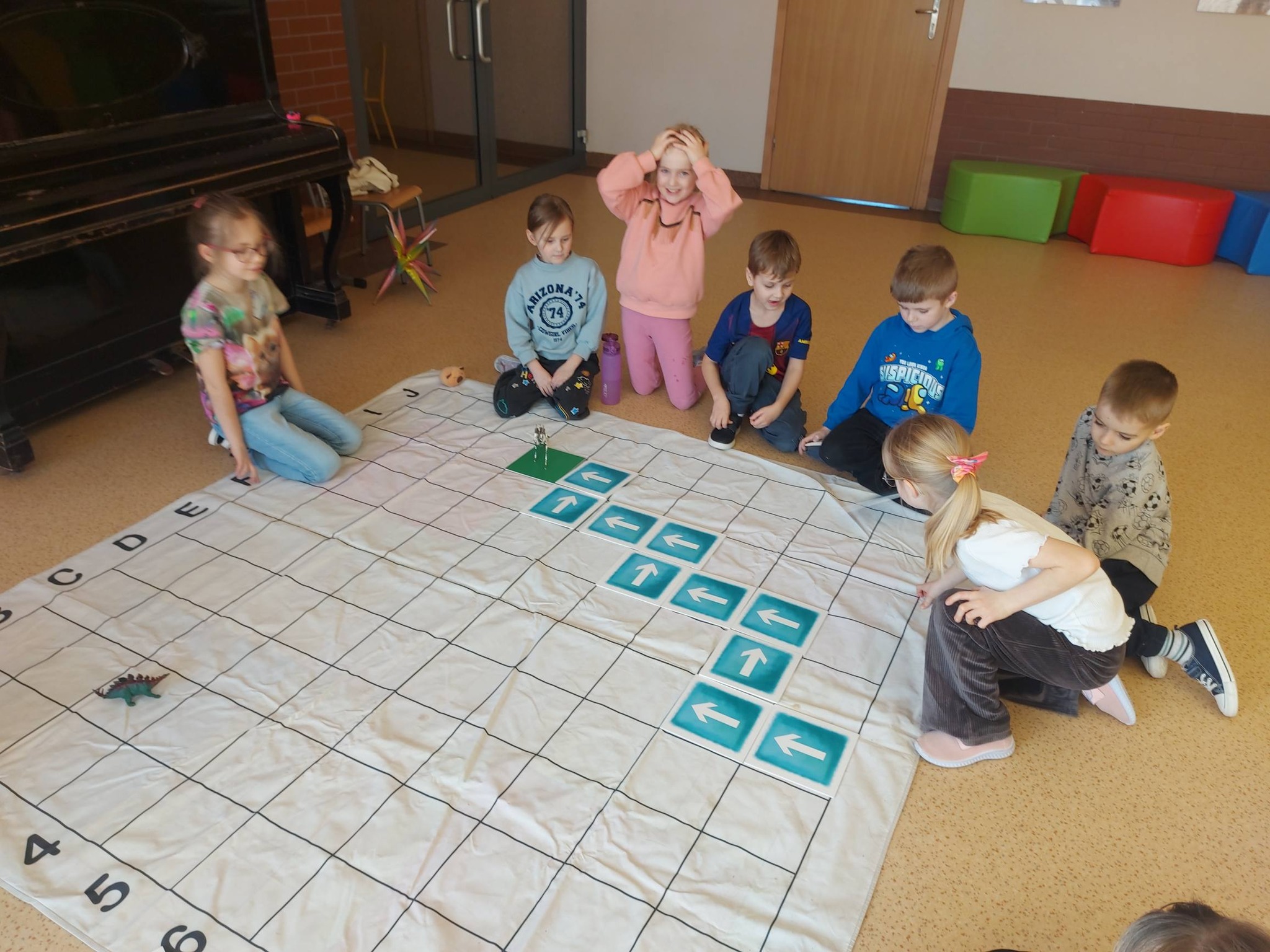 Nie zabrakło również logicznych wyzwań! 🧠💡 Dzieci kodowały drogę dinozaurów na macie edukacyjnej oraz na kartach pracy 🟩➡️⬆️⬇️, rozwijając przy tym umiejętność planowania, myślenia przestrzennego i współpracy 🤝📐. Każda poprawnie zaprogramowana trasa była powodem do dumy i wielkiej radości 🎉👏.
