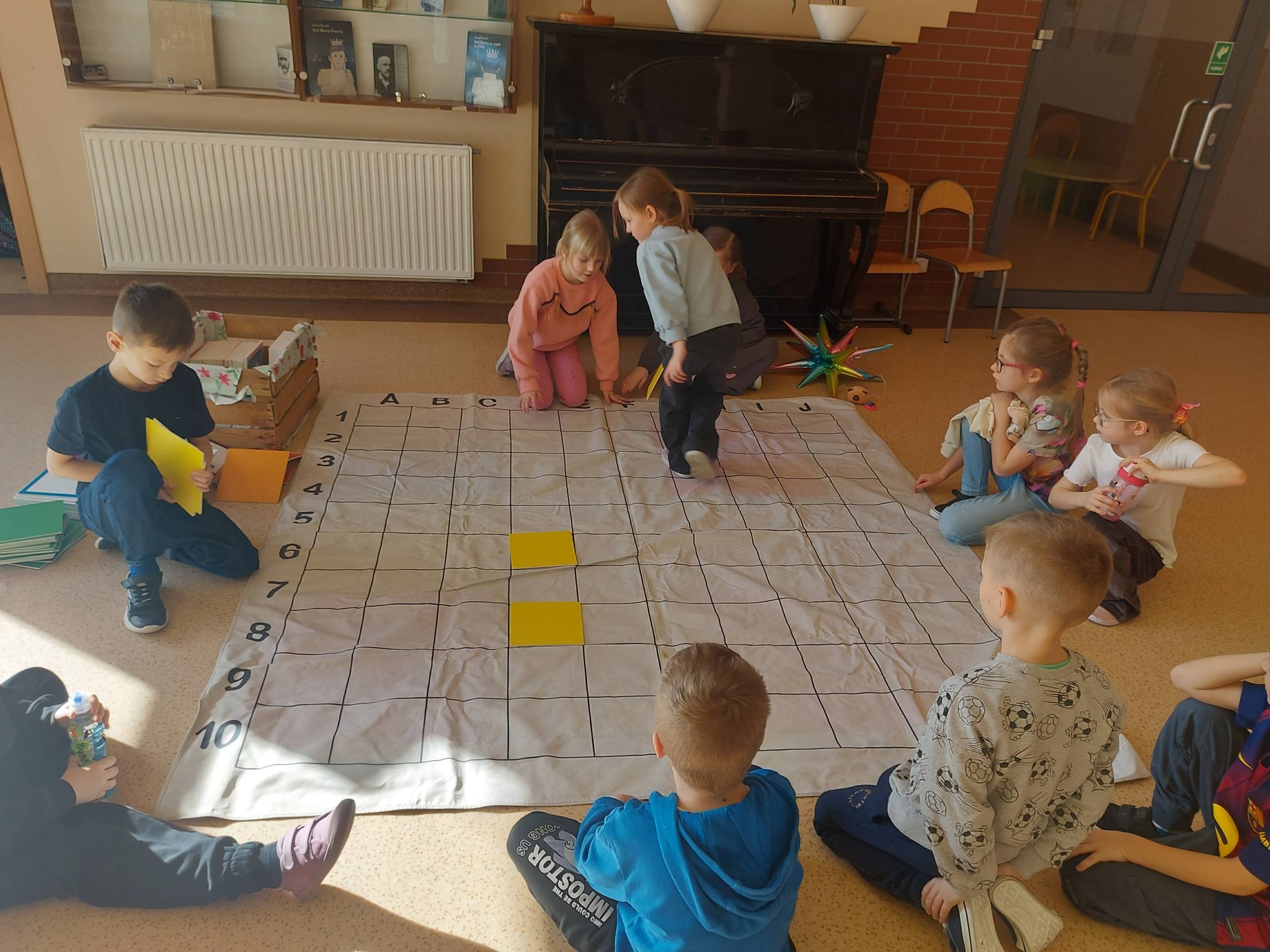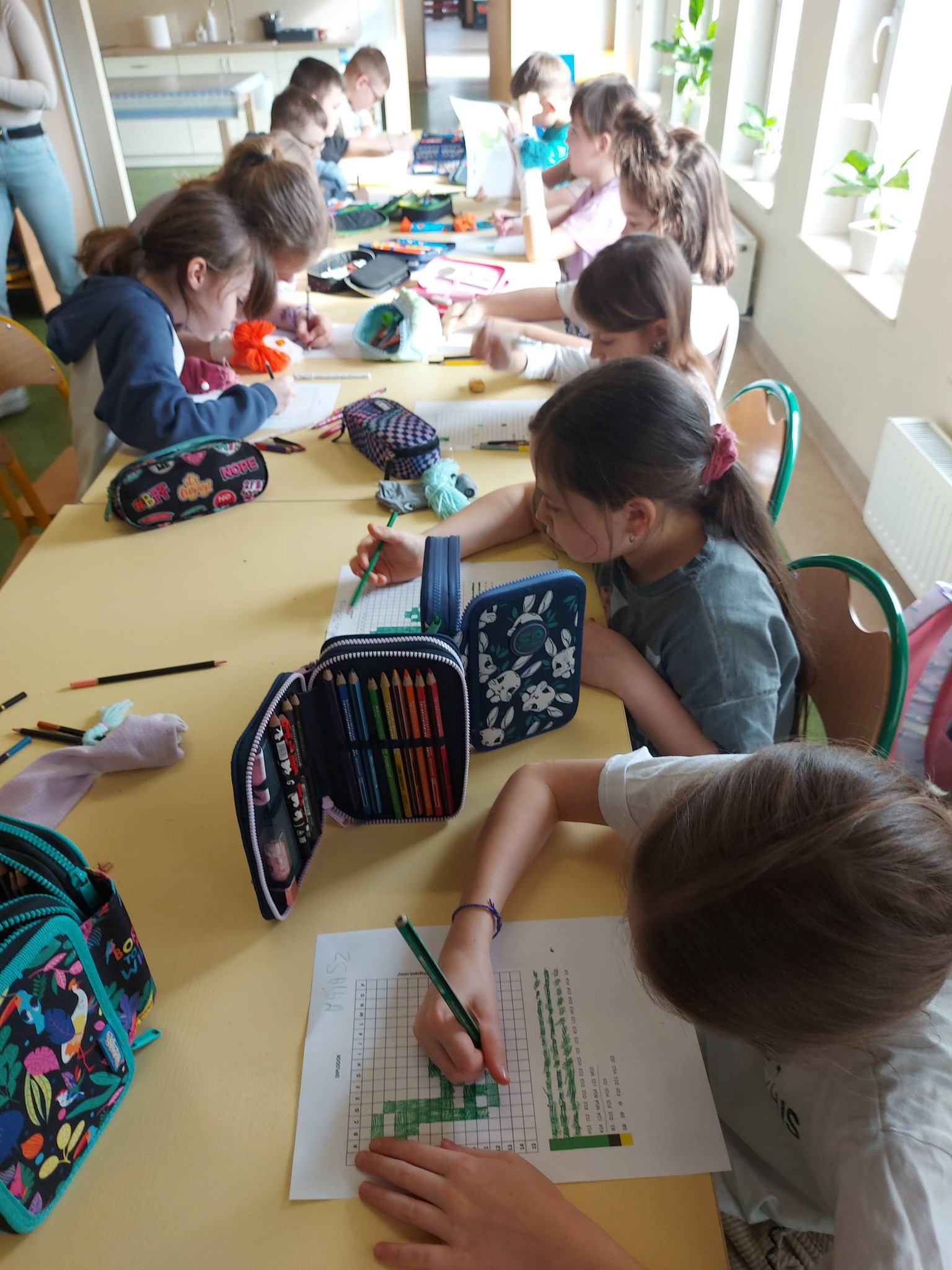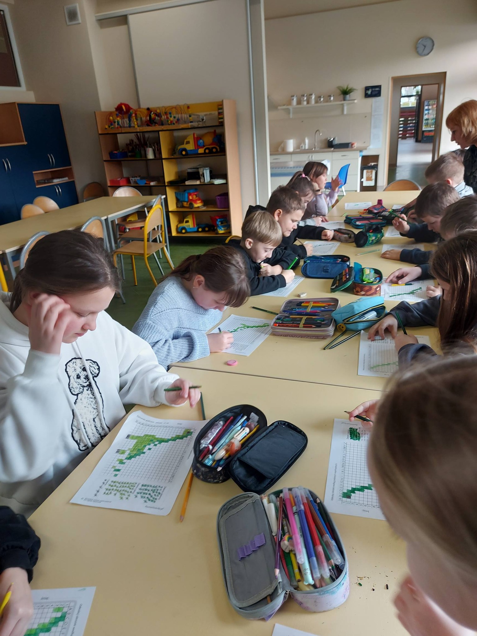 Nie zabrakło również logicznych wyzwań! 🧠💡 Dzieci kodowały drogę dinozaurów na macie edukacyjnej oraz na kartach pracy 🟩➡️⬆️⬇️, rozwijając przy tym umiejętność planowania, myślenia przestrzennego i współpracy 🤝📐. Każda poprawnie zaprogramowana trasa była powodem do dumy i wielkiej radości 🎉👏.