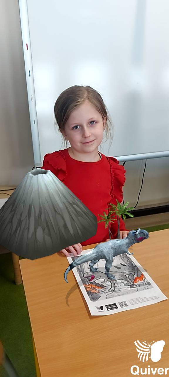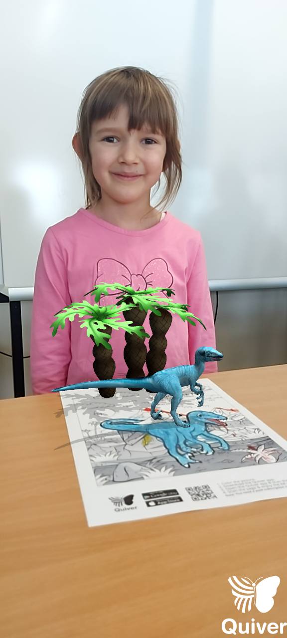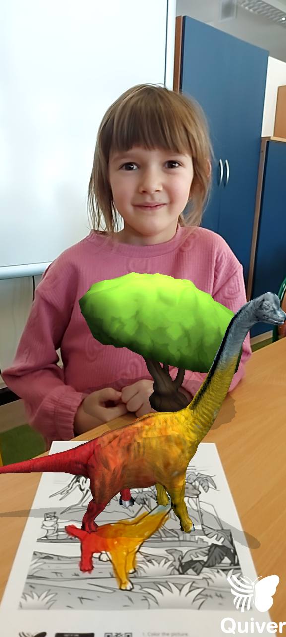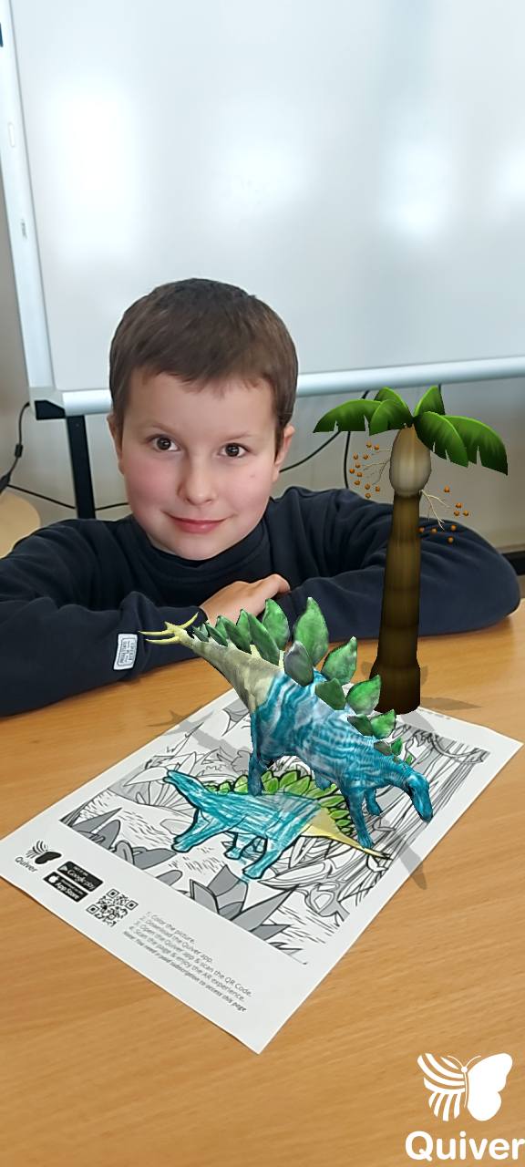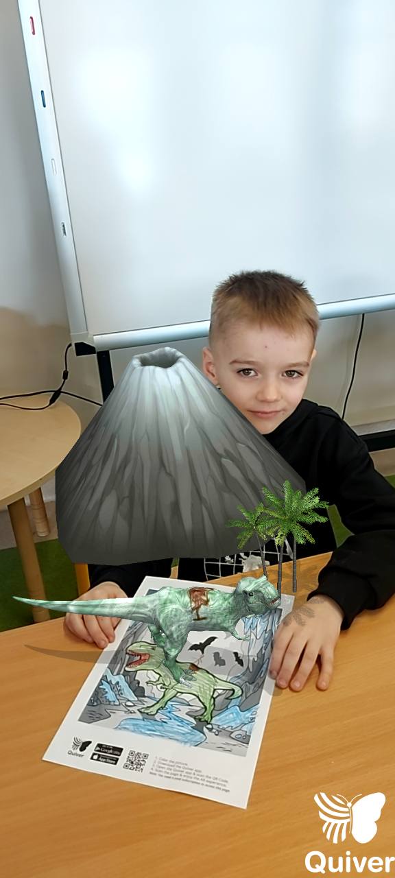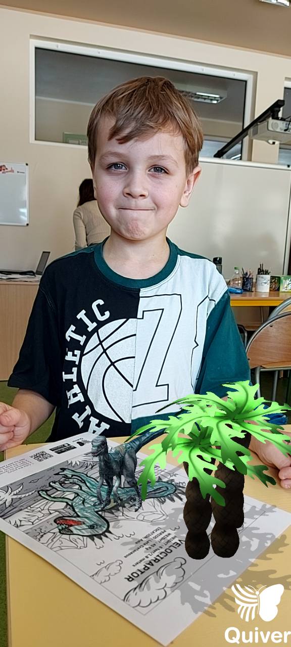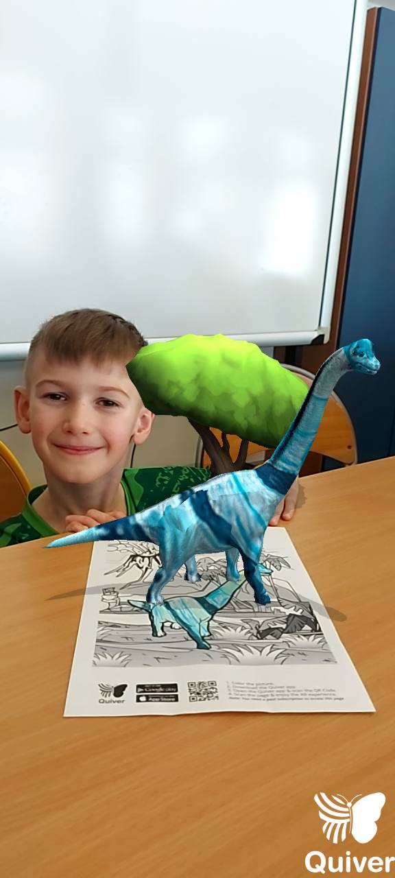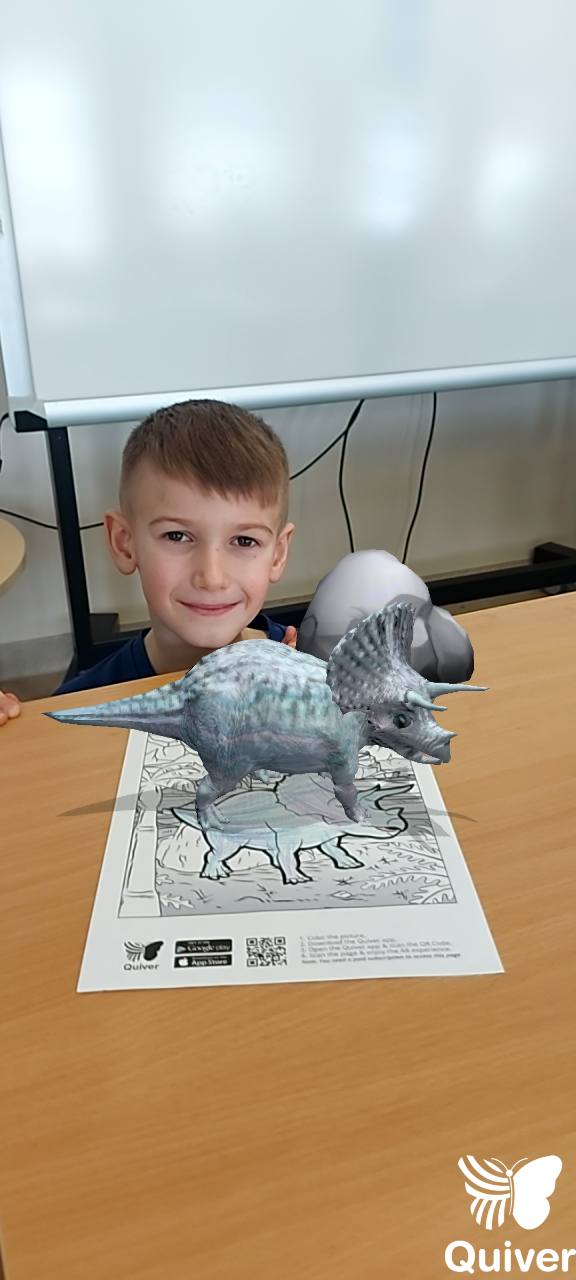 Prawdziwą „magią” okazała się jednak praca z aplikacją Quiver 📱✨. Pokolorowane przez dzieci obrazki 🎨 po zeskanowaniu ożywały na ekranie – dinozaury poruszały się, oddychały i wyglądały tak realistycznie, jakby właśnie wyszły z prehistorycznego lasu! 🌴🦕 Zachwytom nie było końca! 😍👏