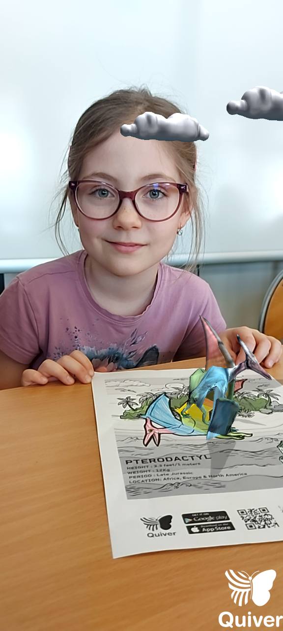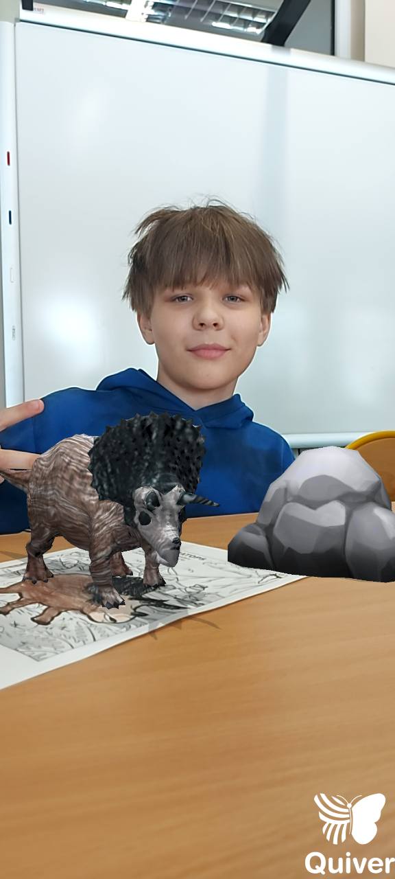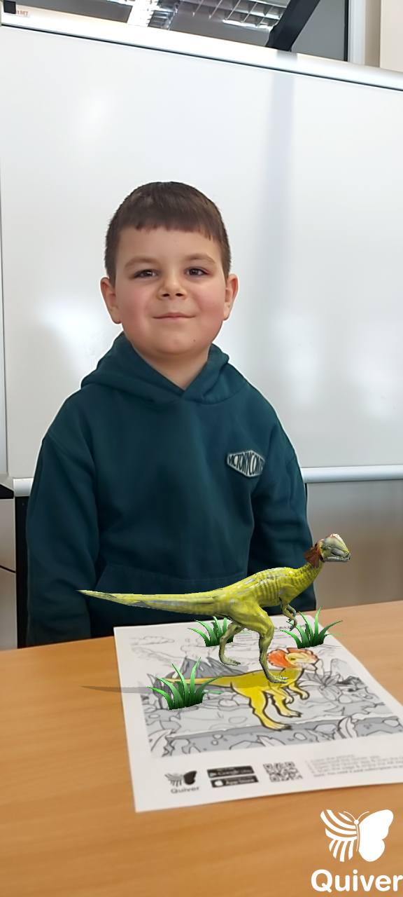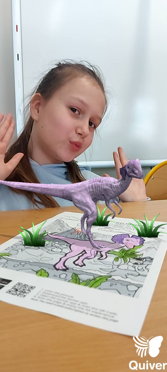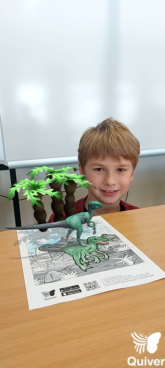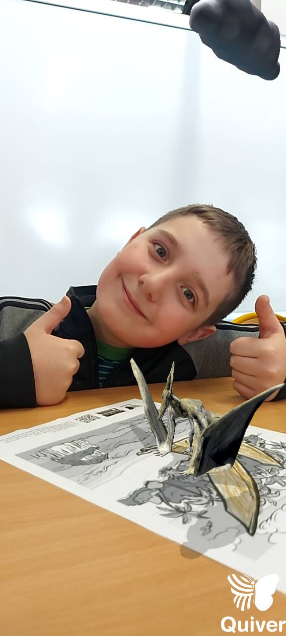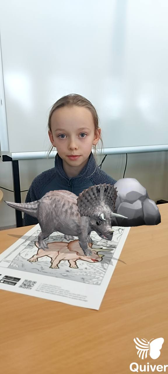Prawdziwą „magią” okazała się jednak praca z aplikacją Quiver 📱✨. Pokolorowane przez dzieci obrazki 🎨 po zeskanowaniu ożywały na ekranie – dinozaury poruszały się, oddychały i wyglądały tak realistycznie, jakby właśnie wyszły z prehistorycznego lasu! 🌴🦕 Zachwytom nie było końca! 😍👏
