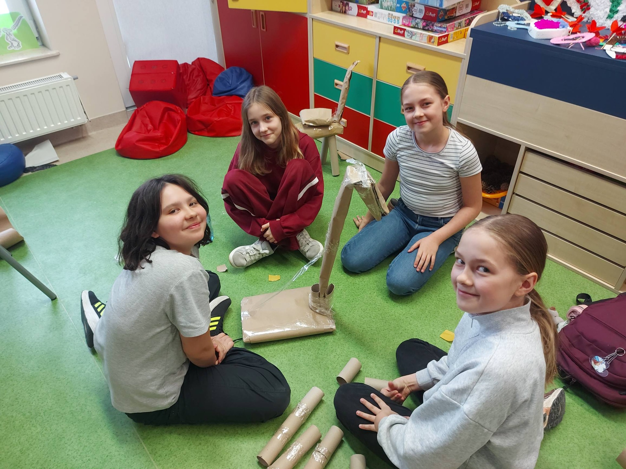 Uczniowie z ogromnym zaangażowaniem tworzyli przestrzenne prace plastyczne 3D 🎨✂️🧩 – każdy dinozaur był wyjątkowy, kolorowy i pełen charakteru 🌈🦕. Powstały majestatyczne tyranozaury 🦖, przyjazne triceratopsy 🦕 oraz długoszyje diplodoki, które wyglądały jak gotowe do wyruszenia w podróż przez miliony lat historii ⏳🌋.