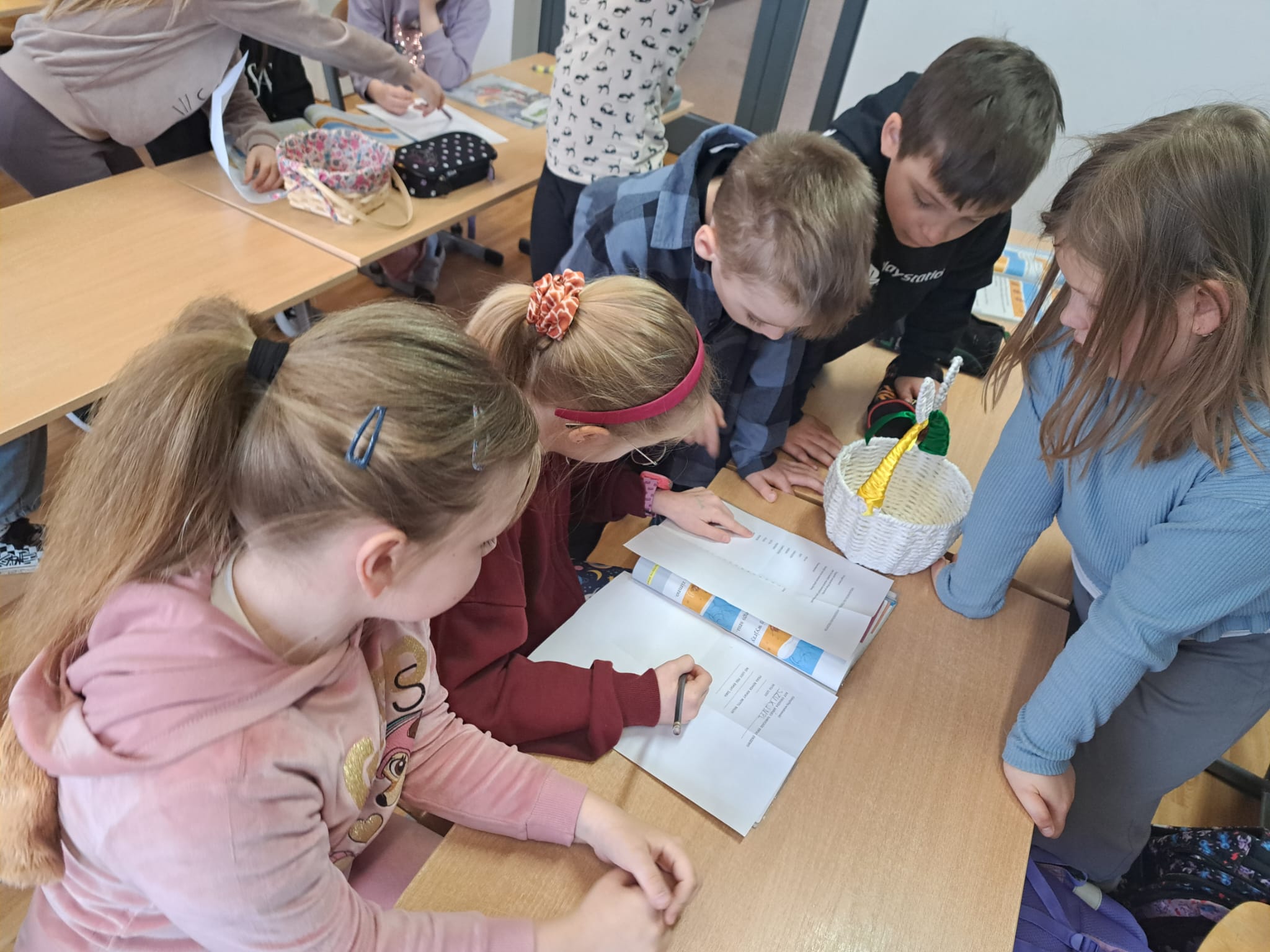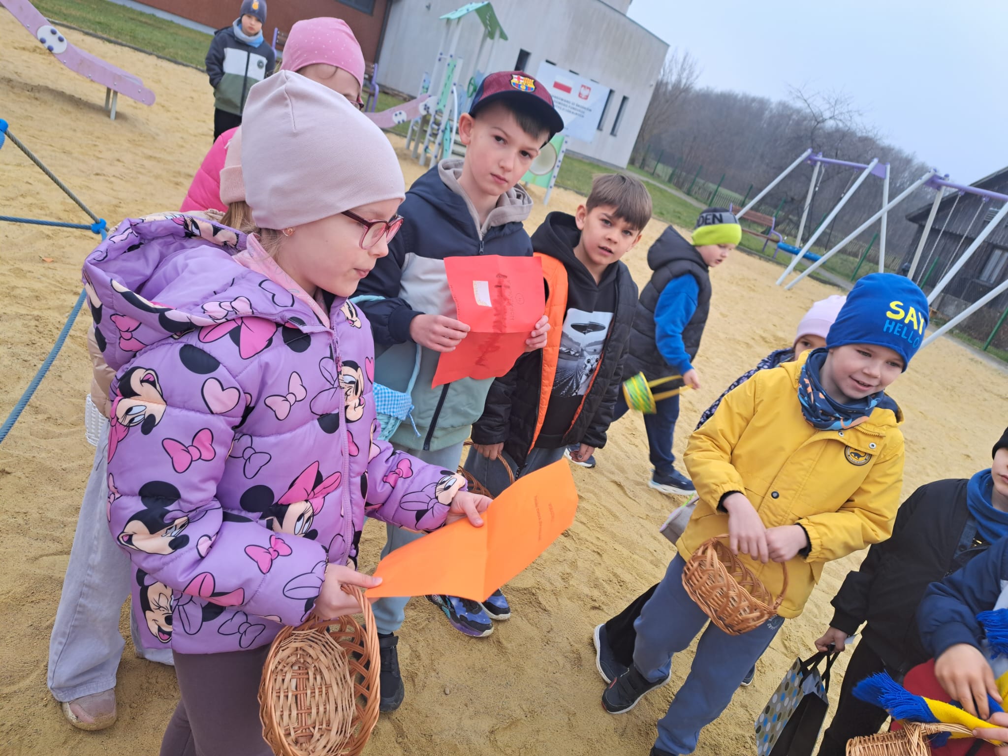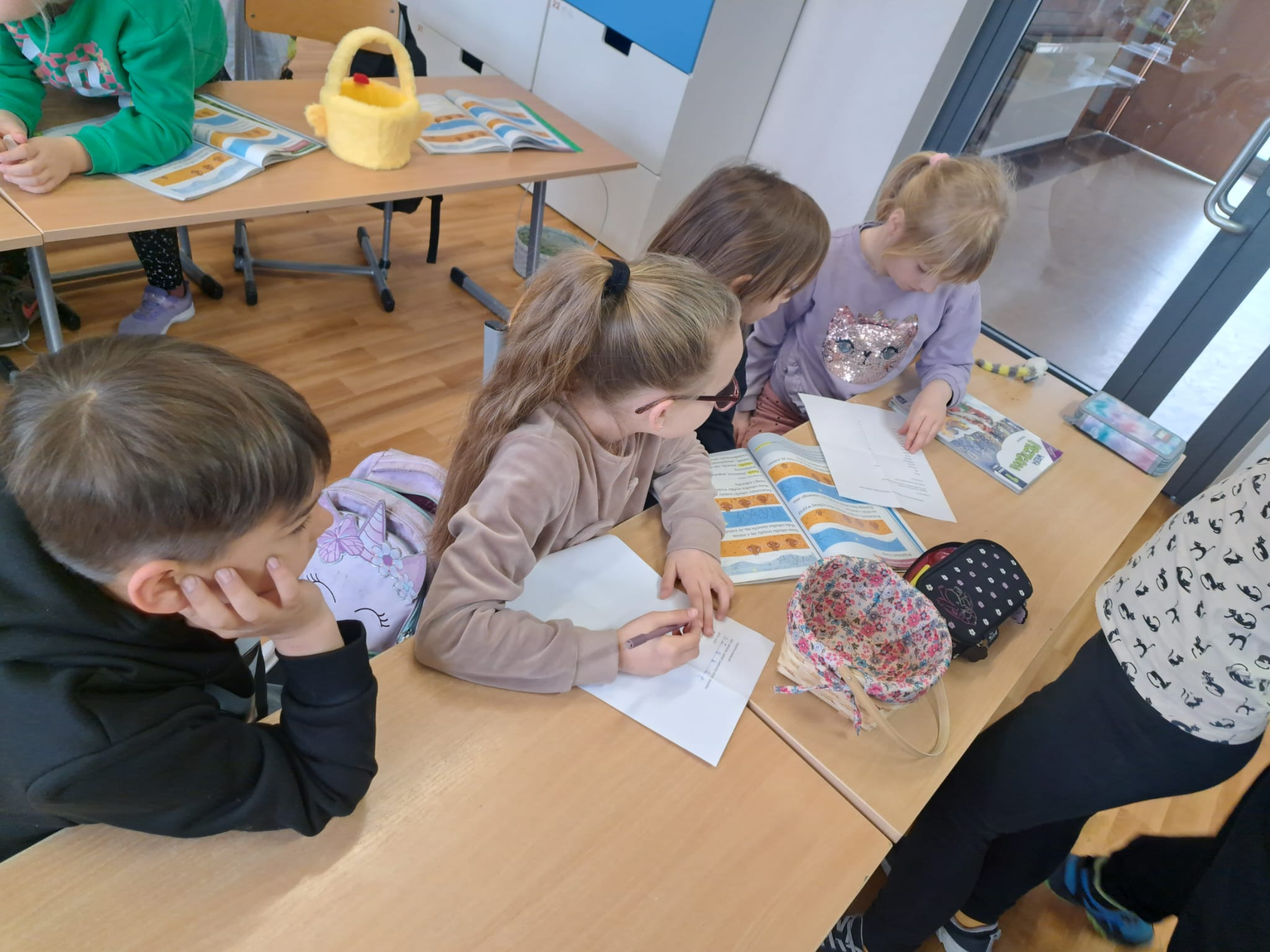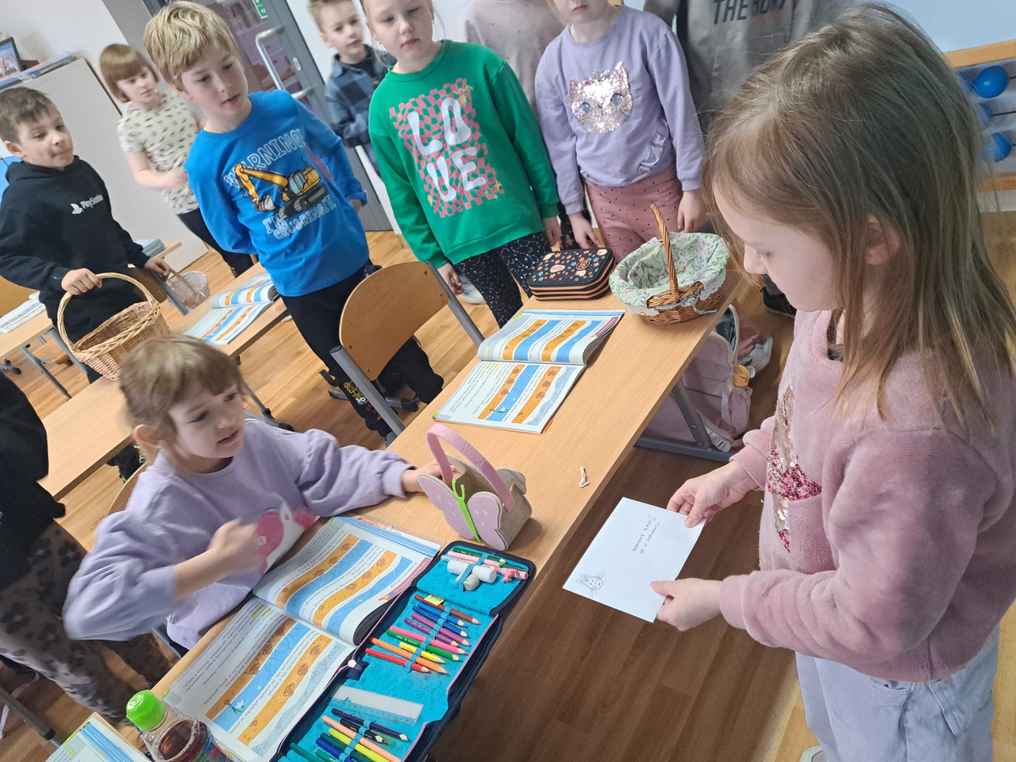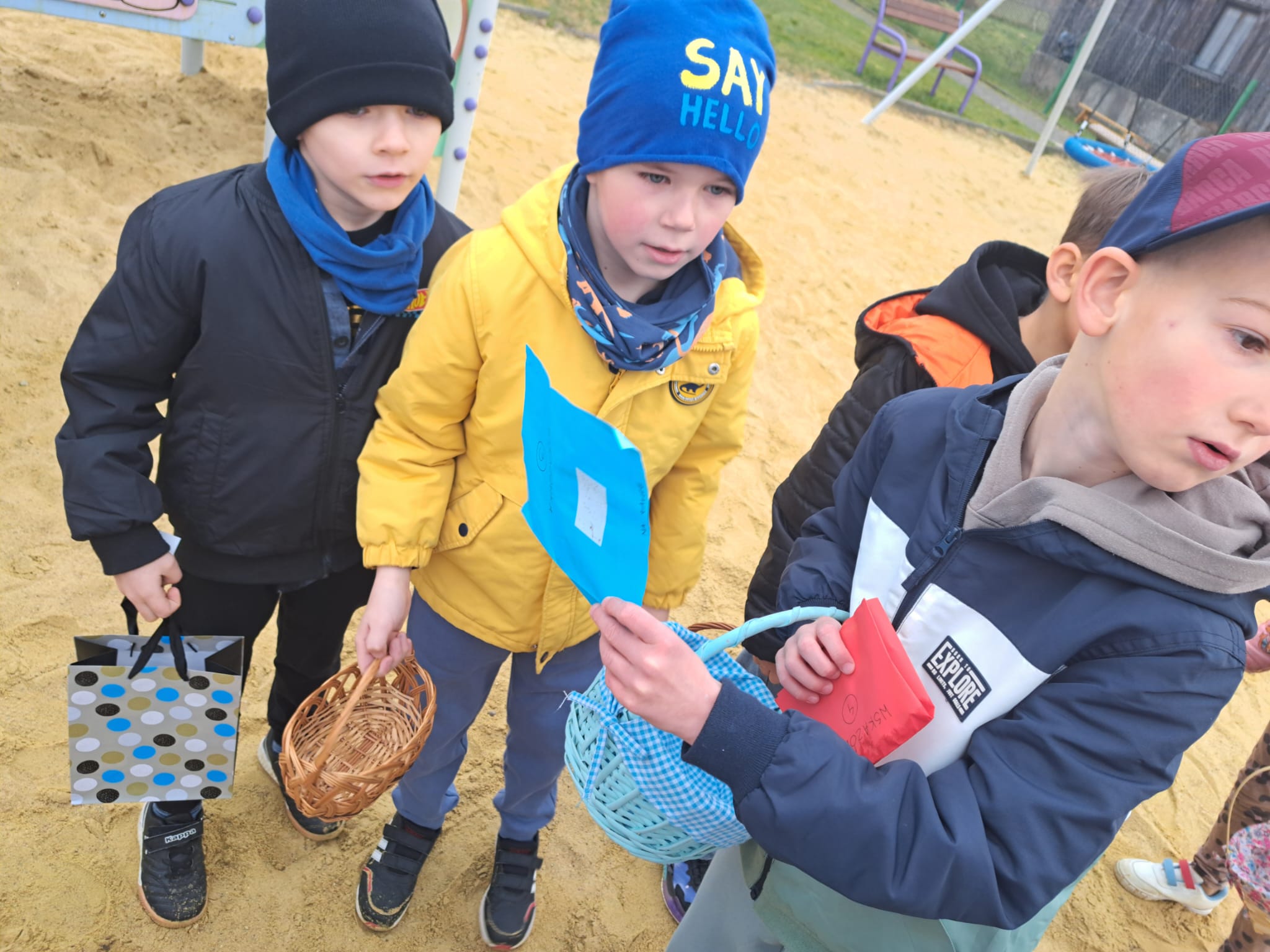 Do klasy pierwszej przykicał Zajączek Wielkanocny i sprawił dzieciom ogromną niespodziankę. Zostawił list z zadaniami do odkodowania, które stanowiły wskazówki prowadzące do miejsc, w których ukrył wielkanocne prezenty. Pierwszoklasiści z wielkim zaangażowaniem rozwiązywali zagadki, a każda poprawna odpowiedź przybliżała ich do odnalezienia kolejnych skrytek.