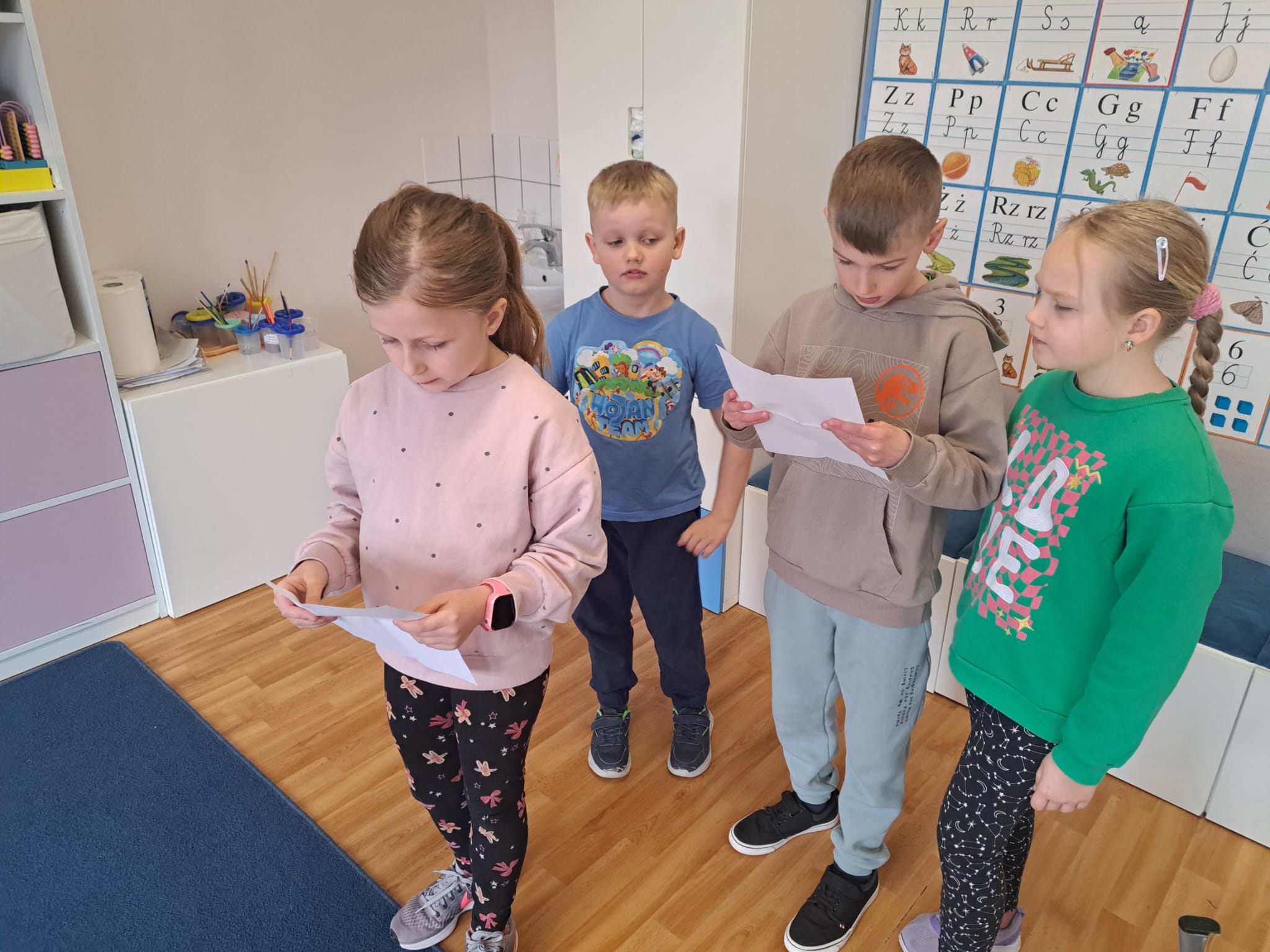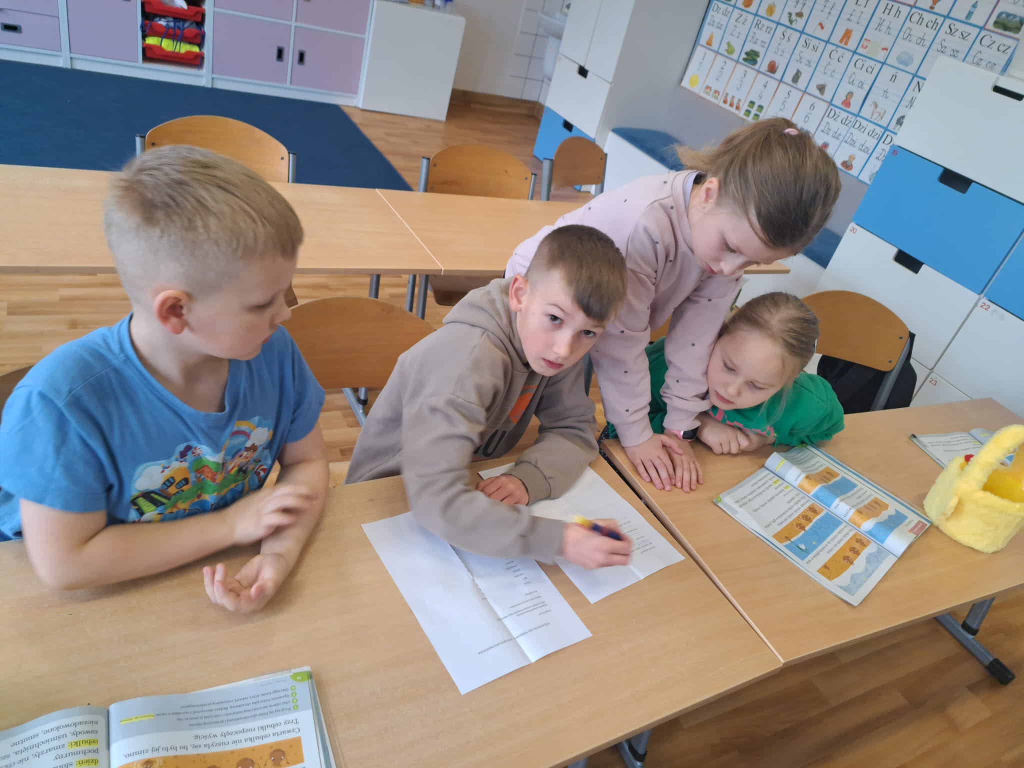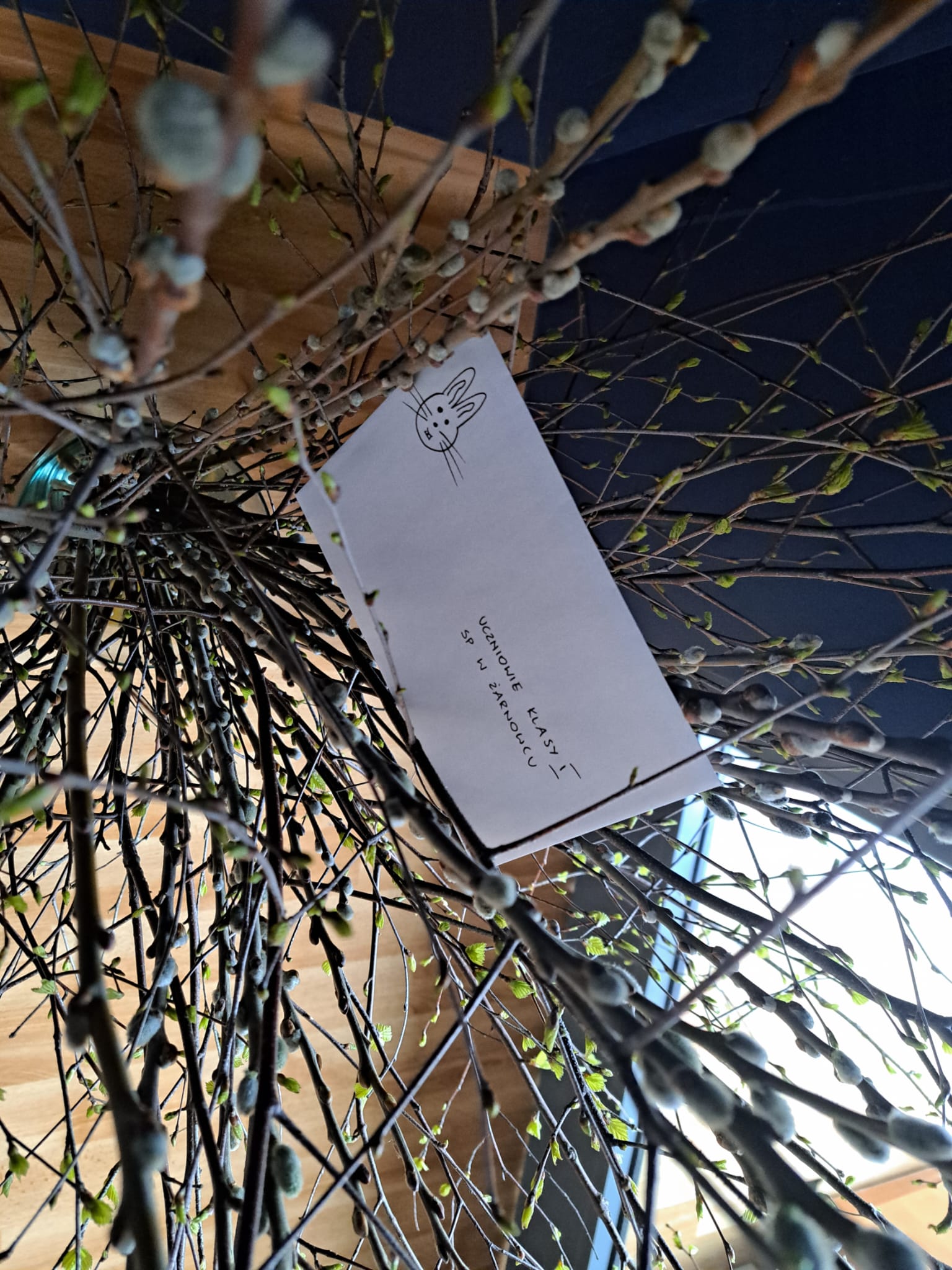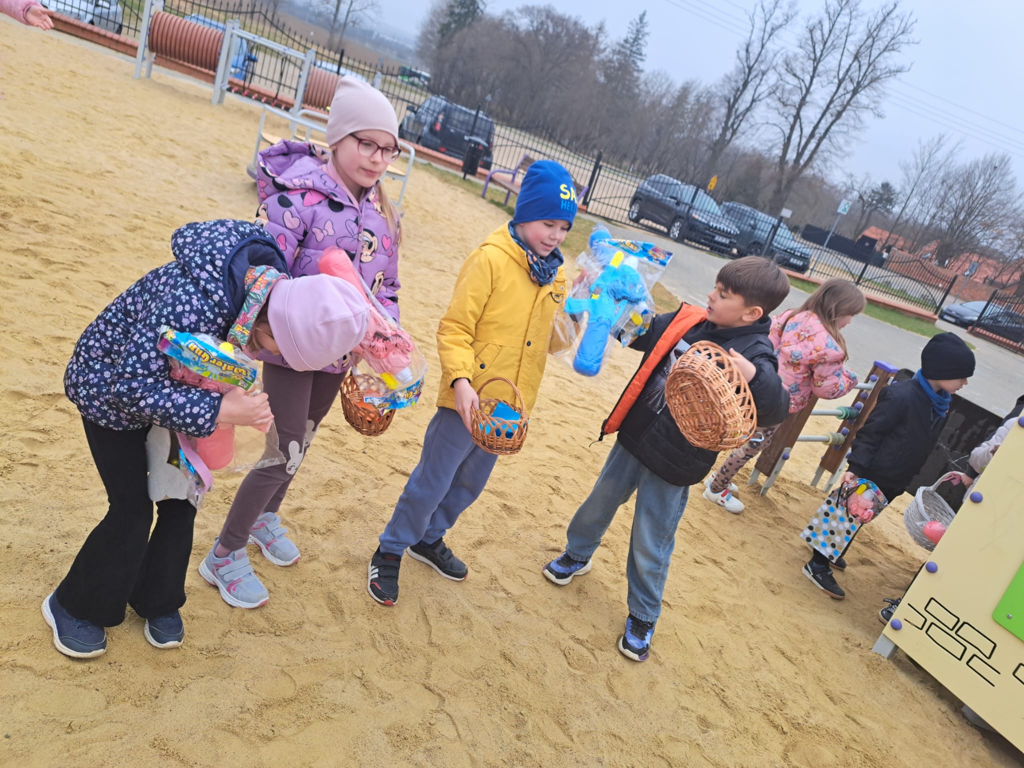 Do klasy pierwszej przykicał Zajączek Wielkanocny i sprawił dzieciom ogromną niespodziankę. Zostawił list z zadaniami do odkodowania, które stanowiły wskazówki prowadzące do miejsc, w których ukrył wielkanocne prezenty. Pierwszoklasiści z wielkim zaangażowaniem rozwiązywali zagadki, a każda poprawna odpowiedź przybliżała ich do odnalezienia kolejnych skrytek.