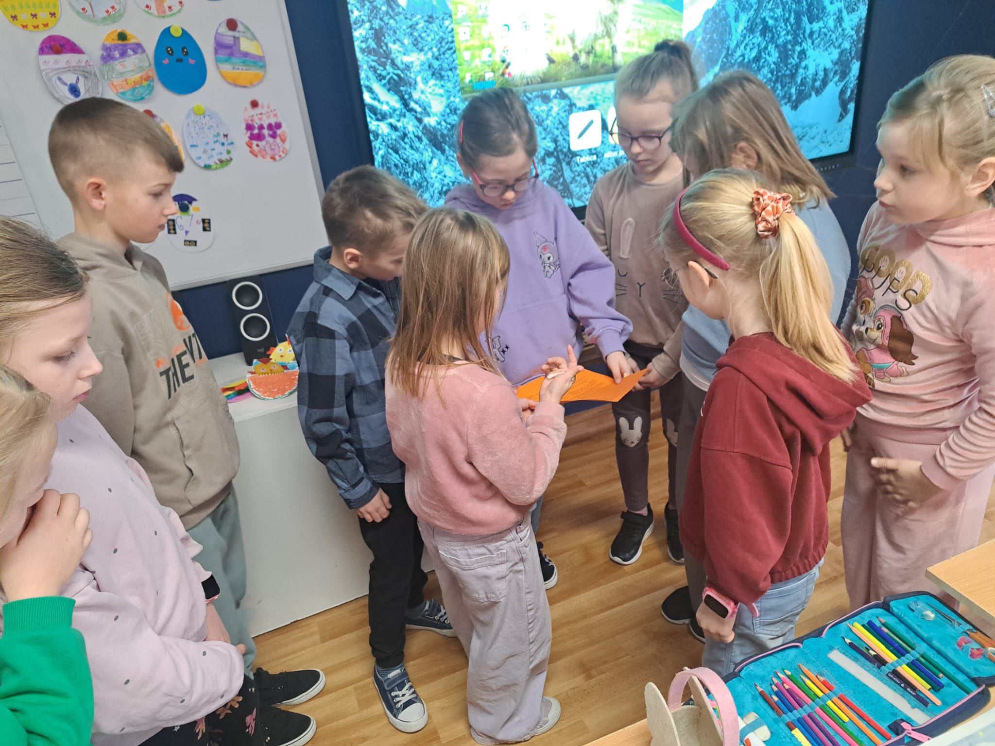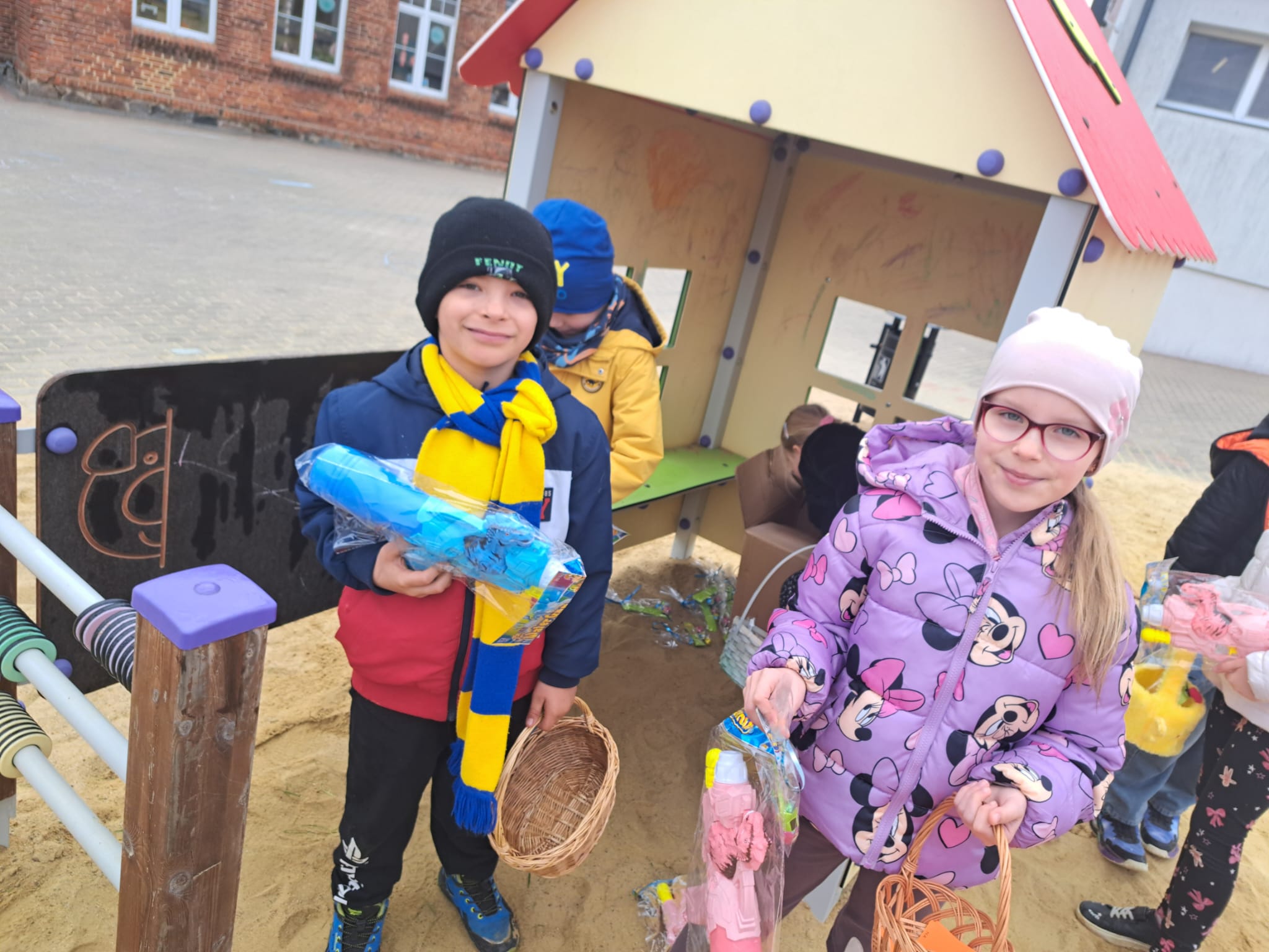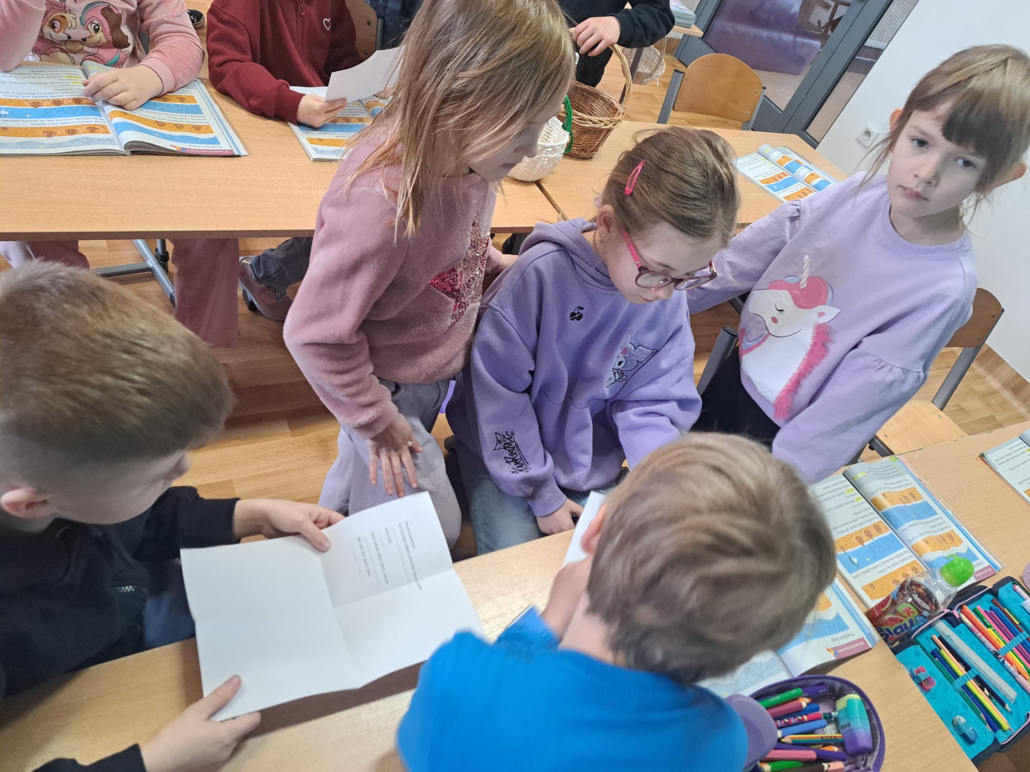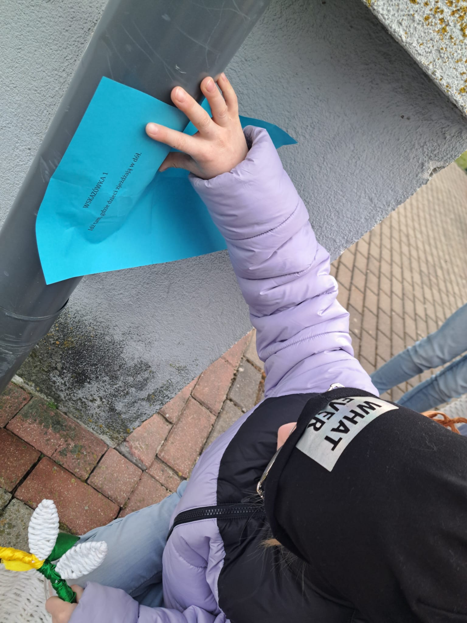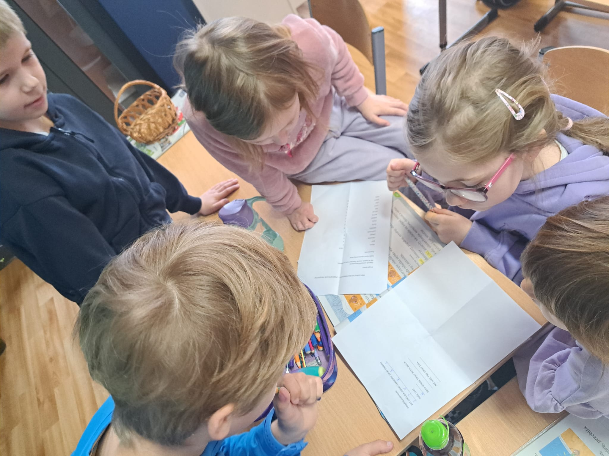 Do klasy pierwszej przykicał Zajączek Wielkanocny i sprawił dzieciom ogromną niespodziankę. Zostawił list z zadaniami do odkodowania, które stanowiły wskazówki prowadzące do miejsc, w których ukrył wielkanocne prezenty. Pierwszoklasiści z wielkim zaangażowaniem rozwiązywali zagadki, a każda poprawna odpowiedź przybliżała ich do odnalezienia kolejnych skrytek.
