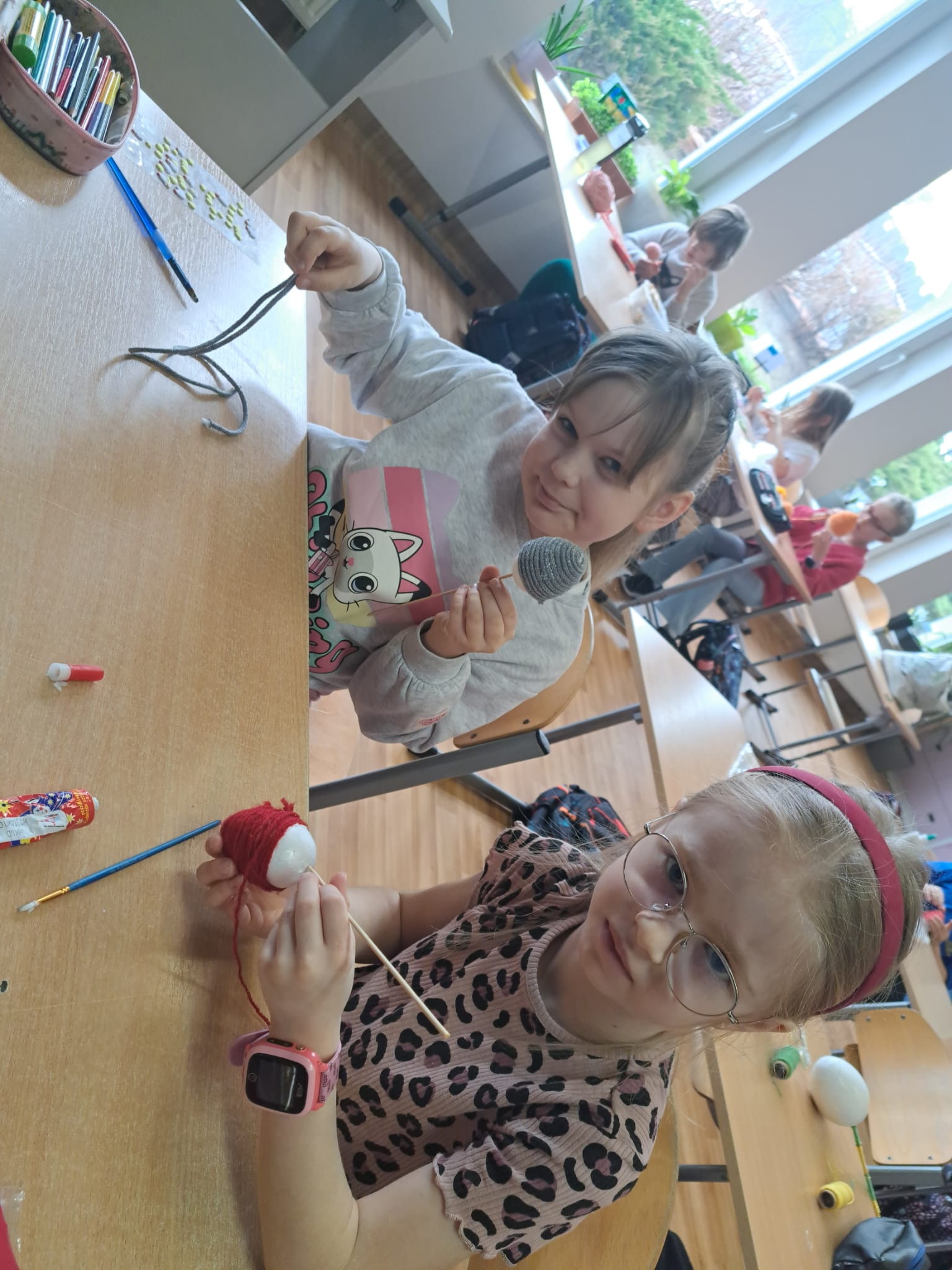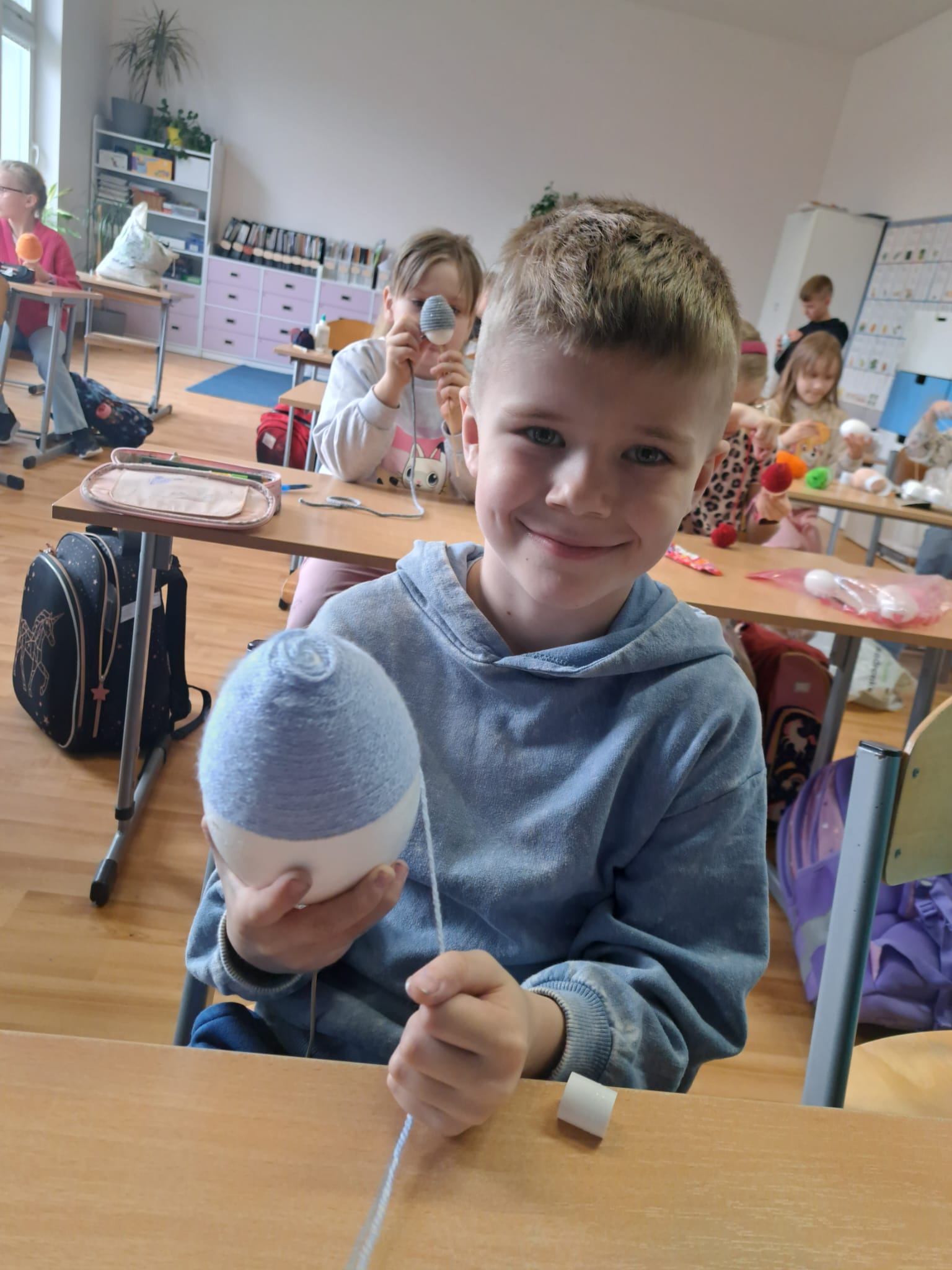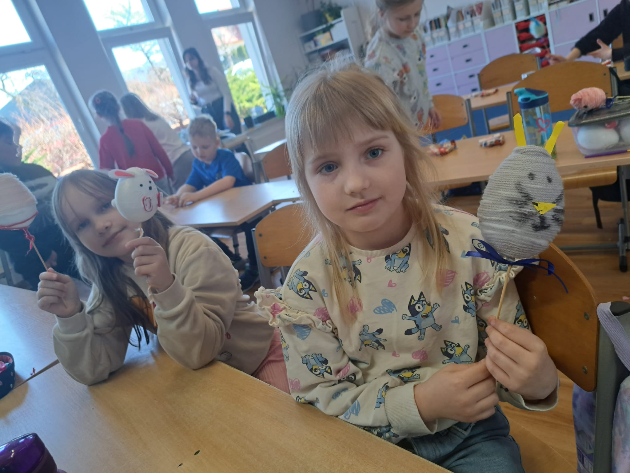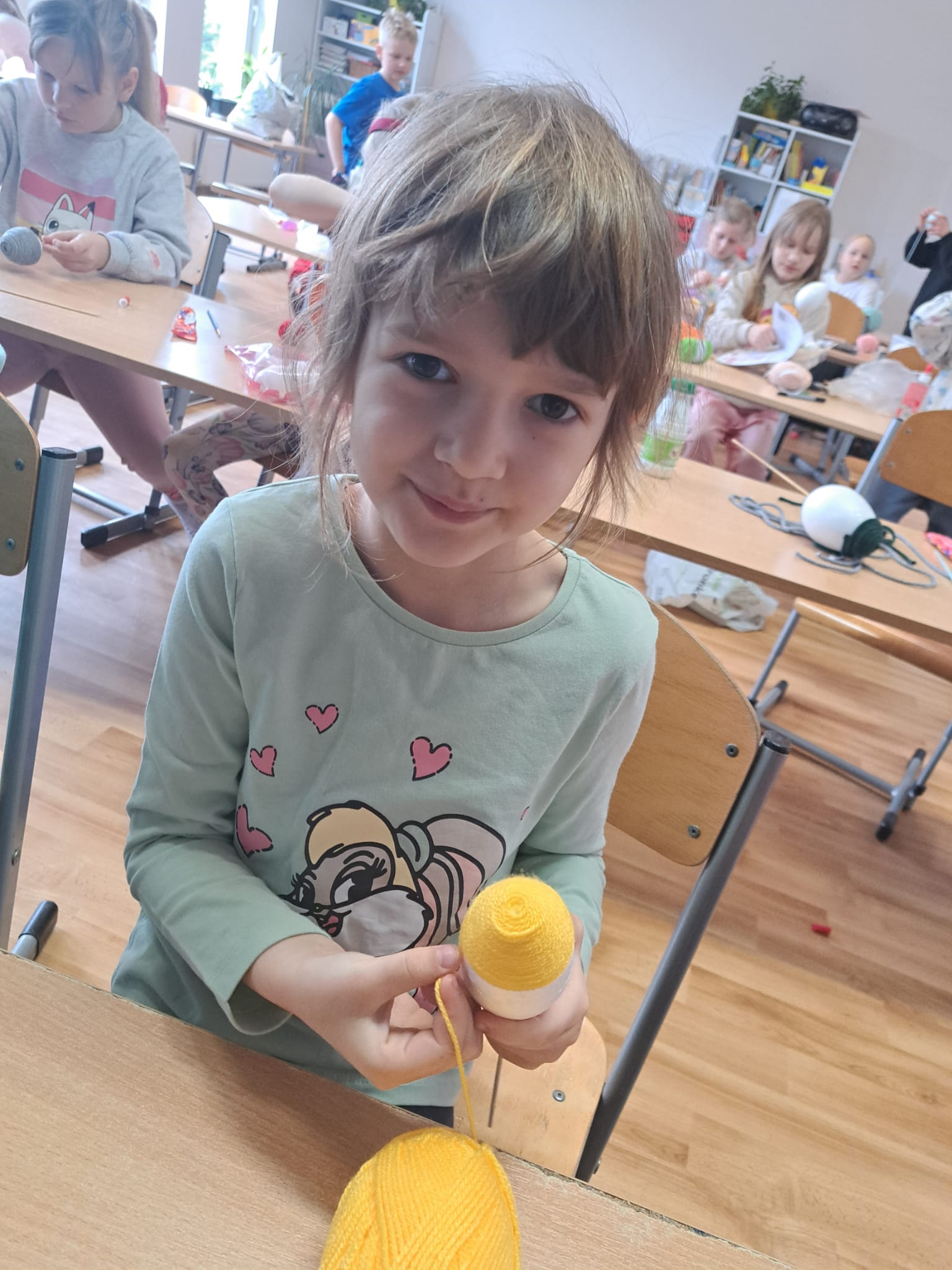 Podczas rozmów o tradycjach Wielkiej Nocy dzieci wykonały również bardzo pracochłonną pracę plastyczną. Oklejały styropianowe jajka włóczką, a następnie przemieniały je w urocze zajączki oraz inne zwierzątka. Efekty ich pracy były naprawdę wyjątkowe i pełne wiosennej radości.