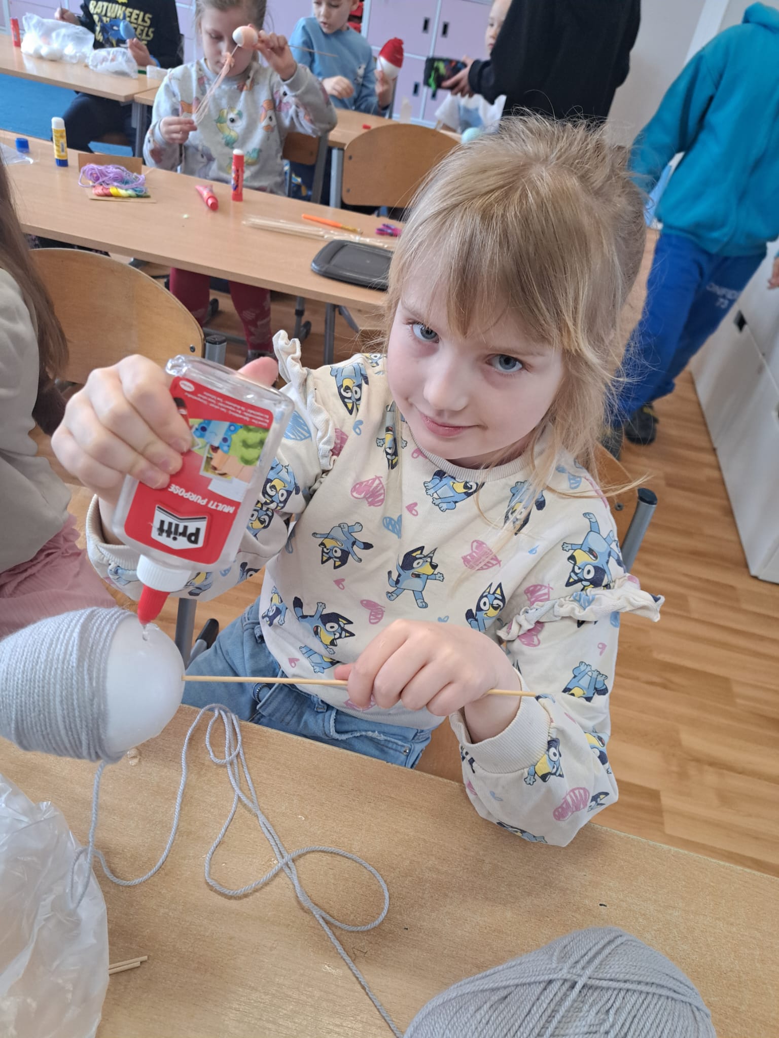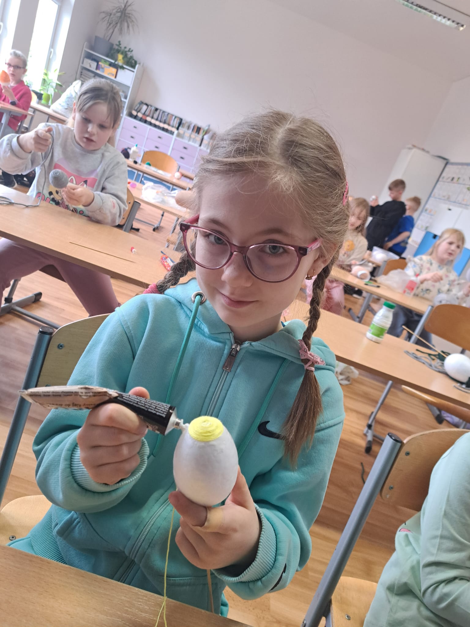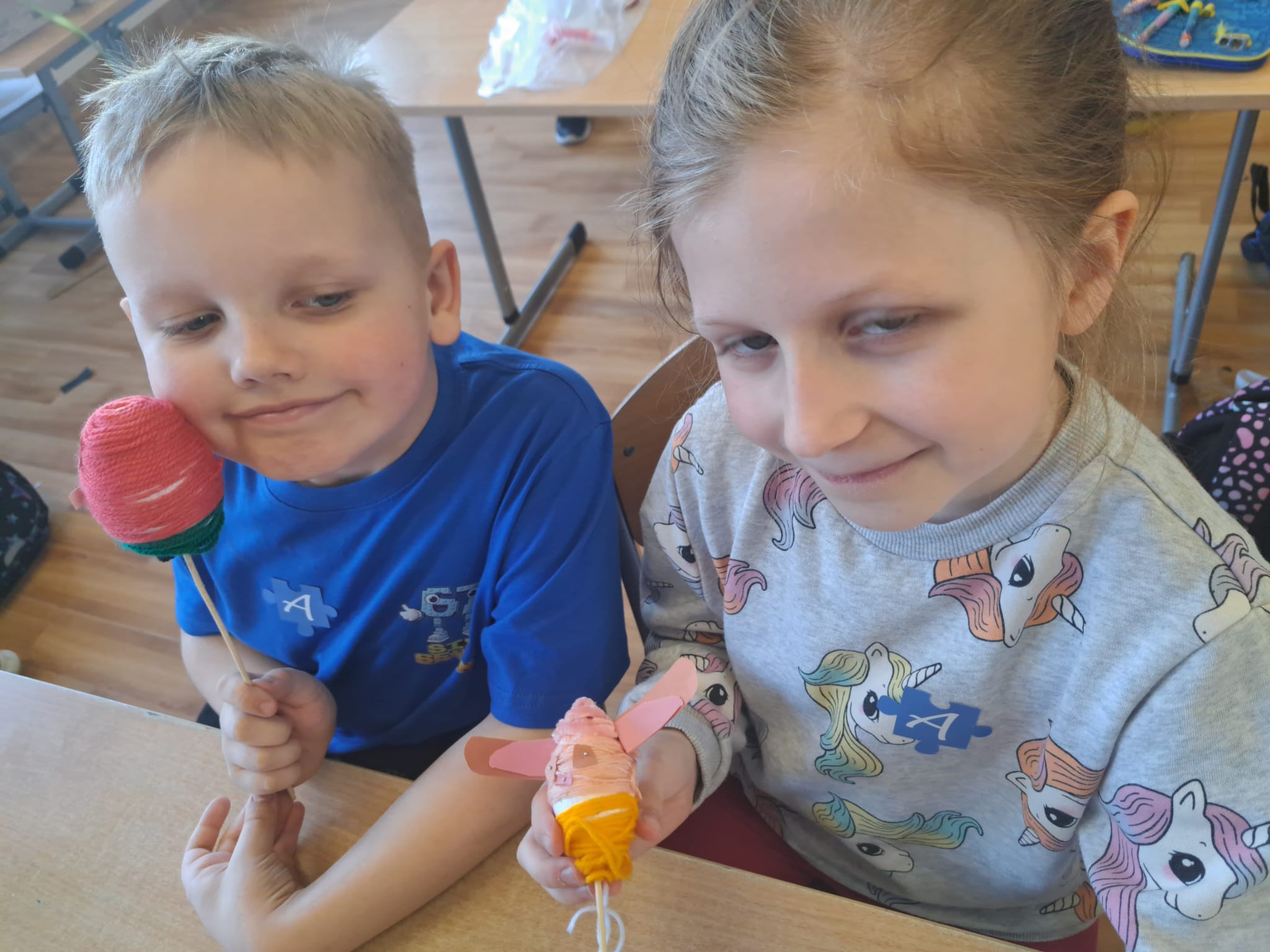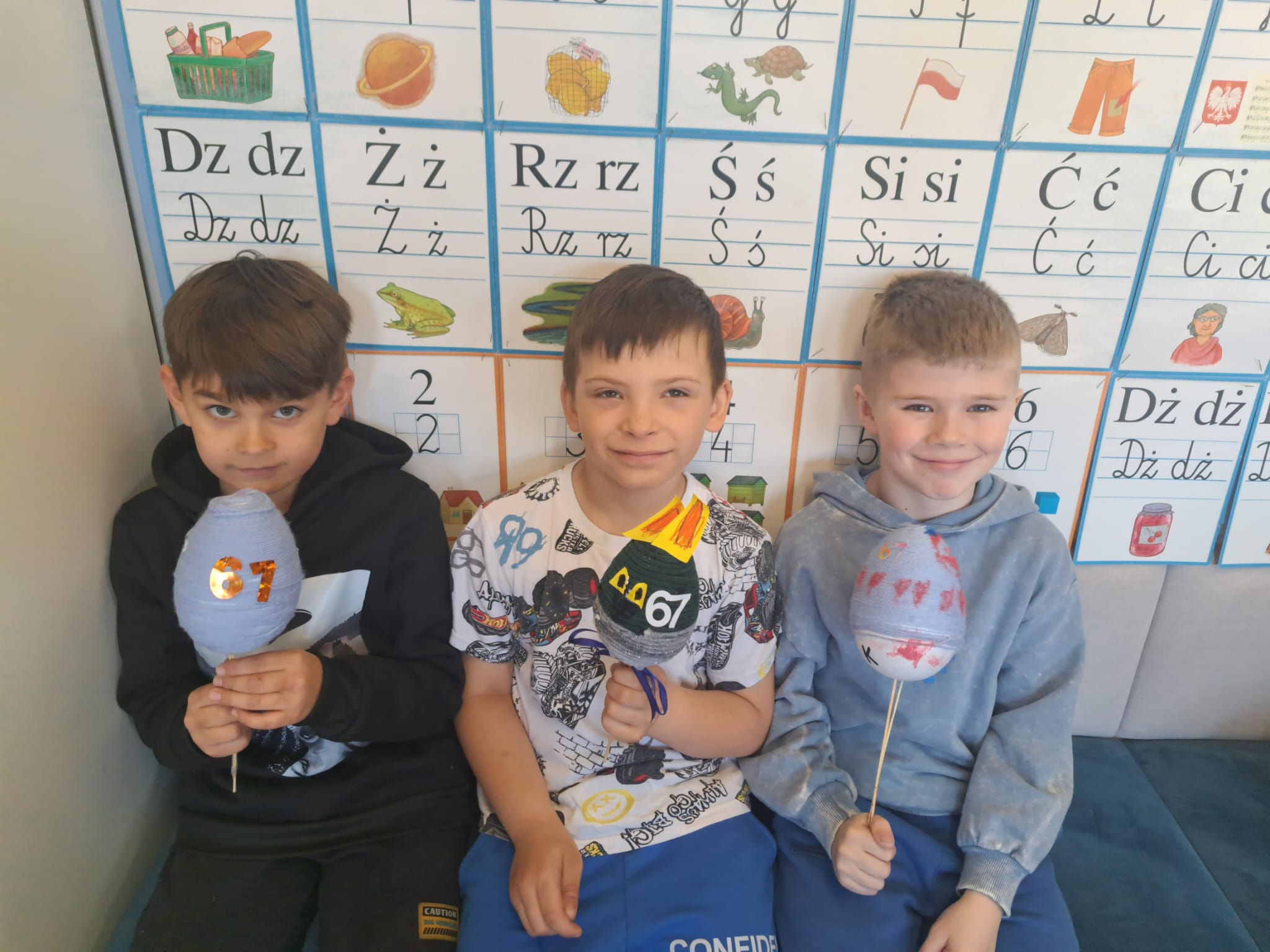 Podczas rozmów o tradycjach Wielkiej Nocy dzieci wykonały również bardzo pracochłonną pracę plastyczną. Oklejały styropianowe jajka włóczką, a następnie przemieniały je w urocze zajączki oraz inne zwierzątka. Efekty ich pracy były naprawdę wyjątkowe i pełne wiosennej radości.