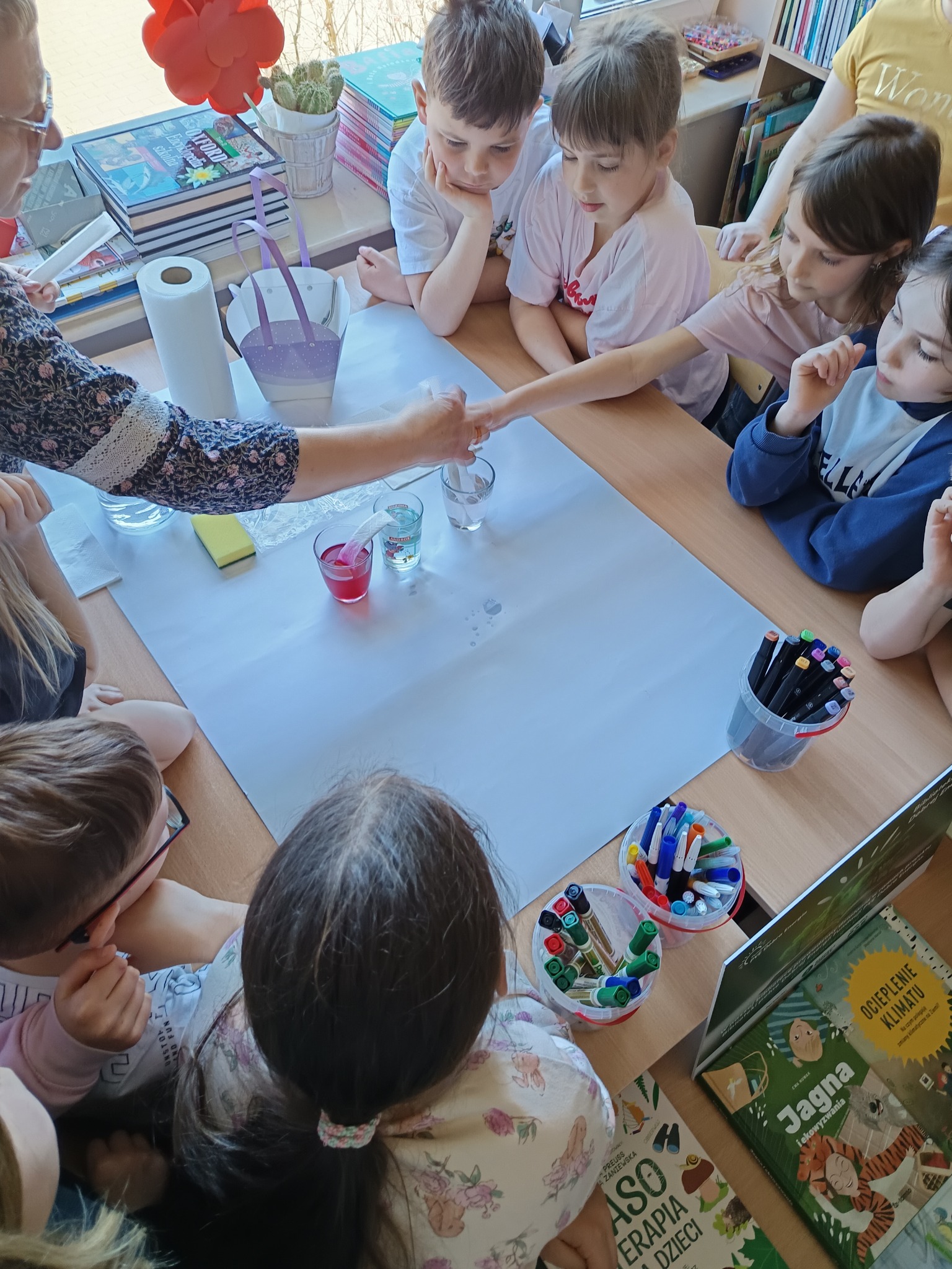 Rozmawialiśmy o tym, gdzie spotykamy wodę na co dzień, ile jej jest w różnych miejscach, także w nas samych, poznawaliśmy jej właściwości - trzy stany skupienia oraz zastanawialiśmy się, co by się stało, gdyby nagle jej zabrakło.