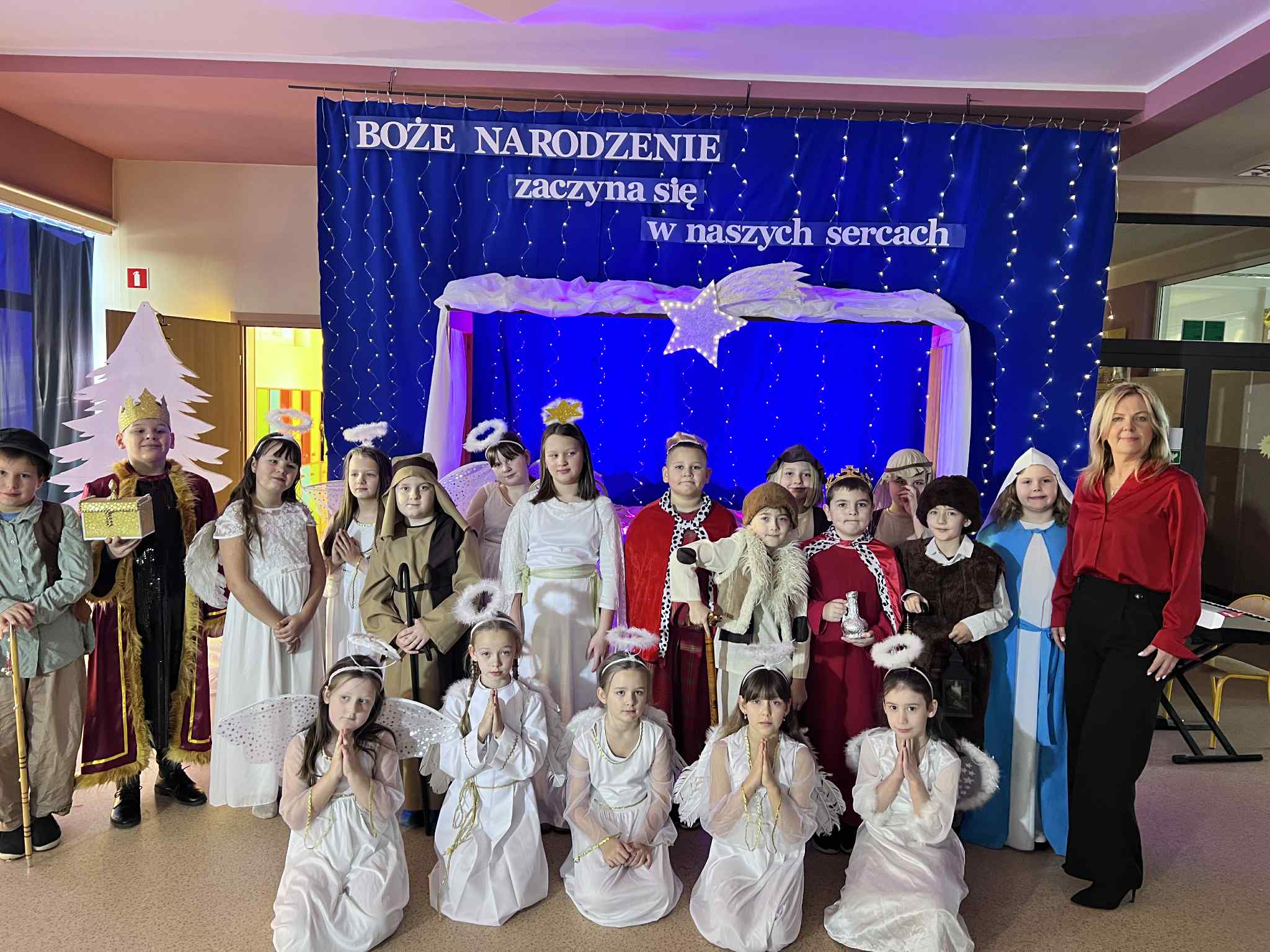 🌟Szczególne podziękowania kierujemy do pani Marii – wychowawczyni klasy, za przygotowanie scenariusza, czuwanie nad całością przedstawienia oraz dopieszczenie każdej z granych ról – zarówno pod względem interpretacji słowa, śpiewu, jak i ruchu scenicznego i tańca. Dzięki temu jasełka były spójne, poruszające i pełne emocji.