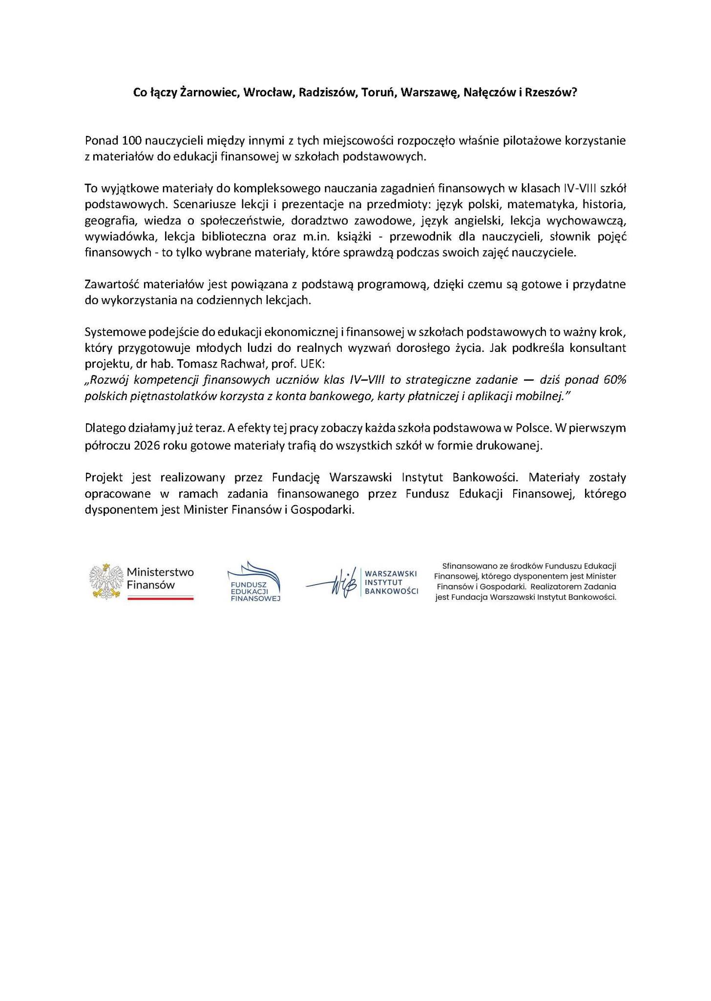 Ponad 100 nauczycieli między innymi z tych miejscowości rozpoczęło właśnie pilotażowe korzystanie z materiałów do edukacji finansowej w szkołach podstawowych.