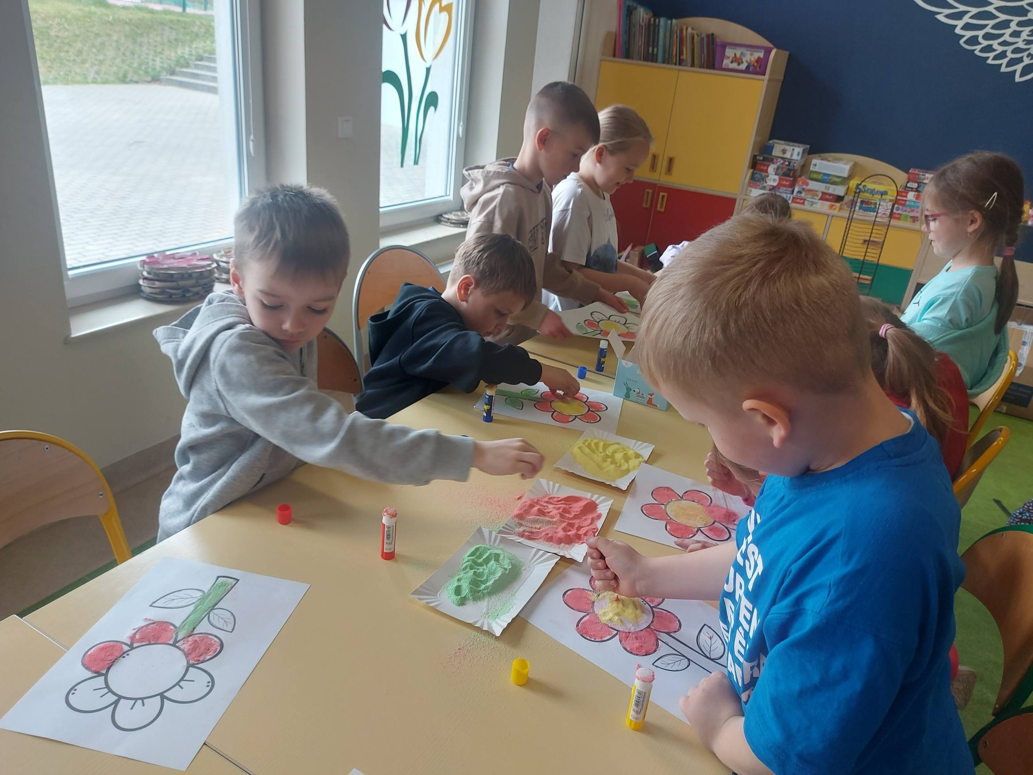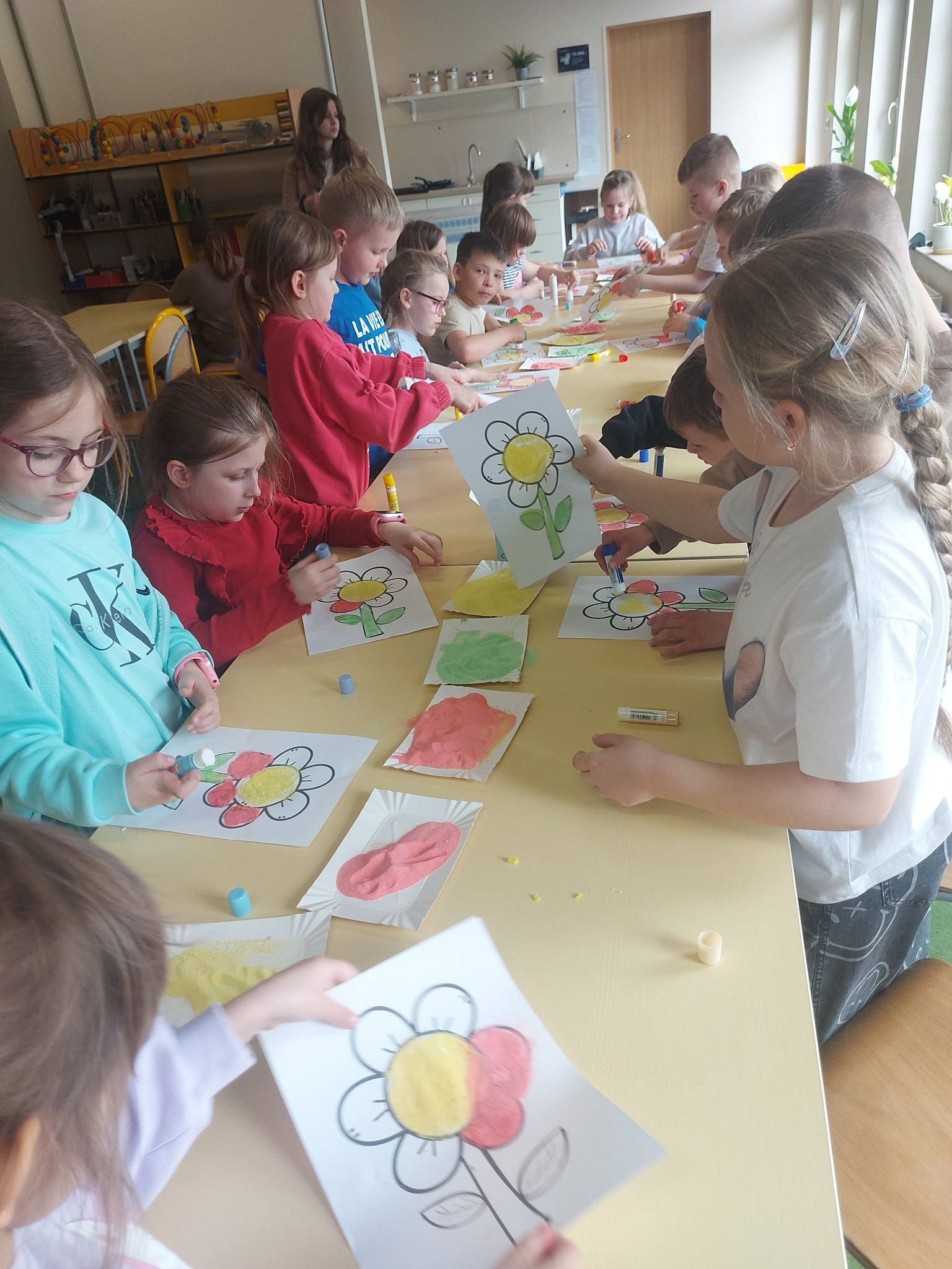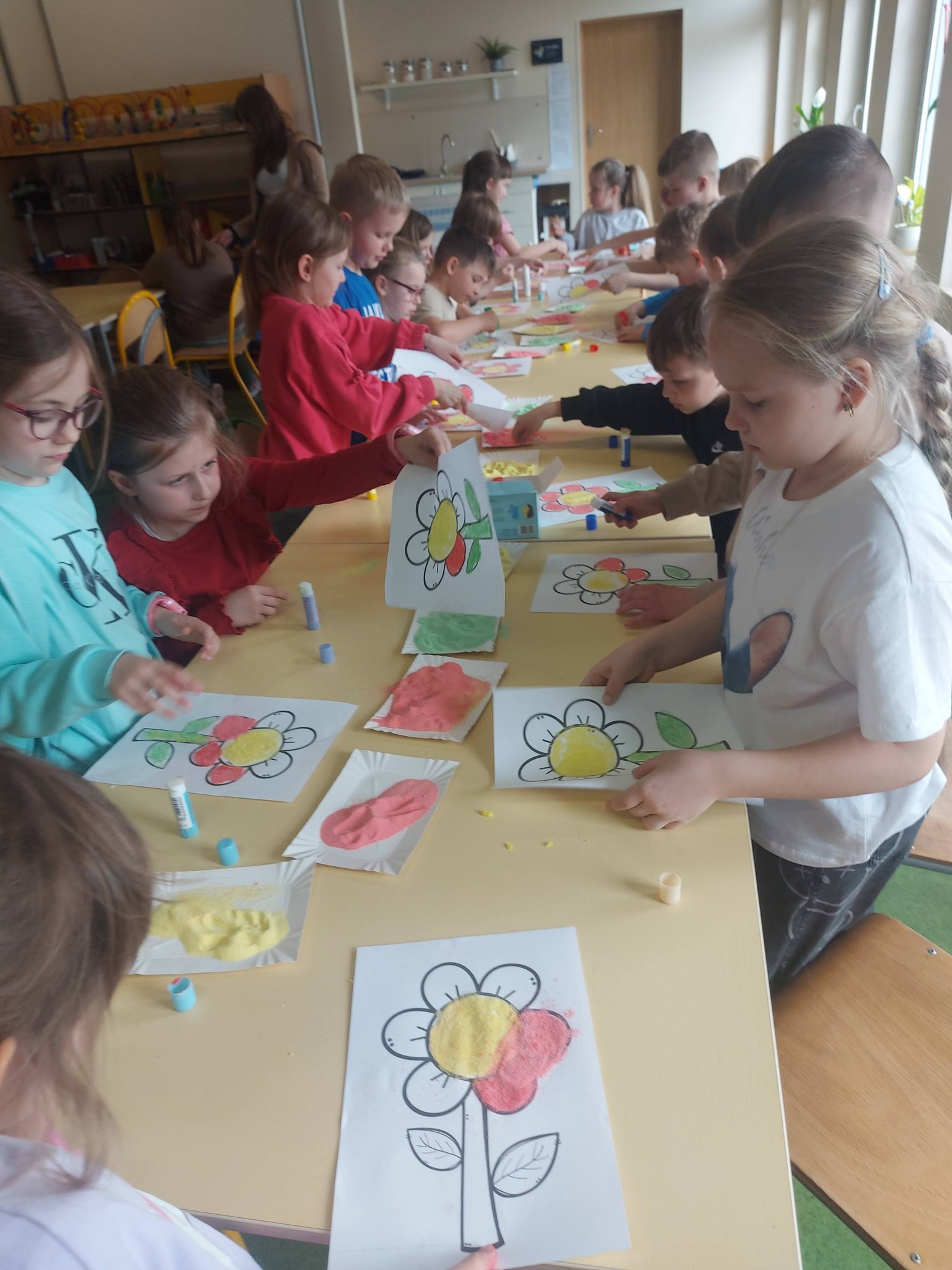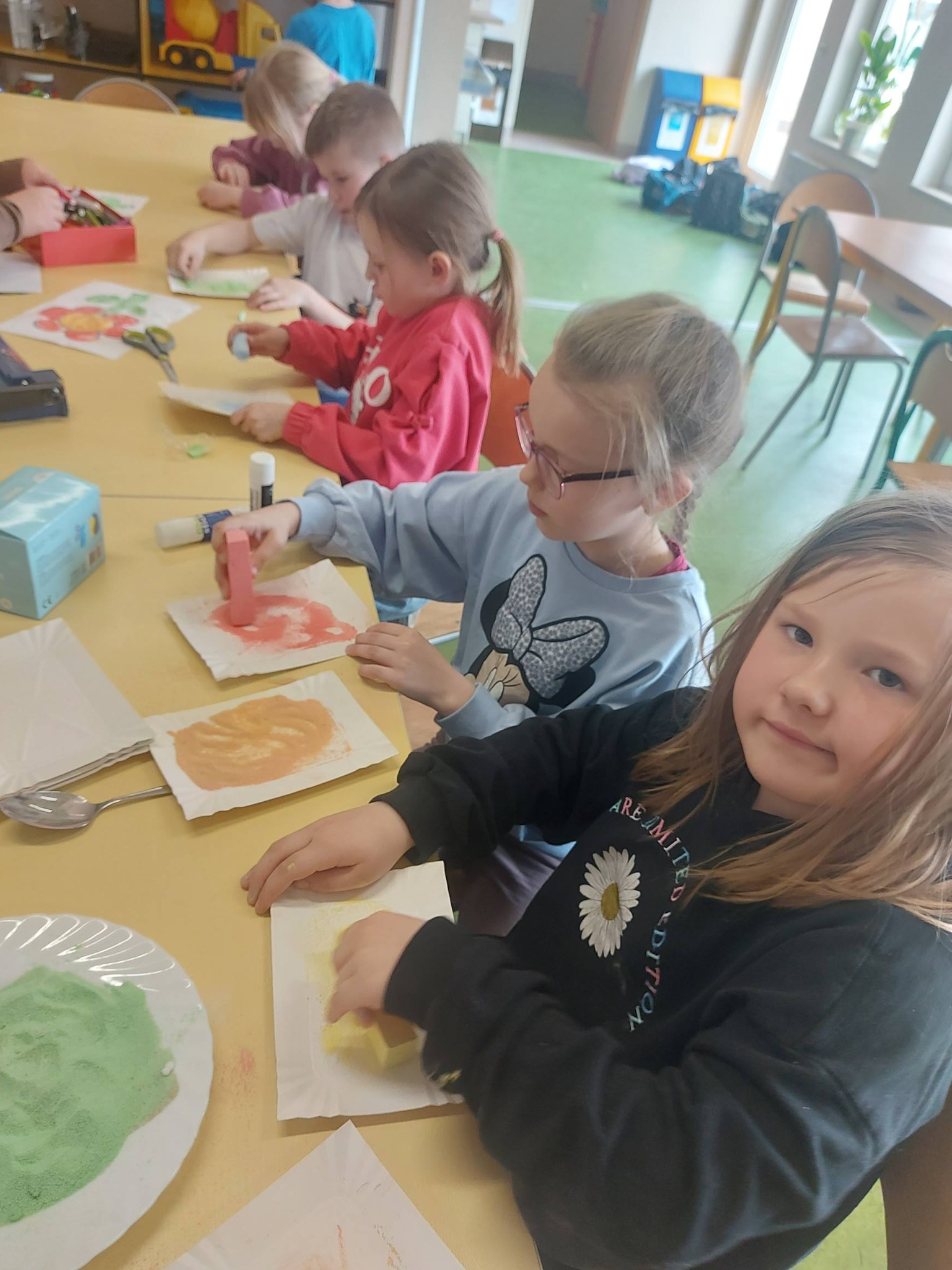 Kiedy kolorowa sól była już gotowa, przyszedł czas na twórcze działanie. Inspiracją stał się kwiatek – symbol wiosny i kreatywności. Powstały prace pełne kolorów, wyobraźni i dziecięcej radości 🌼 Każda z nich była wyjątkowa i niepowtarzalna – dokładnie tak jak ich autorzy.