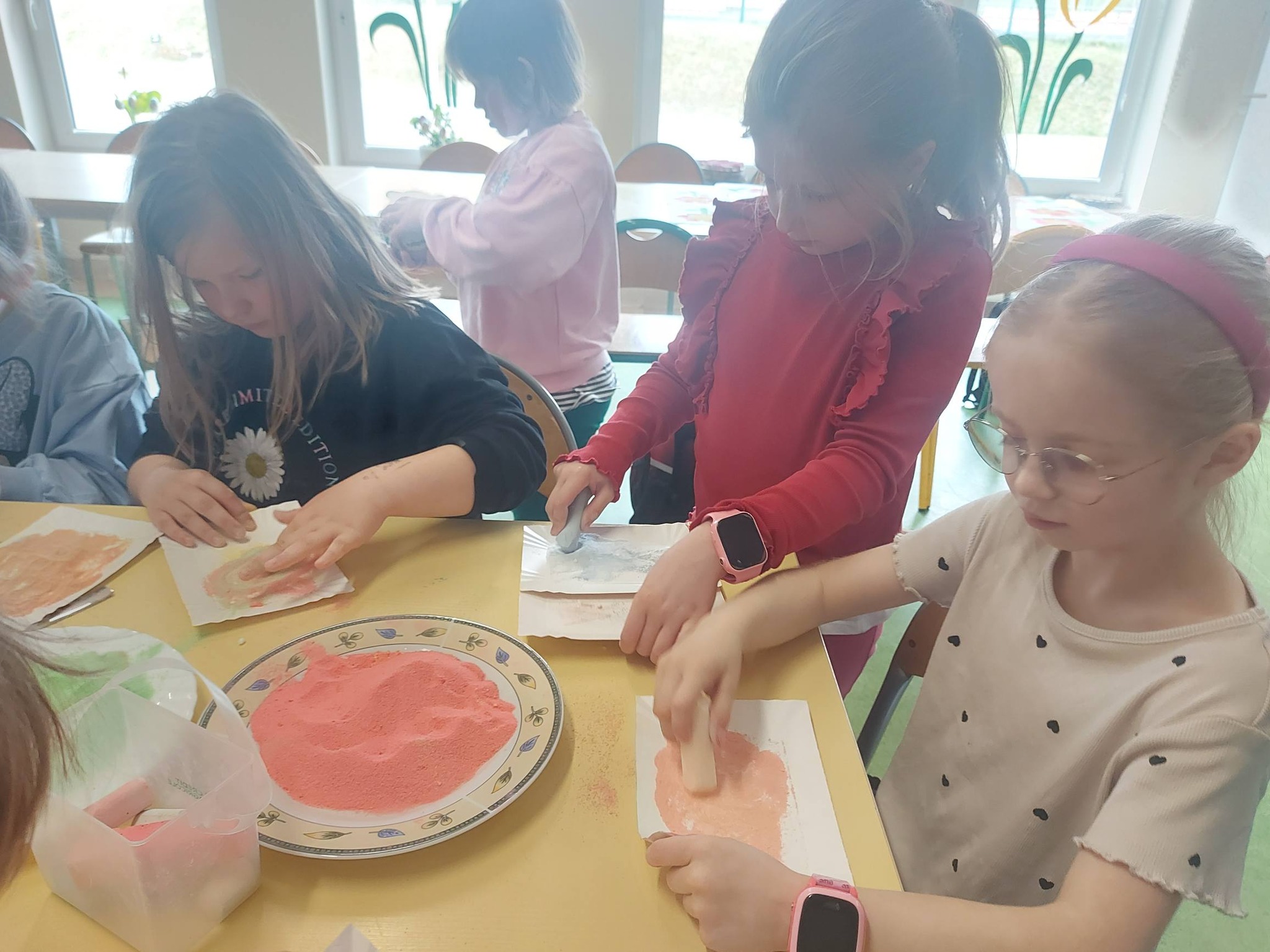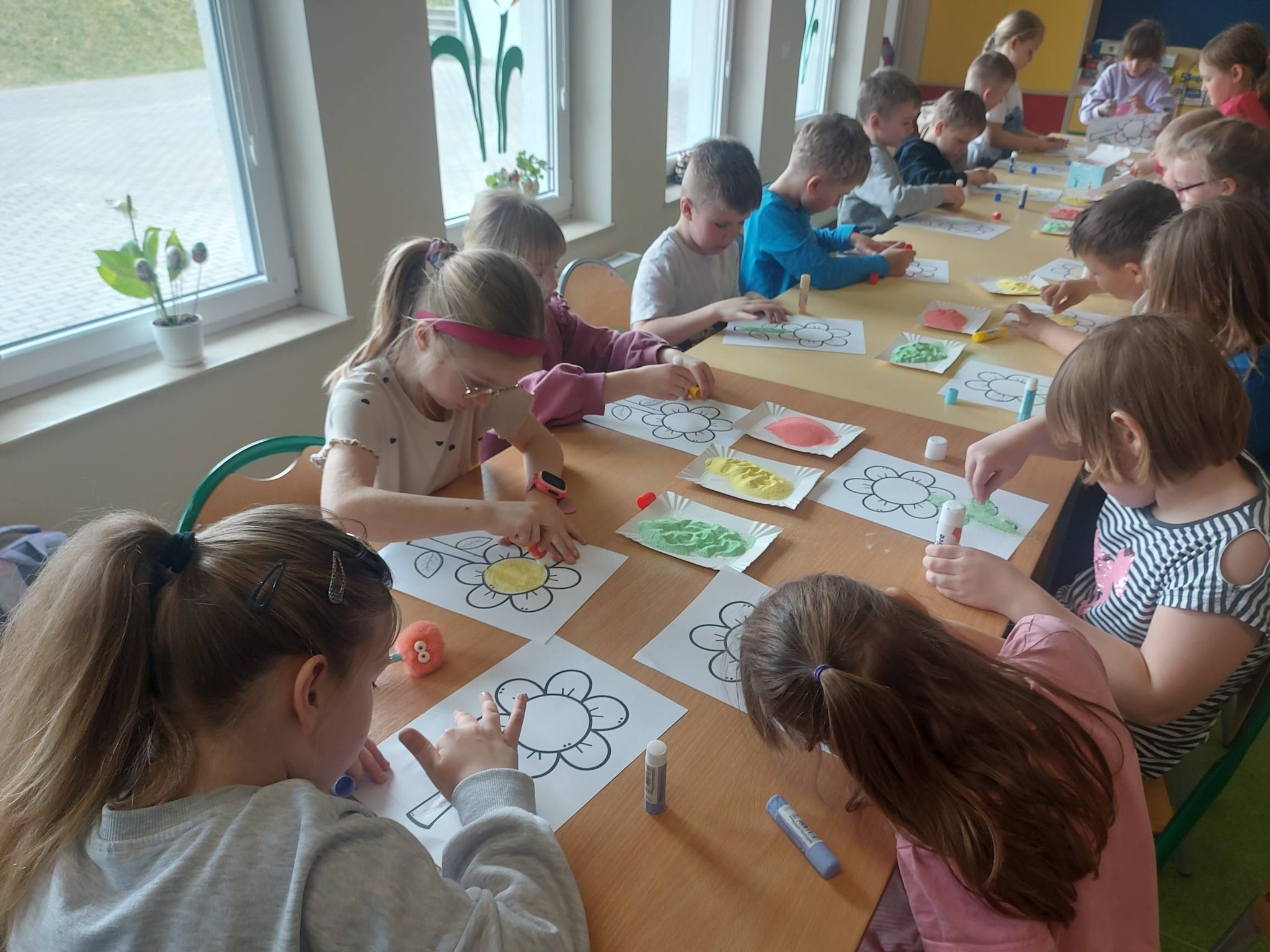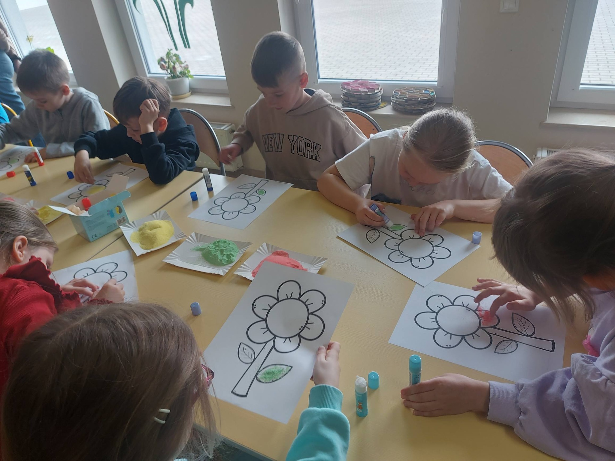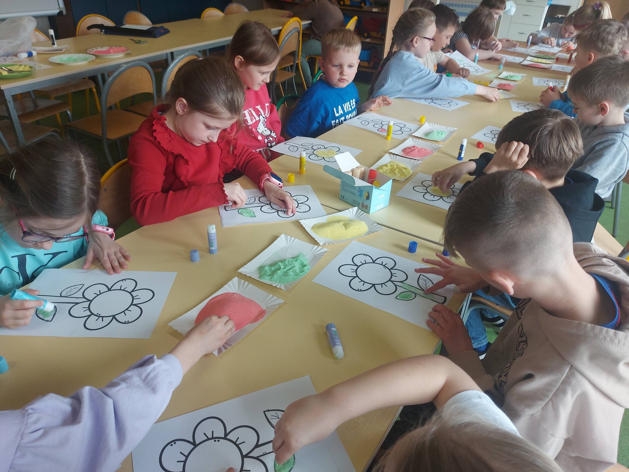 Kiedy kolorowa sól była już gotowa, przyszedł czas na twórcze działanie. Inspiracją stał się kwiatek – symbol wiosny i kreatywności. Powstały prace pełne kolorów, wyobraźni i dziecięcej radości 🌼 Każda z nich była wyjątkowa i niepowtarzalna – dokładnie tak jak ich autorzy.