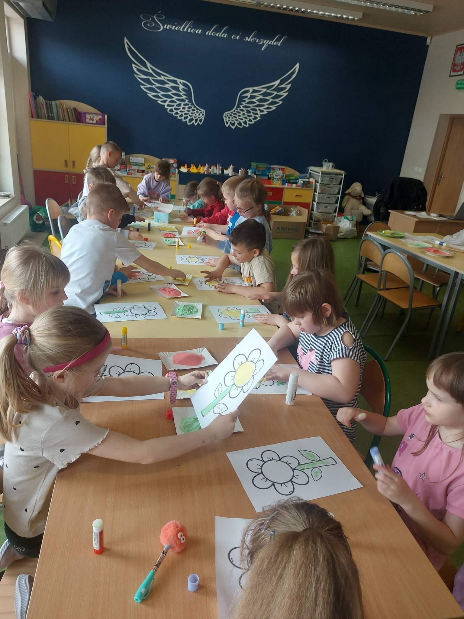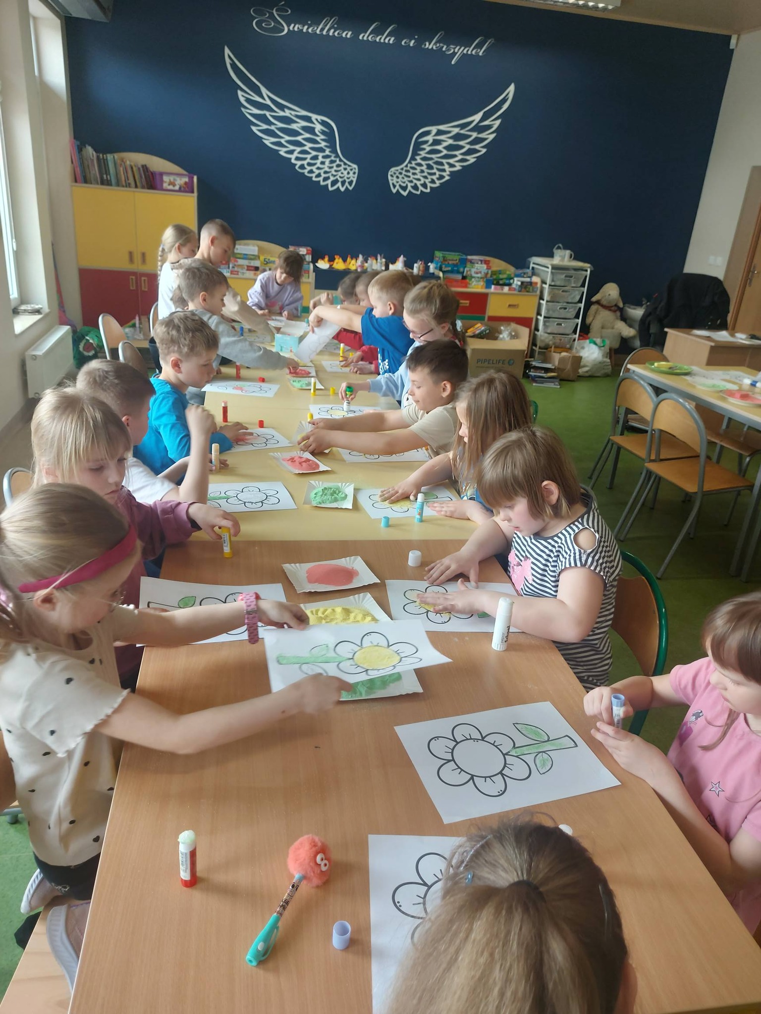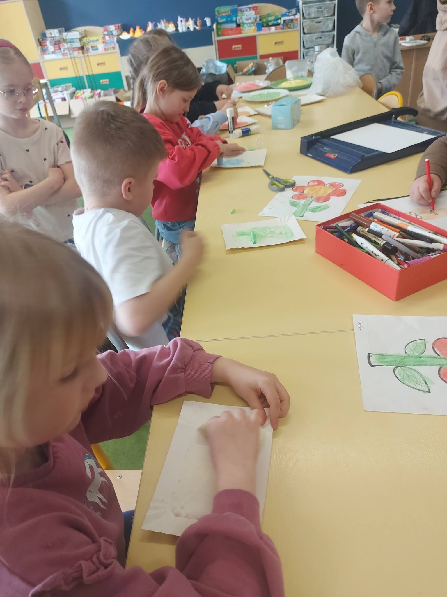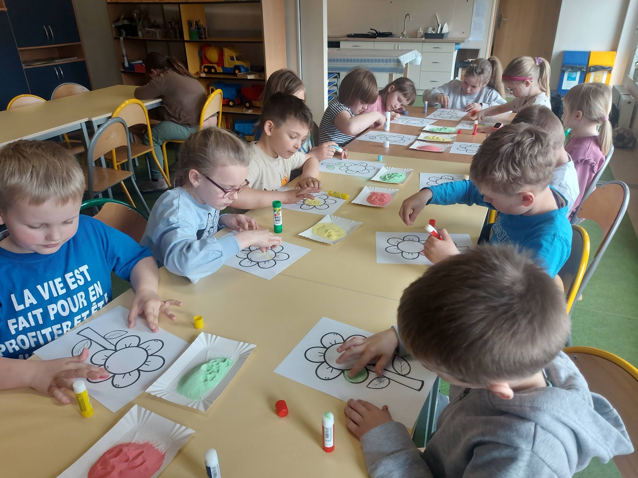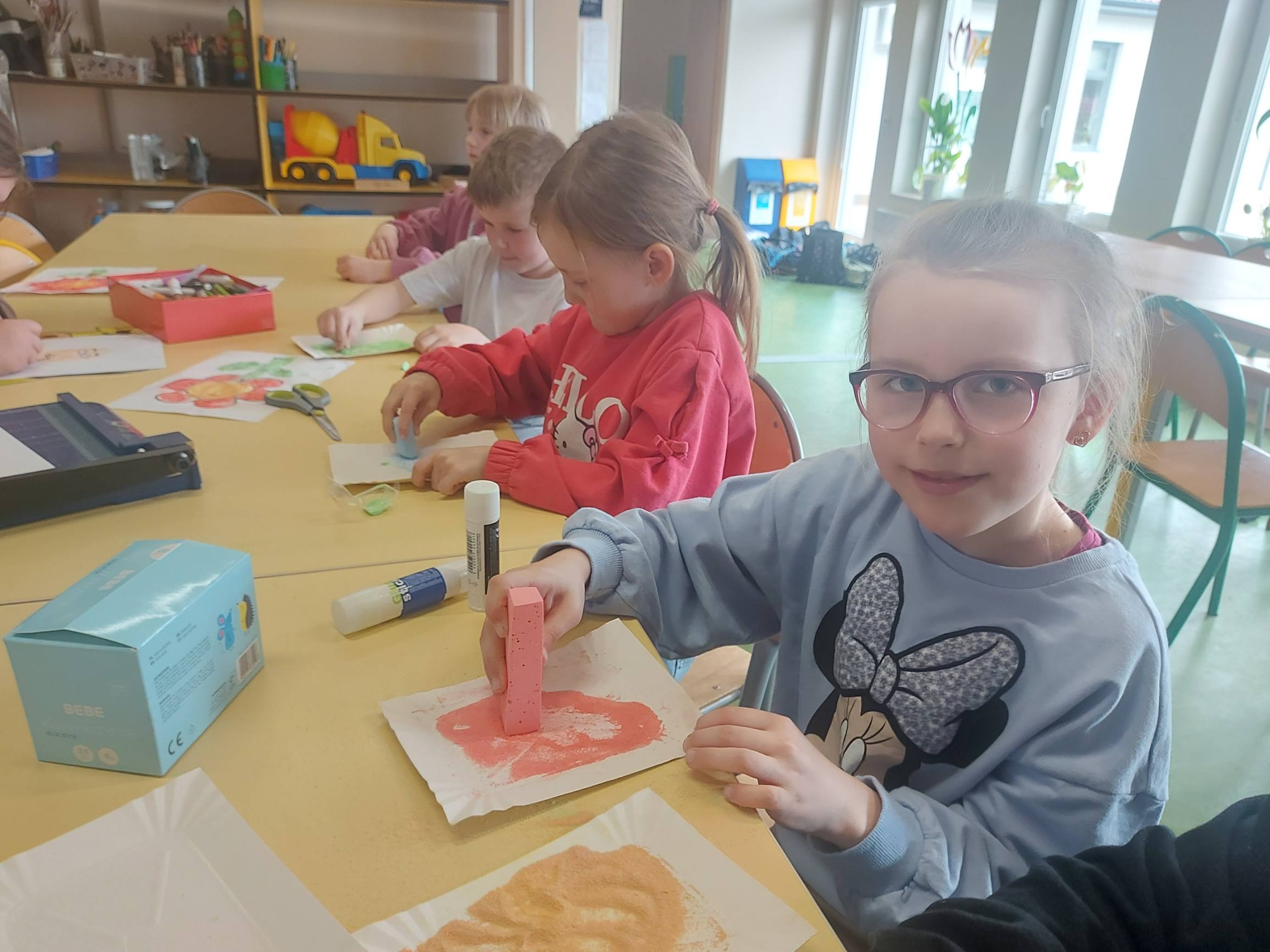 Kiedy kolorowa sól była już gotowa, przyszedł czas na twórcze działanie. Inspiracją stał się kwiatek – symbol wiosny i kreatywności. Powstały prace pełne kolorów, wyobraźni i dziecięcej radości 🌼 Każda z nich była wyjątkowa i niepowtarzalna – dokładnie tak jak ich autorzy.