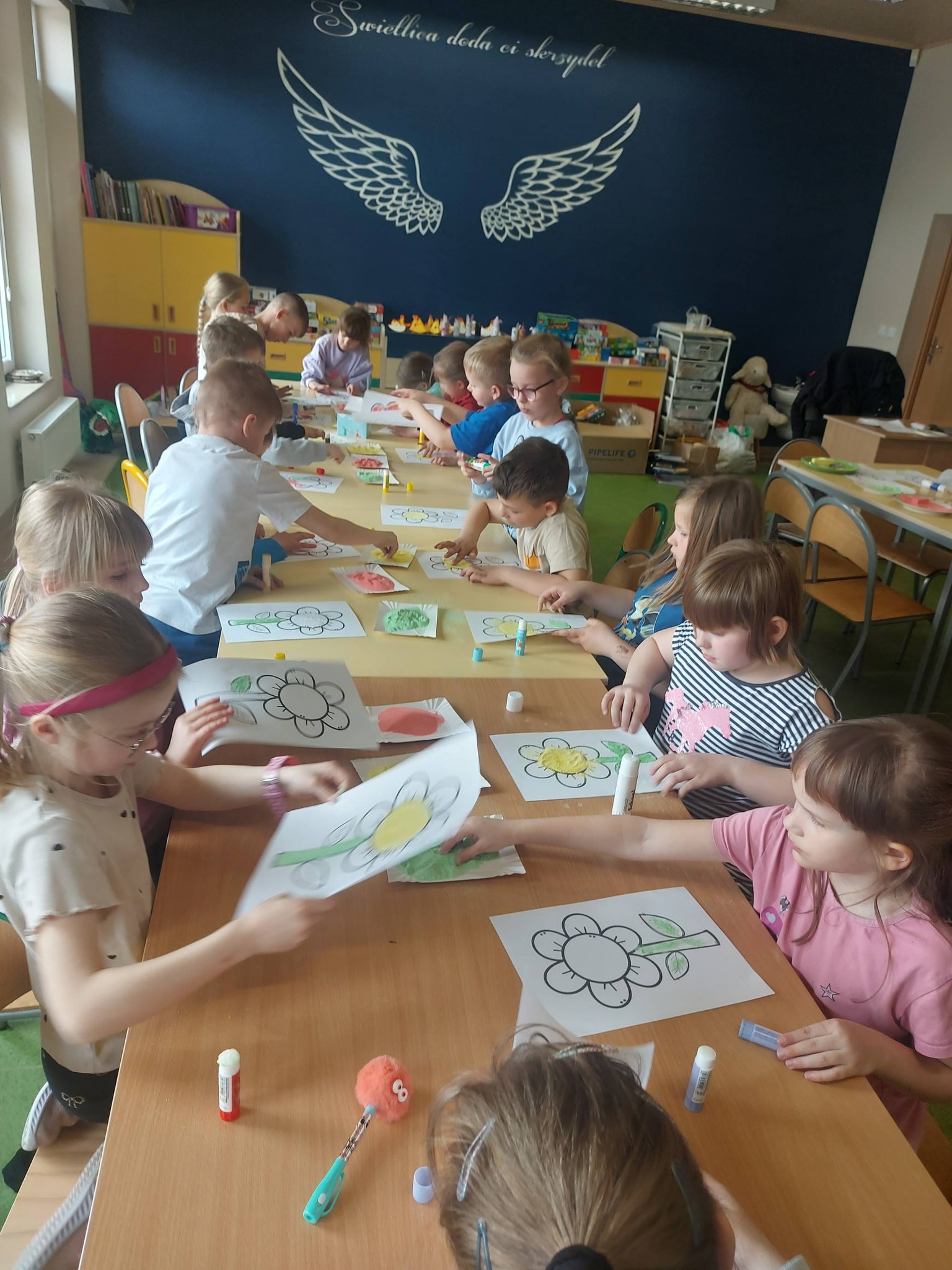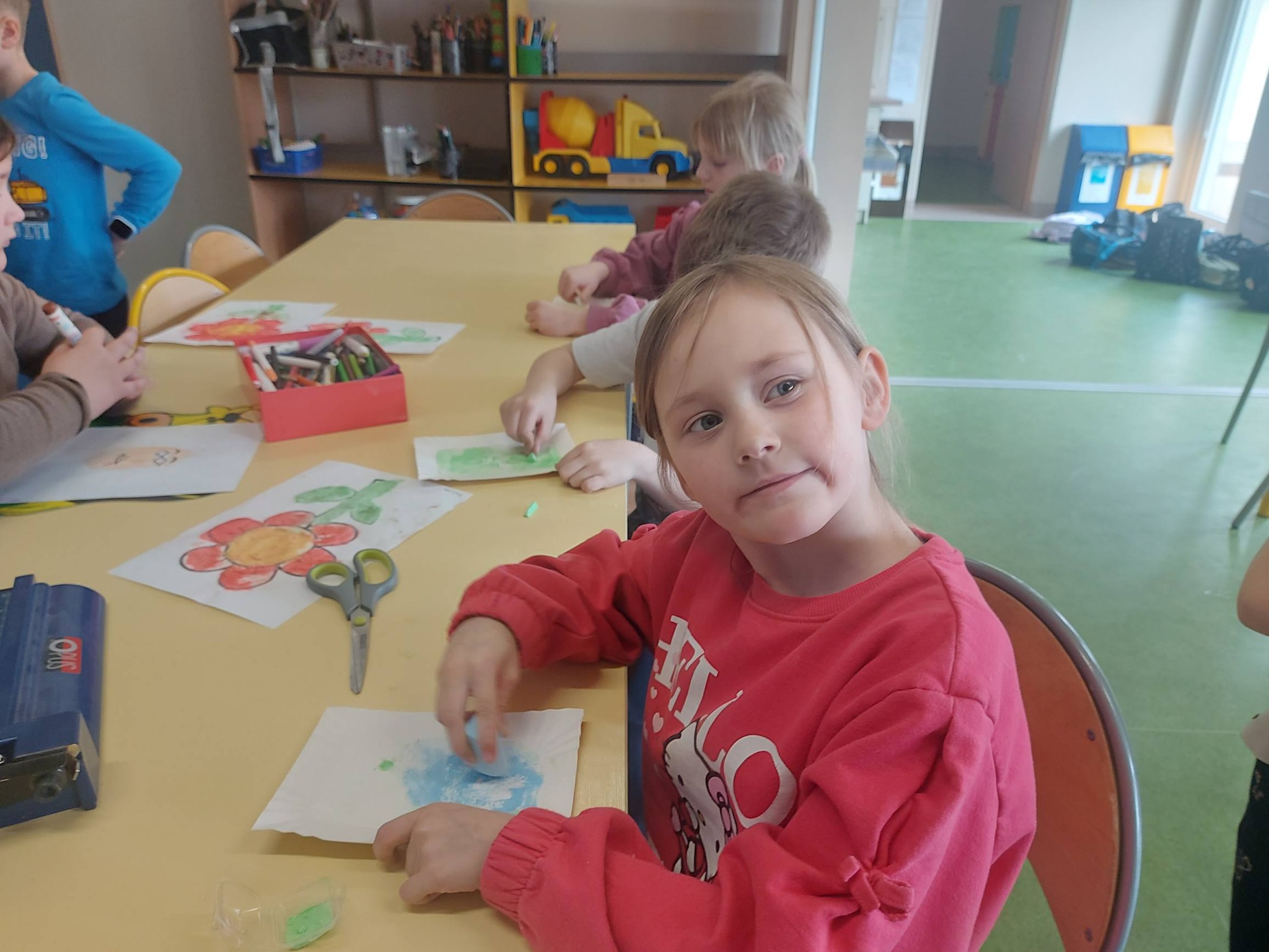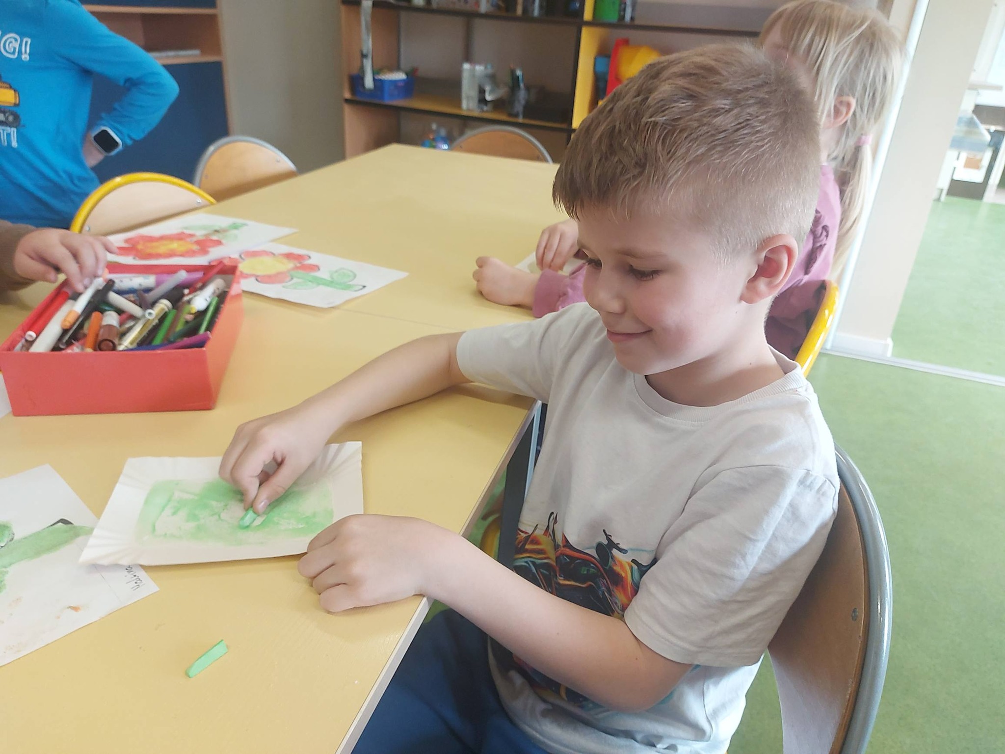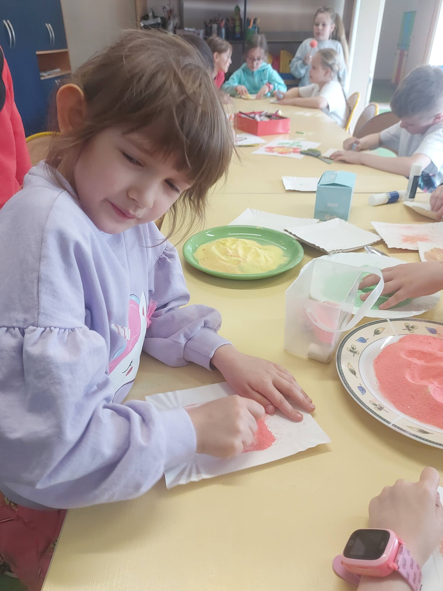 Kiedy kolorowa sól była już gotowa, przyszedł czas na twórcze działanie. Inspiracją stał się kwiatek – symbol wiosny i kreatywności. Powstały prace pełne kolorów, wyobraźni i dziecięcej radości 🌼 Każda z nich była wyjątkowa i niepowtarzalna – dokładnie tak jak ich autorzy.