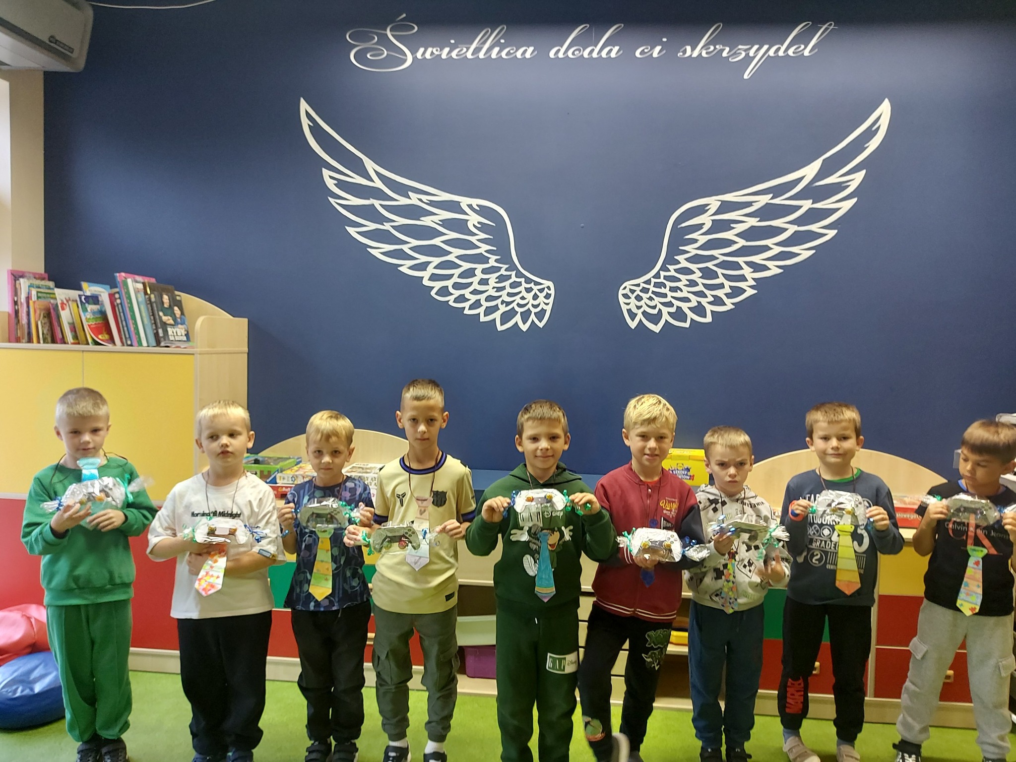 💫 Klasa 1 – dziewczynki przygotowały dla swoich kolegów krawaty 🎀, a każdy chłopiec otrzymał wyjątkowy prezent – mini konsolę PS z lizakami! 🎮🍭 Radości było co niemiara! 🥰