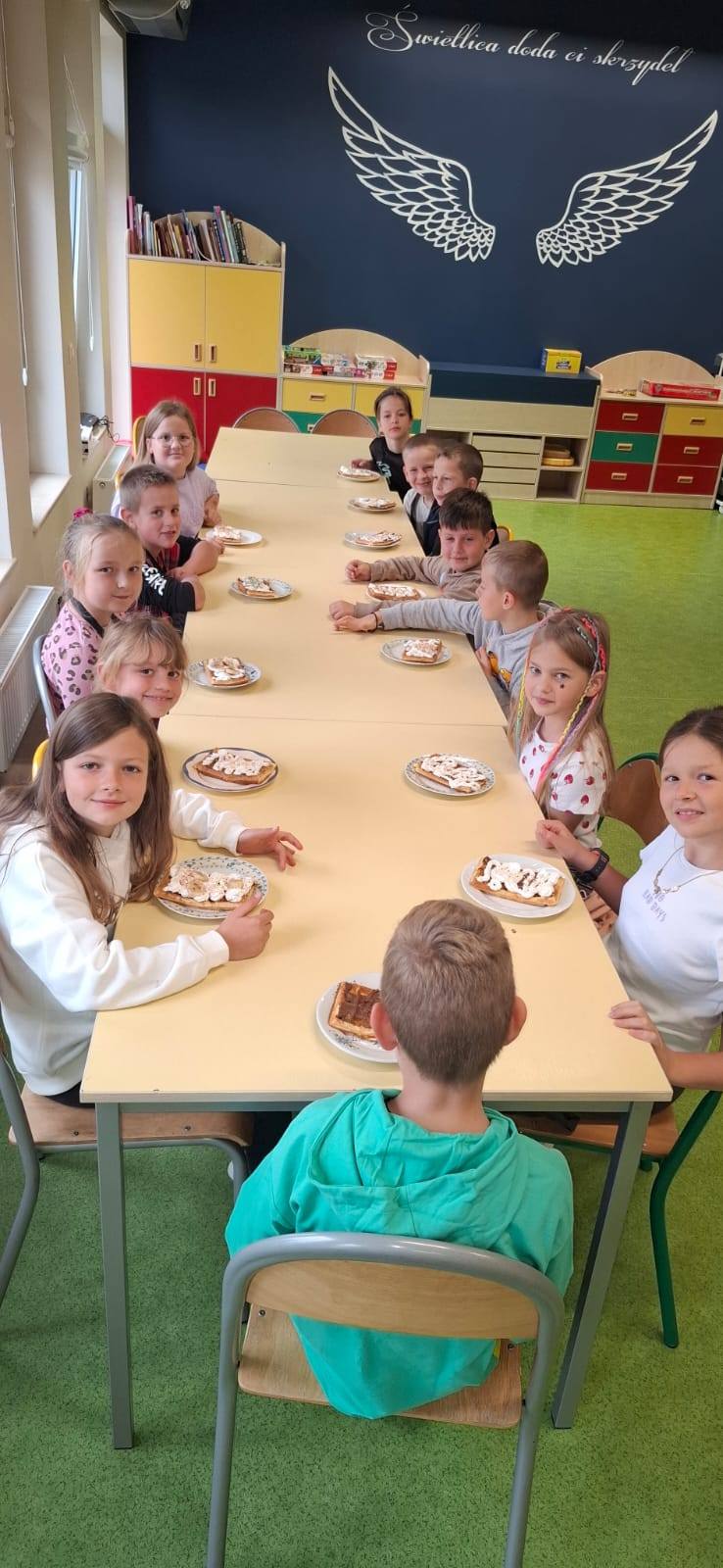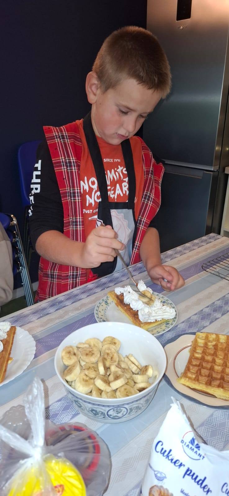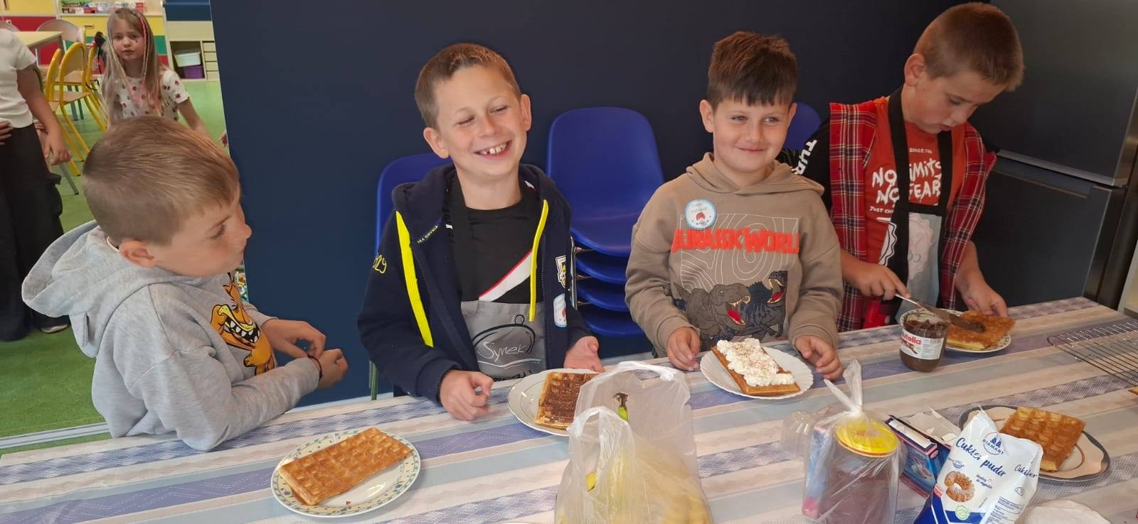 💫 Klasa 2a – świętowała na słodko i sportowo! 🧇🤤 Chłopcy częstowali się samodzielnie przygotowanymi goframi, a w prezencie otrzymali piłkarskie upominki ⚽️ – czyli to, co kochają najbardziej! 🙌