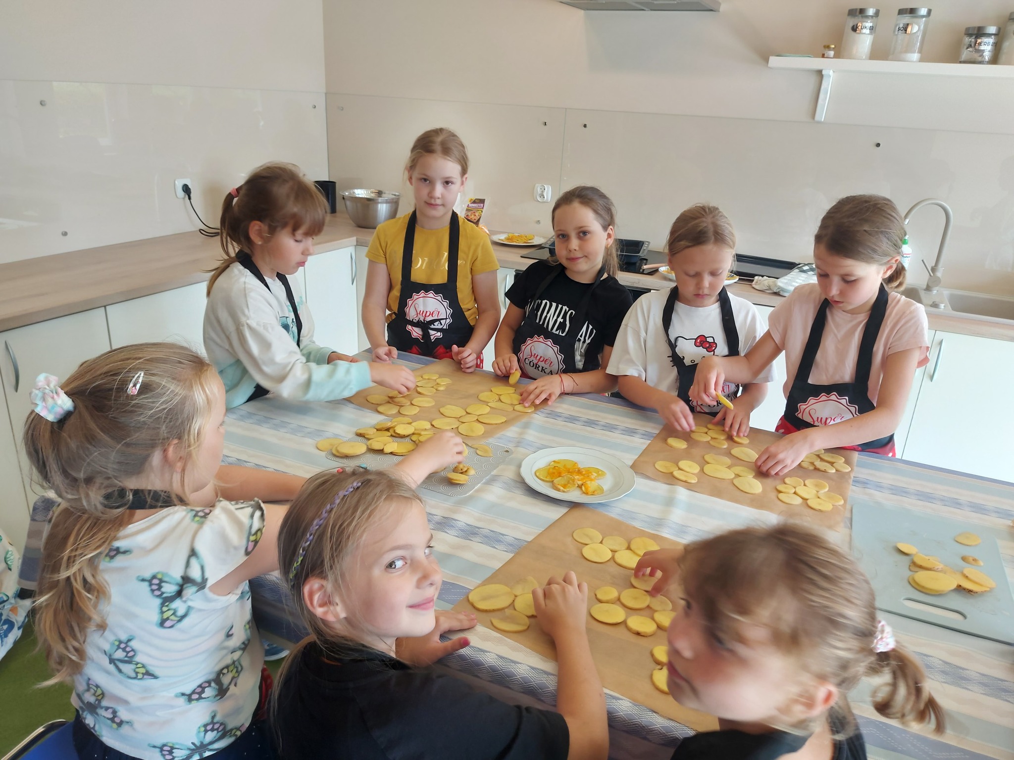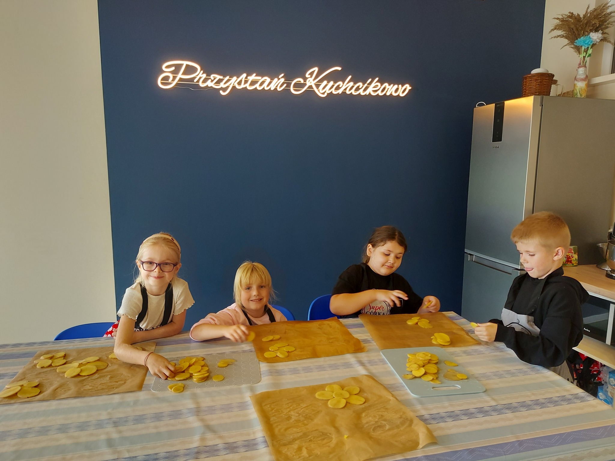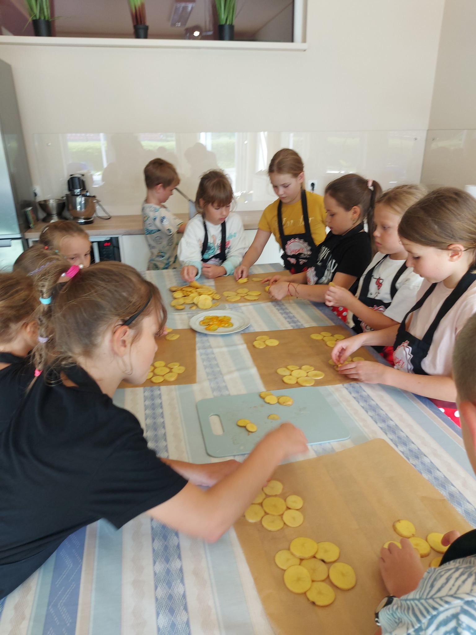 Z okazji Dnia Ziemniaka w świetlicy zrobiło się wyjątkowo smakowicie! Dzieci z zaangażowaniem przygotowywały pyszne ziemniaczane przekąski – najpierw dokładnie myliśmy ziemniaki, potem kroiliśmy je na deskach, a następnie z dużą starannością układaliśmy plasterki na blachach w kształcie kwiatków 🌸