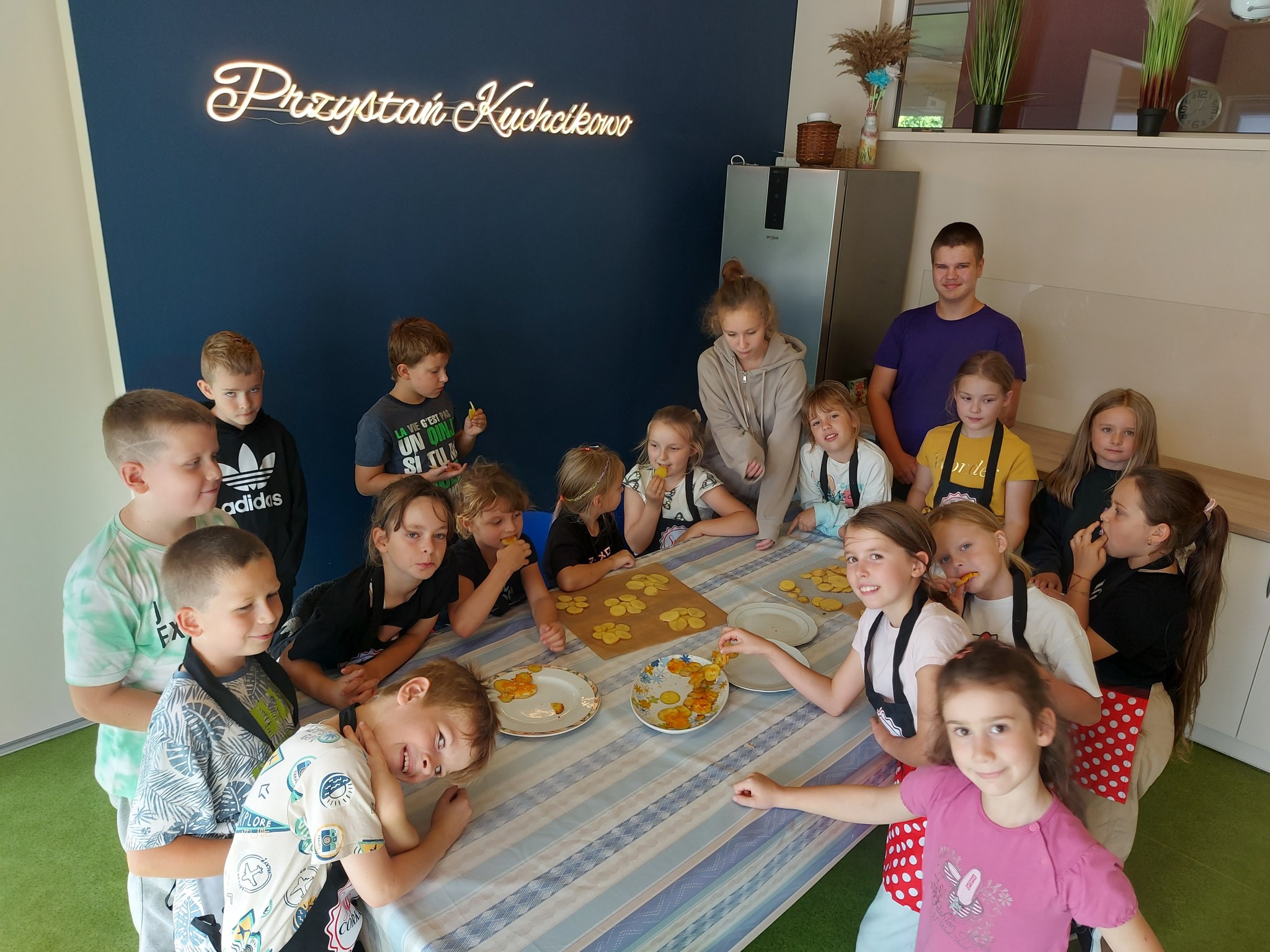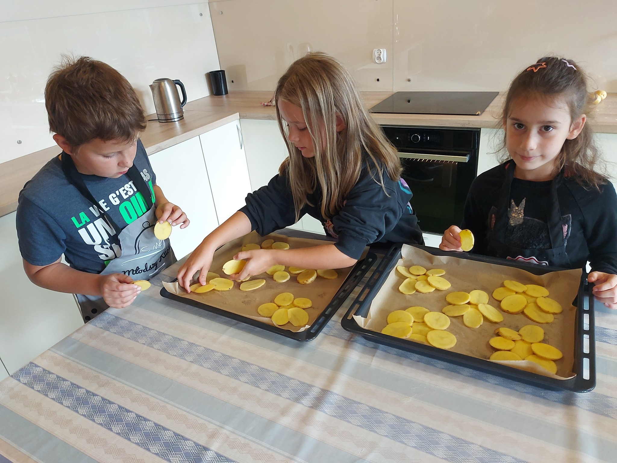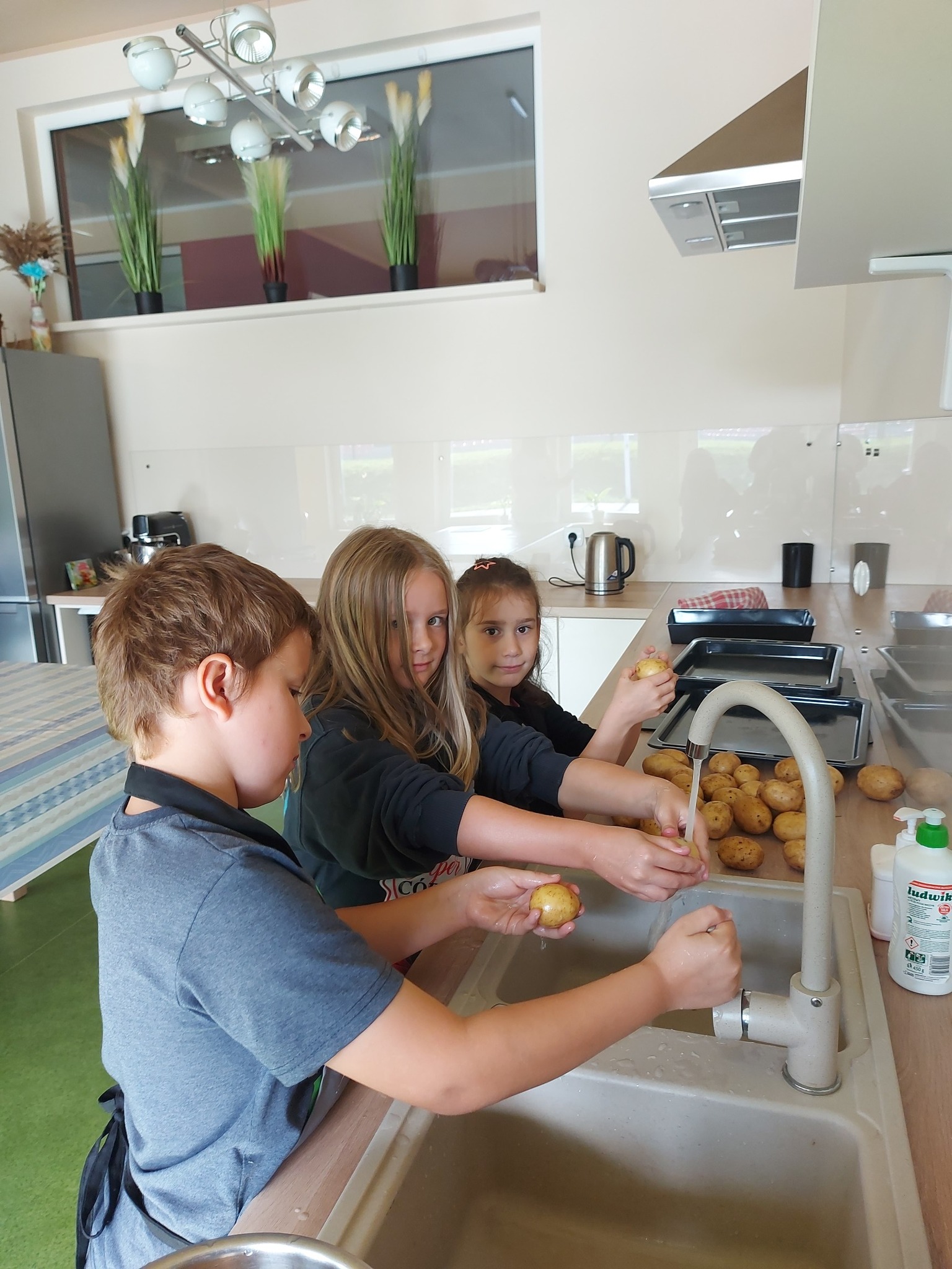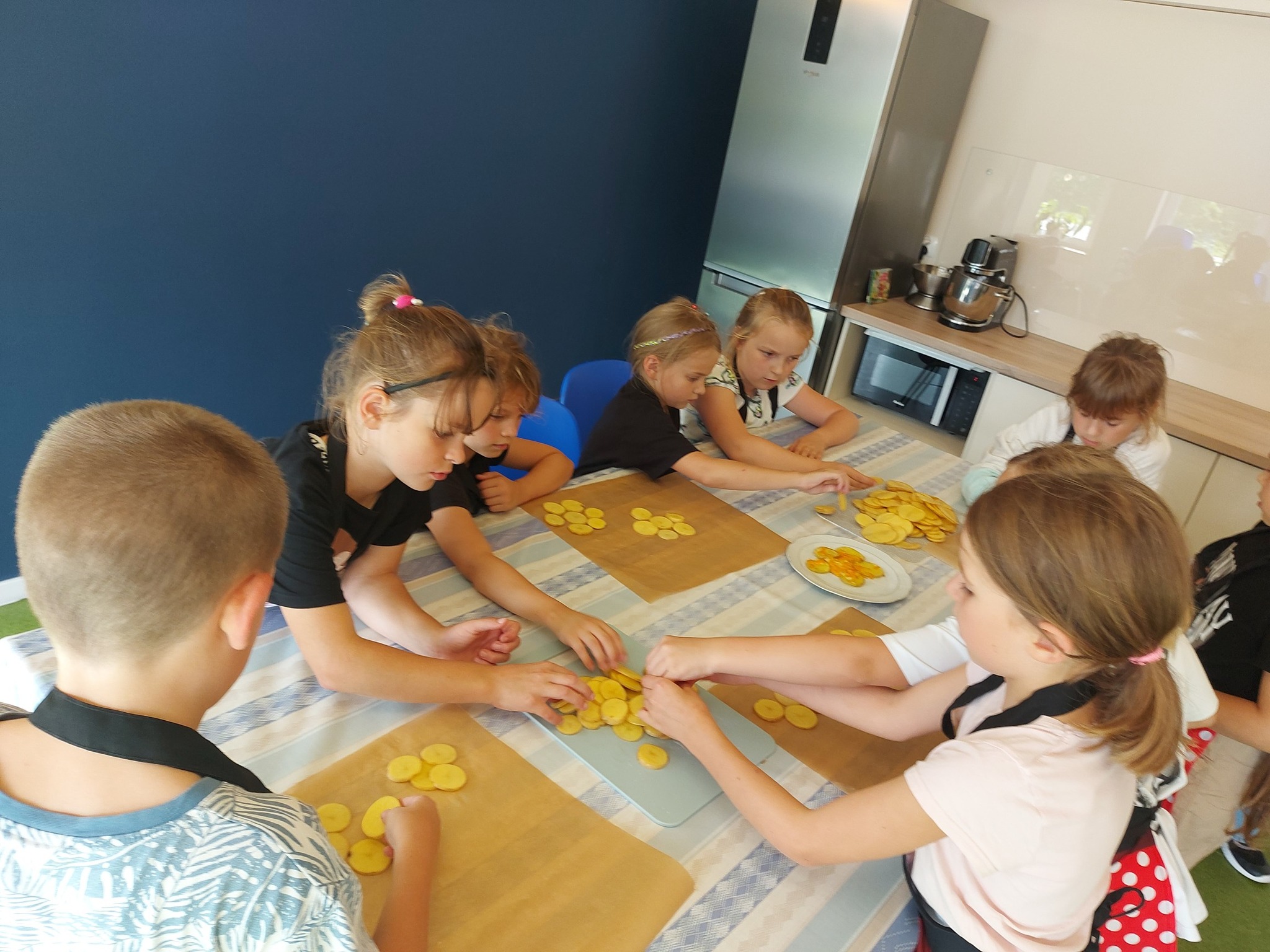 Z okazji Dnia Ziemniaka w świetlicy zrobiło się wyjątkowo smakowicie! Dzieci z zaangażowaniem przygotowywały pyszne ziemniaczane przekąski – najpierw dokładnie myliśmy ziemniaki, potem kroiliśmy je na deskach, a następnie z dużą starannością układaliśmy plasterki na blachach w kształcie kwiatków 🌸