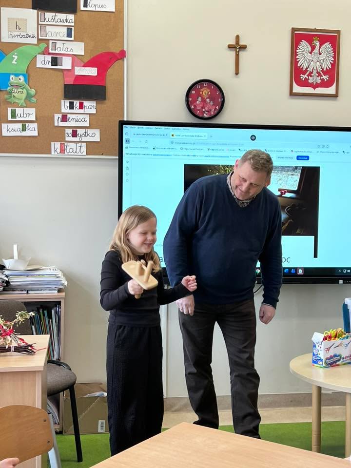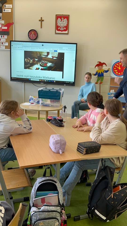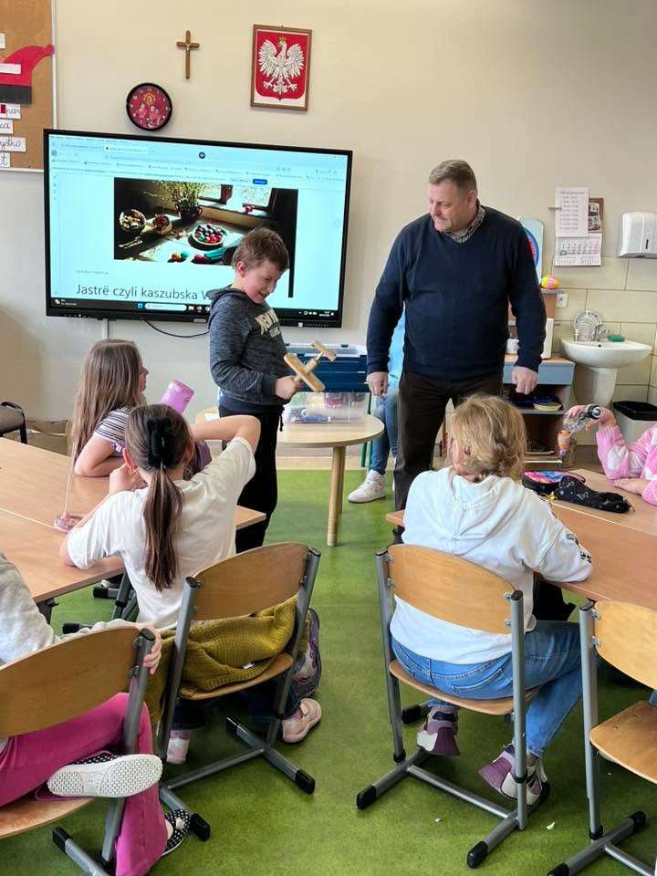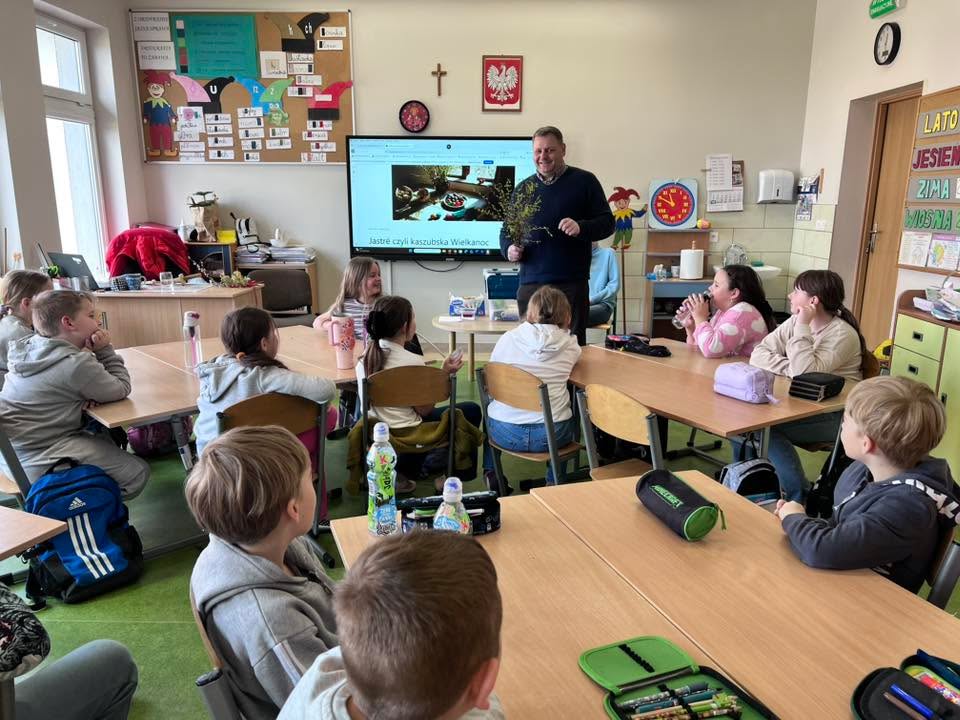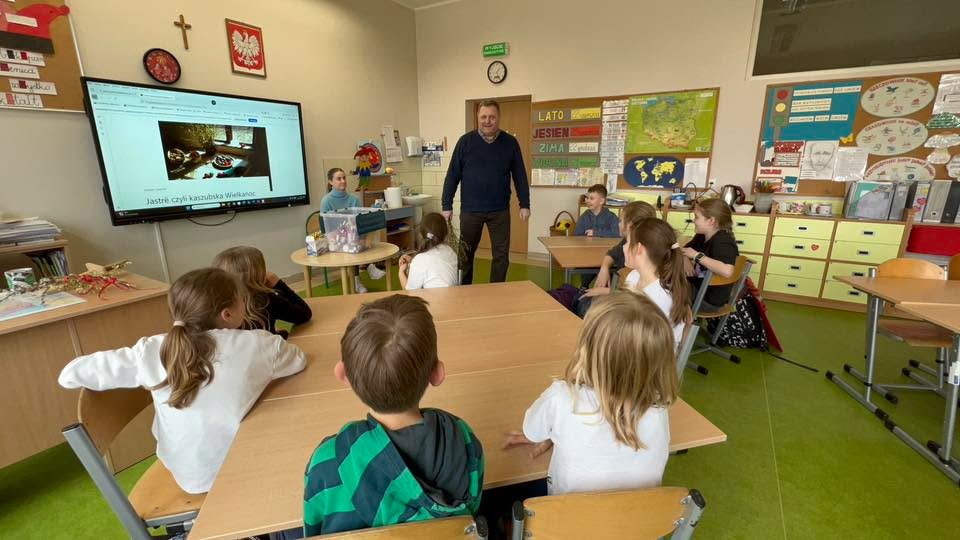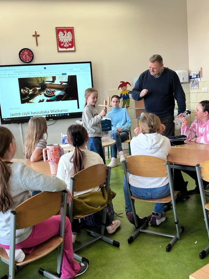 Dnia 30 marca 2026 r., w ramach zajęć z języka kaszubskiego, na zaproszenie pani Marii Borskiej, naszą szkołę odwiedzili wyjątkowi goście – pan Roman Drzeżdżon oraz pani Kamila Lademann z Muzeum Ziemi Puckiej w Pucku.