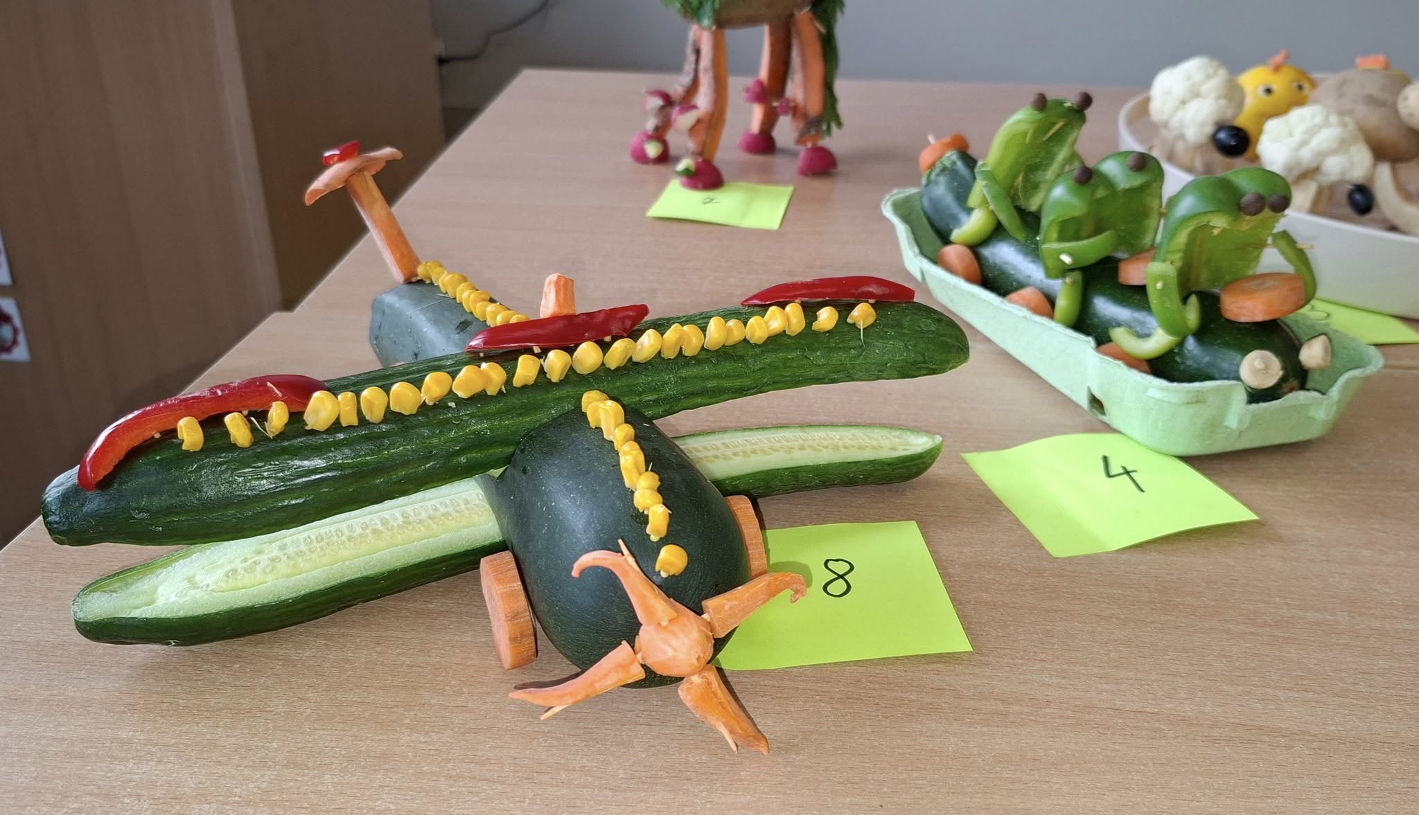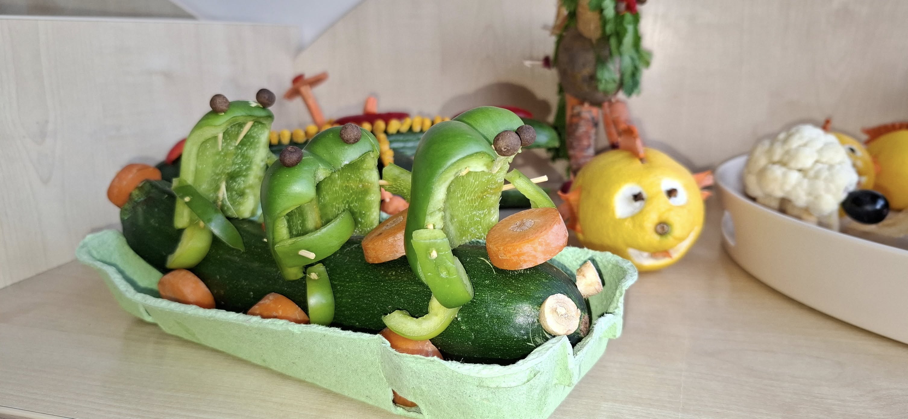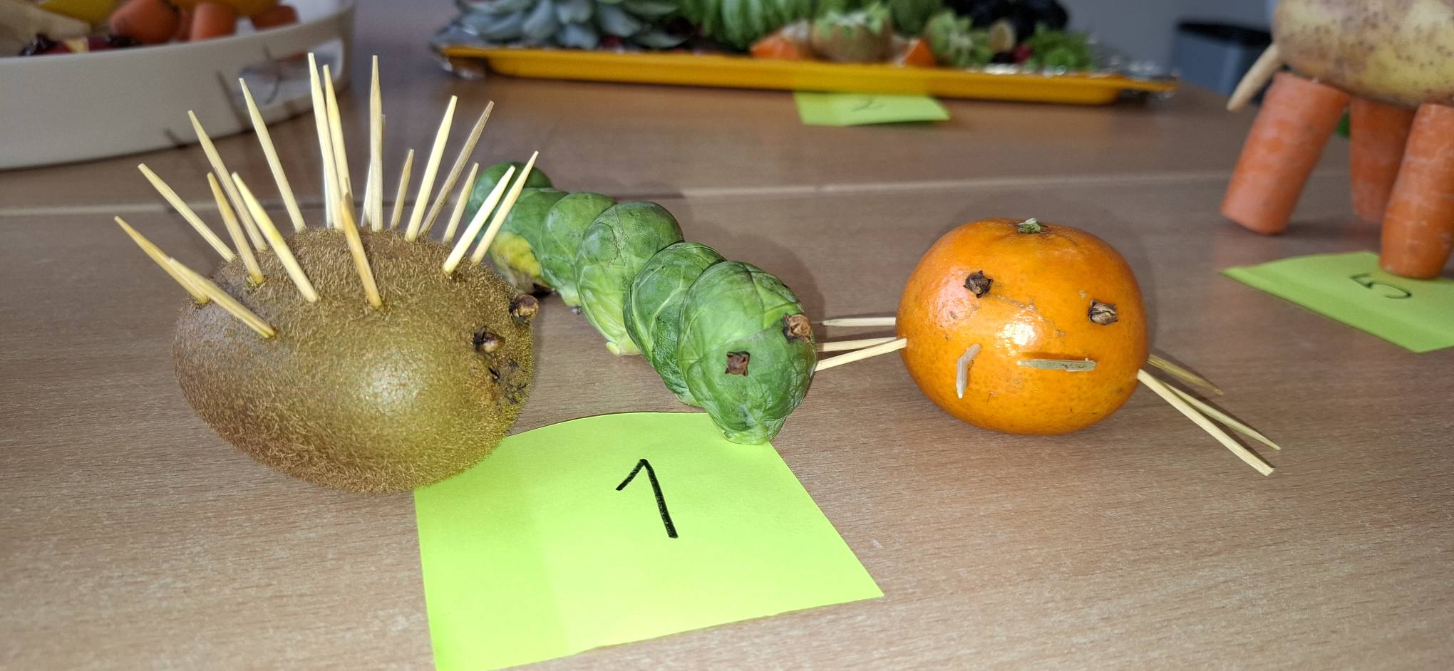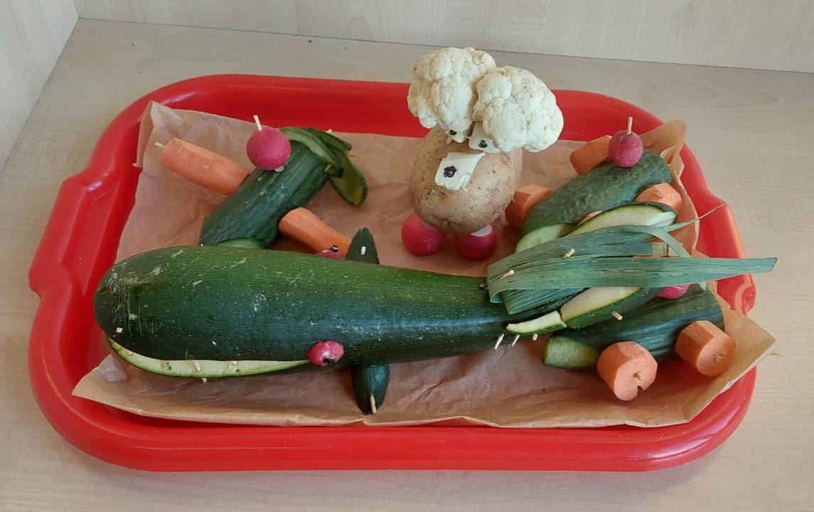 Na stołach pojawiły się wykonane z warzyw i owoców: zabawne ludziki, kolorowe zwierzaki, intrygujące owady oraz kosmiczne pojazdy.