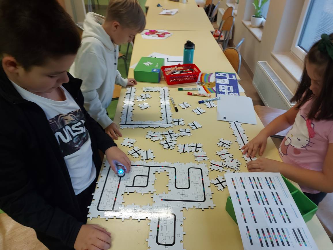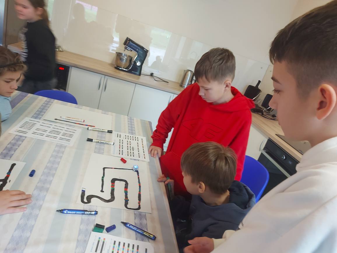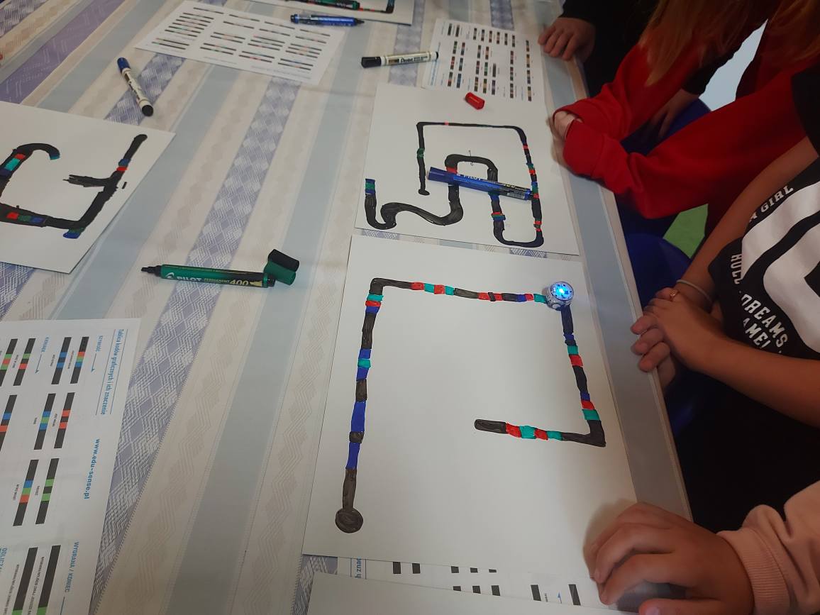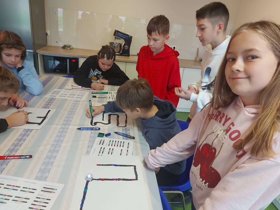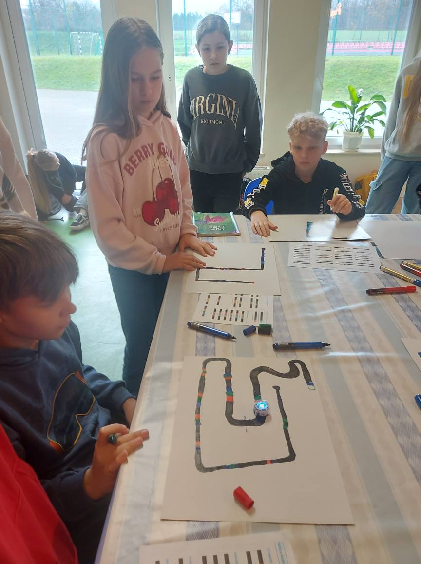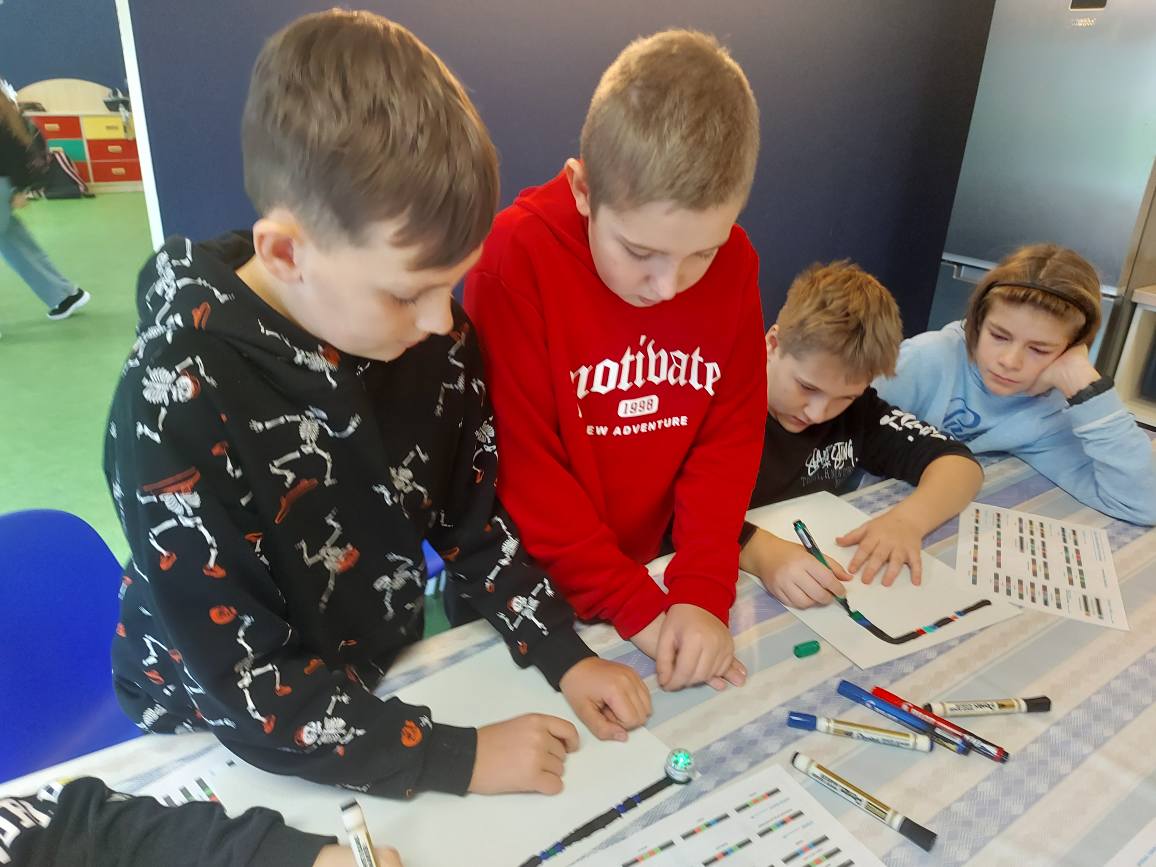 Na naszych stolikach pojawiły się małe, ale superinteligentne roboty Ozoboty 🤖💡, które dzięki kolorowym kodom ruszały w niezwykłe podróże po wcześniej zaplanowanych trasach. Uczniowie projektowali ścieżki pełne zakrętów, pułapek, zadań i niespodzianek 🎨🛤️ — a każdy poprawnie dobrany kolor oznaczał nowe polecenie dla robota!