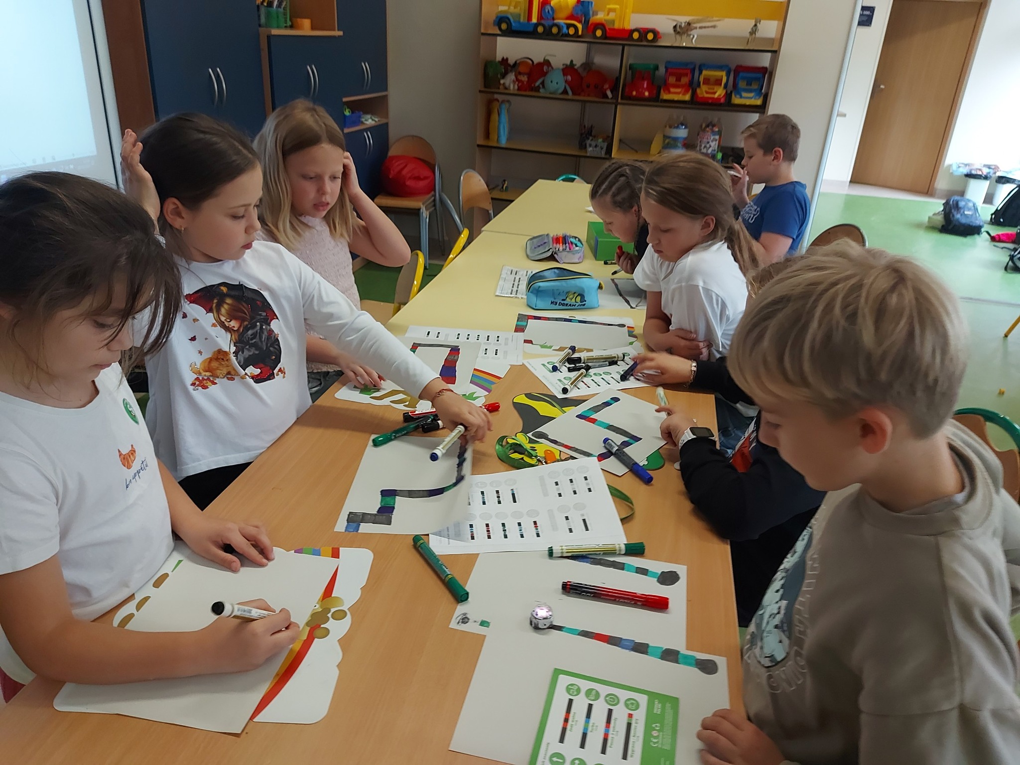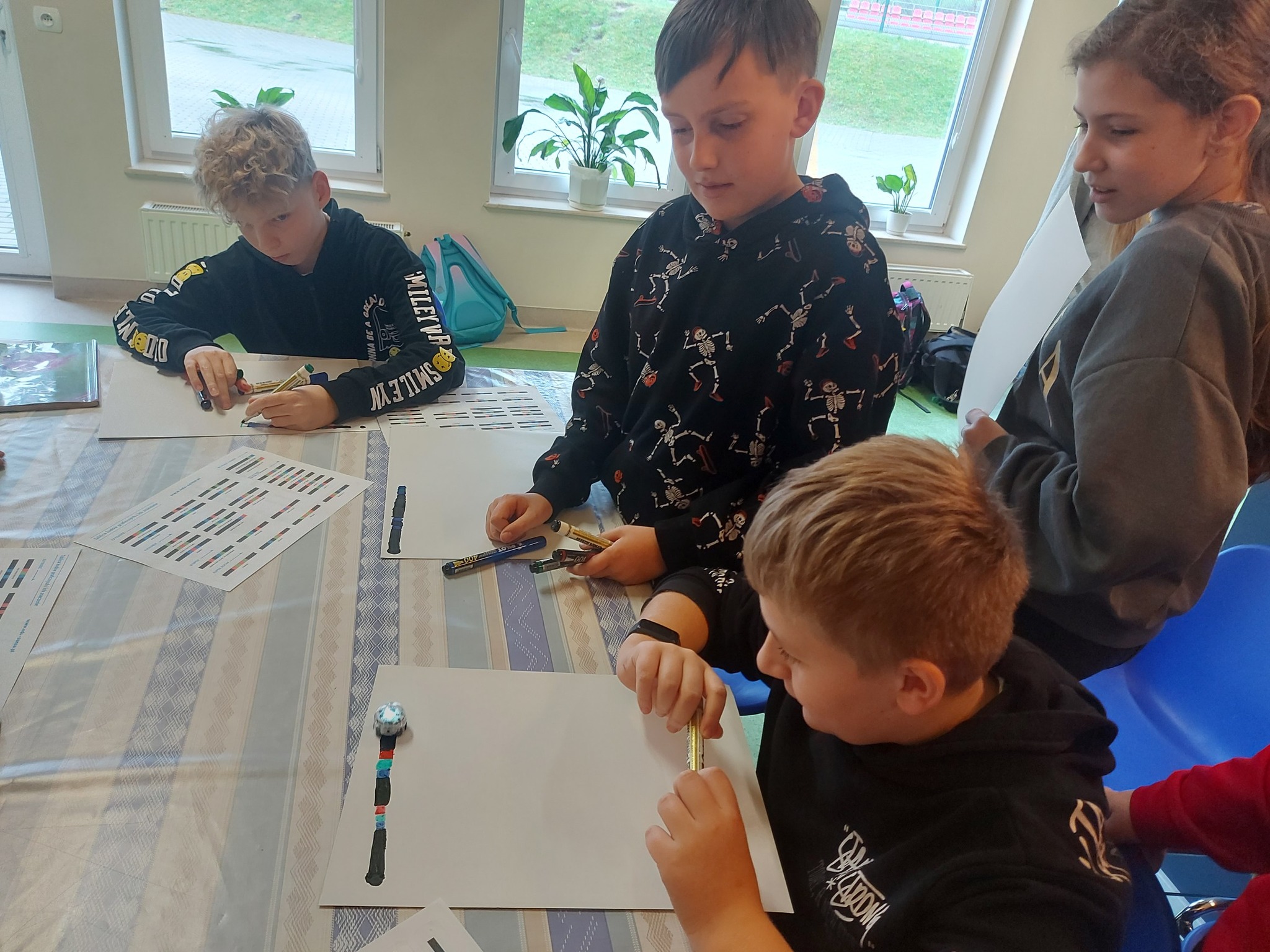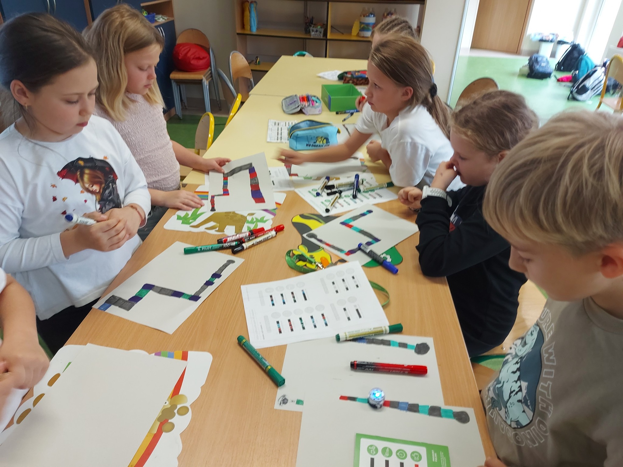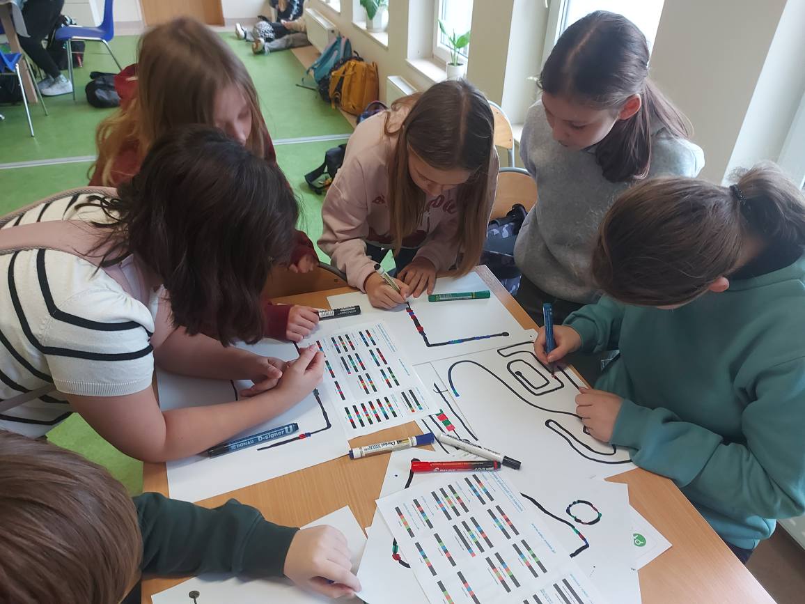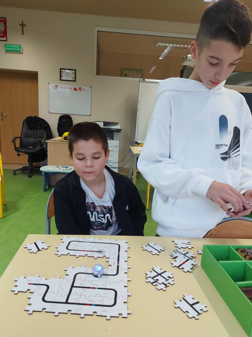 Na naszych stolikach pojawiły się małe, ale superinteligentne roboty Ozoboty 🤖💡, które dzięki kolorowym kodom ruszały w niezwykłe podróże po wcześniej zaplanowanych trasach. Uczniowie projektowali ścieżki pełne zakrętów, pułapek, zadań i niespodzianek 🎨🛤️ — a każdy poprawnie dobrany kolor oznaczał nowe polecenie dla robota!