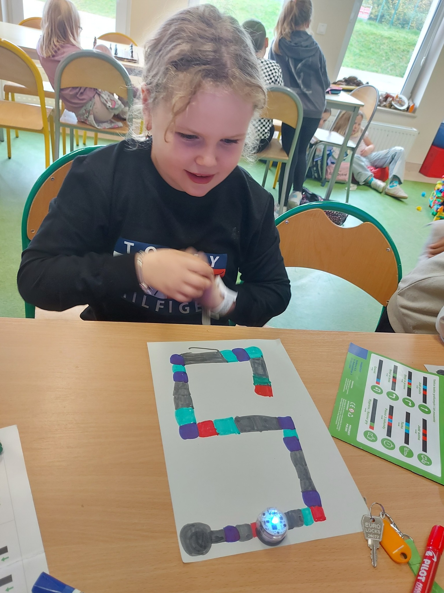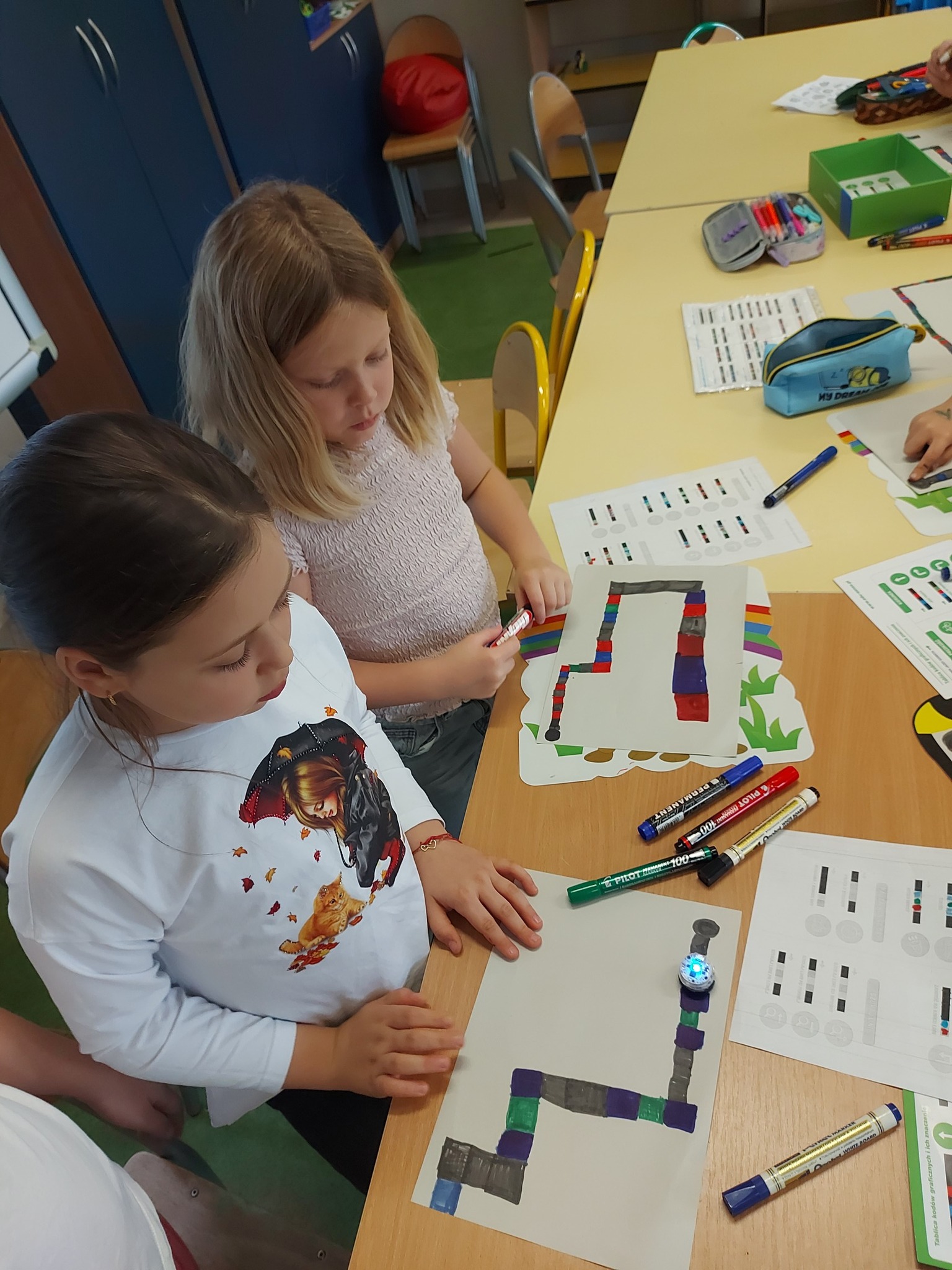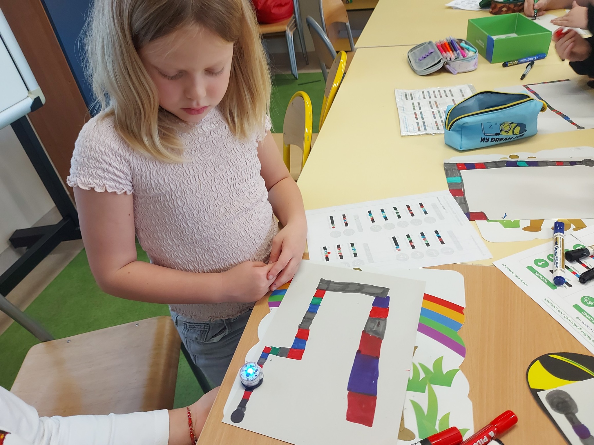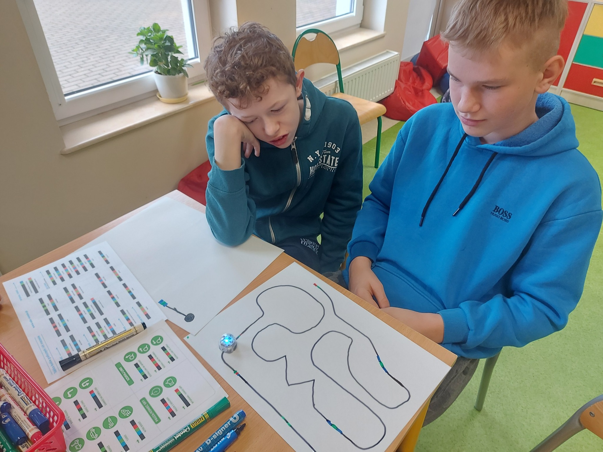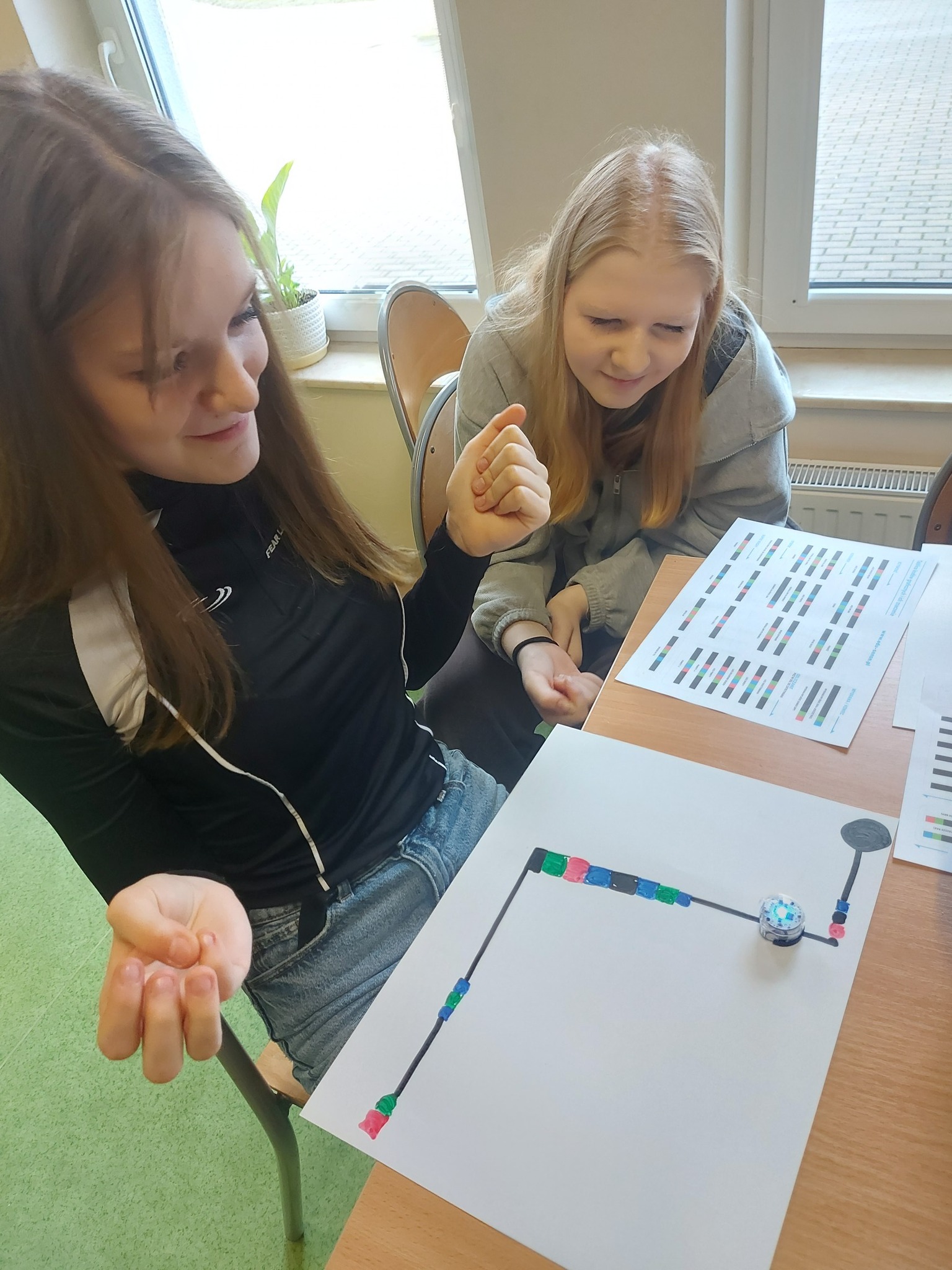 Na naszych stolikach pojawiły się małe, ale superinteligentne roboty Ozoboty 🤖💡, które dzięki kolorowym kodom ruszały w niezwykłe podróże po wcześniej zaplanowanych trasach. Uczniowie projektowali ścieżki pełne zakrętów, pułapek, zadań i niespodzianek 🎨🛤️ — a każdy poprawnie dobrany kolor oznaczał nowe polecenie dla robota!