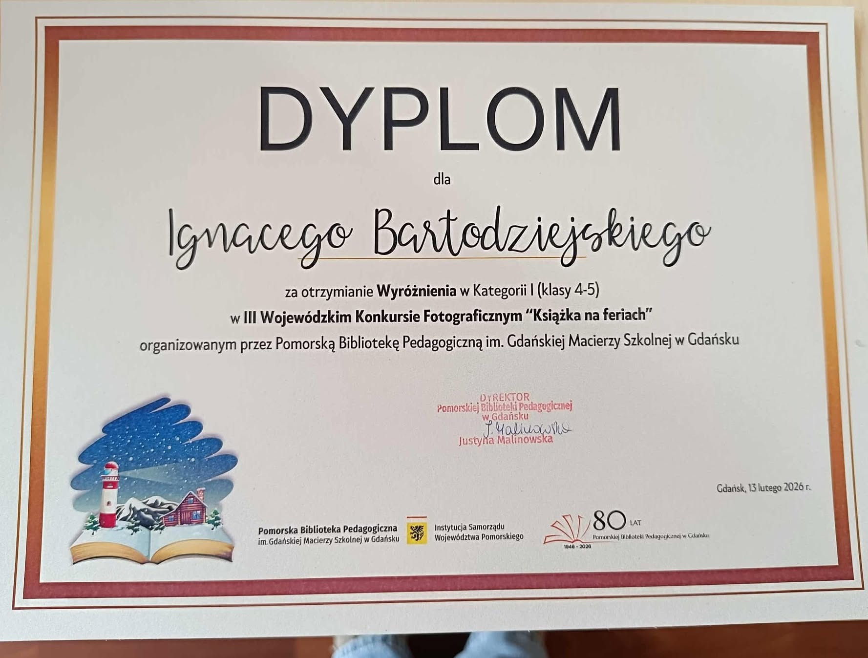 Z ogromną radością informujemy o sukcesie naszego ucznia – 𝐈𝐠𝐧𝐚𝐜𝐞𝐠𝐨 𝐁𝐚𝐫𝐭𝐨𝐝𝐳𝐢𝐞𝐣𝐬𝐤𝐢𝐞𝐠𝐨 𝐳 𝐤𝐥𝐚𝐬𝐲 𝐕, który zdobył wyróżnienie w kategorii klas 4–5 w 𝐈𝐈𝐈 𝐞𝐝𝐲𝐜𝐣𝐢 𝐖𝐨𝐣𝐞𝐰𝐨́𝐝𝐳𝐤𝐢𝐞𝐠𝐨 𝐊𝐨𝐧𝐤𝐮𝐫𝐬𝐮 𝐅𝐨𝐭𝐨𝐠𝐫𝐚𝐟𝐢𝐜𝐳𝐧𝐞𝐠𝐨 „𝐊𝐬𝐢𝐚̨𝐳̇𝐤𝐚 𝐧𝐚 𝐟𝐞𝐫𝐢𝐚𝐜𝐡”! 🌟
