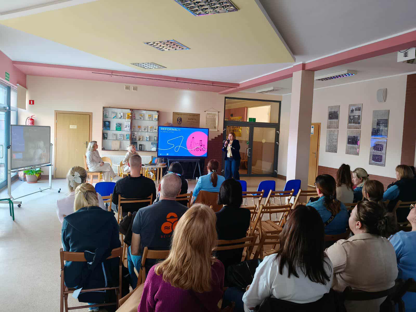W dalszej części Pani Ż𝐚𝐧𝐞𝐭𝐚 𝐒𝐭𝐚𝐰𝐢𝐜𝐤𝐚 zaprezentowała założenia reformy „𝐊𝐨𝐦𝐩𝐚𝐬 𝐉𝐮𝐭𝐫𝐚 𝟐𝟎𝟐𝟔”, wskazując jej spójność z ideą oceniania kształtującego. Podkreśliła, że współczesna szkoła powinna przygotowywać ucznia nie tylko do sprawdzianów, lecz przede wszystkim do samodzielnego myślenia, podejmowania decyzji oraz funkcjonowania w zmieniającym się świecie.