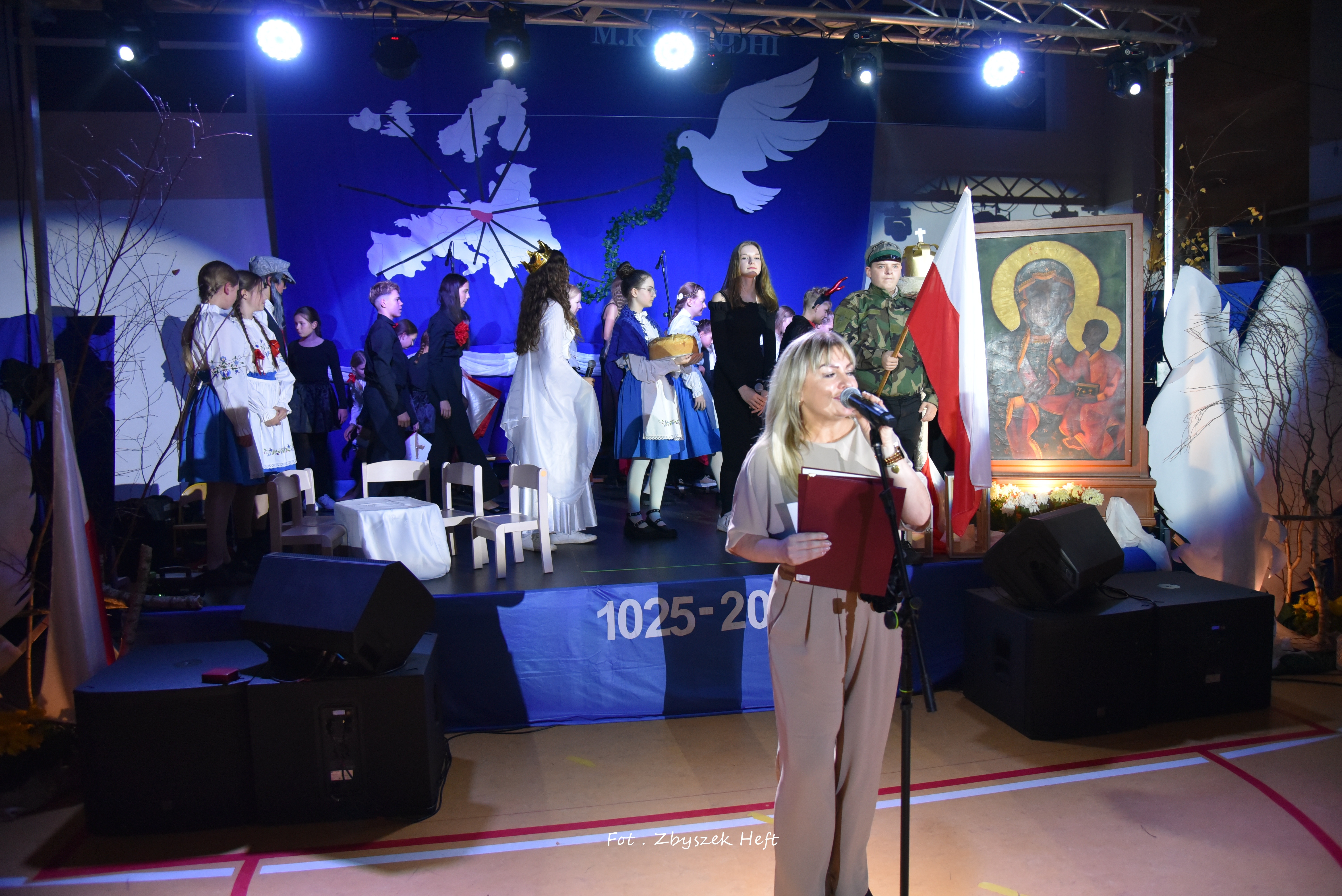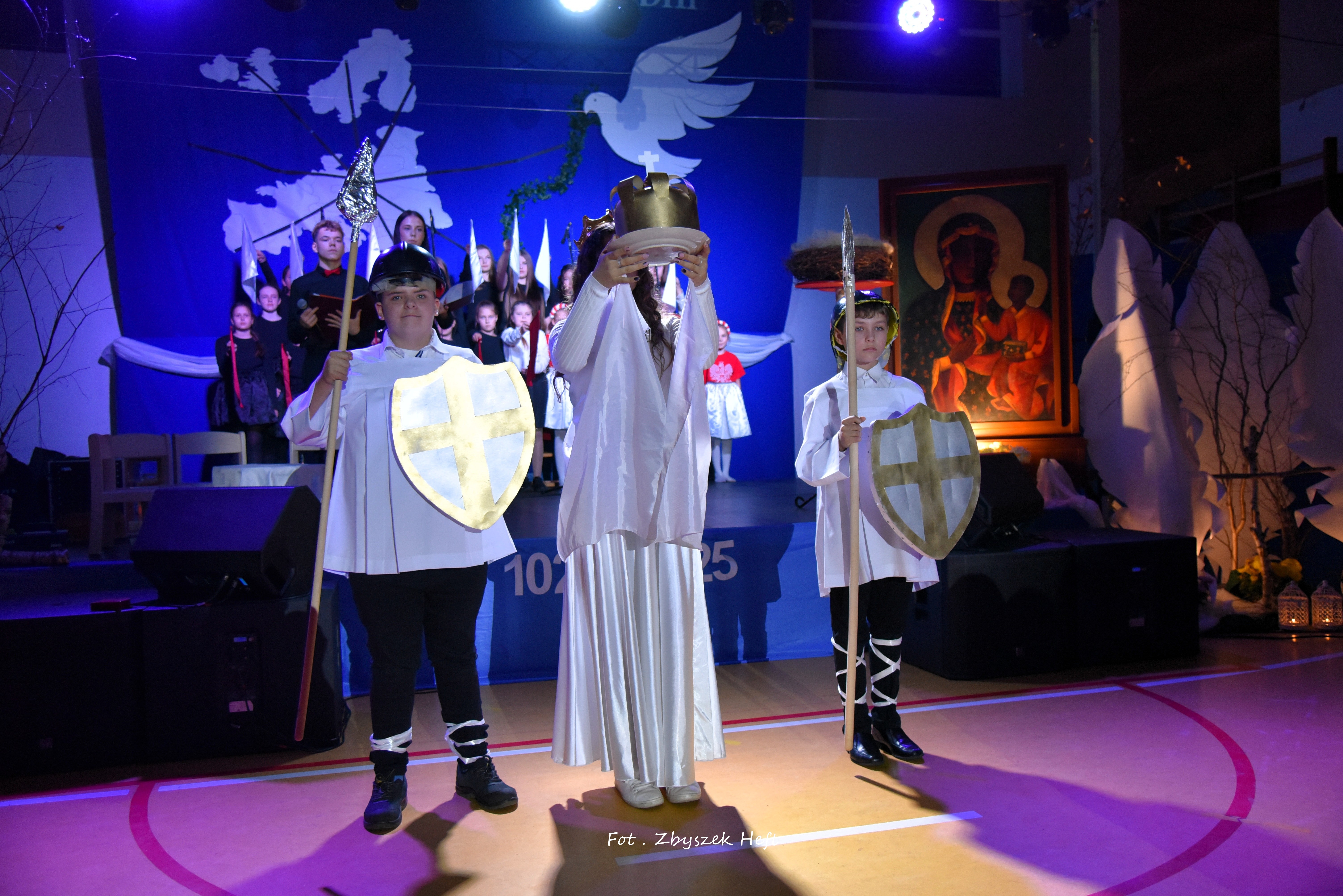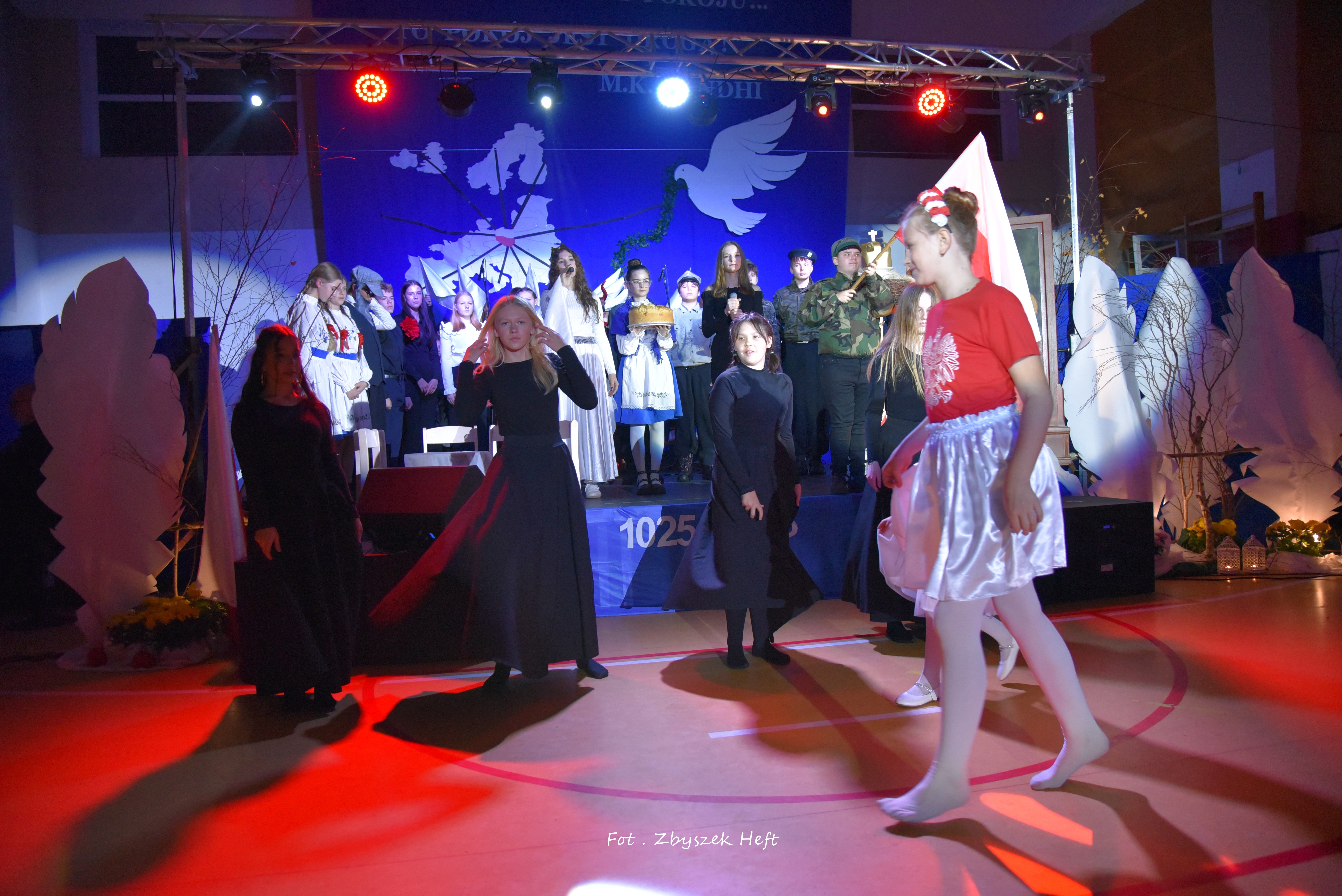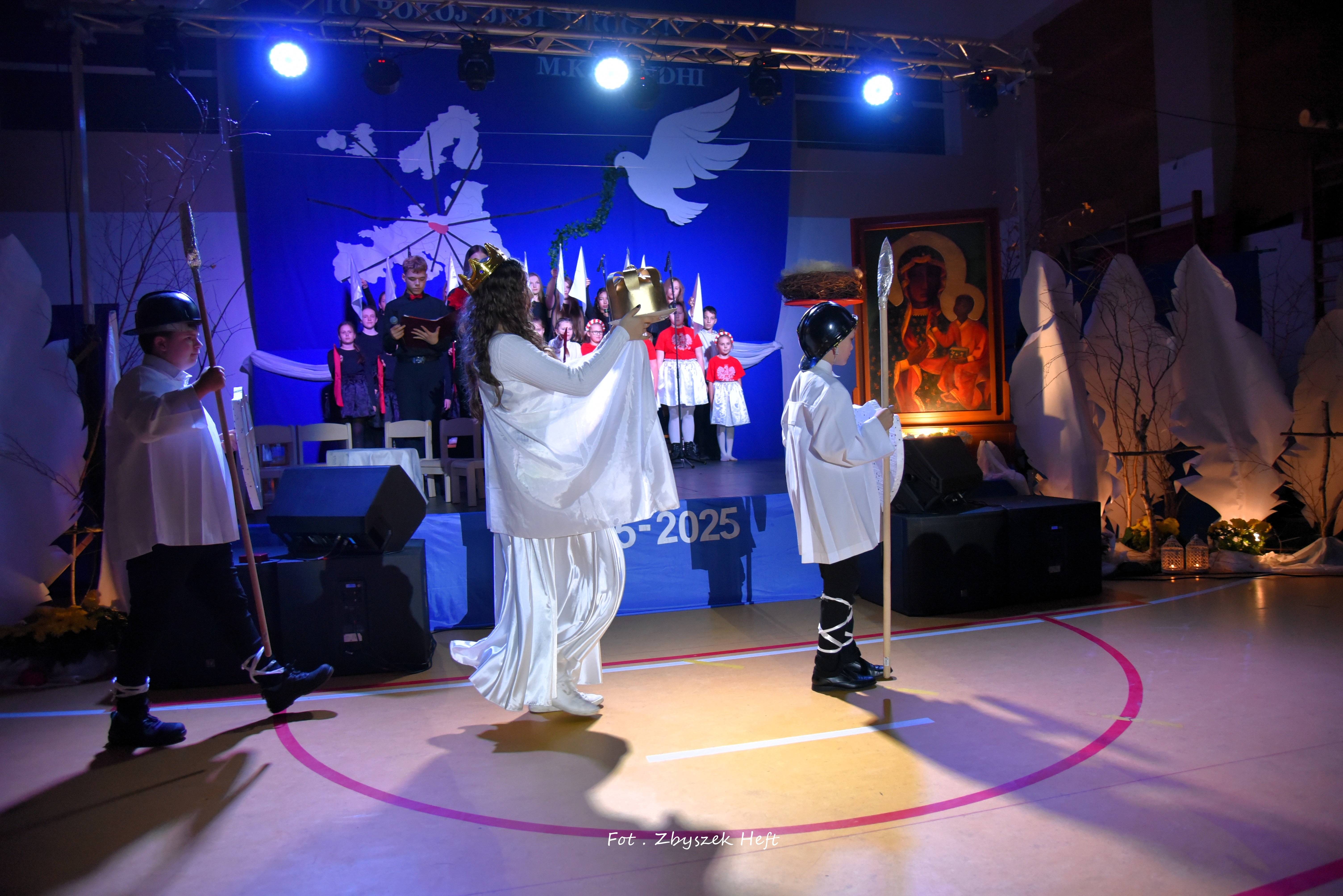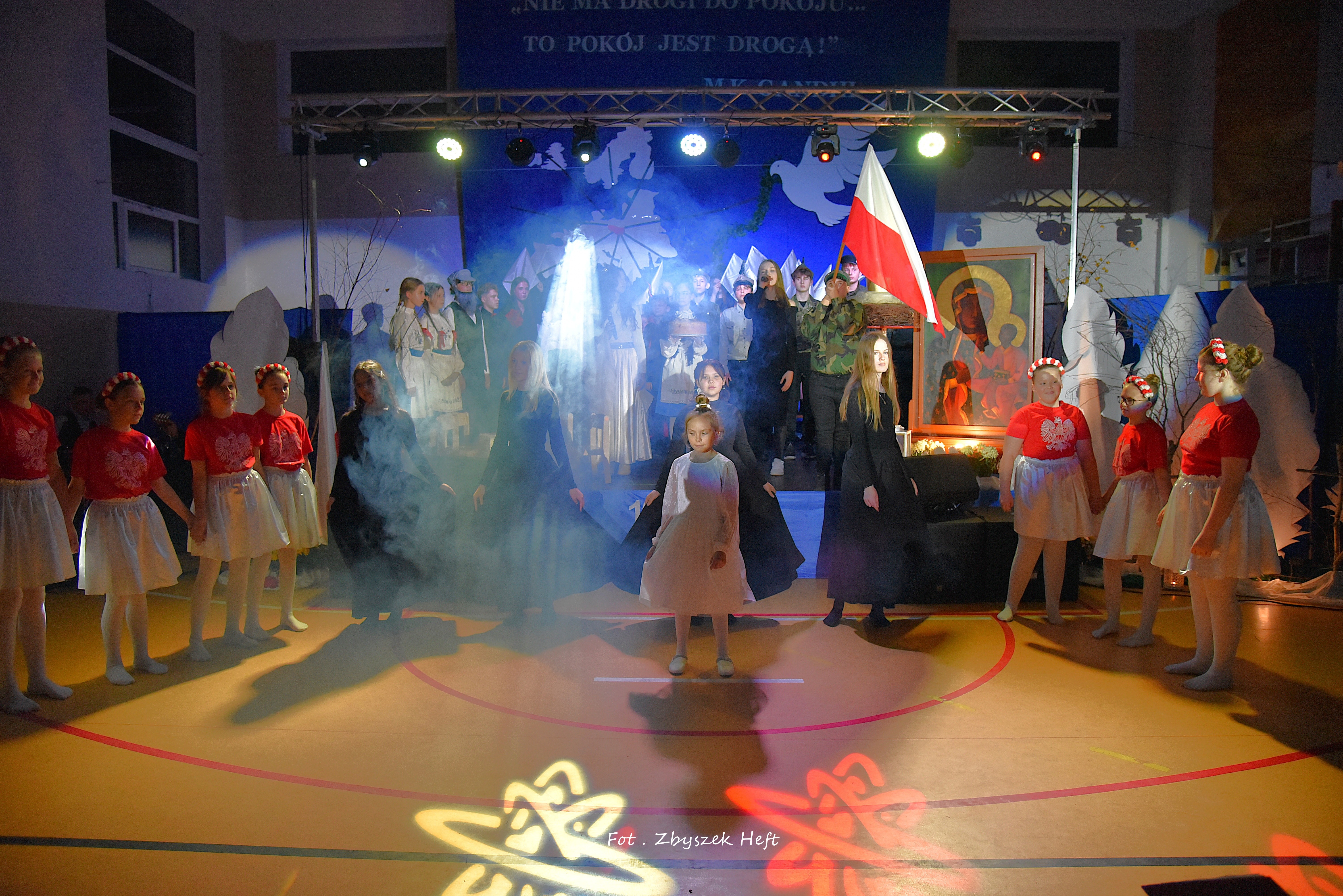 Po części oficjalnej i odprowadzeniu Sztandaru zgromadzeni mogli obejrzeć niezwykle poruszający 𝐬𝐩𝐞𝐤𝐭𝐚𝐤𝐥 𝐩𝐭. „𝐍𝐢𝐞 𝐦𝐚 𝐝𝐫𝐨𝐠𝐢 𝐝𝐨 𝐩𝐨𝐤𝐨𝐣𝐮. 𝐓𝐨 𝐩𝐨𝐤𝐨́𝐣 𝐣𝐞𝐬𝐭 𝐝𝐫𝐨𝐠𝐚̨” przygotowany przez uczniów klas IV-VIII pod kierunkiem nauczycieli: P. Haliny Gojke, P. Beaty Dettlaff i P. Bartłomieja Szefke.