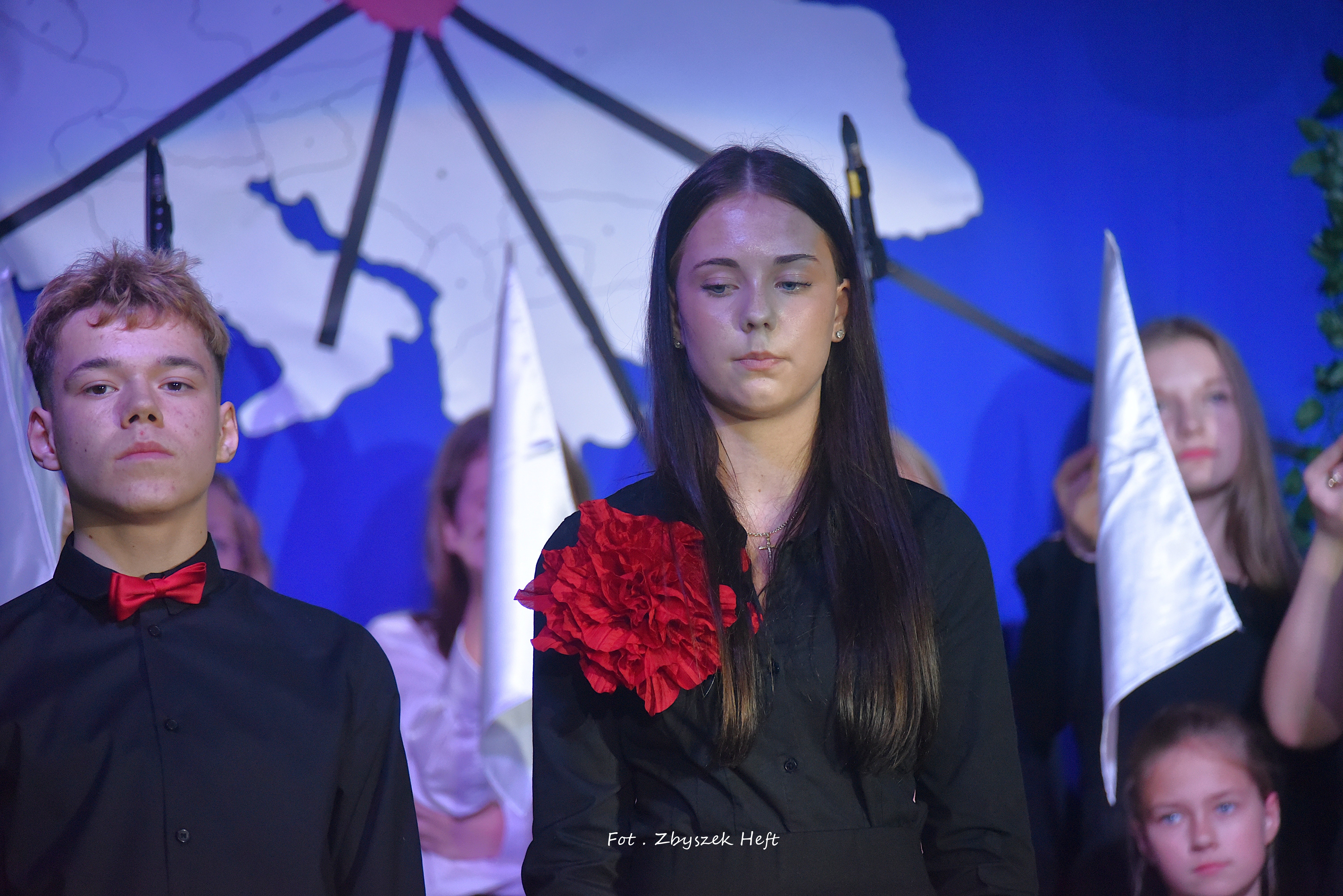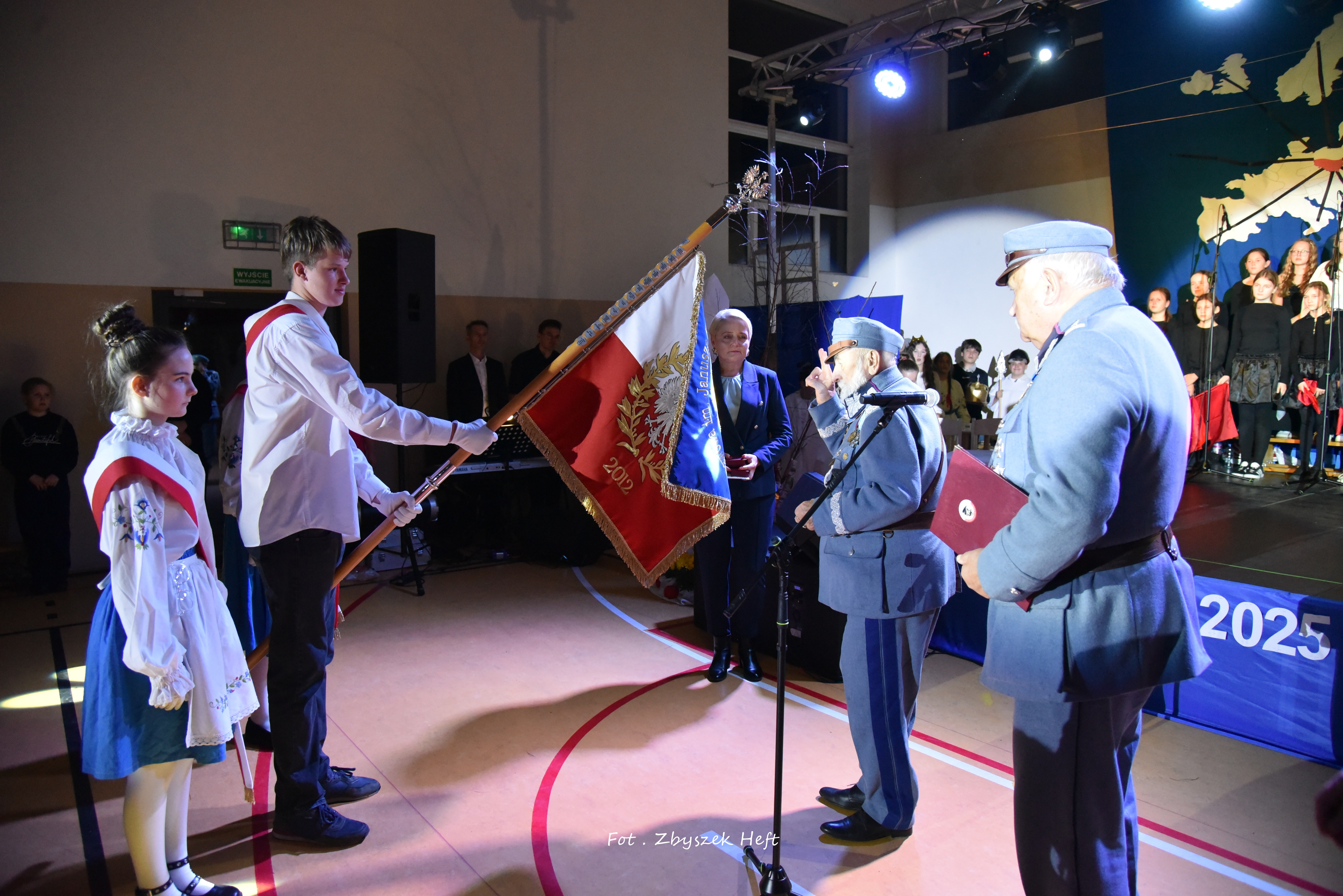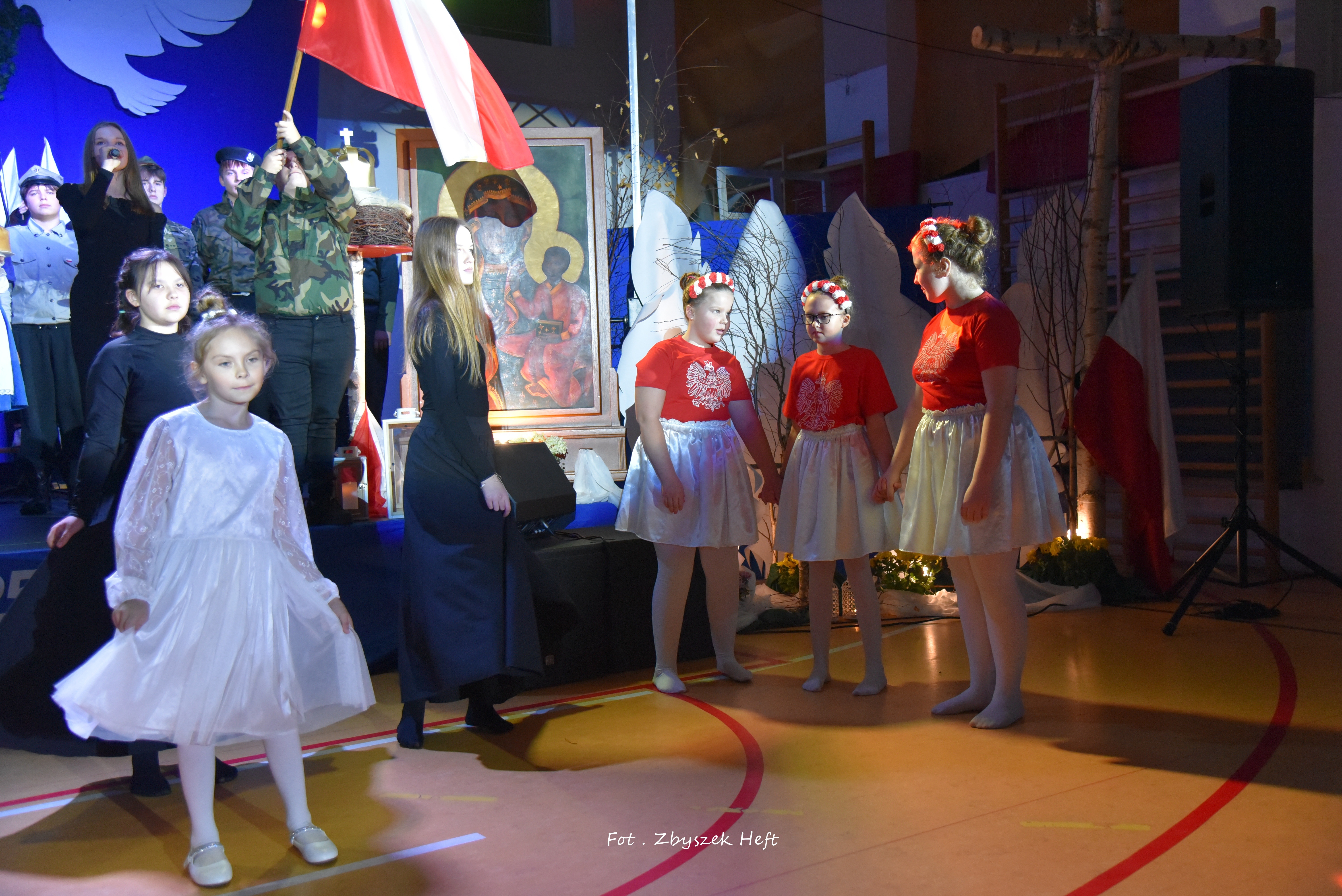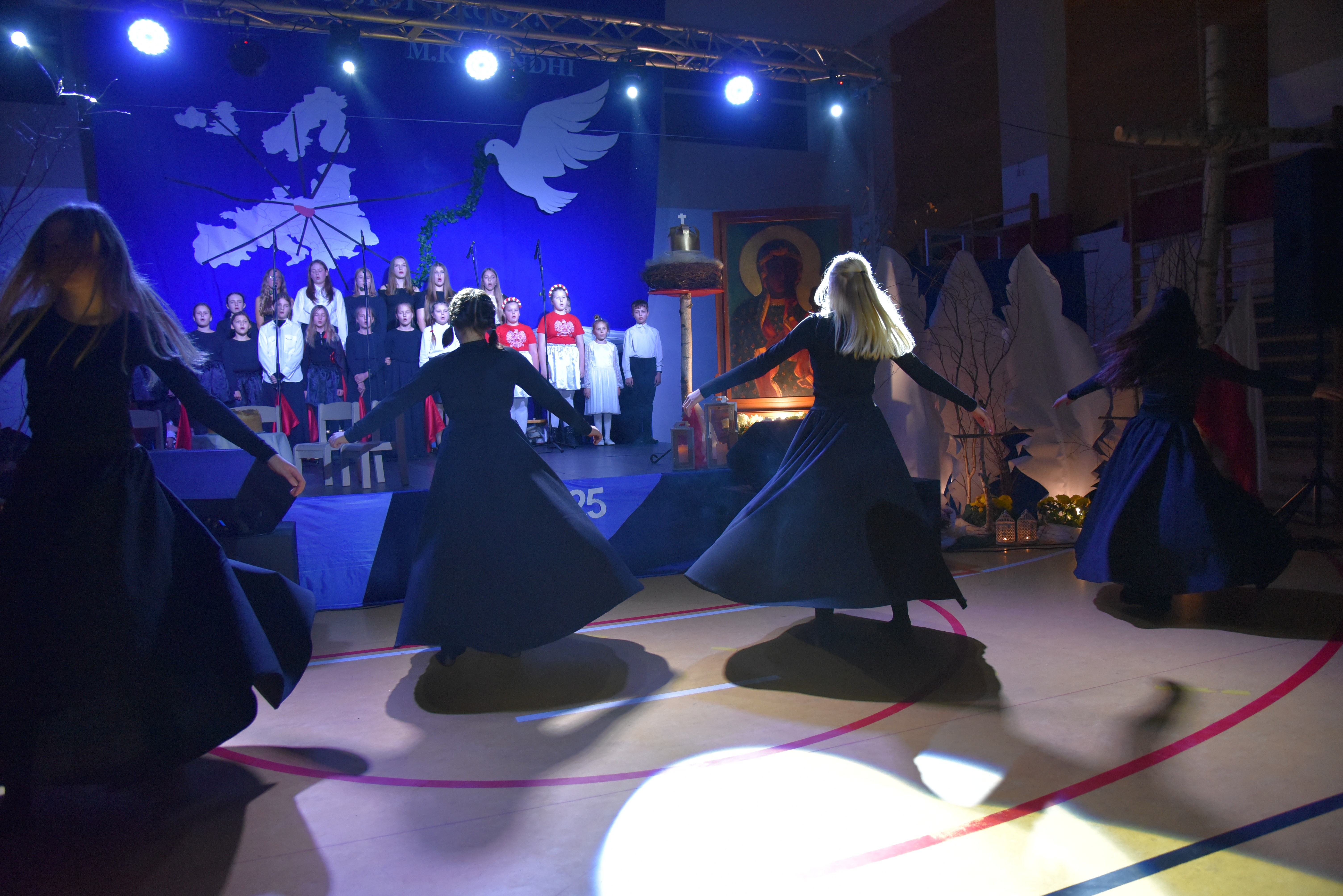 Po części oficjalnej i odprowadzeniu Sztandaru zgromadzeni mogli obejrzeć niezwykle poruszający 𝐬𝐩𝐞𝐤𝐭𝐚𝐤𝐥 𝐩𝐭. „𝐍𝐢𝐞 𝐦𝐚 𝐝𝐫𝐨𝐠𝐢 𝐝𝐨 𝐩𝐨𝐤𝐨𝐣𝐮. 𝐓𝐨 𝐩𝐨𝐤𝐨́𝐣 𝐣𝐞𝐬𝐭 𝐝𝐫𝐨𝐠𝐚̨” przygotowany przez uczniów klas IV-VIII pod kierunkiem nauczycieli: P. Haliny Gojke, P. Beaty Dettlaff i P. Bartłomieja Szefke.