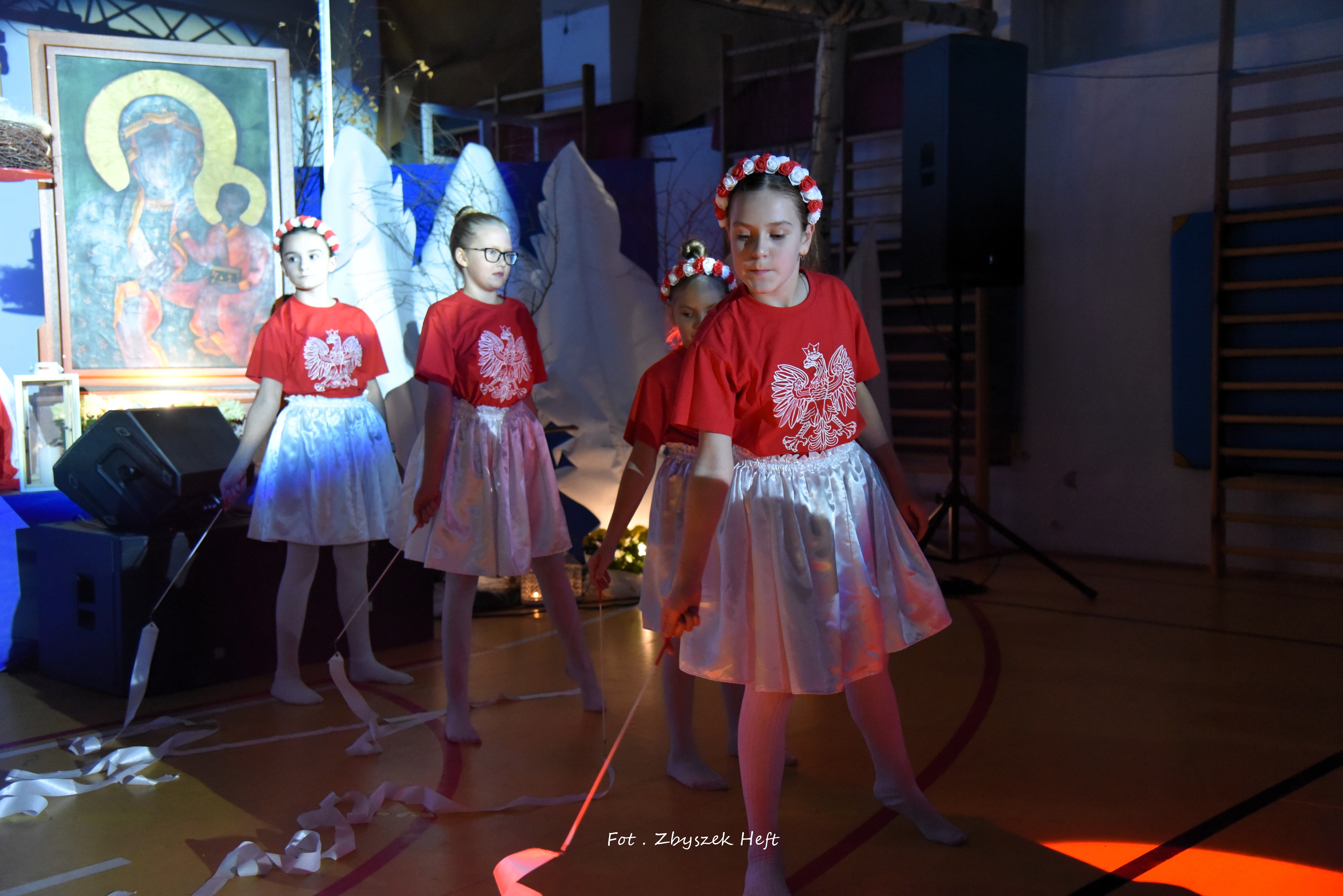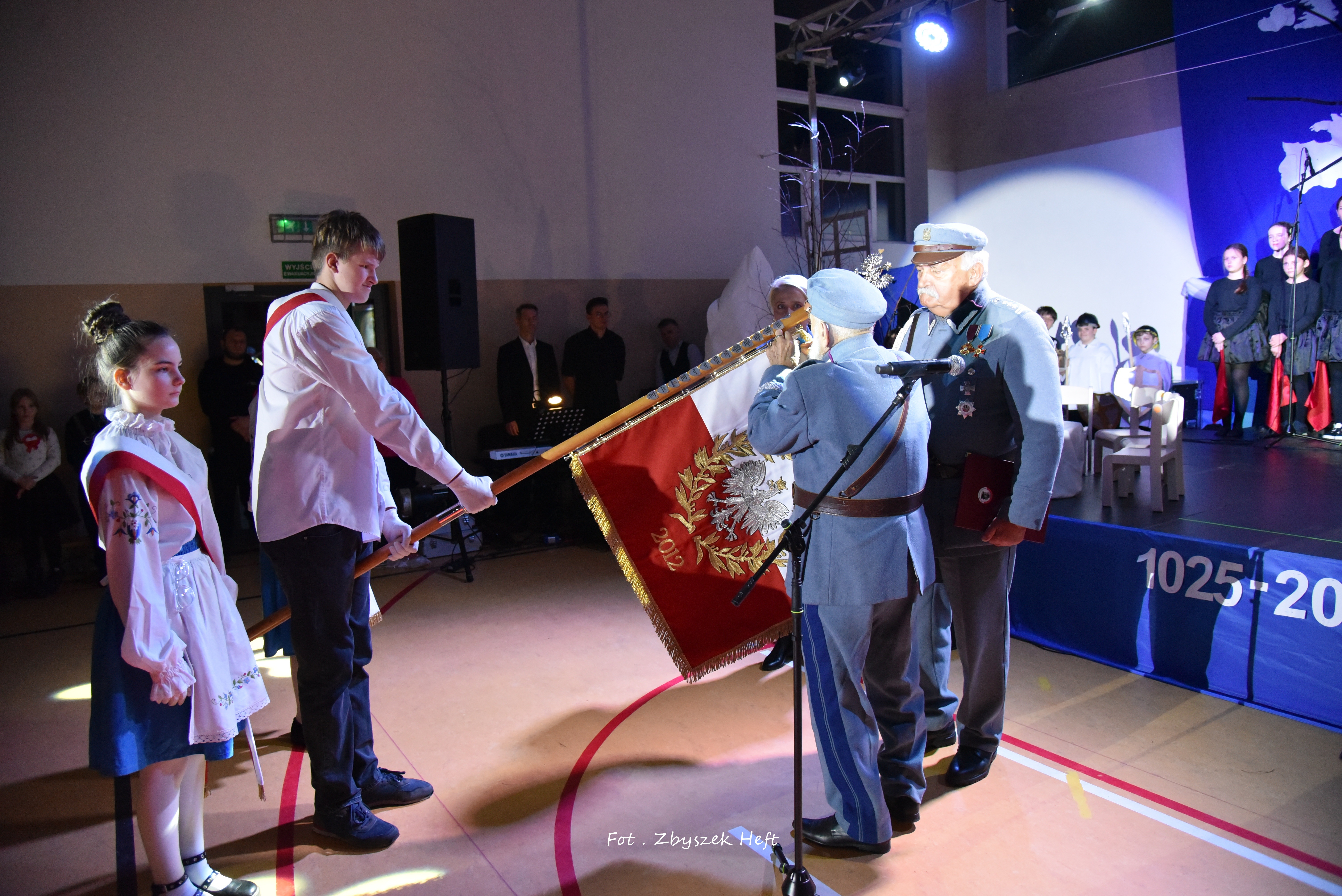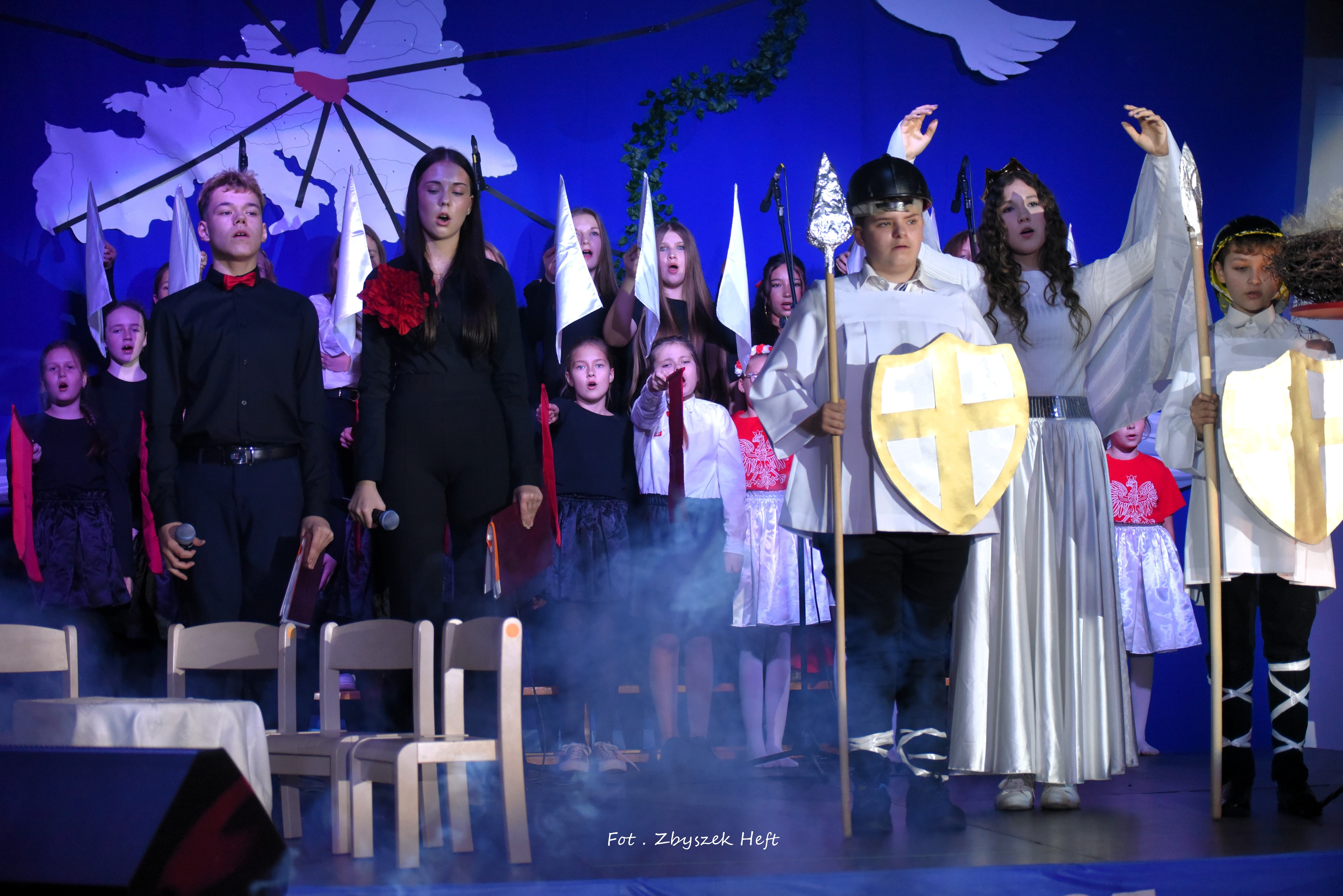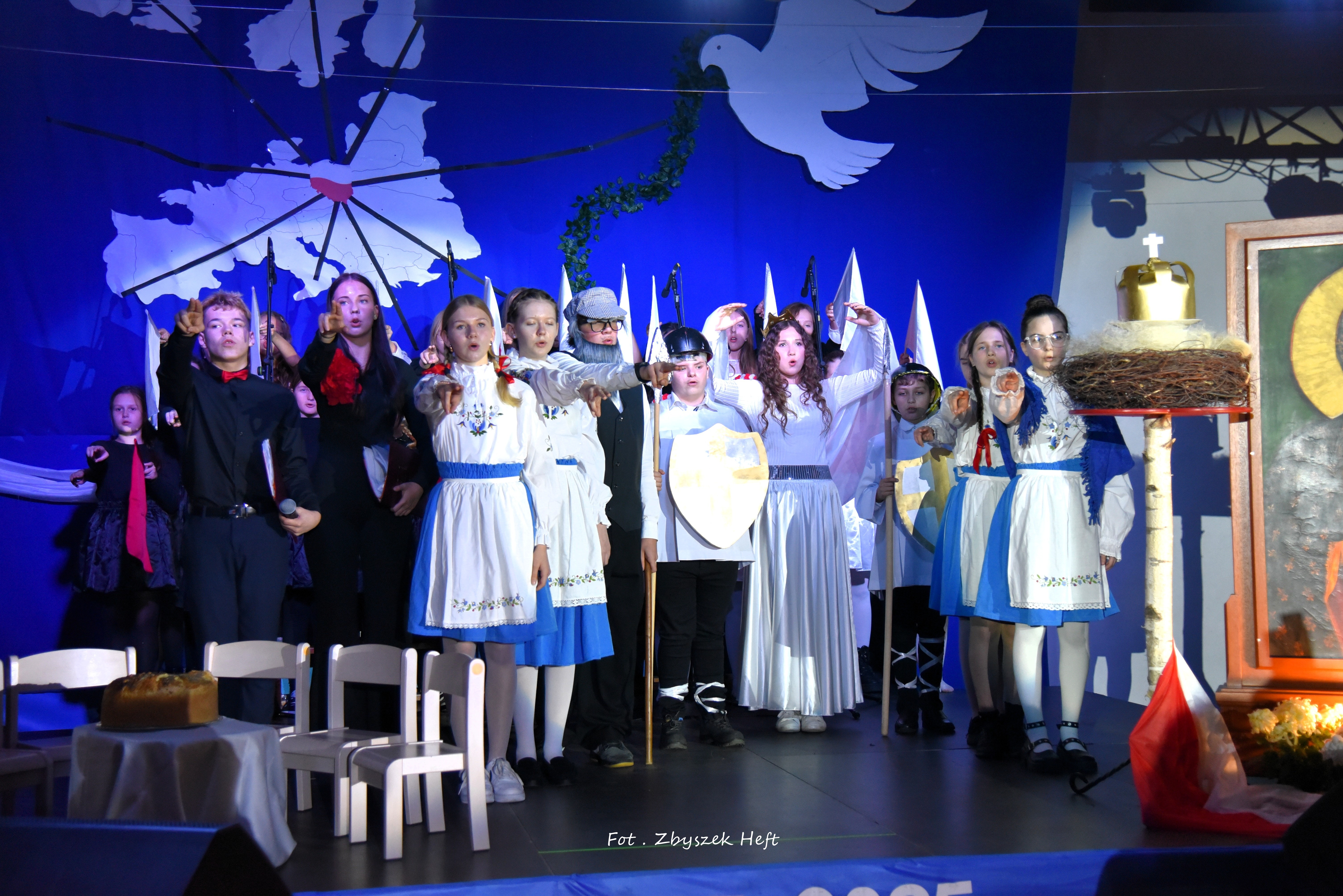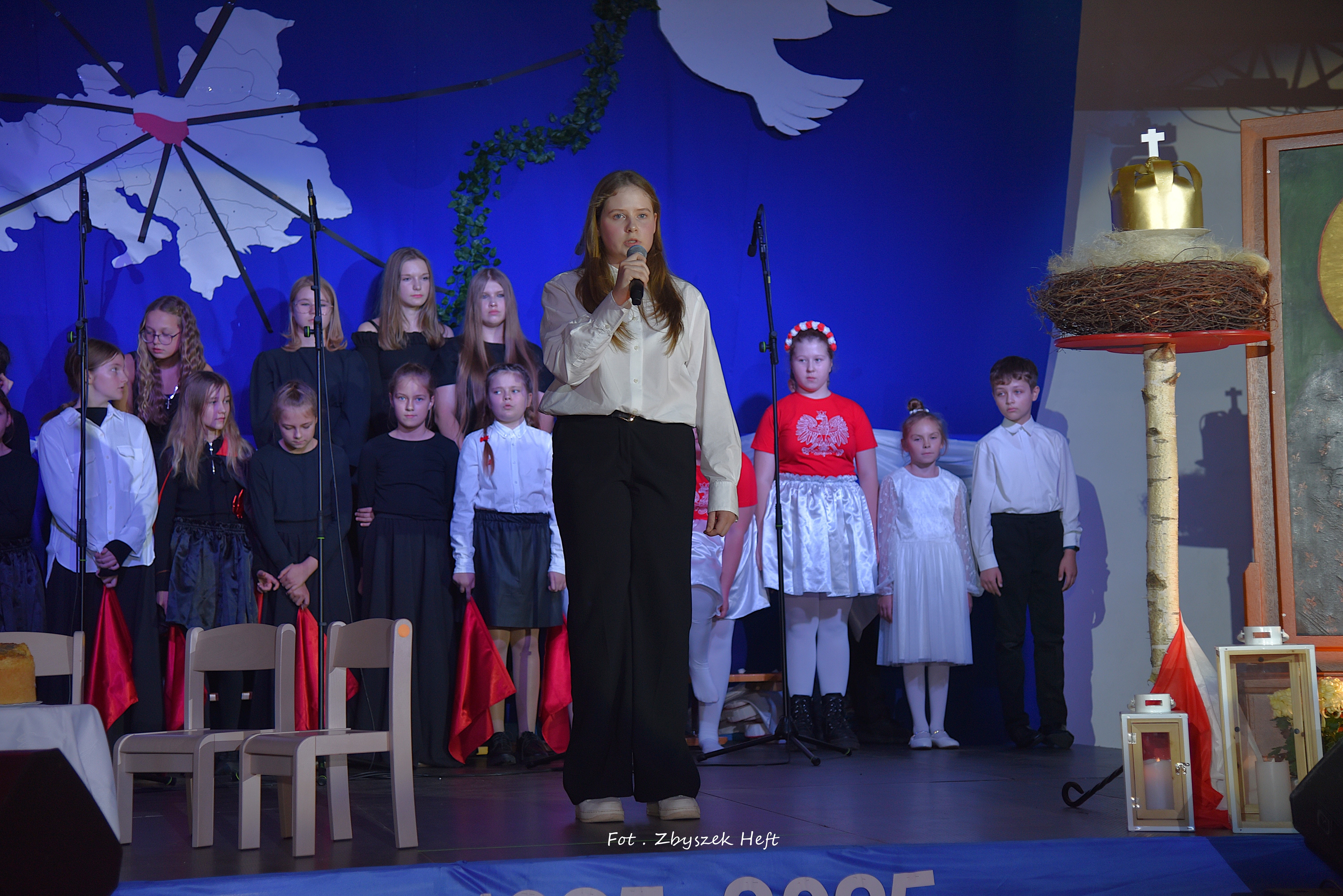 Po części oficjalnej i odprowadzeniu Sztandaru zgromadzeni mogli obejrzeć niezwykle poruszający 𝐬𝐩𝐞𝐤𝐭𝐚𝐤𝐥 𝐩𝐭. „𝐍𝐢𝐞 𝐦𝐚 𝐝𝐫𝐨𝐠𝐢 𝐝𝐨 𝐩𝐨𝐤𝐨𝐣𝐮. 𝐓𝐨 𝐩𝐨𝐤𝐨́𝐣 𝐣𝐞𝐬𝐭 𝐝𝐫𝐨𝐠𝐚̨” przygotowany przez uczniów klas IV-VIII pod kierunkiem nauczycieli: P. Haliny Gojke, P. Beaty Dettlaff i P. Bartłomieja Szefke.