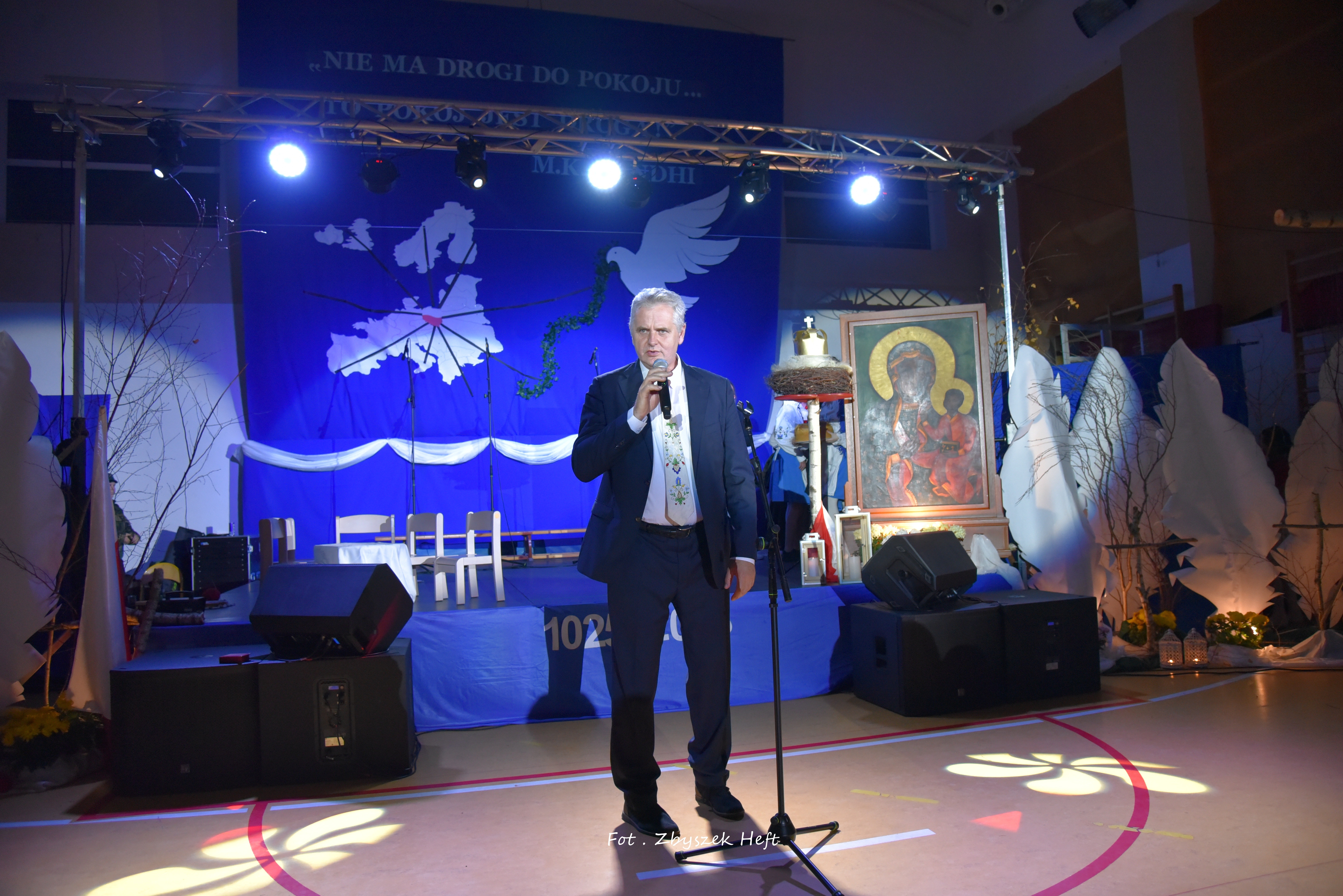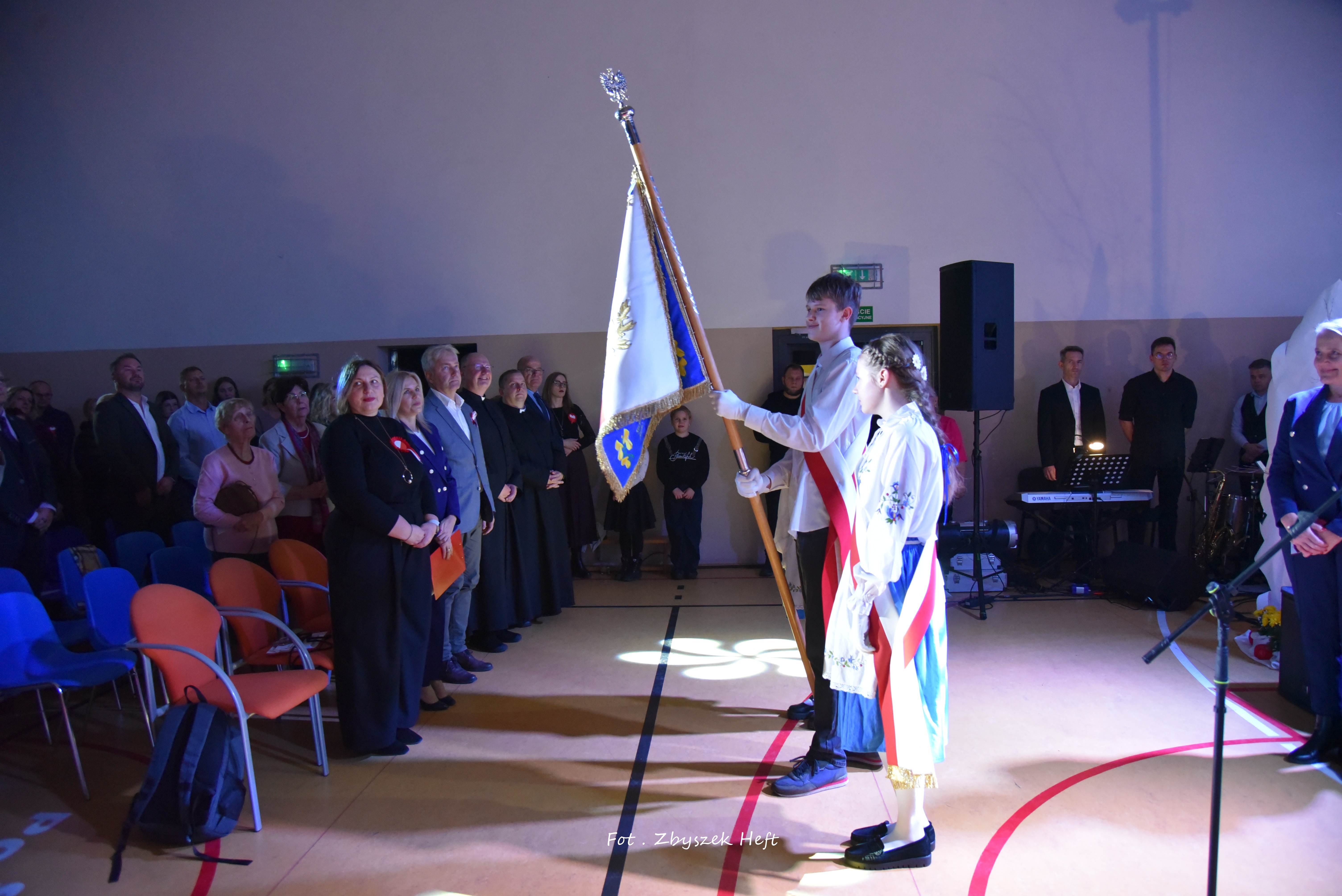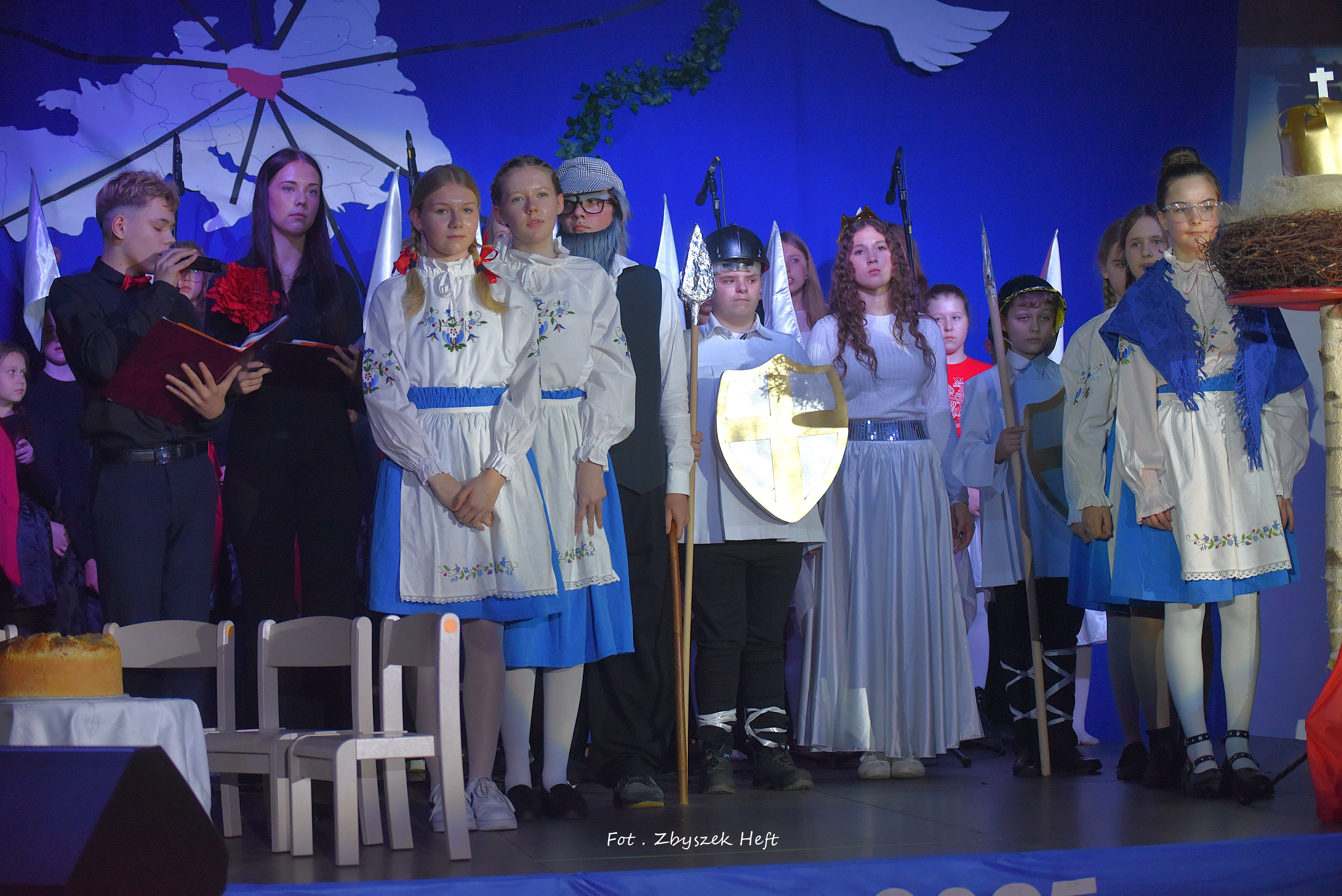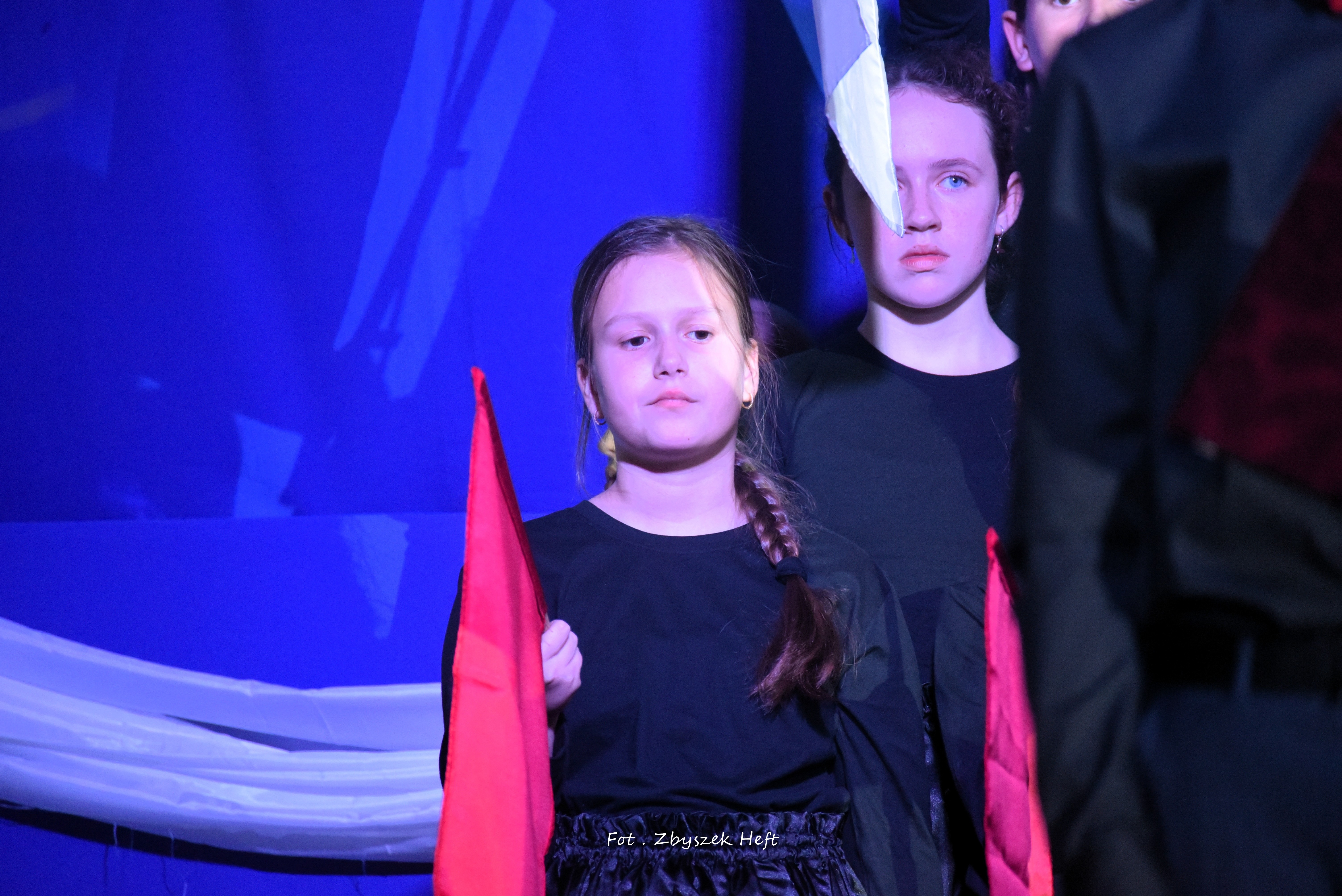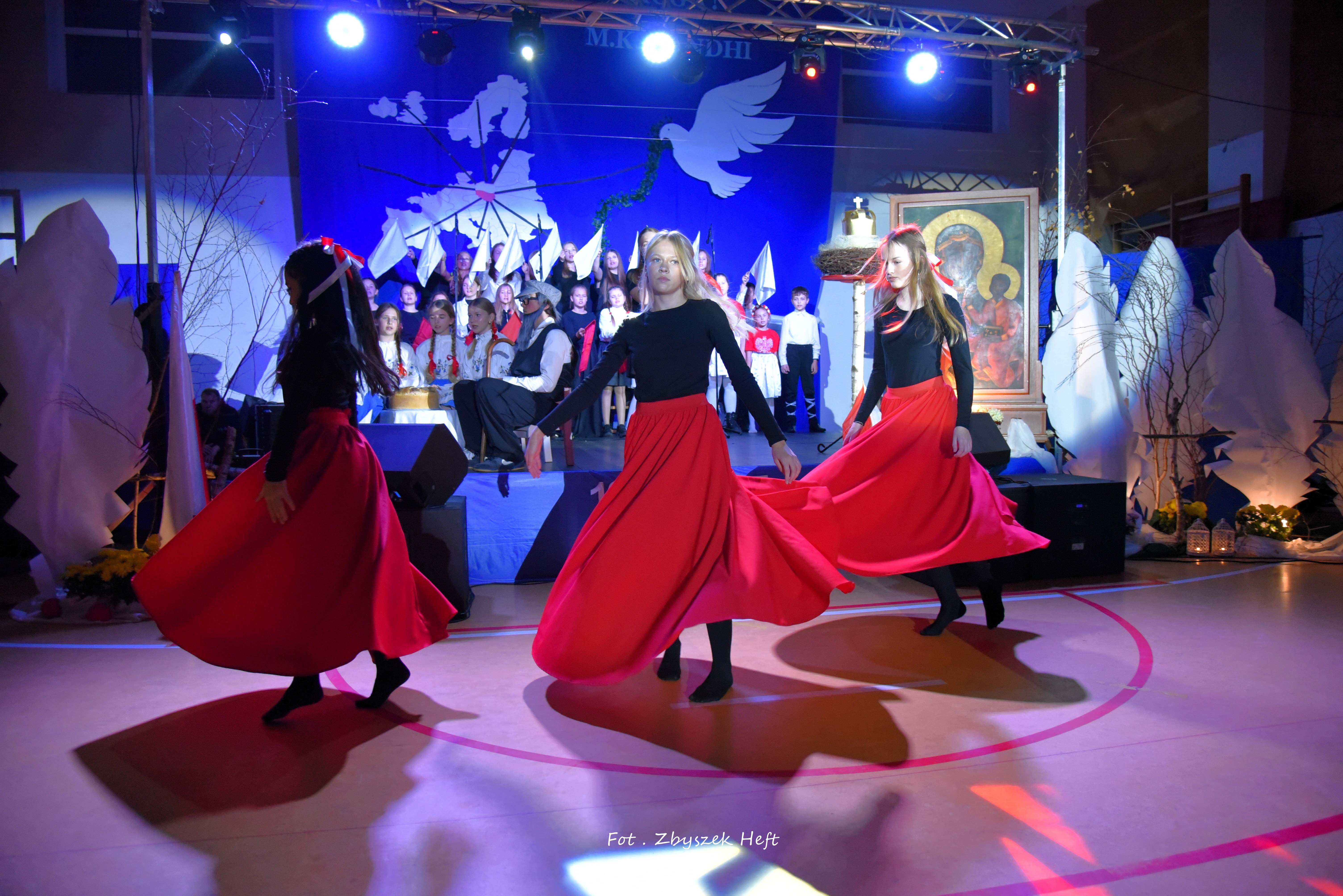 Po części oficjalnej i odprowadzeniu Sztandaru zgromadzeni mogli obejrzeć niezwykle poruszający 𝐬𝐩𝐞𝐤𝐭𝐚𝐤𝐥 𝐩𝐭. „𝐍𝐢𝐞 𝐦𝐚 𝐝𝐫𝐨𝐠𝐢 𝐝𝐨 𝐩𝐨𝐤𝐨𝐣𝐮. 𝐓𝐨 𝐩𝐨𝐤𝐨́𝐣 𝐣𝐞𝐬𝐭 𝐝𝐫𝐨𝐠𝐚̨” przygotowany przez uczniów klas IV-VIII pod kierunkiem nauczycieli: P. Haliny Gojke, P. Beaty Dettlaff i P. Bartłomieja Szefke.