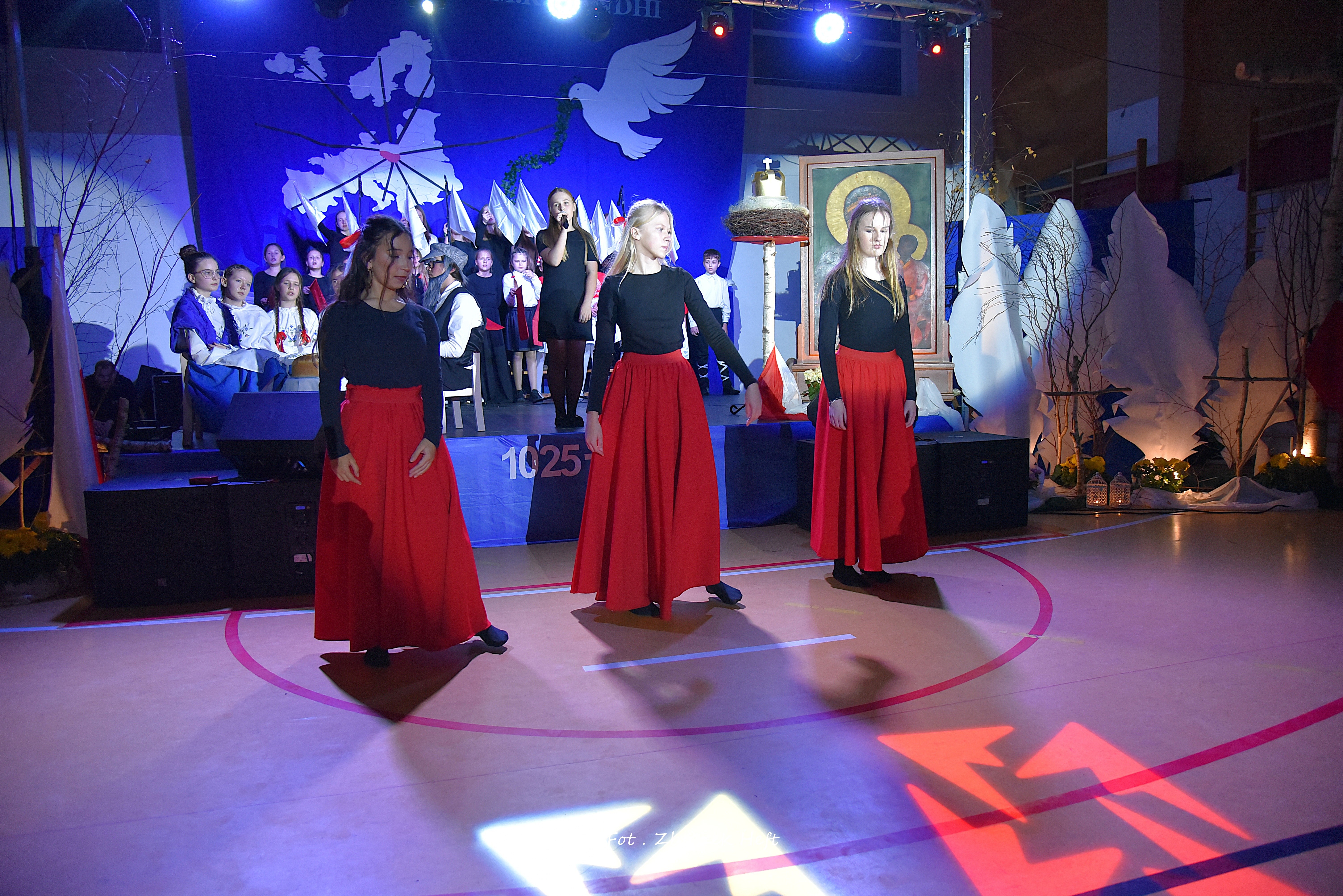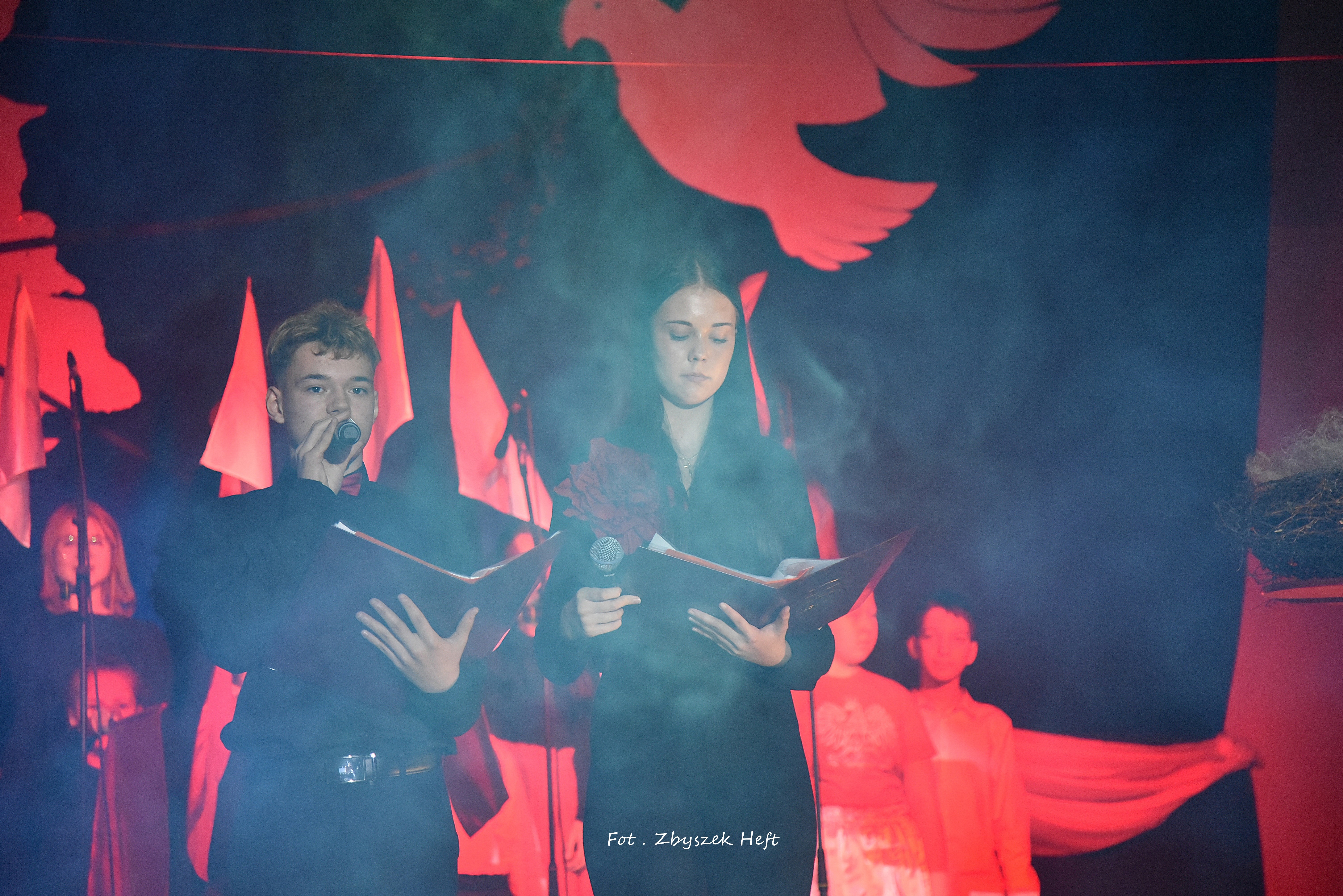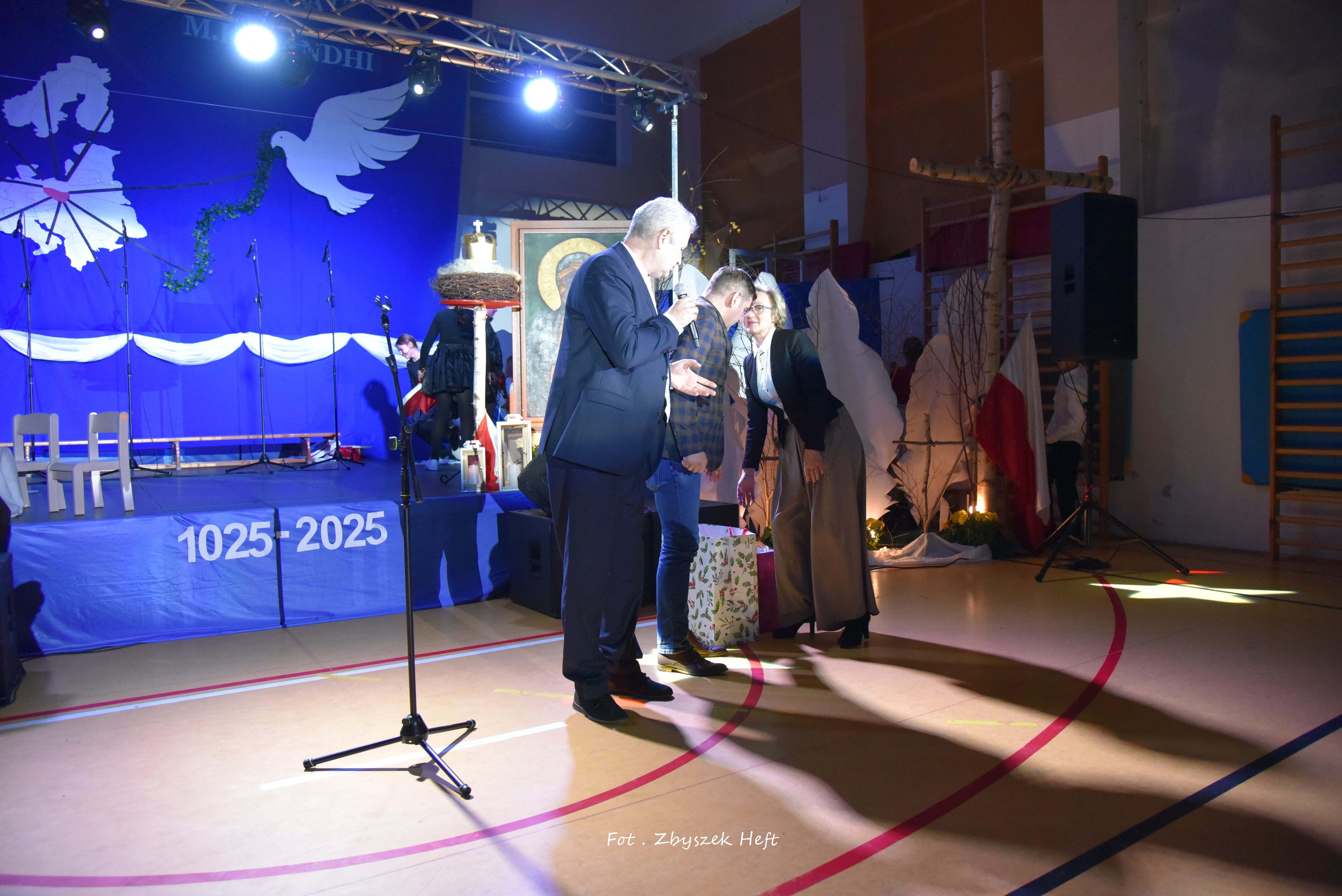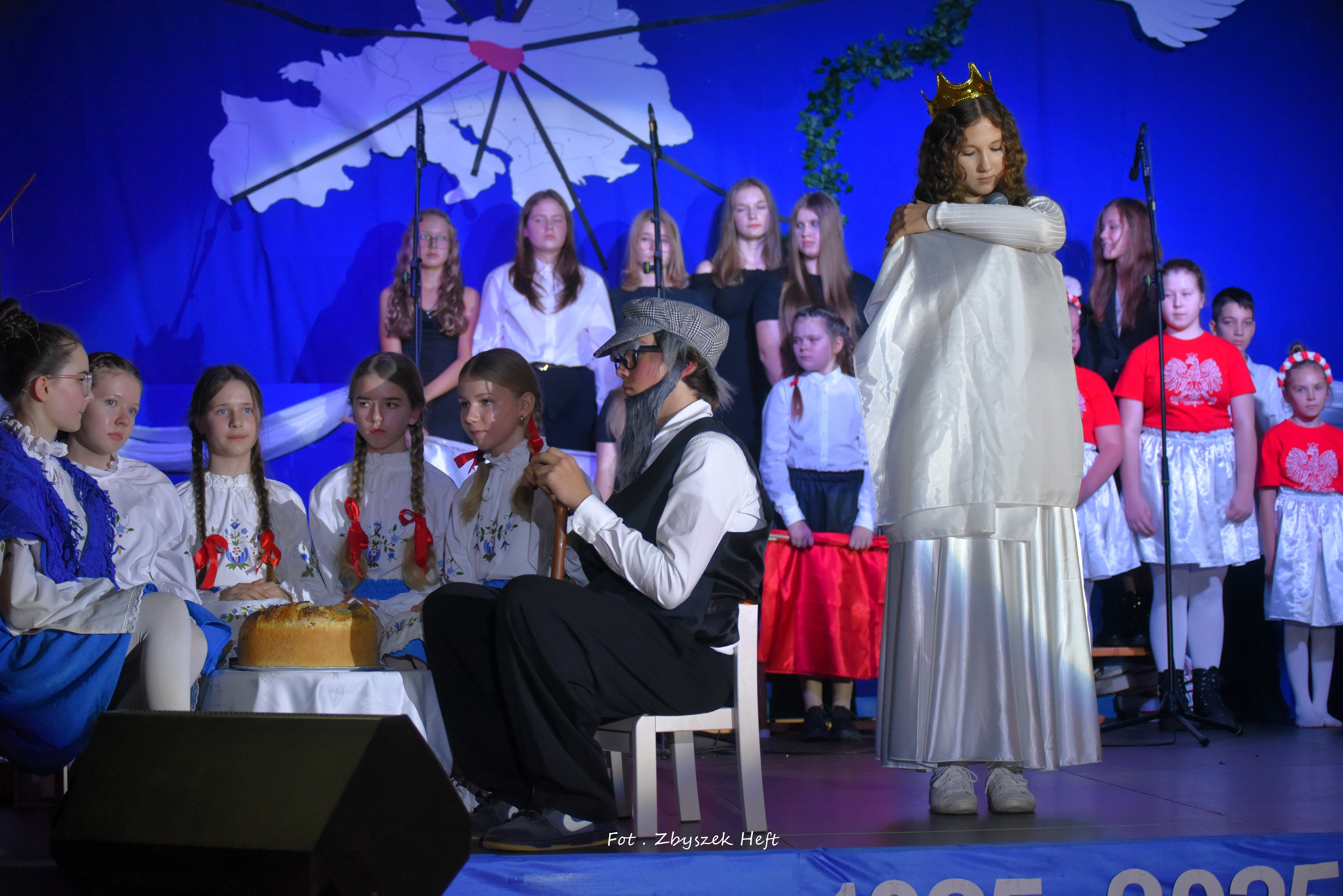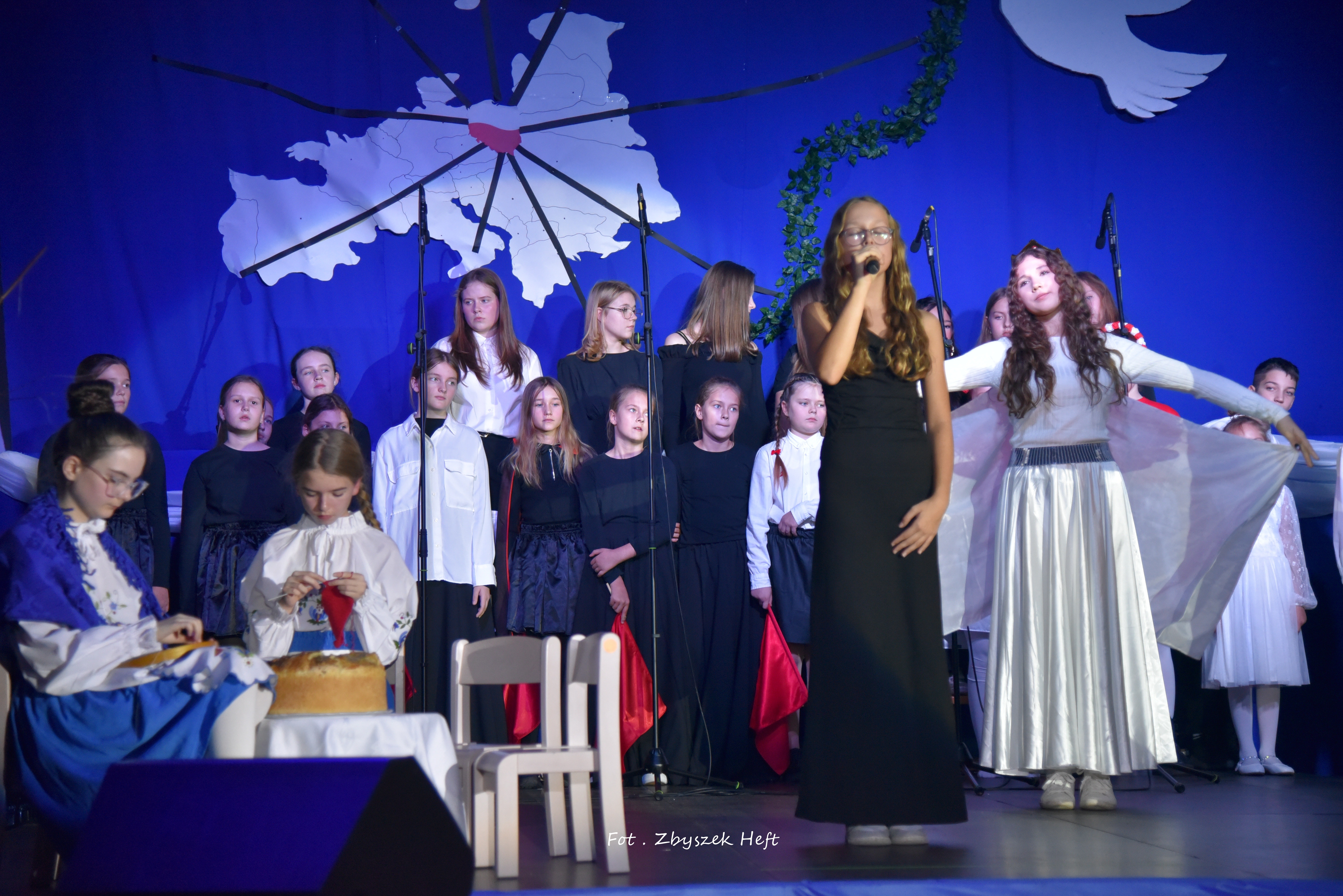 Po części oficjalnej i odprowadzeniu Sztandaru zgromadzeni mogli obejrzeć niezwykle poruszający 𝐬𝐩𝐞𝐤𝐭𝐚𝐤𝐥 𝐩𝐭. „𝐍𝐢𝐞 𝐦𝐚 𝐝𝐫𝐨𝐠𝐢 𝐝𝐨 𝐩𝐨𝐤𝐨𝐣𝐮. 𝐓𝐨 𝐩𝐨𝐤𝐨́𝐣 𝐣𝐞𝐬𝐭 𝐝𝐫𝐨𝐠𝐚̨” przygotowany przez uczniów klas IV-VIII pod kierunkiem nauczycieli: P. Haliny Gojke, P. Beaty Dettlaff i P. Bartłomieja Szefke.