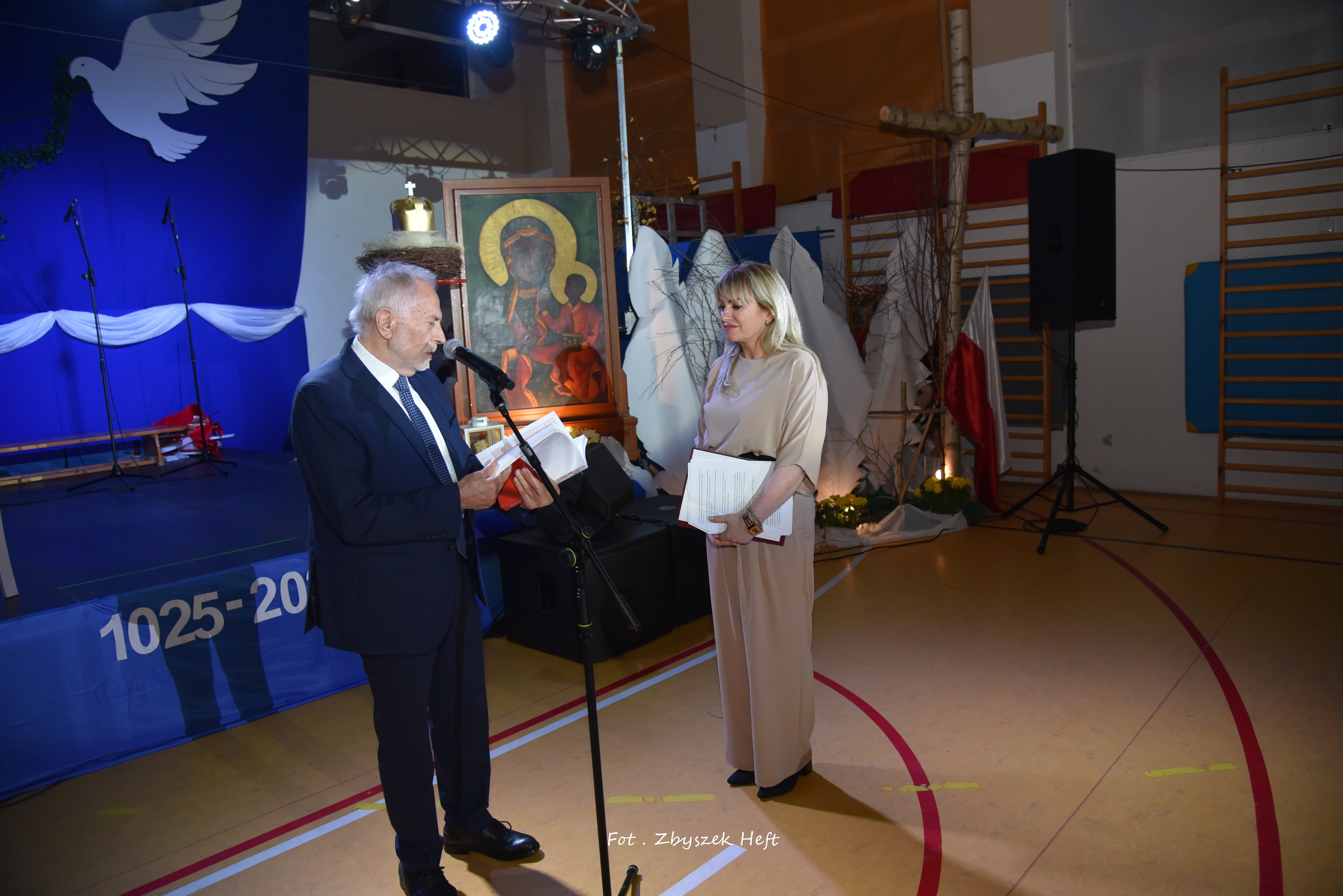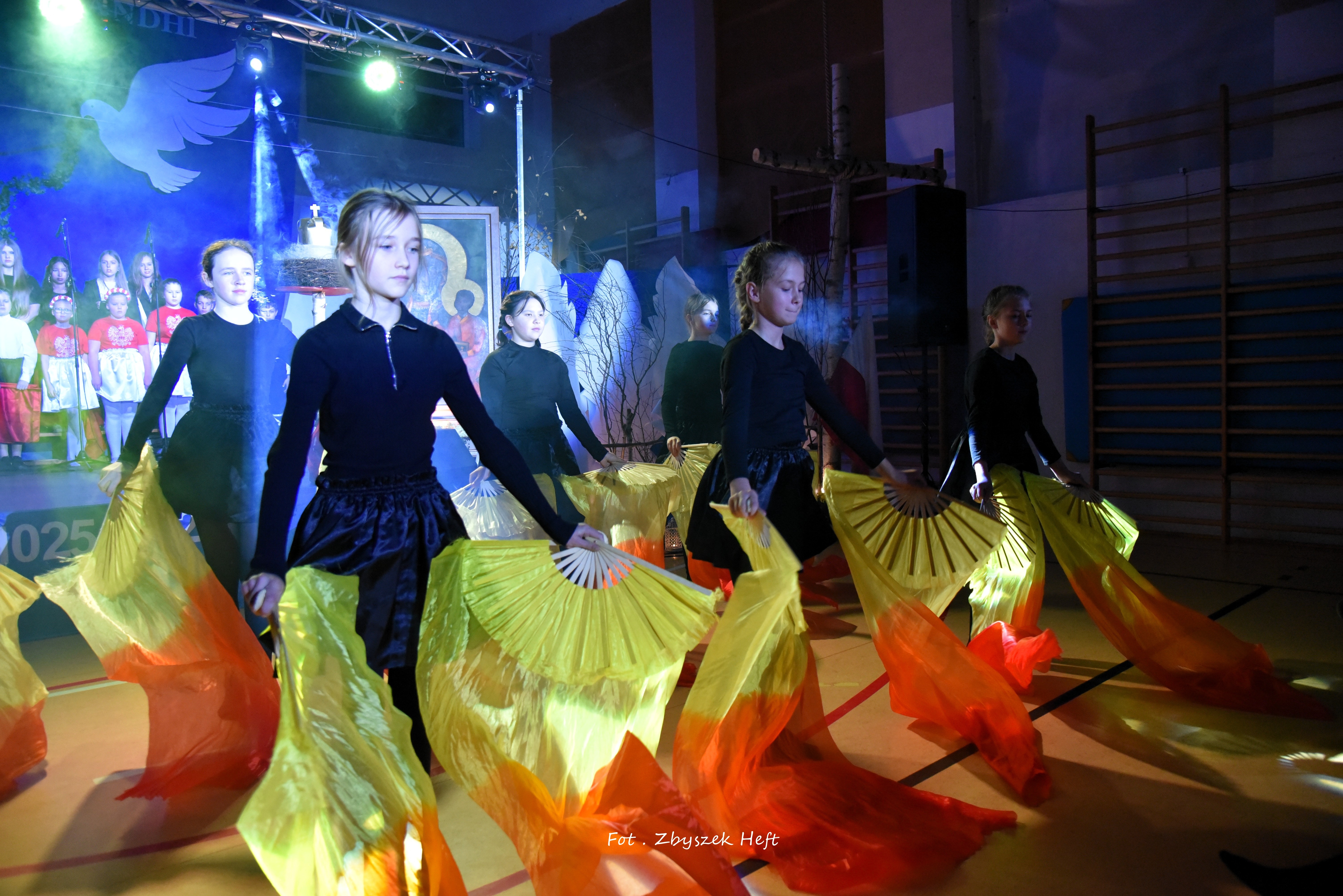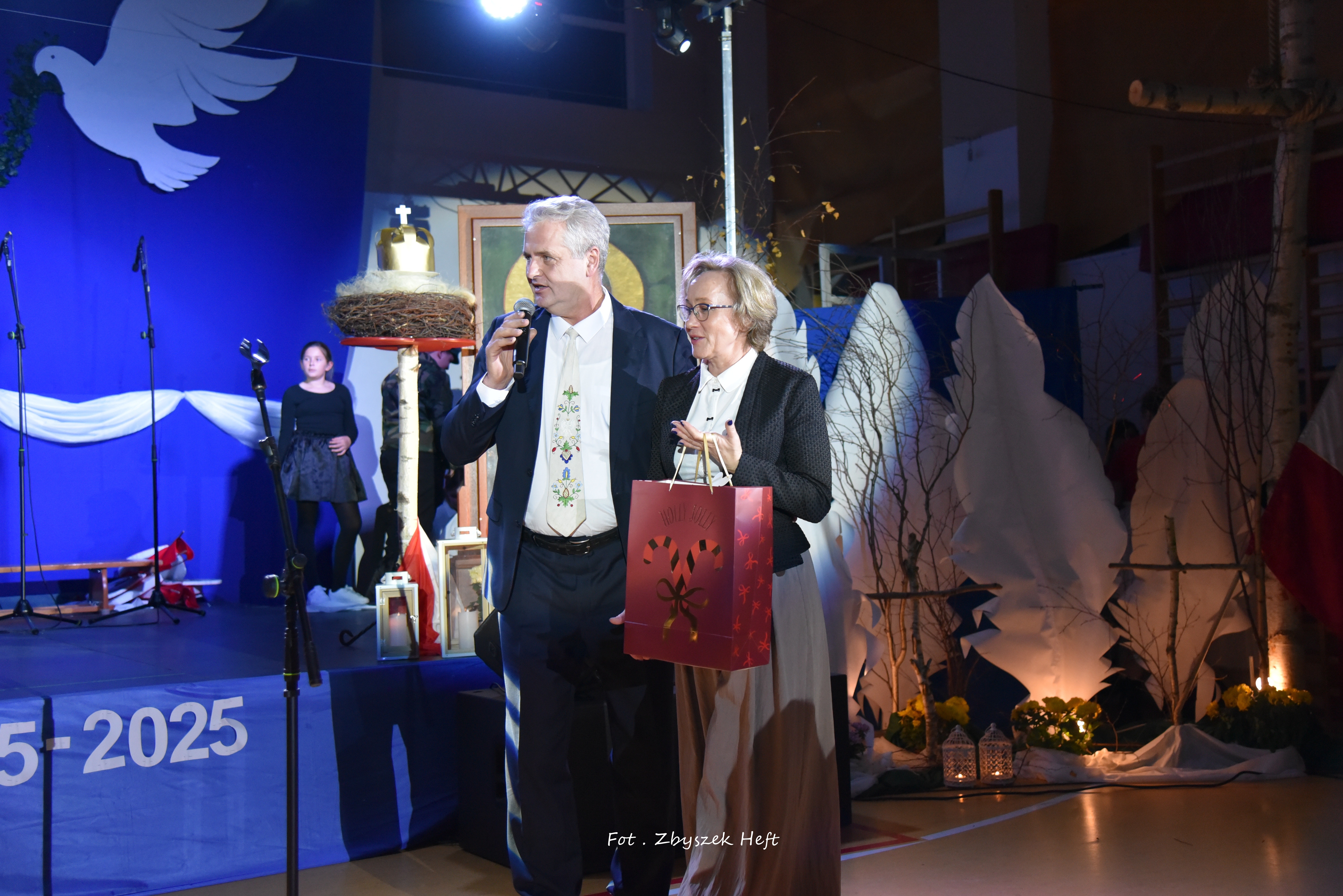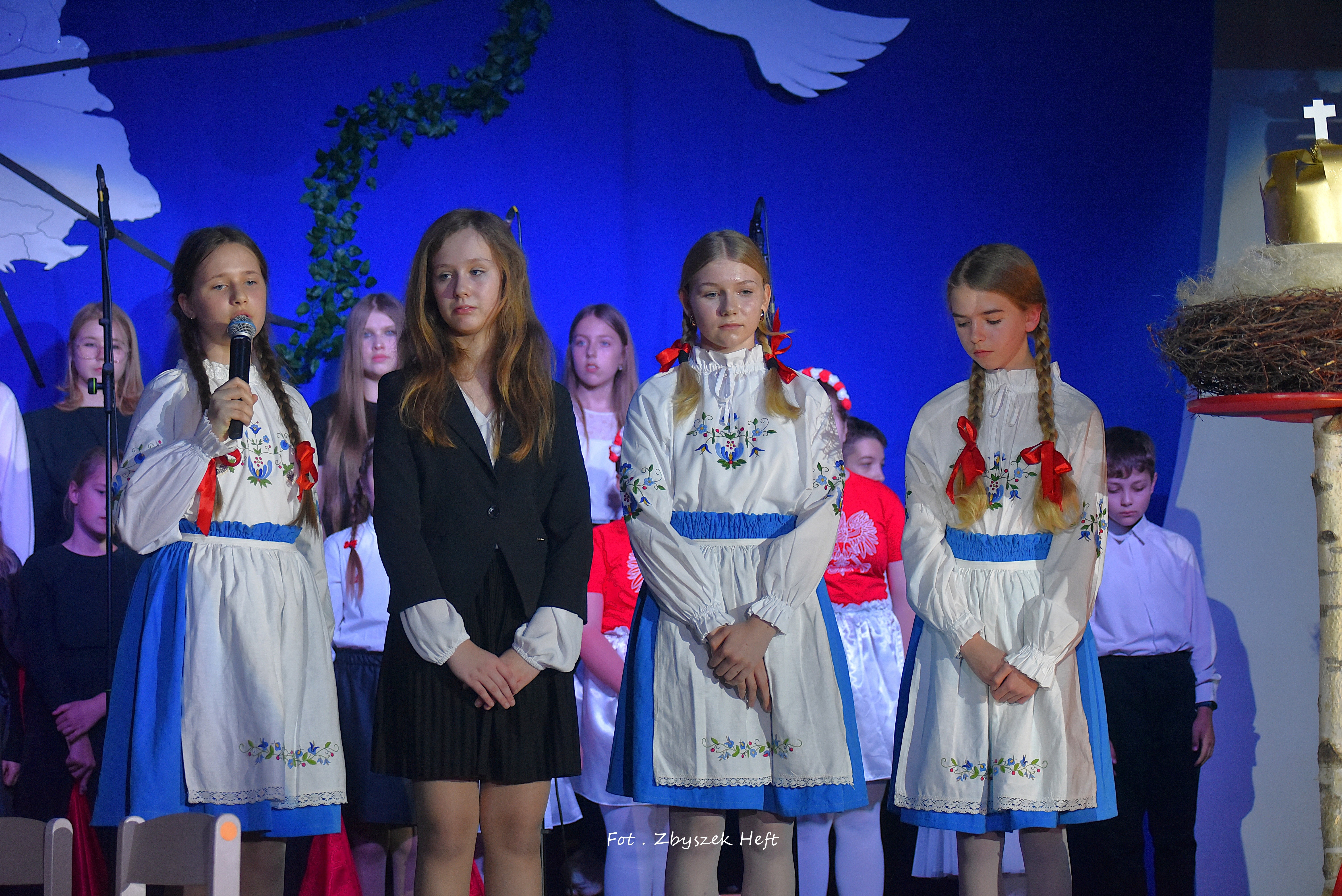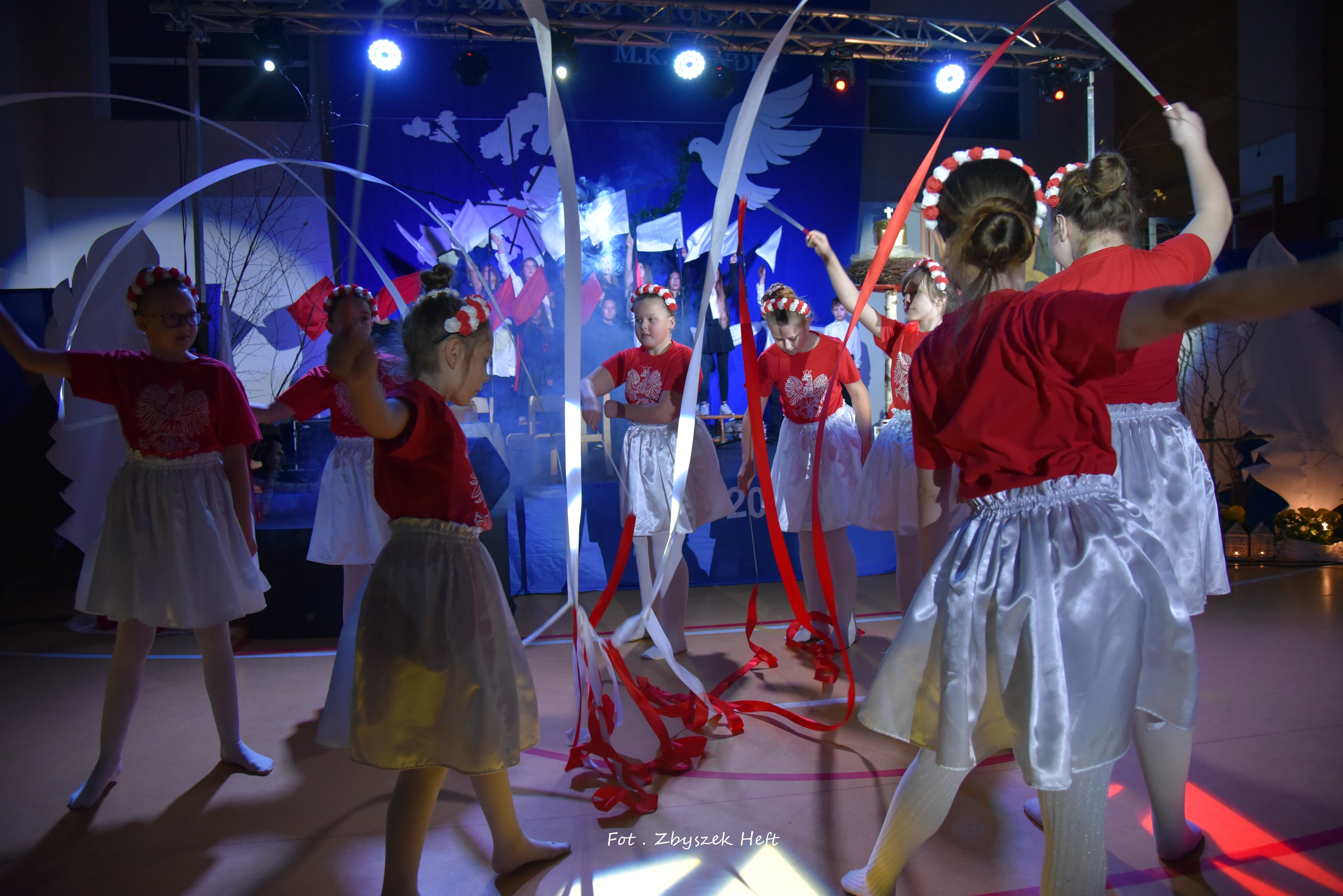 Po części oficjalnej i odprowadzeniu Sztandaru zgromadzeni mogli obejrzeć niezwykle poruszający 𝐬𝐩𝐞𝐤𝐭𝐚𝐤𝐥 𝐩𝐭. „𝐍𝐢𝐞 𝐦𝐚 𝐝𝐫𝐨𝐠𝐢 𝐝𝐨 𝐩𝐨𝐤𝐨𝐣𝐮. 𝐓𝐨 𝐩𝐨𝐤𝐨́𝐣 𝐣𝐞𝐬𝐭 𝐝𝐫𝐨𝐠𝐚̨” przygotowany przez uczniów klas IV-VIII pod kierunkiem nauczycieli: P. Haliny Gojke, P. Beaty Dettlaff i P. Bartłomieja Szefke.