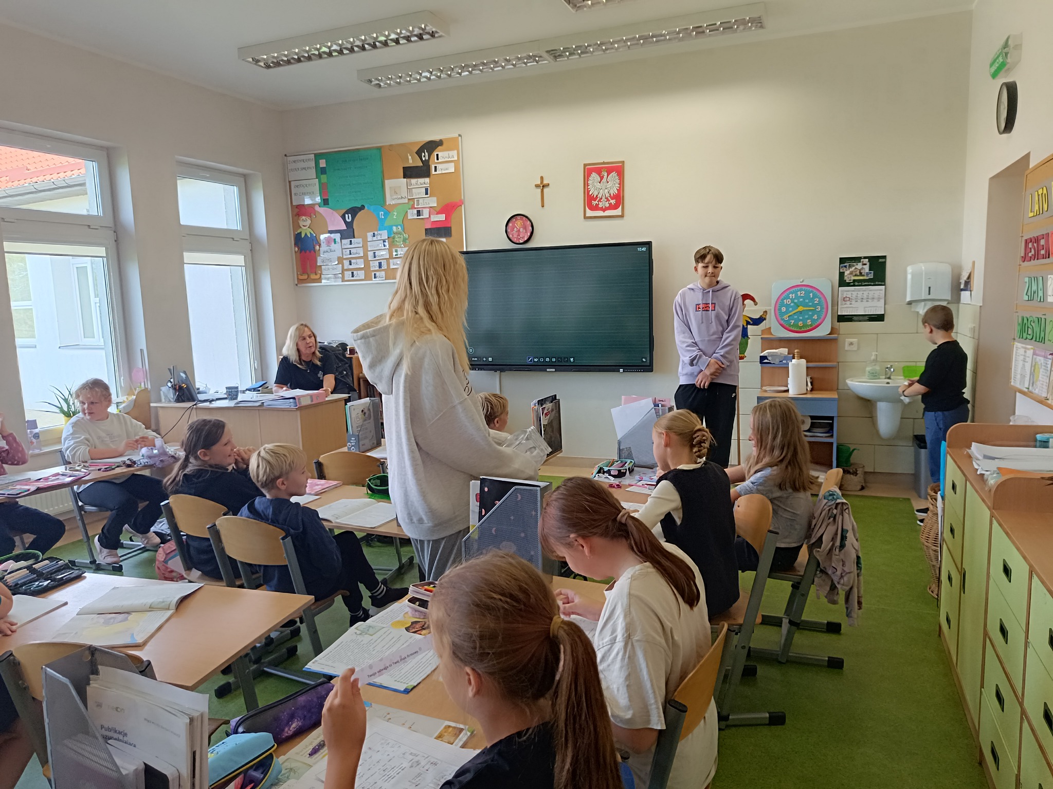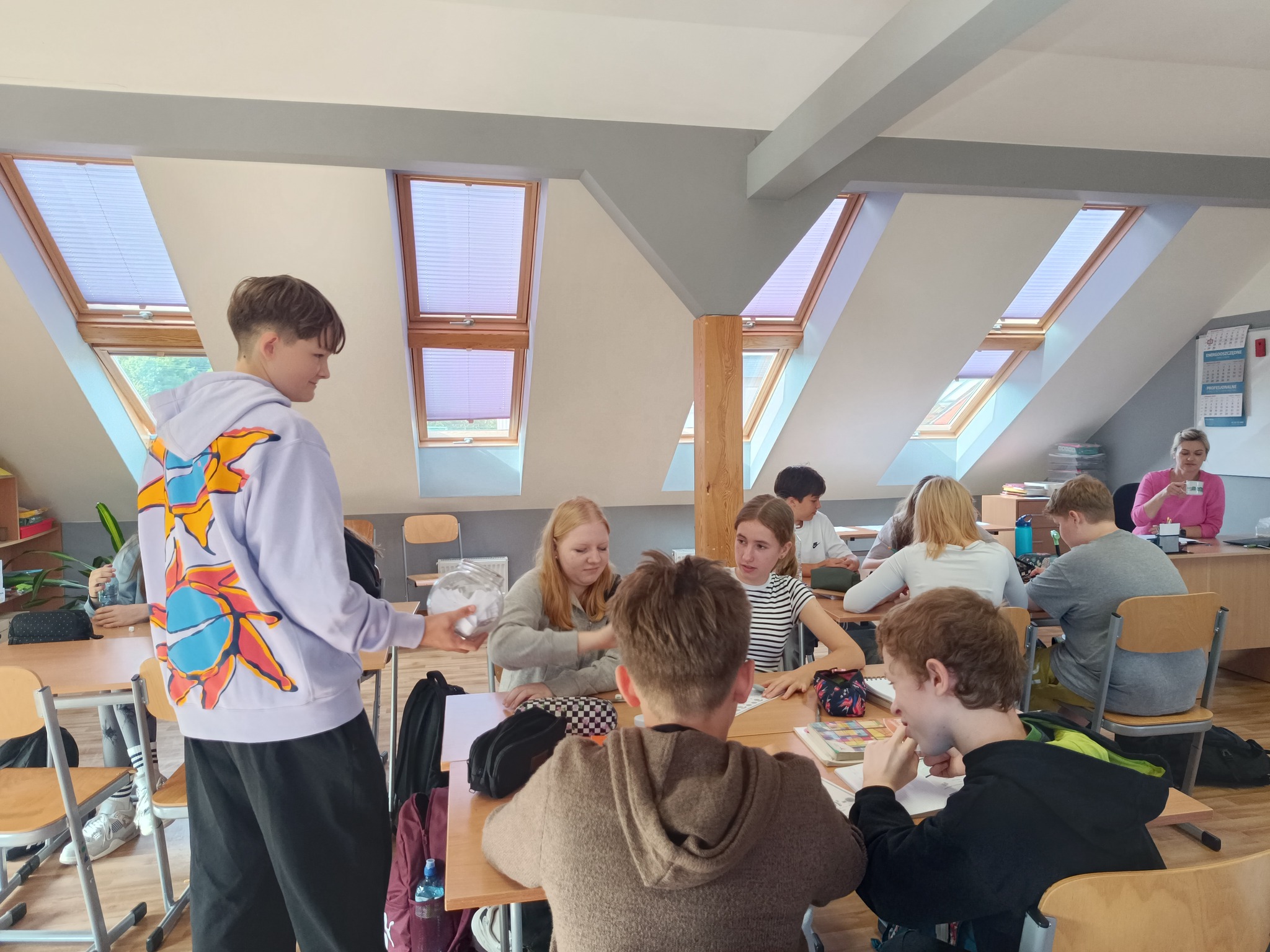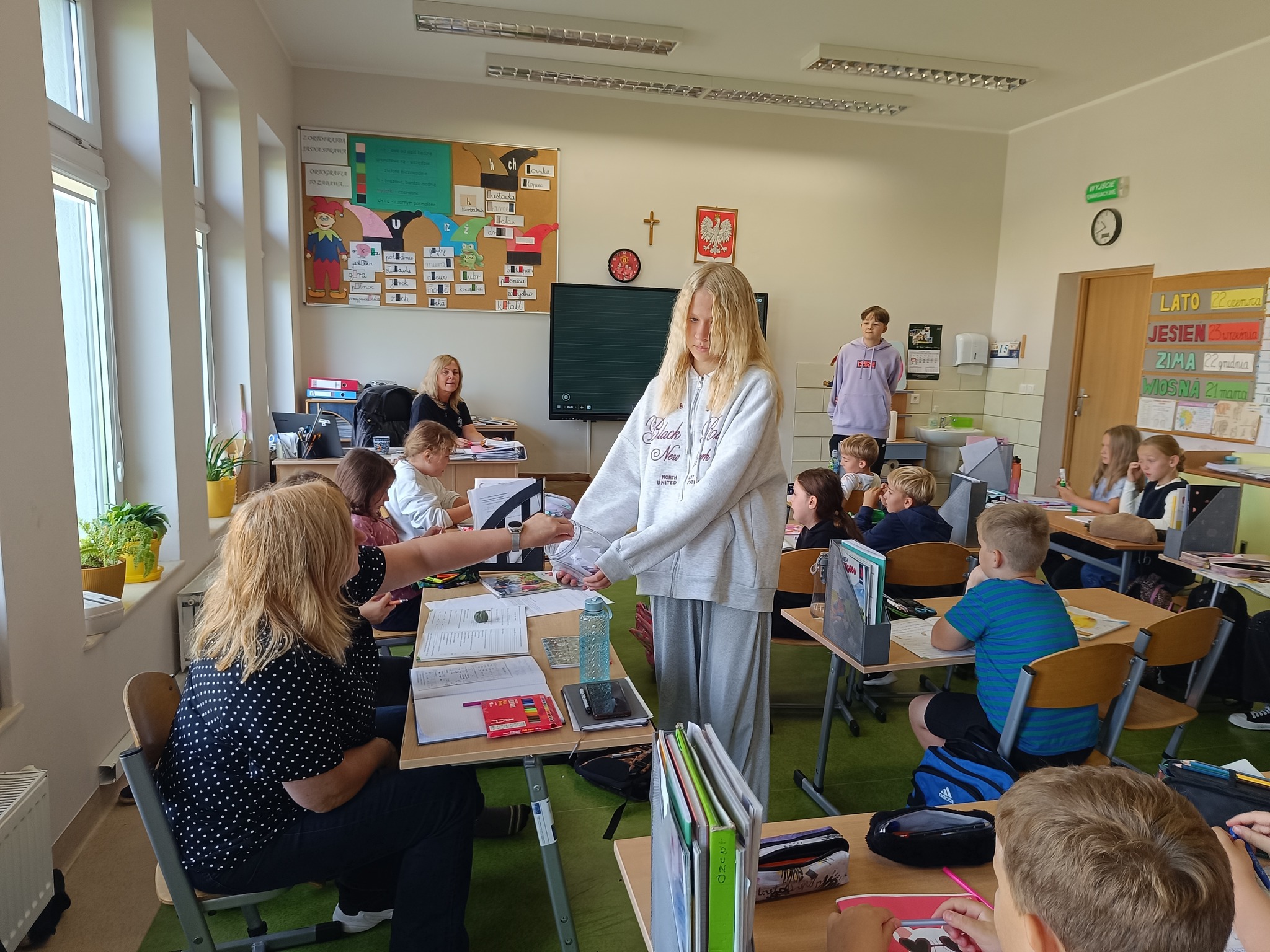 15 września z inicjatywy Samorządu Uczniowskiego, uczniowie klasy ósmej – Magda i Kamil – wyruszyli na szkolne korytarze, by zaprosić koleżanki i kolegów z klas III–VIII do wspólnej zabawy. Rozdawali oni motywujące cytaty ze Słoika Dobrych Słów, które dodawały odwagi, wywoływały uśmiech i przypominały, że każdy z nas jest wyjątkowy. 💜