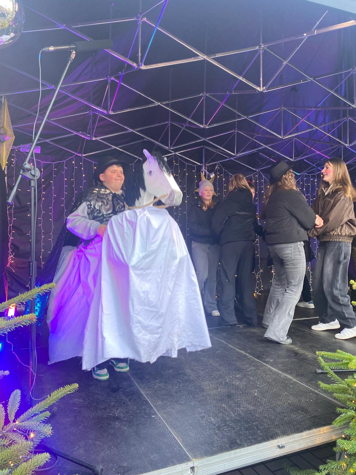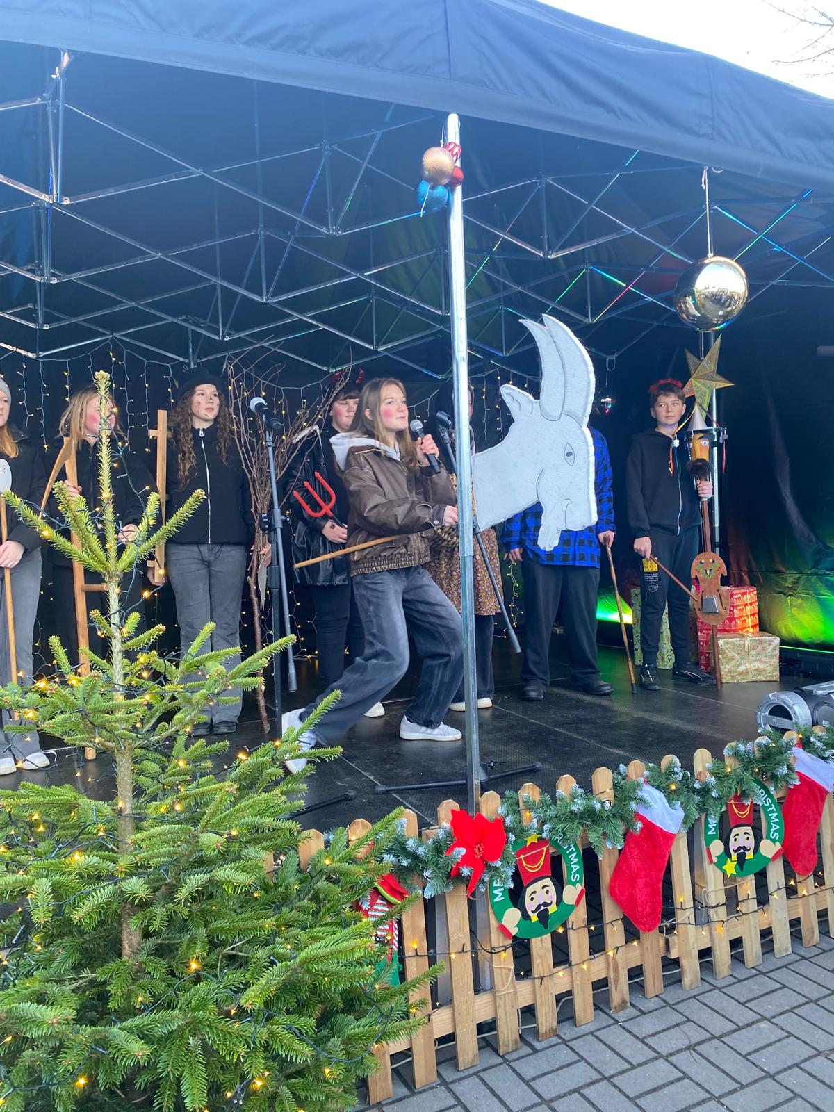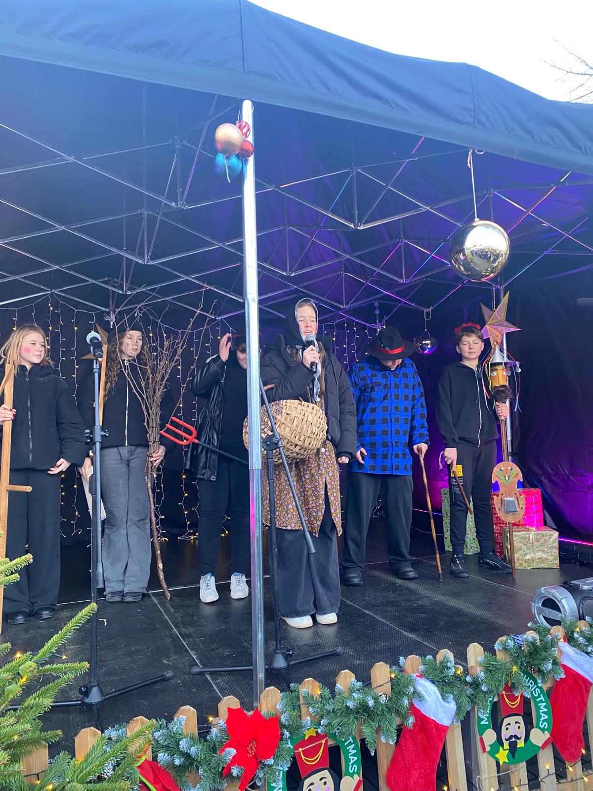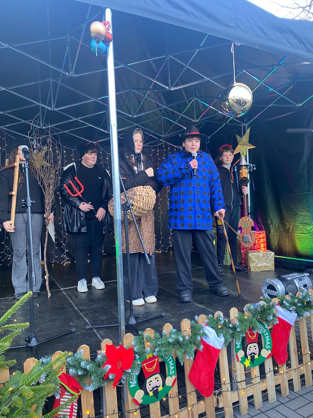 W role tradycyjnych postaci wcielili się uczniowie: kozę zagrała 𝐍𝐢𝐤𝐨𝐥𝐚 𝐖𝐨𝐥𝐟, diabełka – 𝐊𝐨𝐫𝐧𝐞𝐥𝐢𝐚 𝐆𝐨𝐲𝐤𝐞, kominiarza – 𝐋𝐢𝐝𝐤𝐚 𝐖𝐢𝐞𝐜𝐳𝐨𝐫𝐤𝐨𝐰𝐬𝐤𝐚, śmierć – 𝐕𝐢𝐤𝐭𝐨𝐫𝐢𝐚 𝐀𝐛𝐫𝐚𝐡𝐚𝐦, dziada i babę – 𝐁𝐚𝐫𝐭𝐞𝐤 𝐊𝐰𝐢𝐝𝐳𝐢𝐧́𝐬𝐤𝐢 oraz 𝐌𝐚𝐫𝐭𝐚 𝐊𝐨𝐛𝐢𝐞𝐥𝐥𝐚, bociana – 𝐌𝐚𝐣𝐚 𝐒𝐭𝐲𝐧, a konia – 𝐒𝐳𝐲𝐦𝐨𝐧 𝐒́𝐦𝐢𝐠𝐥𝐚𝐤. Na diabelskich skrzypcach z wielkim zaangażowaniem zagrał 𝐀𝐧𝐭𝐞𝐤 𝐊ł𝐨𝐬, dodając występowi autentycznego, ludowego charakteru.