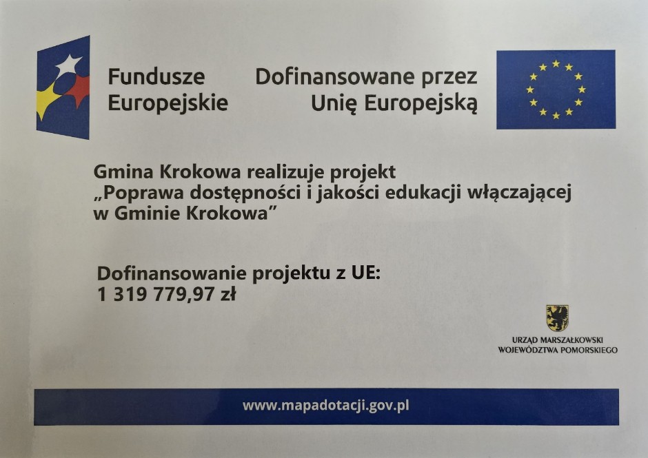 Gmina Krokowa uzyskała dofinansowanie z Unii Europejskiej na realizację projektu partnerskiego pn. „Poprawa dostępności i jakości edukacji włączającej w Gminie Krokowa”. Partnerami projektu są Nowa Perspektywa Anna Steffke z siedzibą w Wejherowie oraz Kaszubskie Towarzystwo Sportowo – Kulturalne z siedzibą w Luzinie.