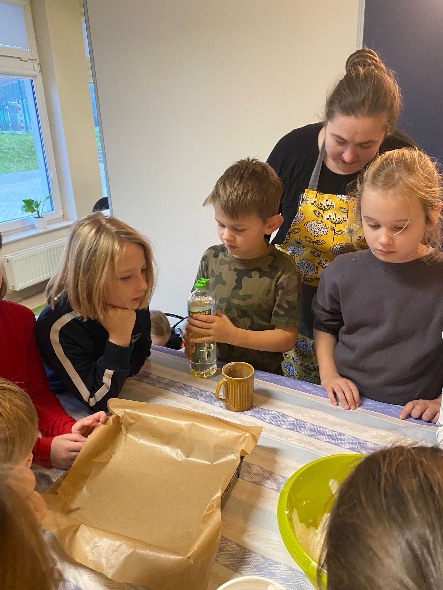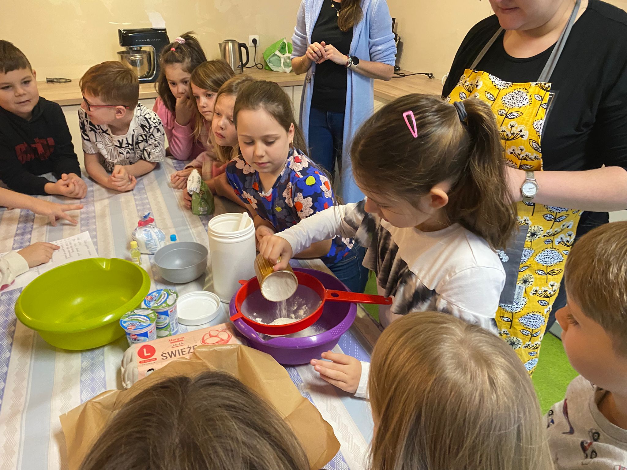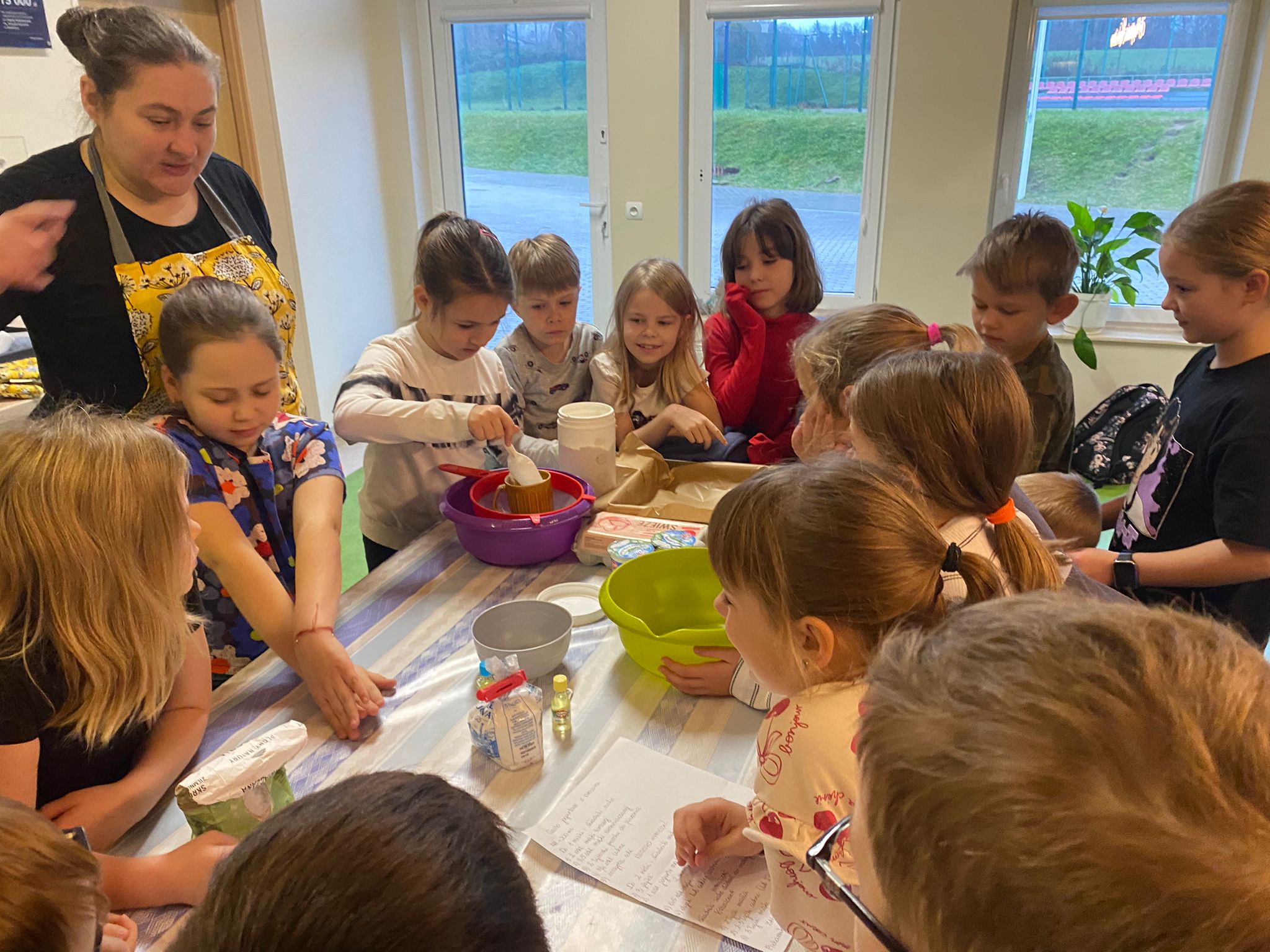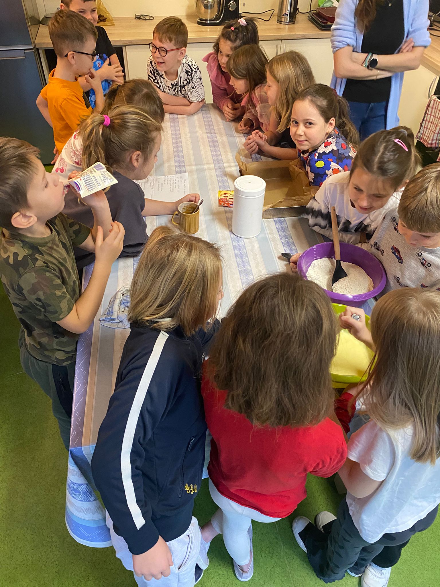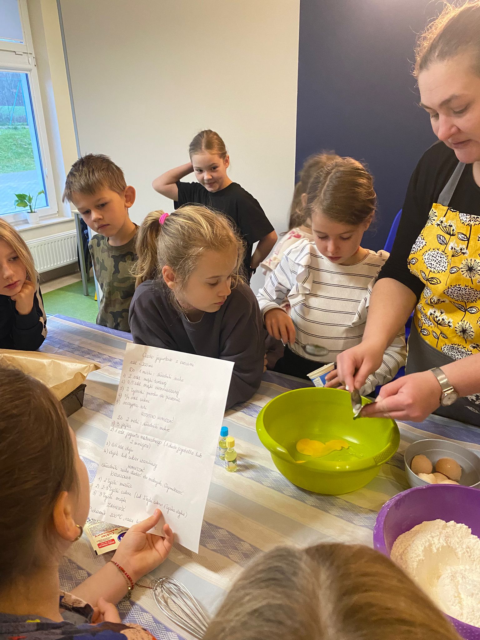 Pani Agnieszka wspólnie z uczniami przygotowała ciasto jogurtowe od podstaw – dzieci otrzymały przepis i samodzielnie wykonywały wszystkie kroki, poznając przy tym kulinarne tajniki. 👩🍳🧁