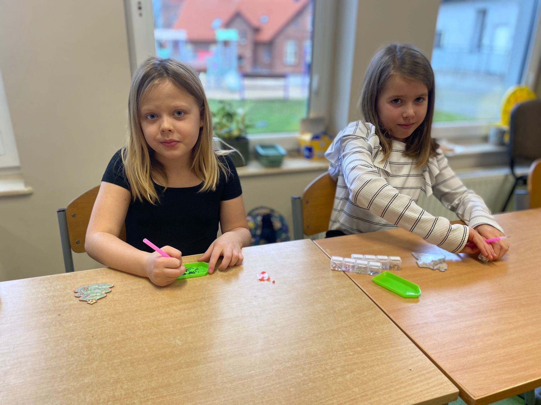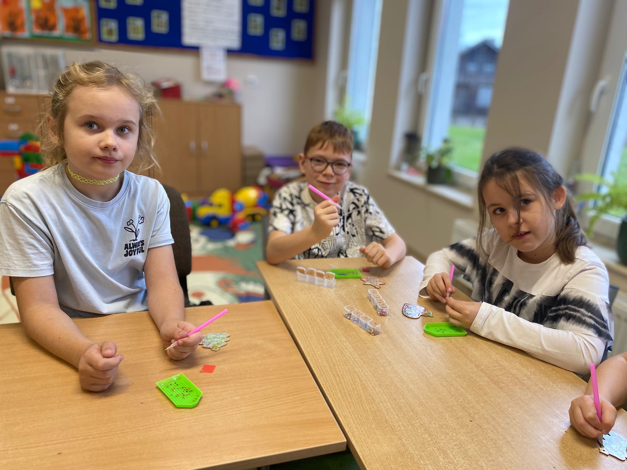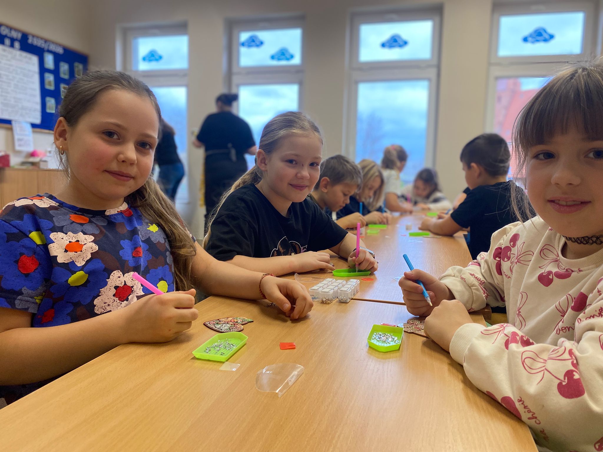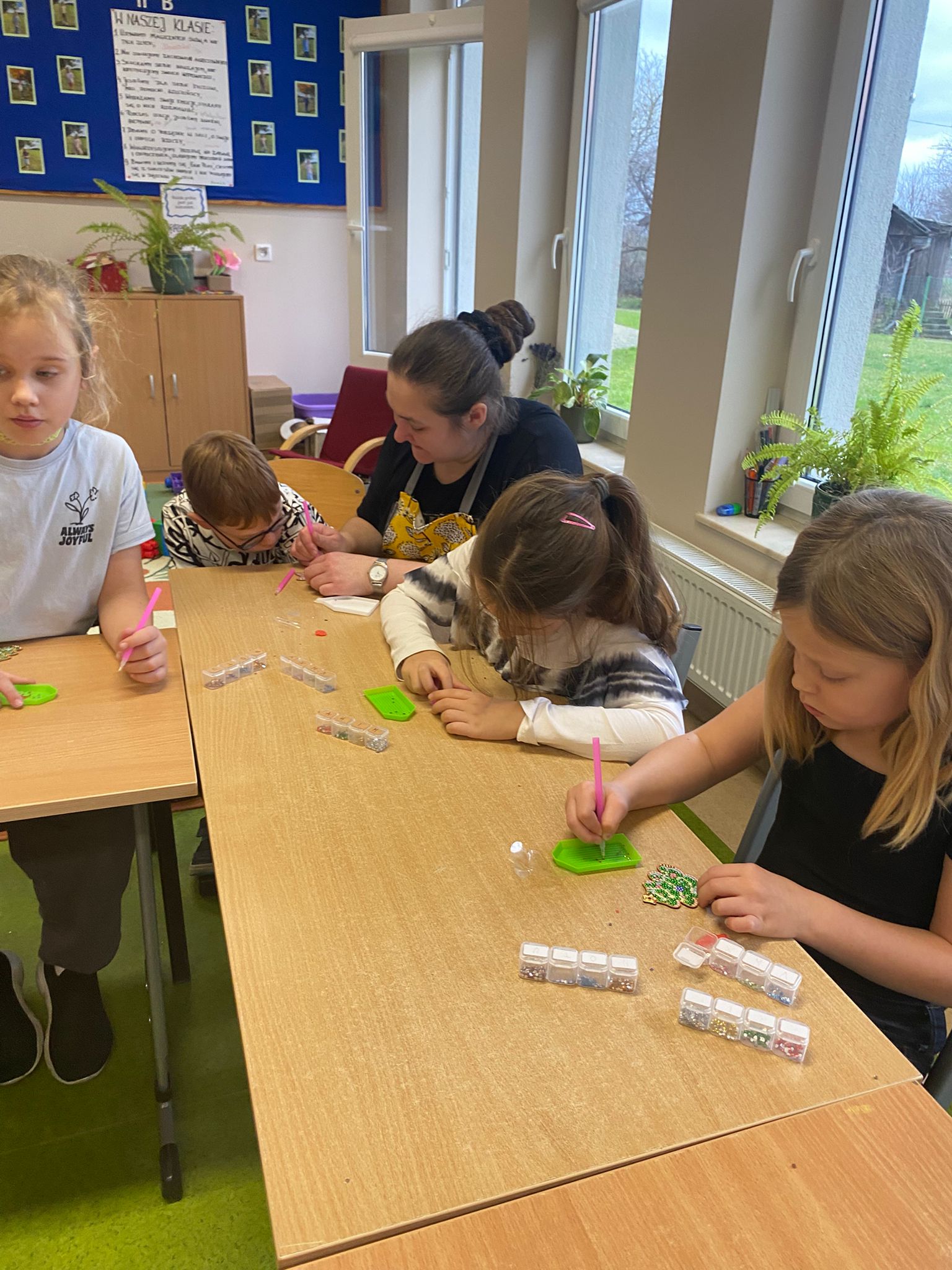 Na zakończenie pani Agnieszka podzieliła się kolejną pasją – haftem diamentowym. Każdy uczeń mógł spróbować swoich sił i stworzyć własną, błyszczącą ozdobę. ✨💎