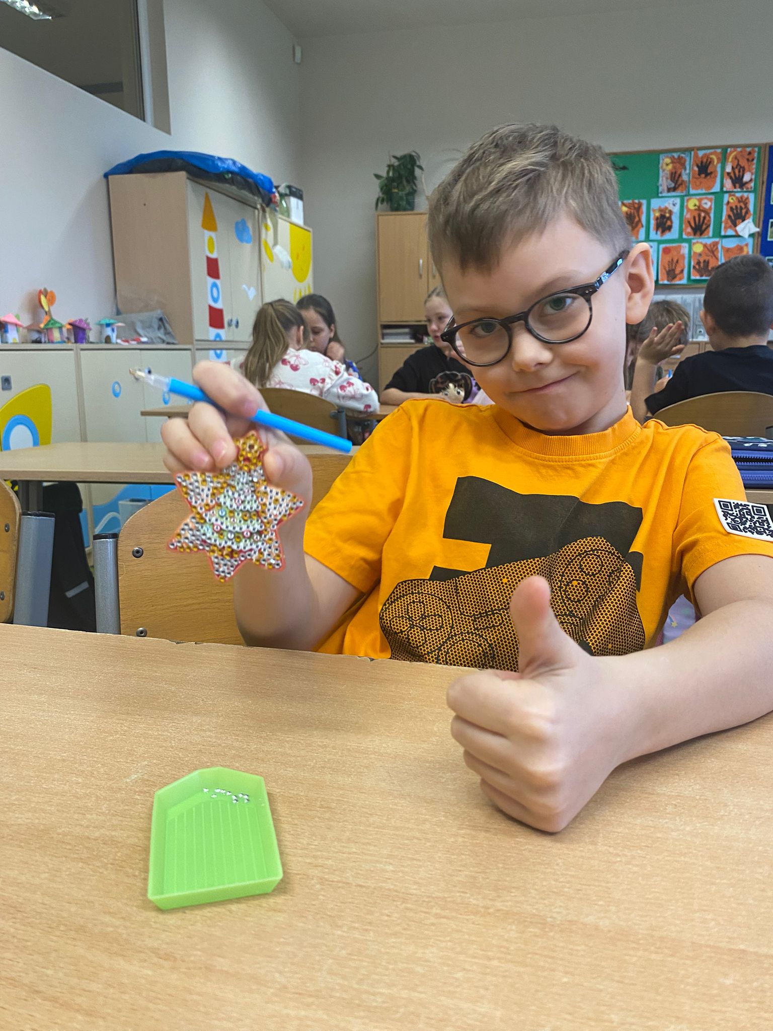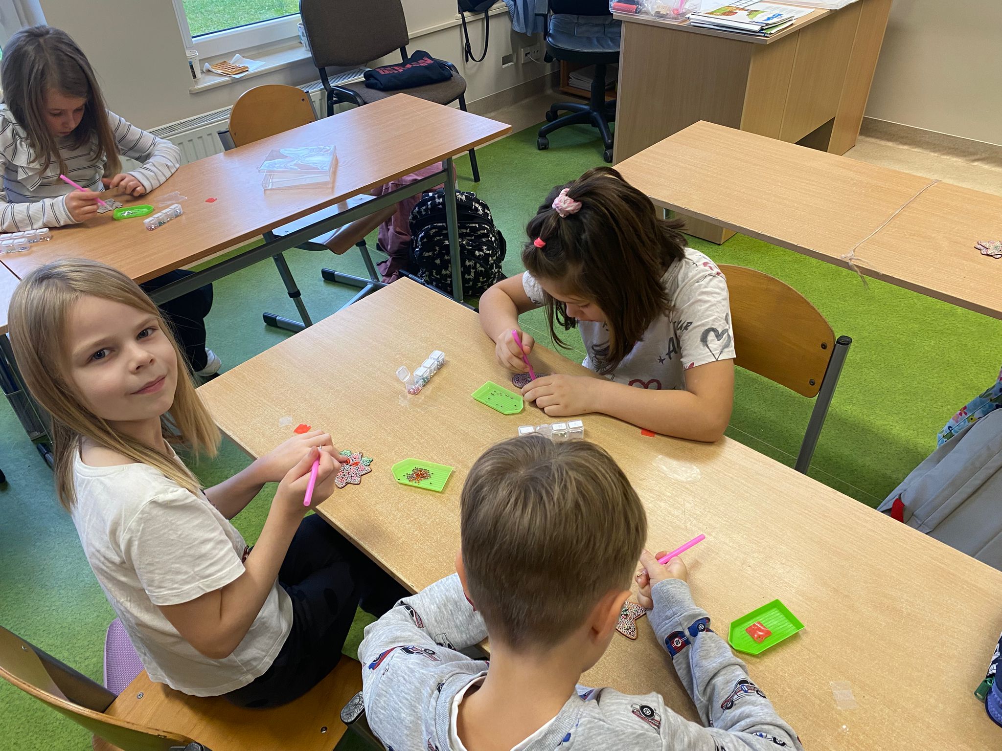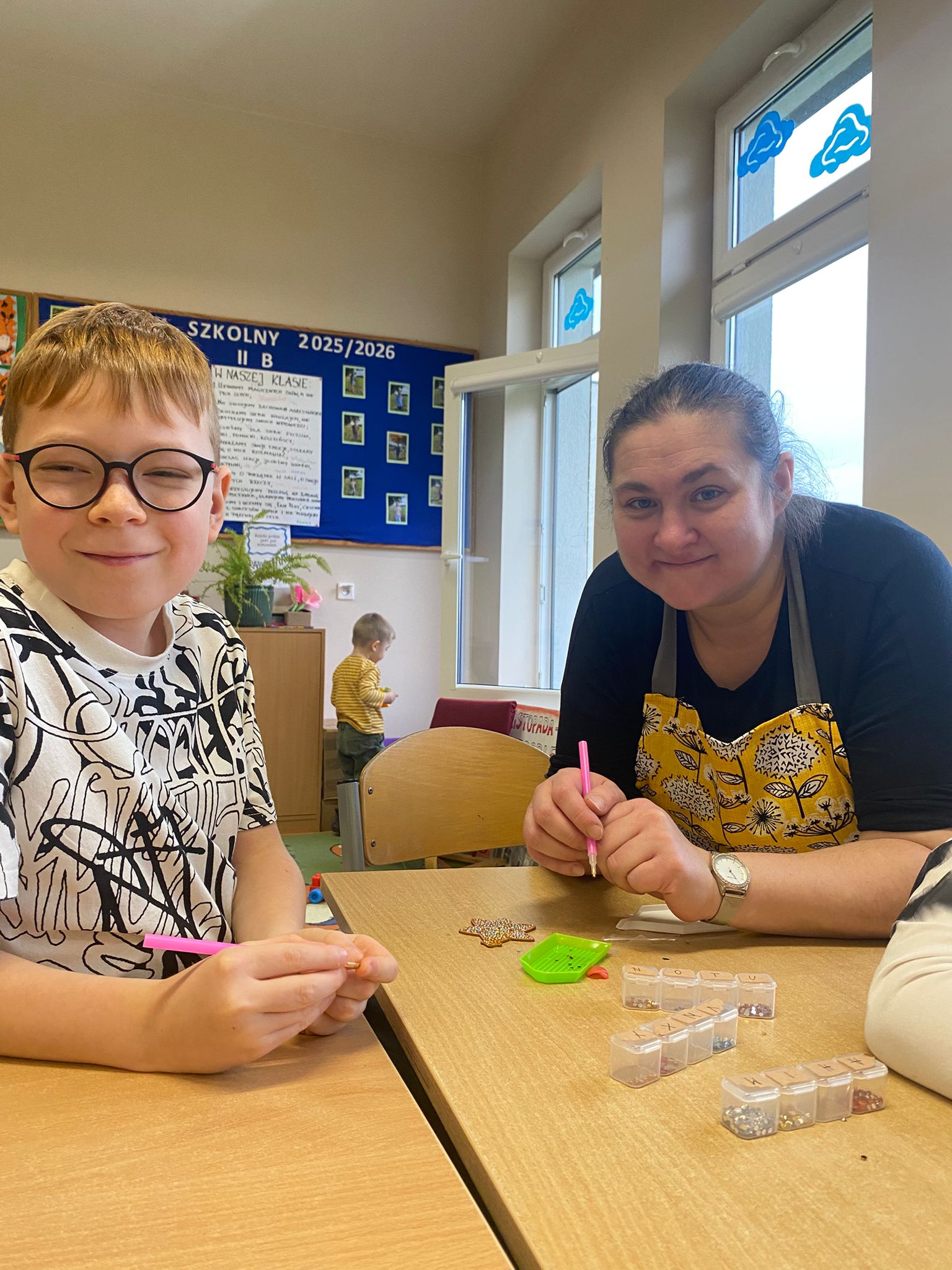 Na zakończenie pani Agnieszka podzieliła się kolejną pasją – haftem diamentowym. Każdy uczeń mógł spróbować swoich sił i stworzyć własną, błyszczącą ozdobę. ✨💎