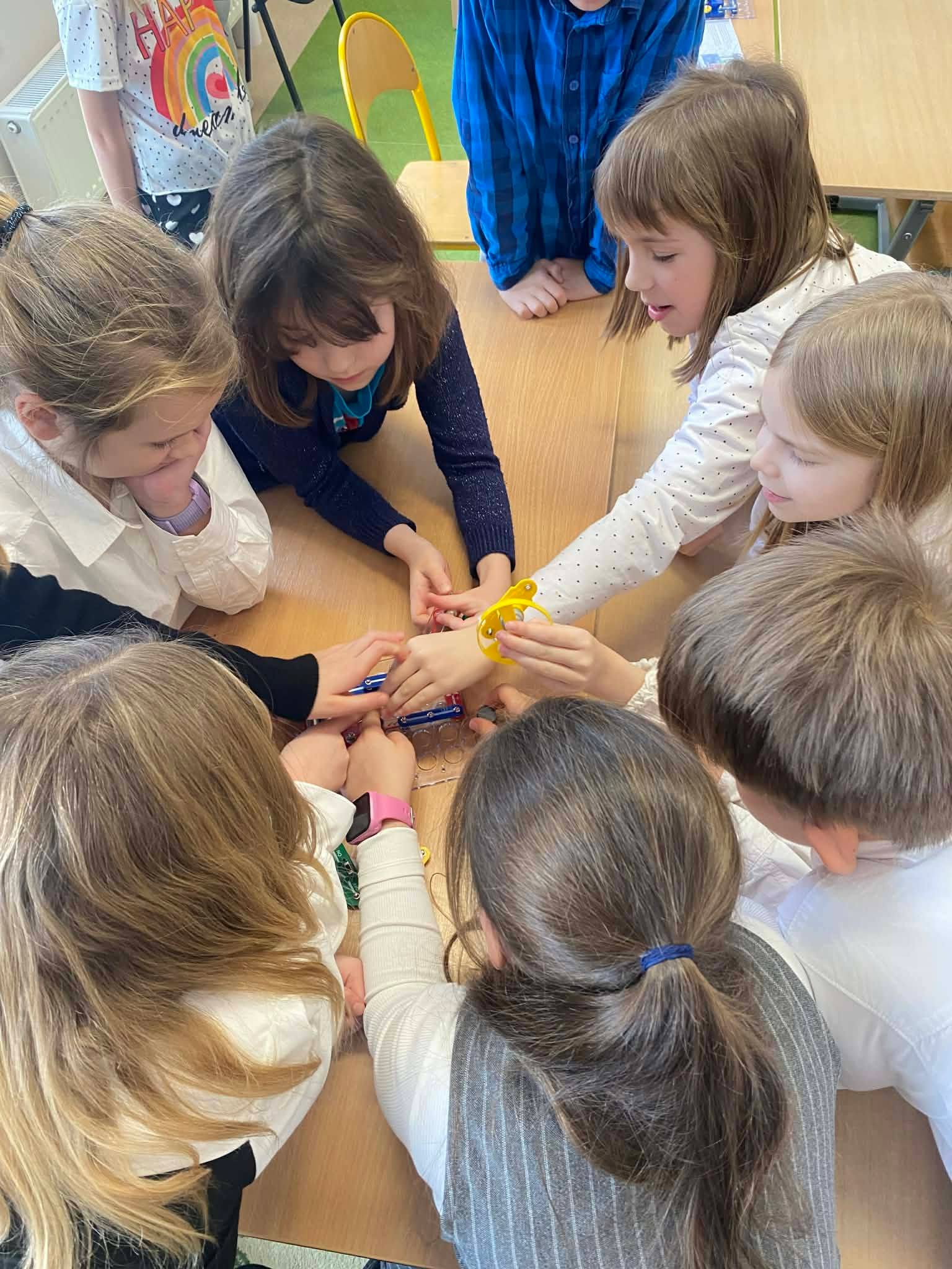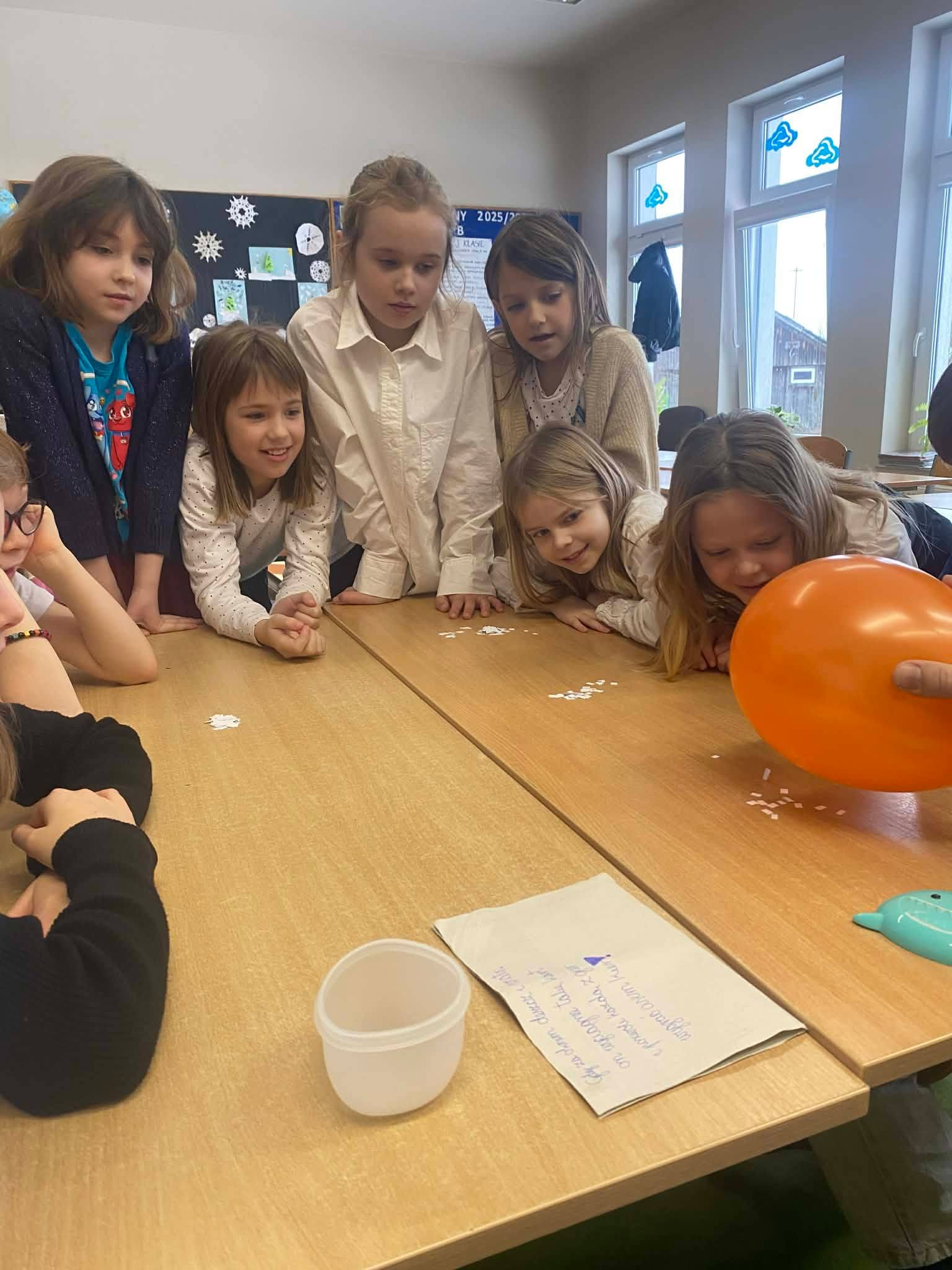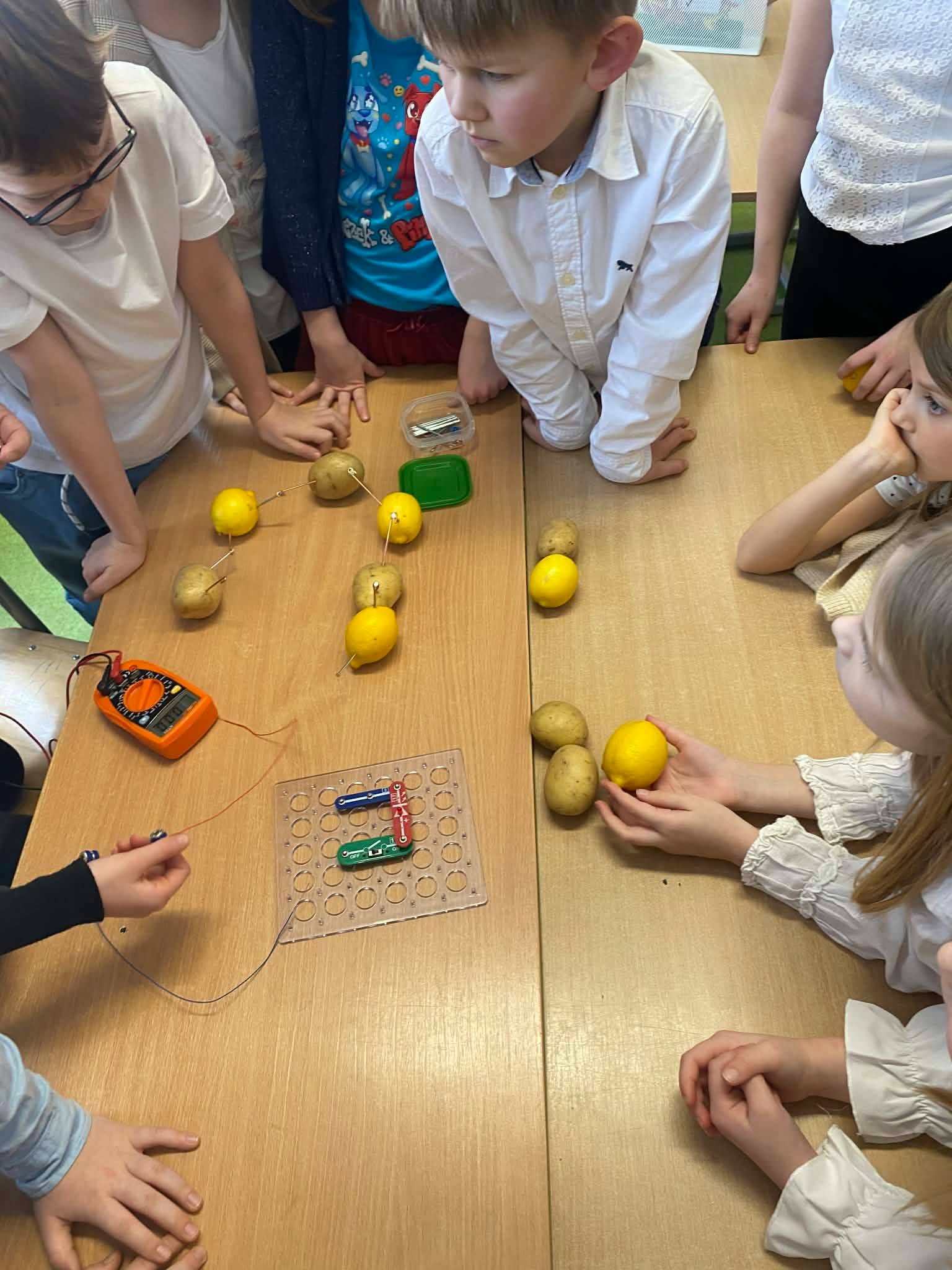 Pan Mariusz przybliżył także zagadnienia związane z energią i kinetyką 🔬, prezentując ciekawe eksperymenty – m.in. z użyciem balonu 🎈, który po potarciu o materiał powodował unoszenie się włosów, a nawet „przyklejał się” do ściany. Największą radość sprawiła dzieciom możliwość samodzielnego tworzenia prostych obiegów elektrycznych jak tworzenie własnej baterii z ziemniaków i cytryn, 🍋🥔ocynkowanych gwoździ i miedzianego drutu 💡🔌 – wyniku czego zapalała się żarówka, a głośnik reagował na klaśnięcie 👏🎶.