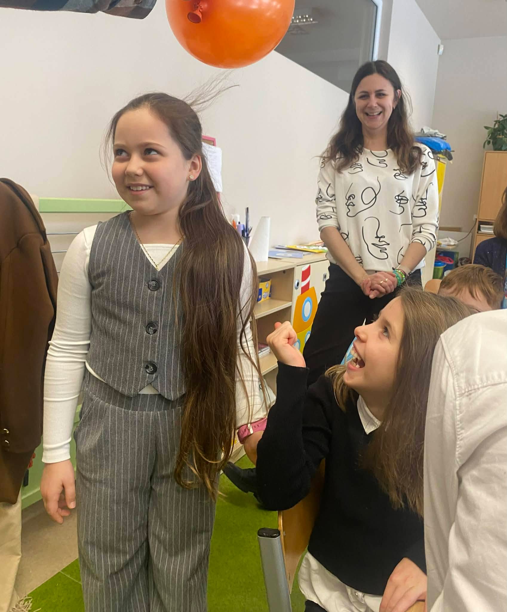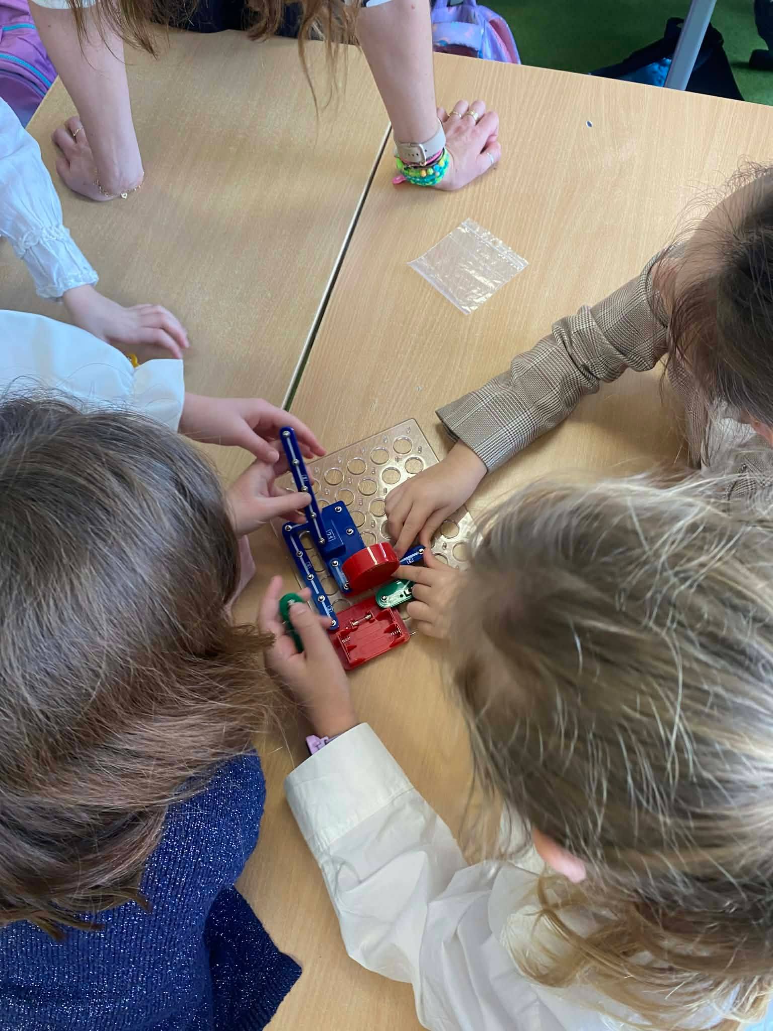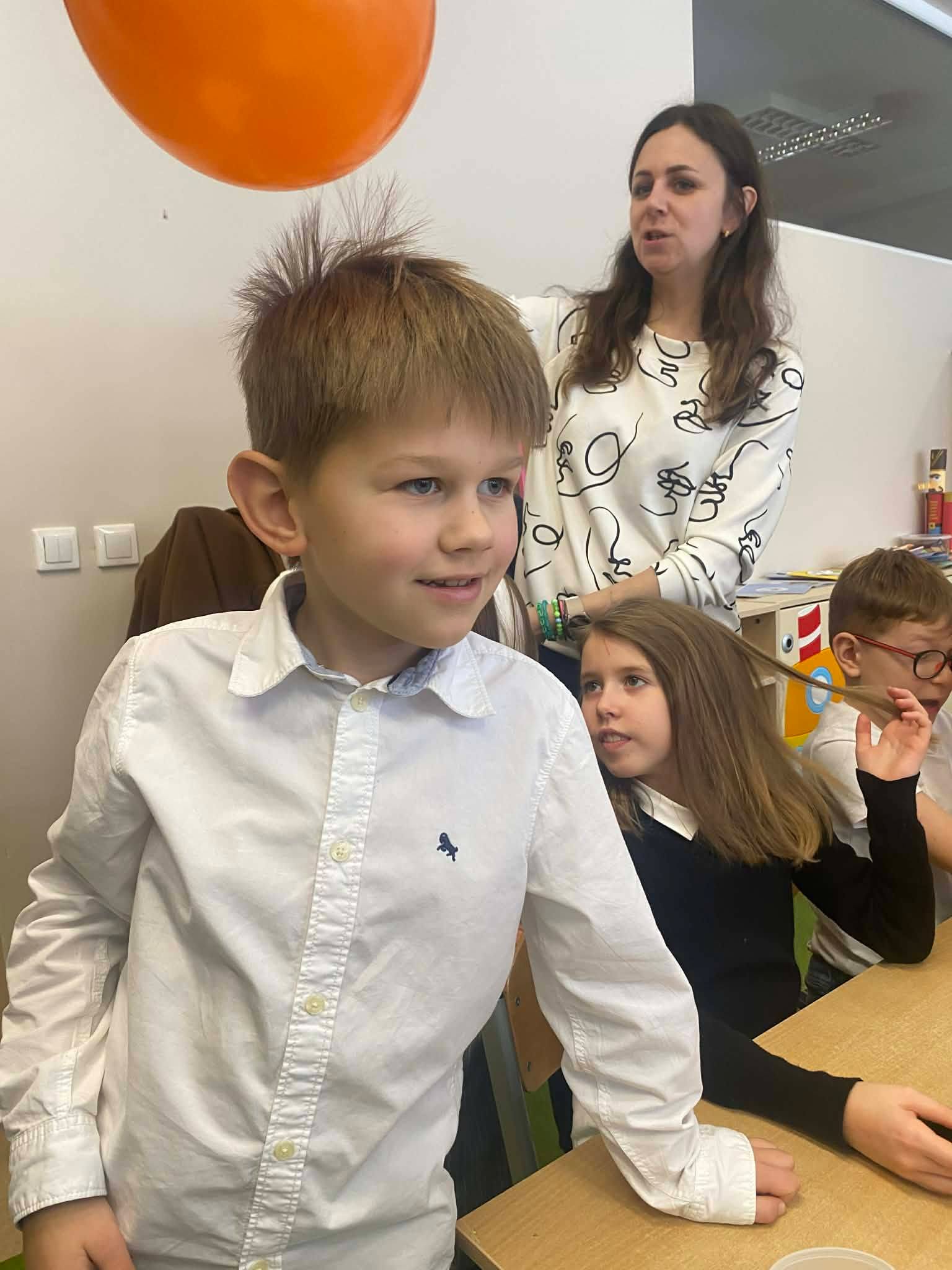 Pan Mariusz przybliżył także zagadnienia związane z energią i kinetyką 🔬, prezentując ciekawe eksperymenty – m.in. z użyciem balonu 🎈, który po potarciu o materiał powodował unoszenie się włosów, a nawet „przyklejał się” do ściany. Największą radość sprawiła dzieciom możliwość samodzielnego tworzenia prostych obiegów elektrycznych jak tworzenie własnej baterii z ziemniaków i cytryn, 🍋🥔ocynkowanych gwoździ i miedzianego drutu 💡🔌 – wyniku czego zapalała się żarówka, a głośnik reagował na klaśnięcie 👏🎶.