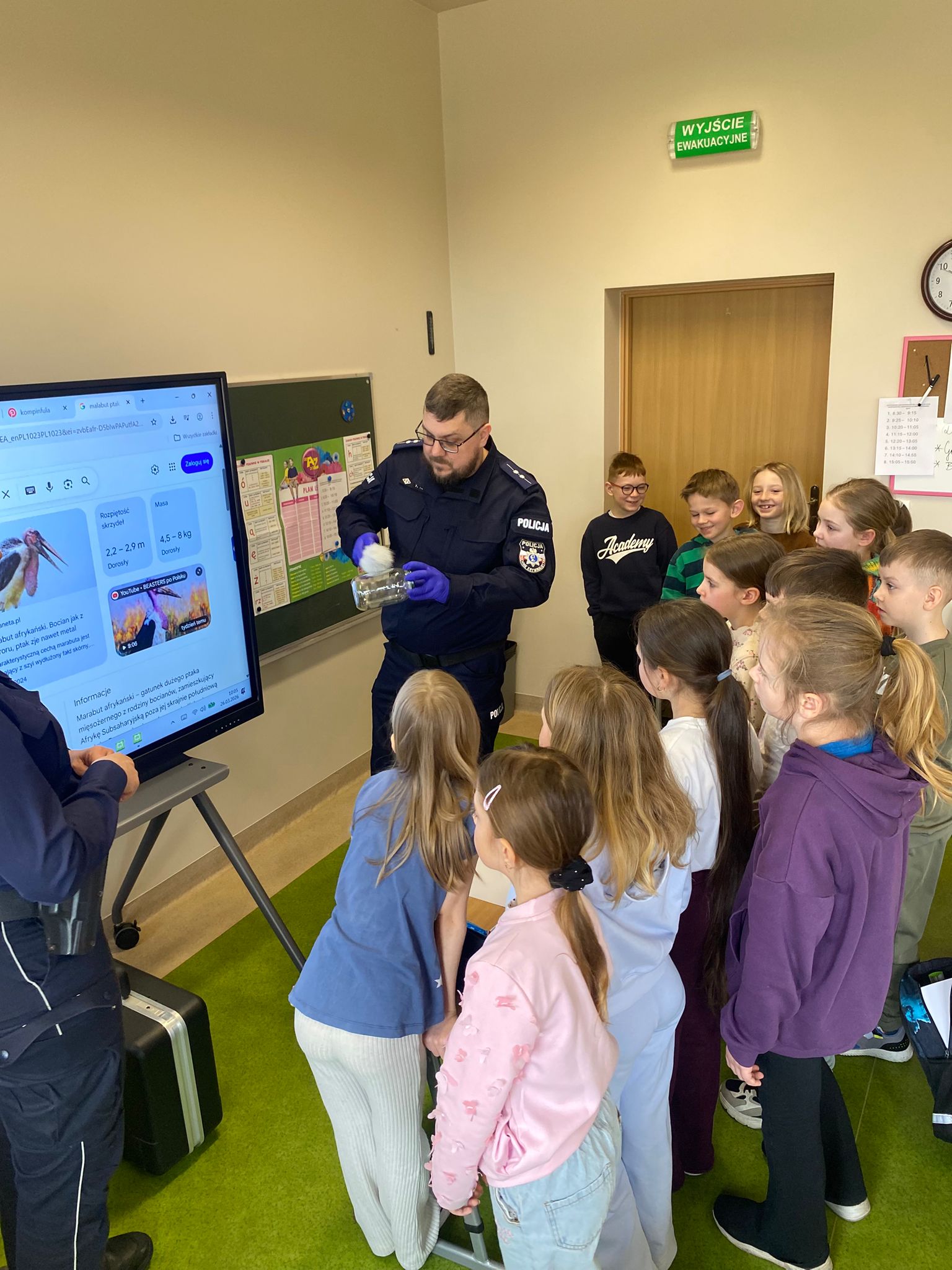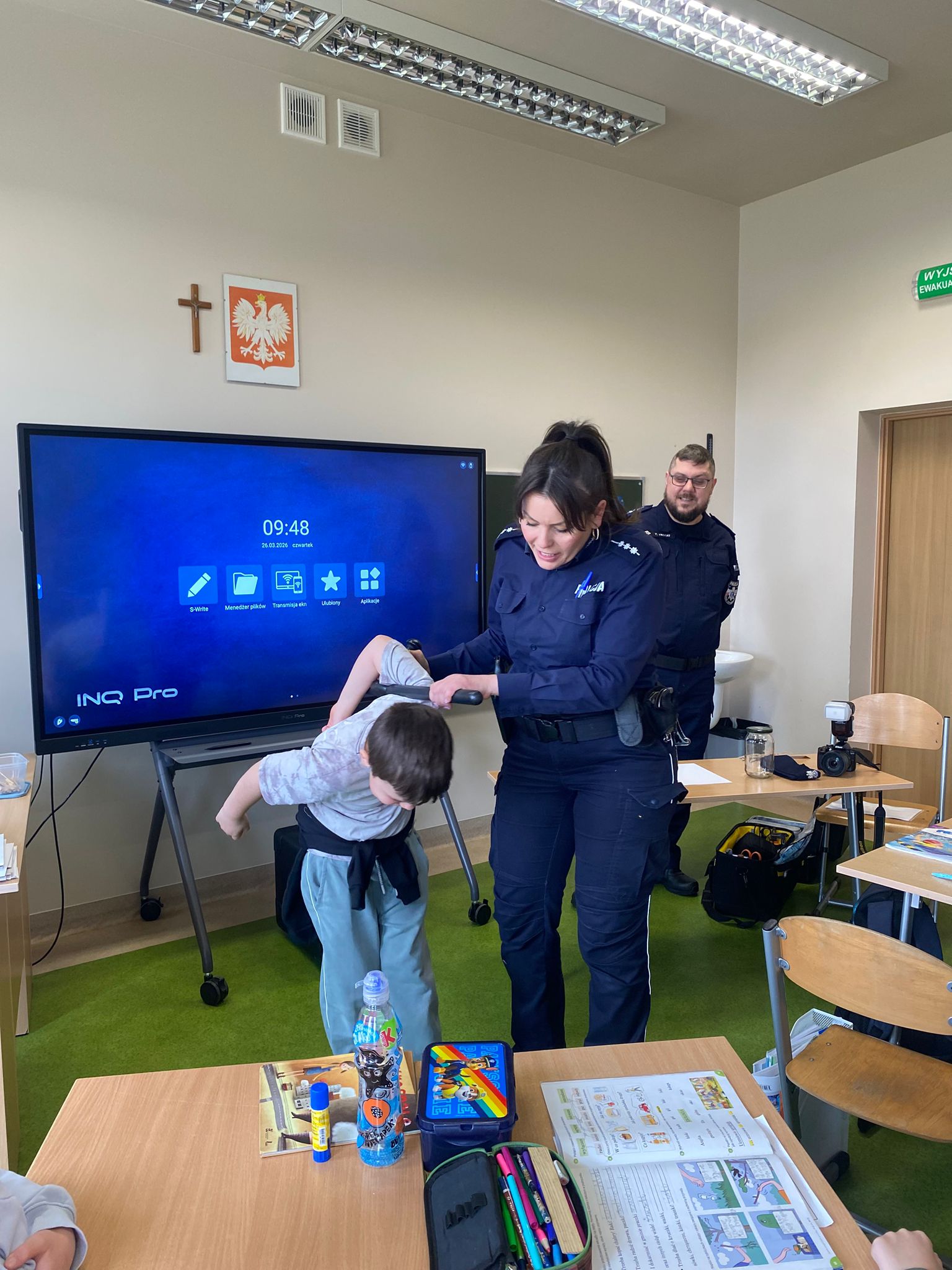 🐢⚠️ Uczniowie dowiedzieli się również, jak zachować się w sytuacji zagrożenia, np. podczas ataku zwierzęcia 🐕 – wspólnie przećwiczyli tzw. pozycję „żółwia”. Dużą atrakcją była możliwość obejrzenia policyjnego umundurowania 👕 oraz sprzętu, takiego jak kajdanki 🔗 czy pałka (tomfa). 🛡️