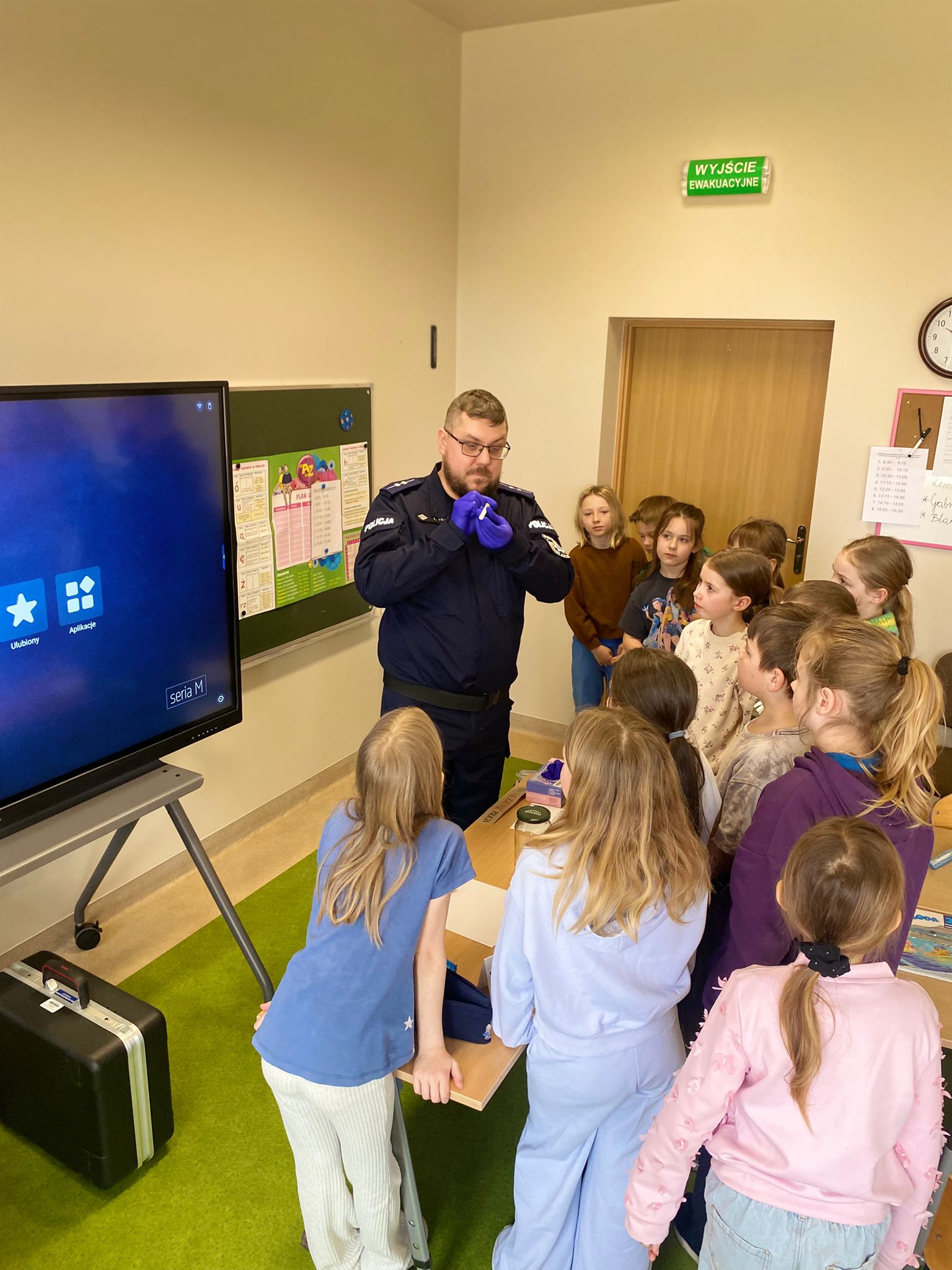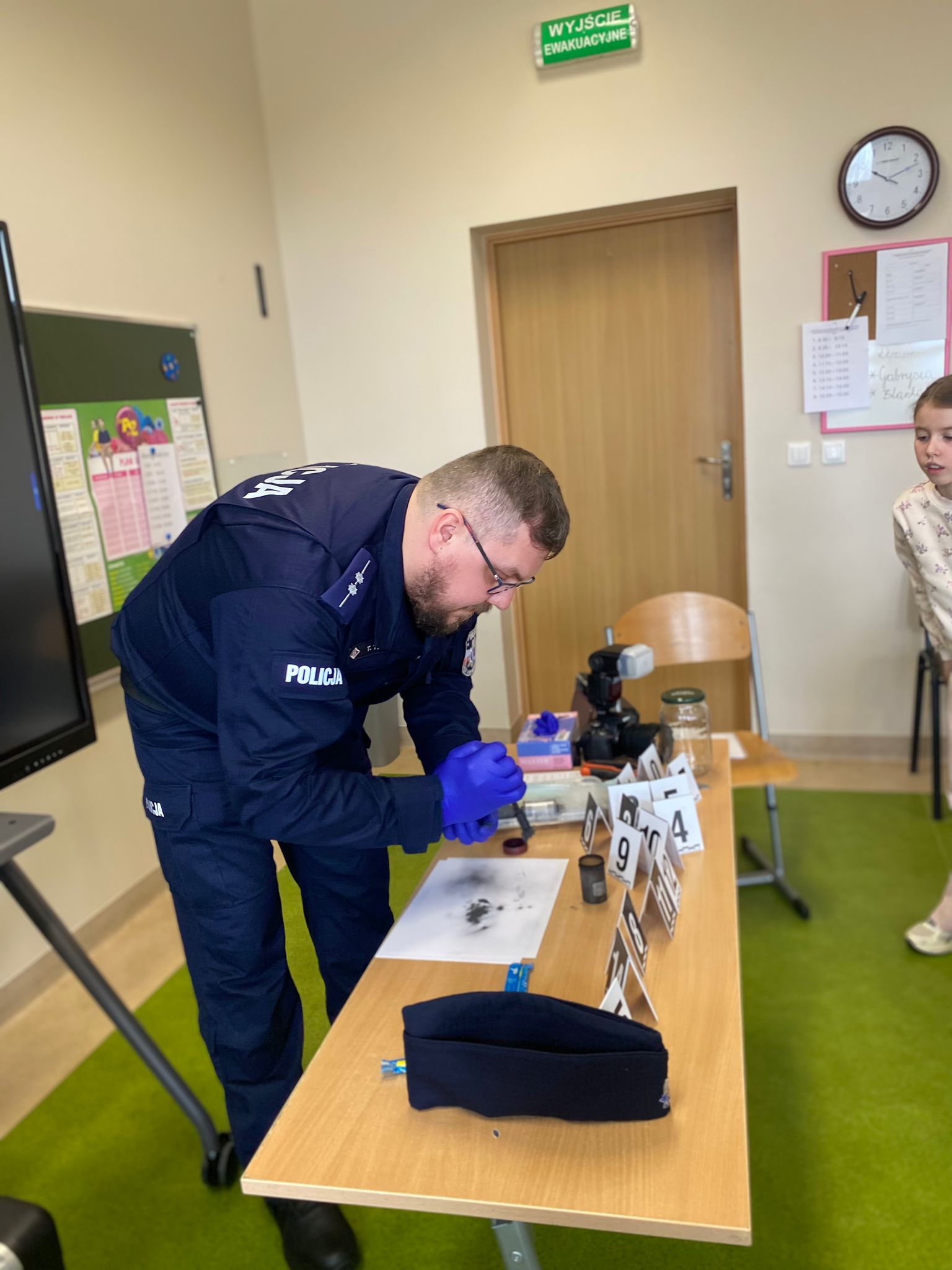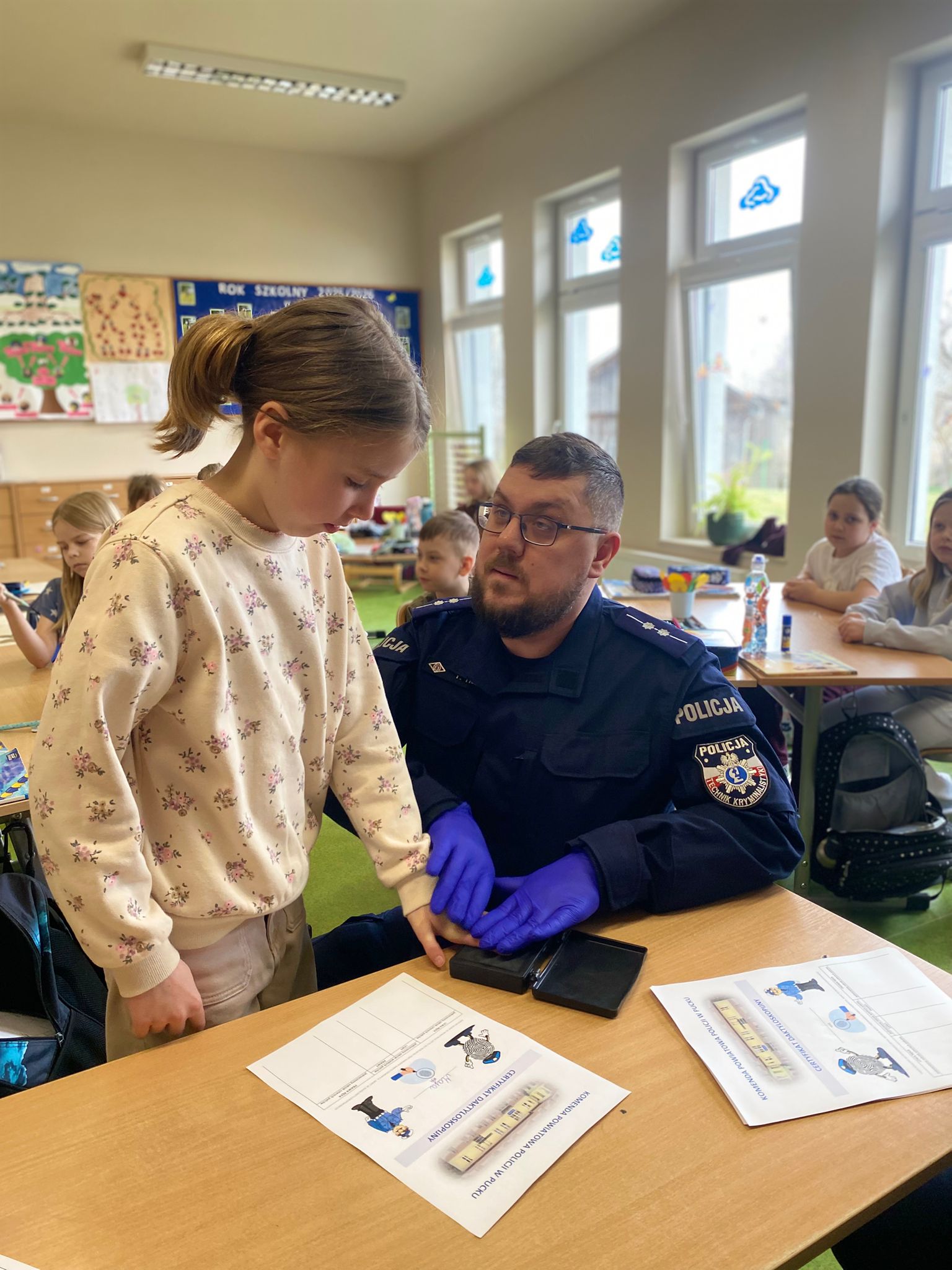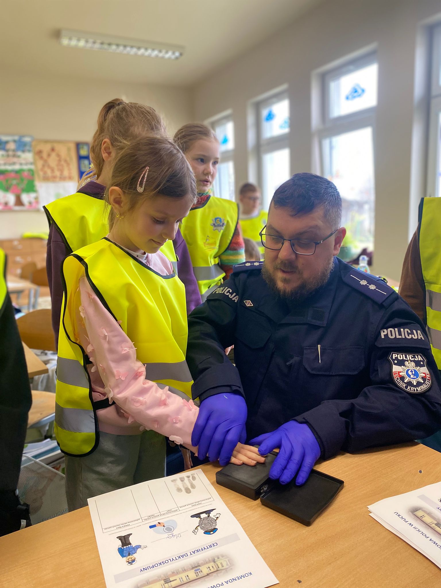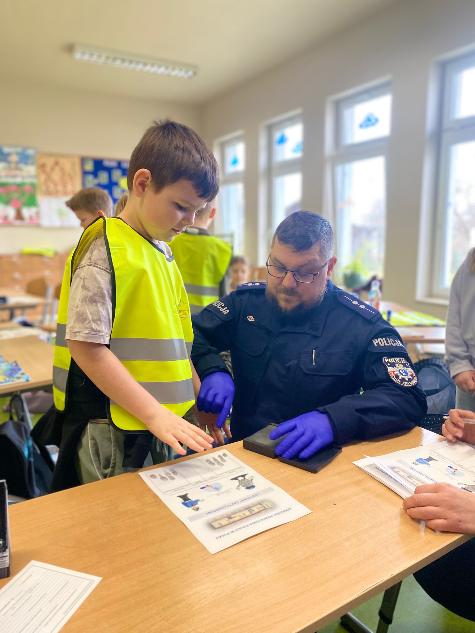 🧪🖐️ Pan Tomasz opowiedział o swojej pracy jako policyjny kryminolog 🔬. Przybliżył dzieciom, na czym polega zabezpieczanie śladów na miejscu zdarzenia, pobieranie odcisków palców oraz DNA 🧬. Największym zainteresowaniem cieszyła się praktyczna część zajęć – każde dziecko mogło samodzielnie oddać swoje odciski palców i otrzymało pamiątkowy certyfikat.📄✨