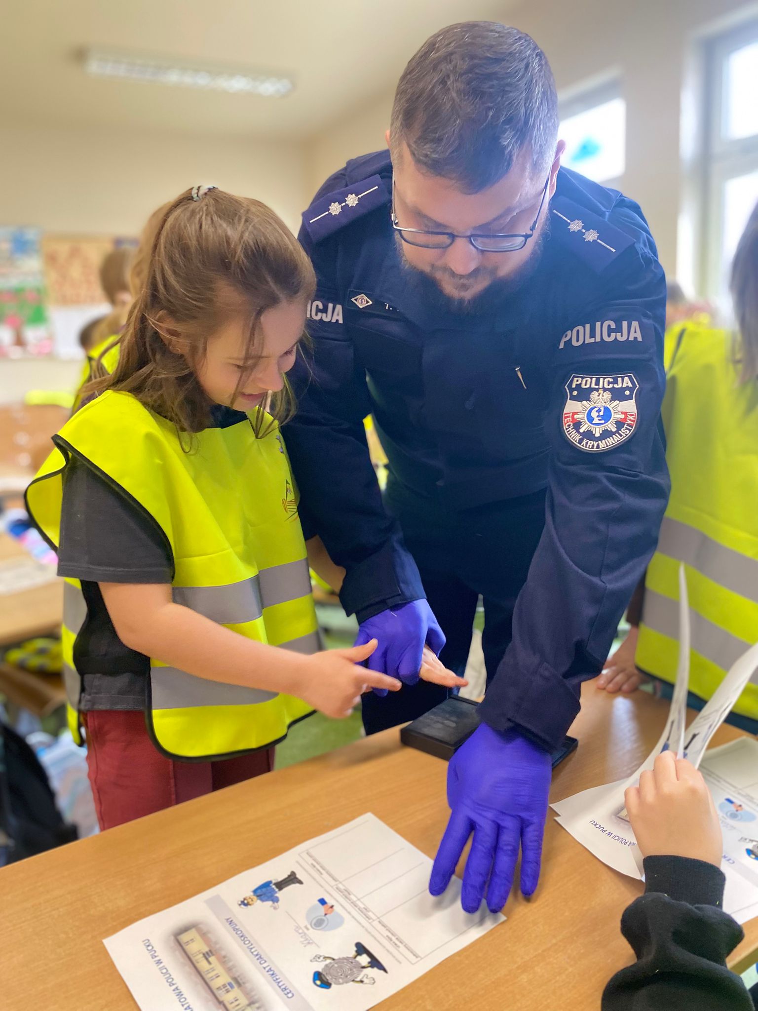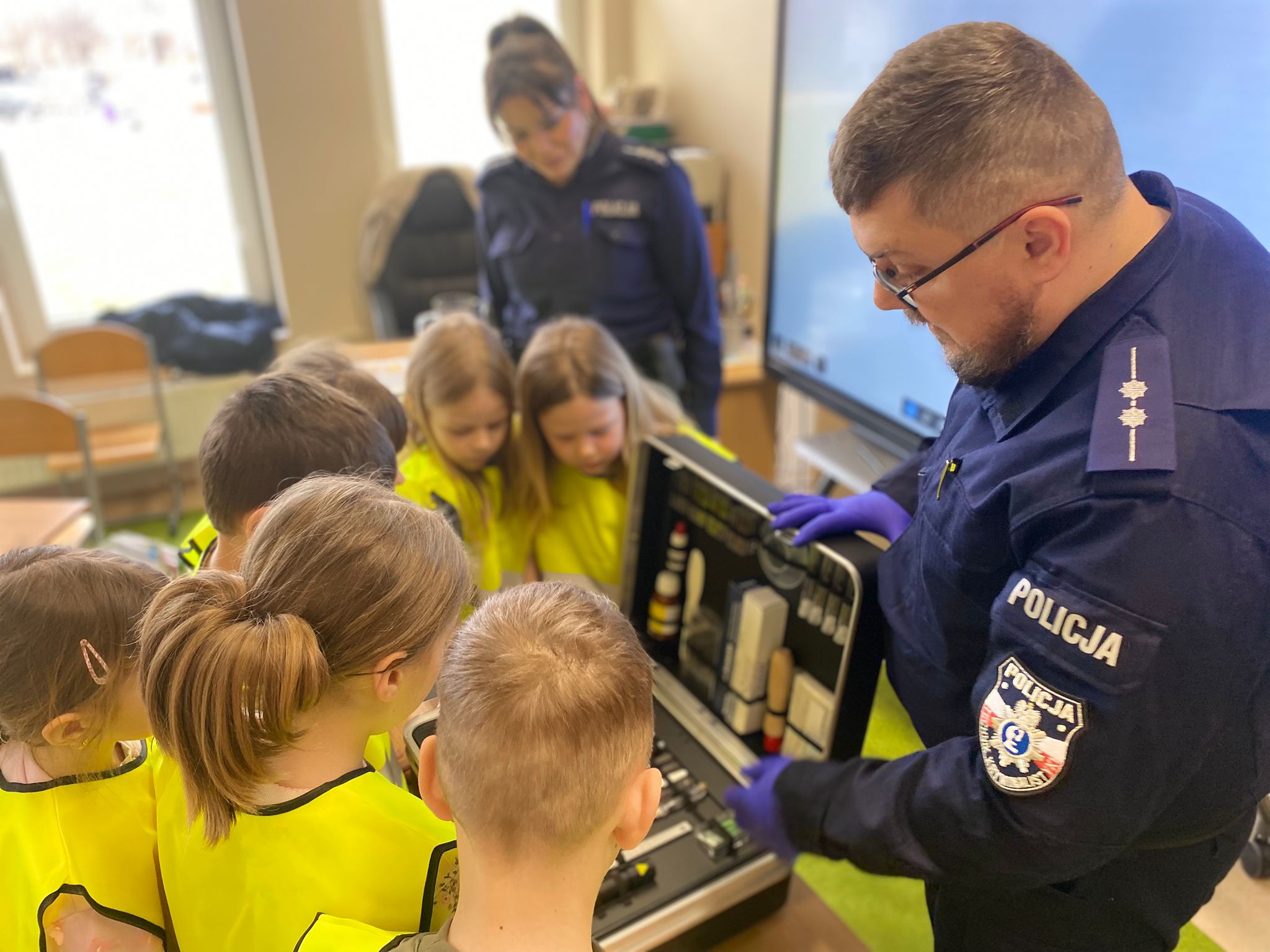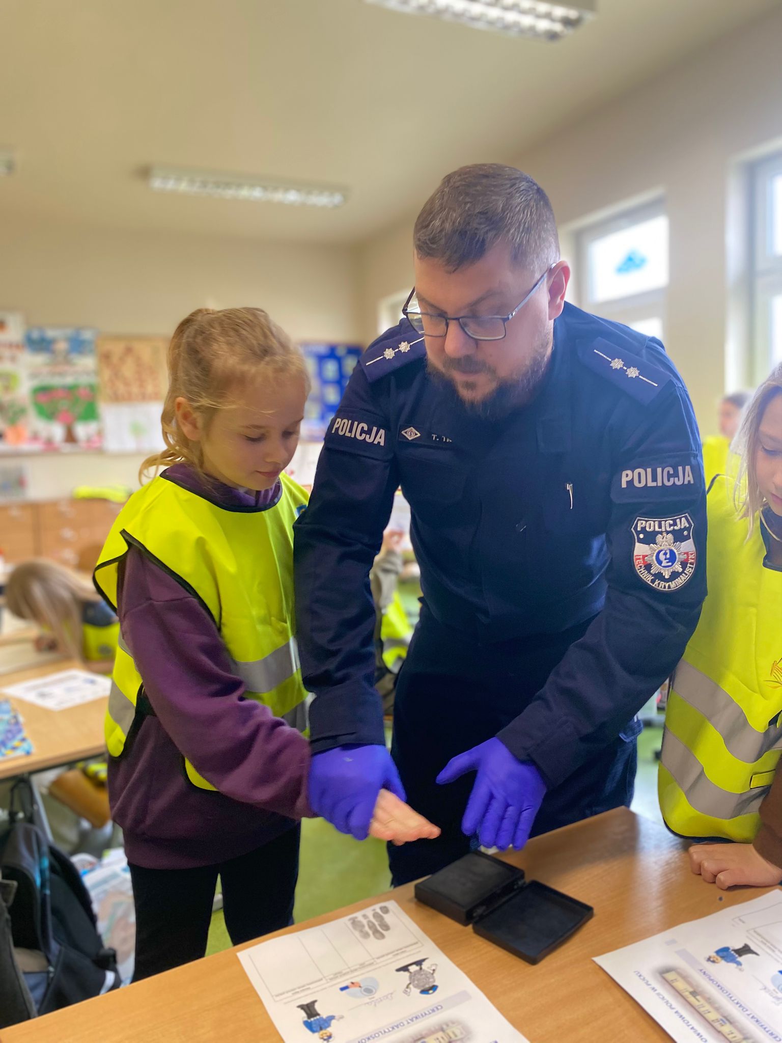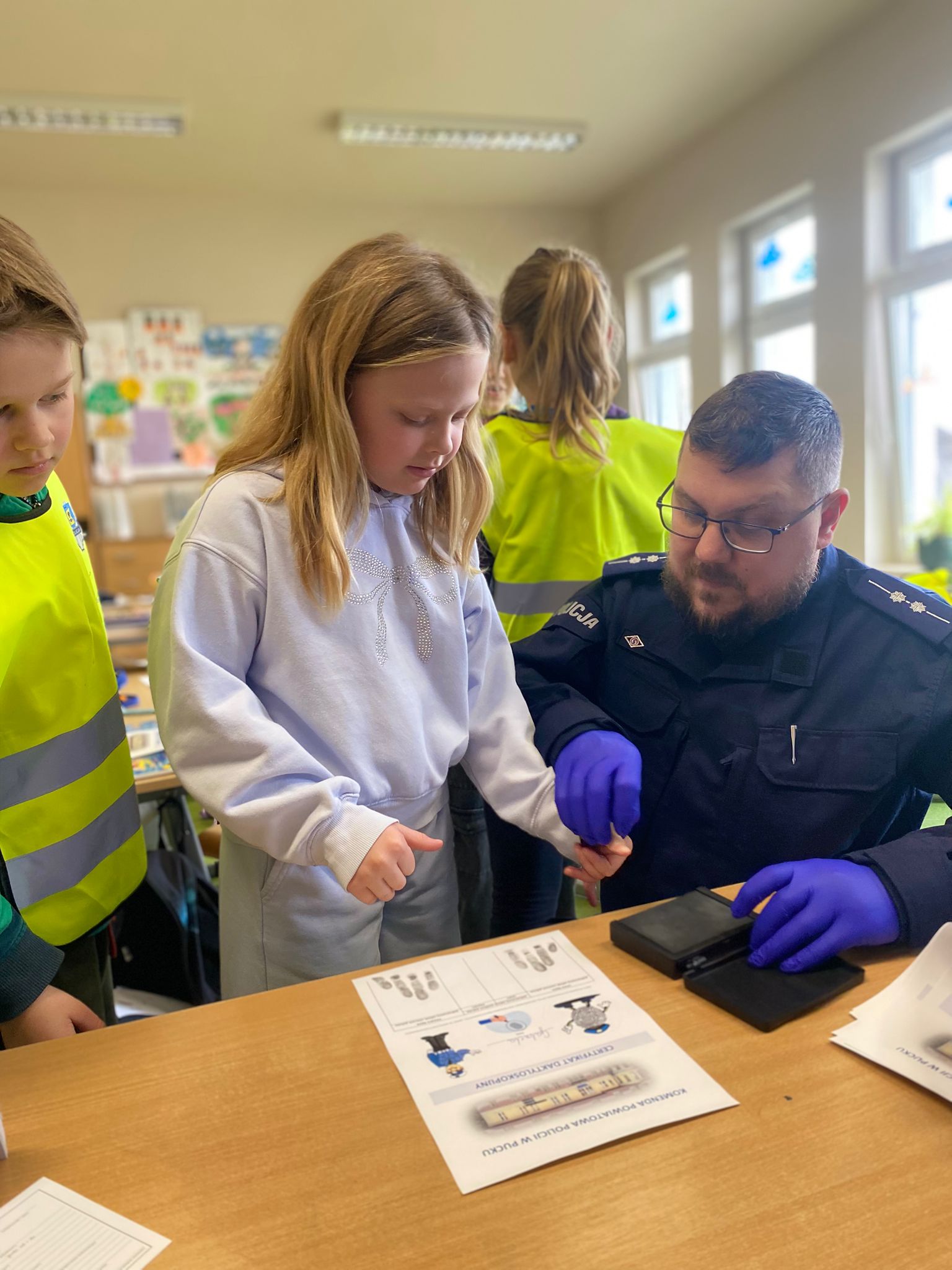 🧪🖐️ Pan Tomasz opowiedział o swojej pracy jako policyjny kryminolog 🔬. Przybliżył dzieciom, na czym polega zabezpieczanie śladów na miejscu zdarzenia, pobieranie odcisków palców oraz DNA 🧬. Największym zainteresowaniem cieszyła się praktyczna część zajęć – każde dziecko mogło samodzielnie oddać swoje odciski palców i otrzymało pamiątkowy certyfikat.📄✨