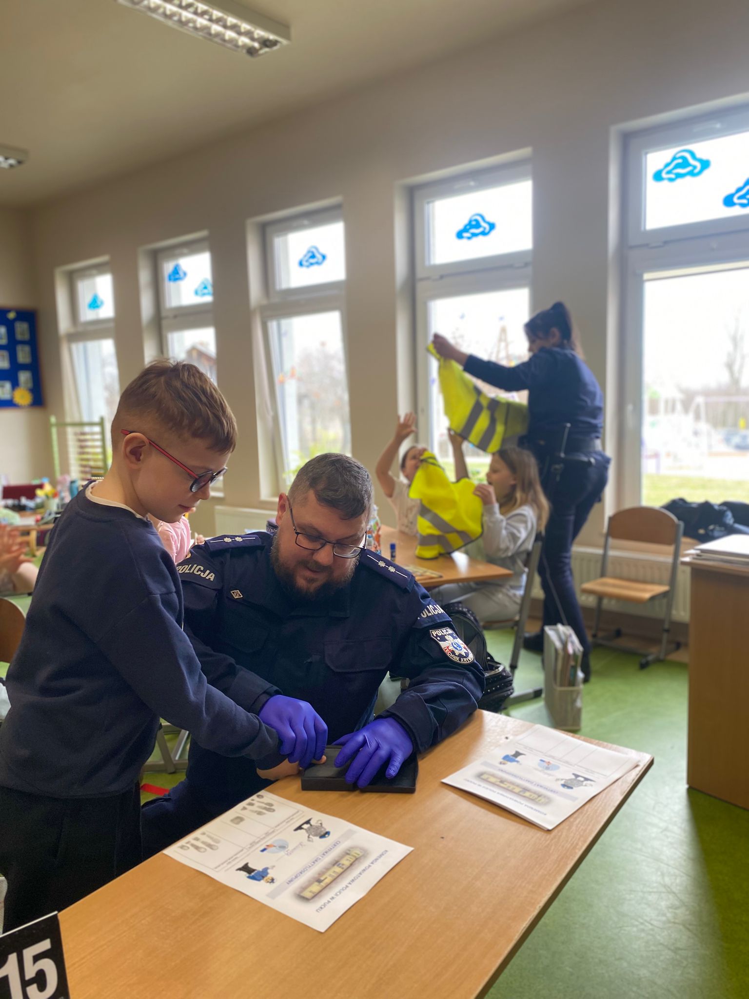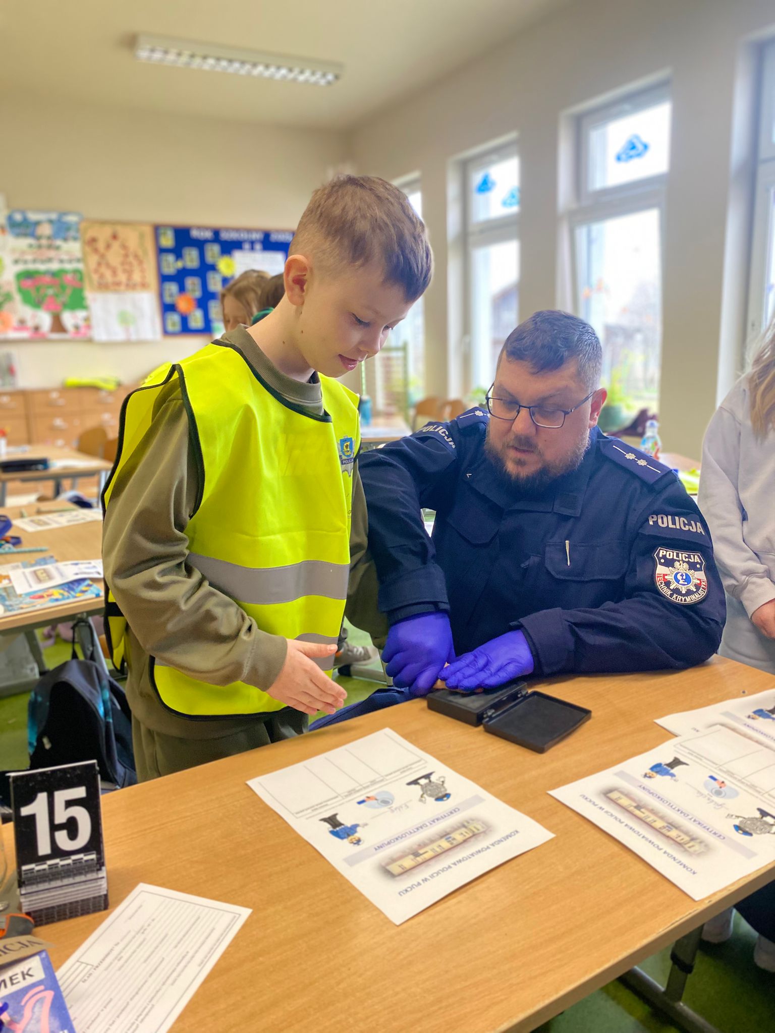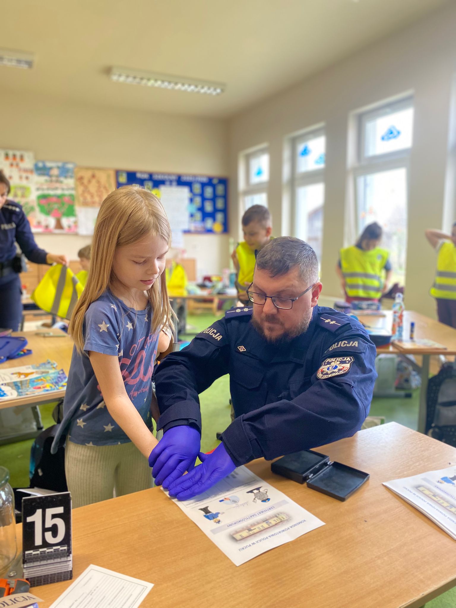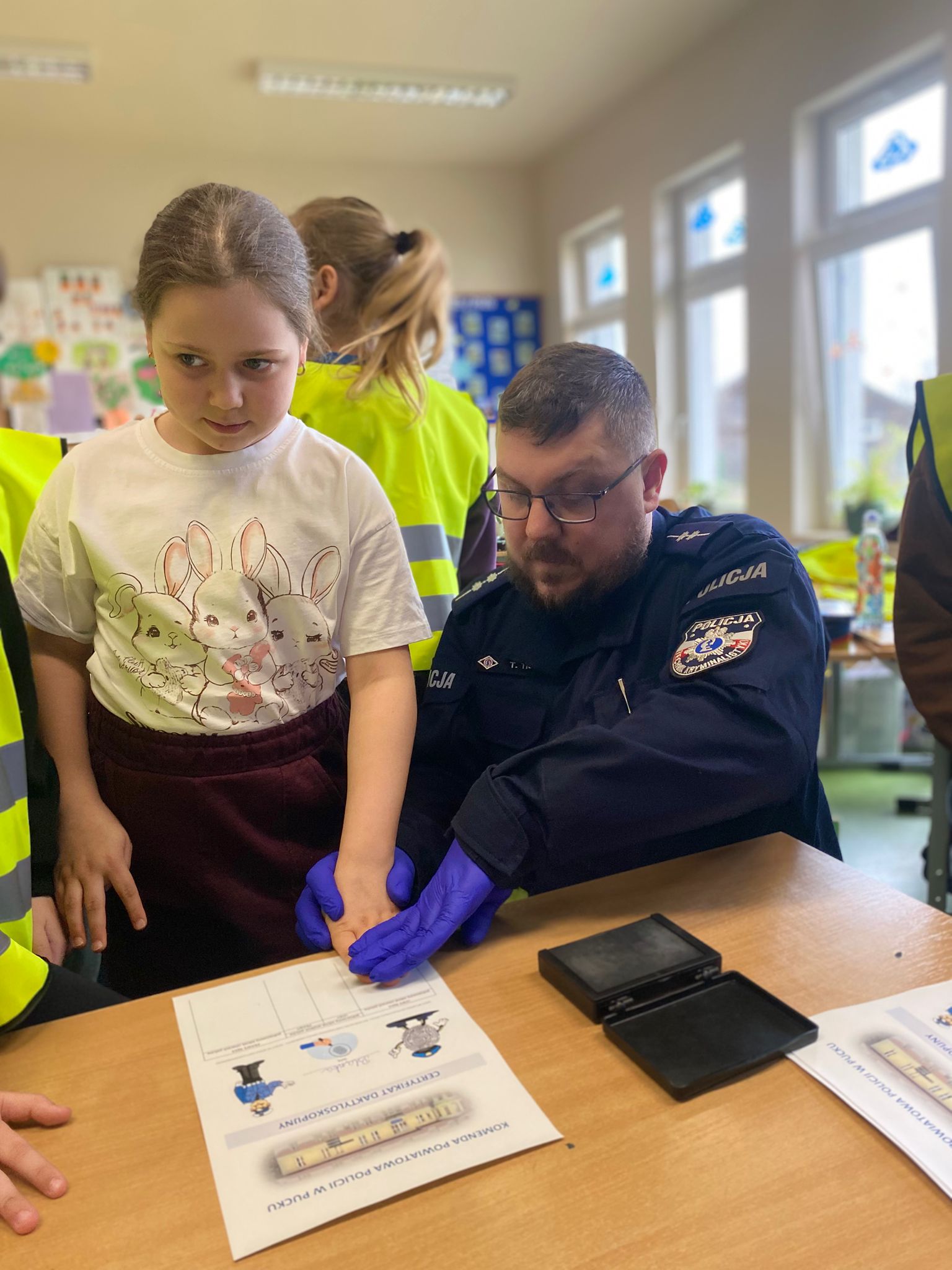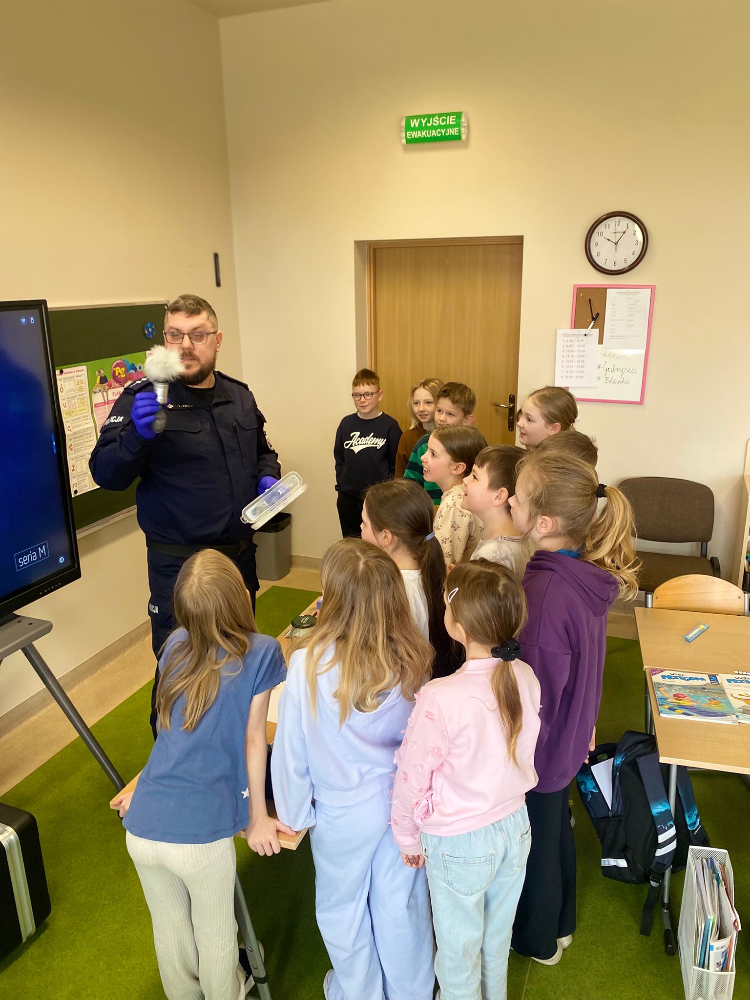 🧪🖐️ Pan Tomasz opowiedział o swojej pracy jako policyjny kryminolog 🔬. Przybliżył dzieciom, na czym polega zabezpieczanie śladów na miejscu zdarzenia, pobieranie odcisków palców oraz DNA 🧬. Największym zainteresowaniem cieszyła się praktyczna część zajęć – każde dziecko mogło samodzielnie oddać swoje odciski palców i otrzymało pamiątkowy certyfikat.📄✨