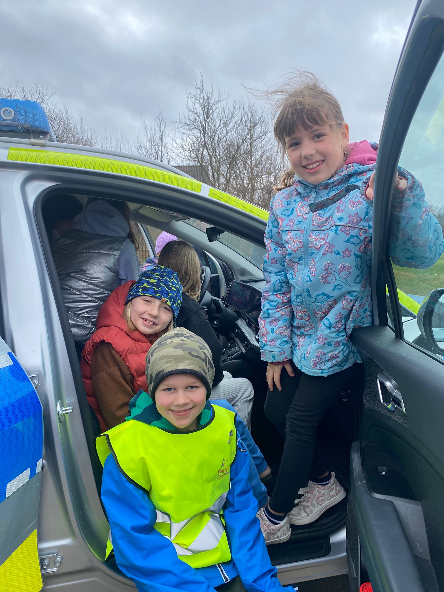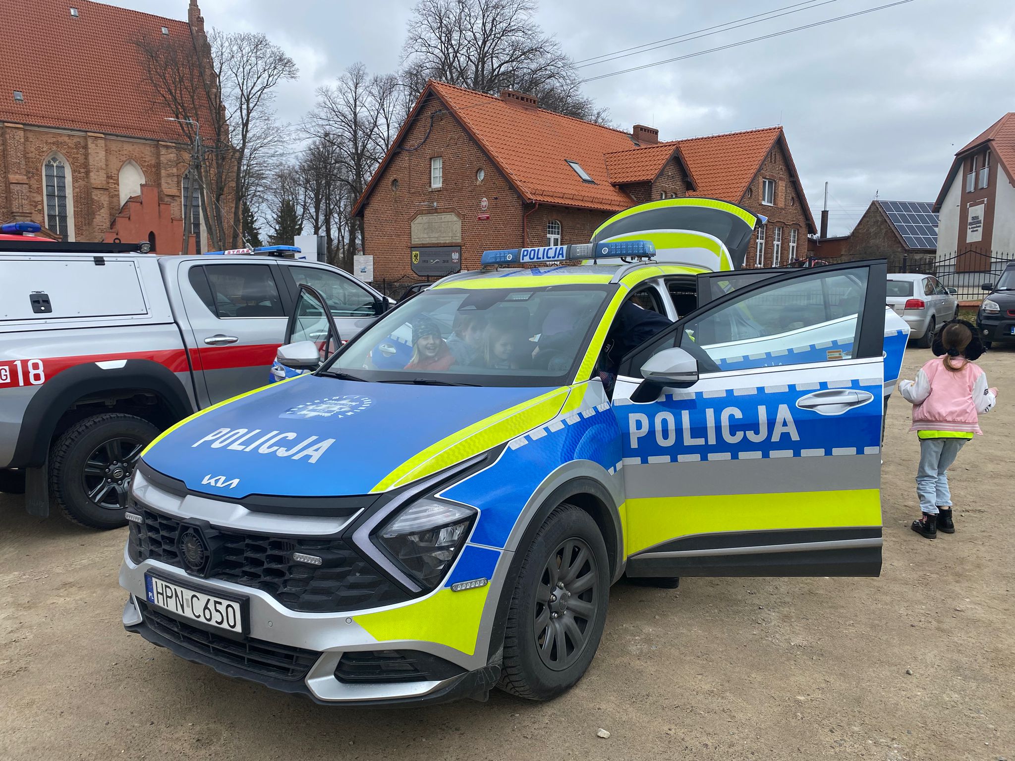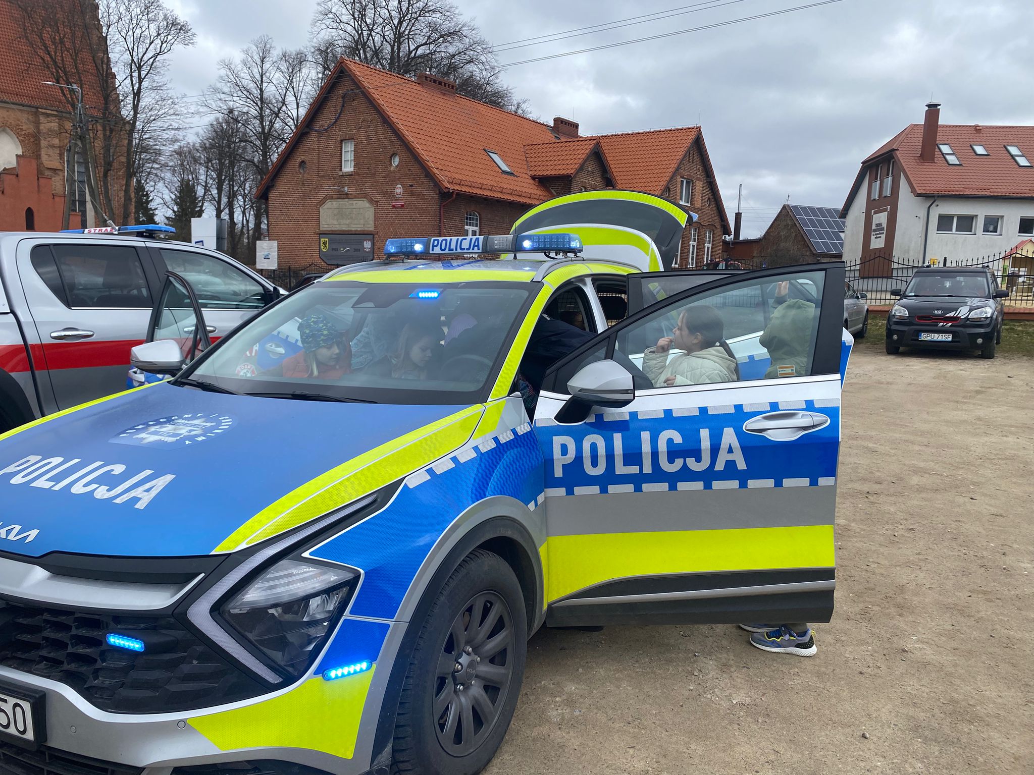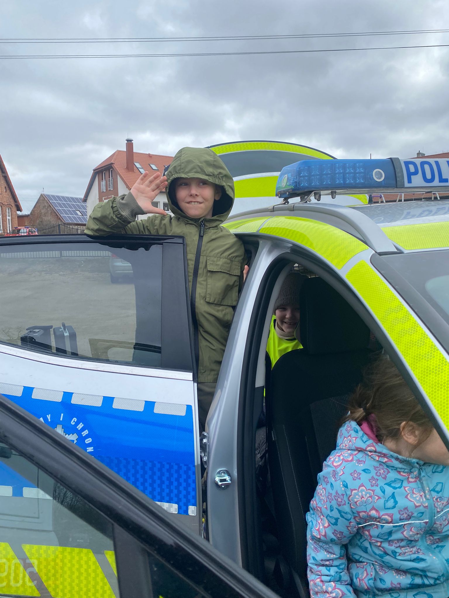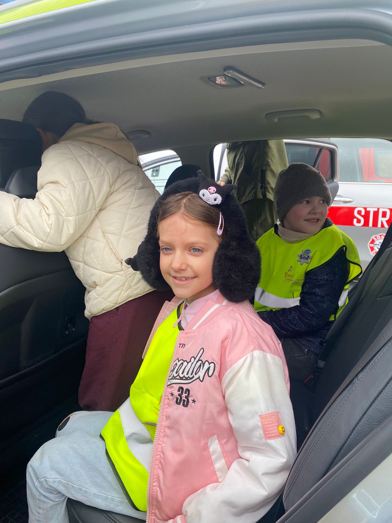 🚓🎉 Na zakończenie uczniowie odprowadzili policjantów do radiowozu, gdzie mogli do niego wsiąść i poczuć się jak prawdziwi funkcjonariusze 👮♂️💺. Dodatkowo dzieci otrzymały kamizelki odblaskowe 🦺 – za co serdecznie dziękujemy! 🙏💛