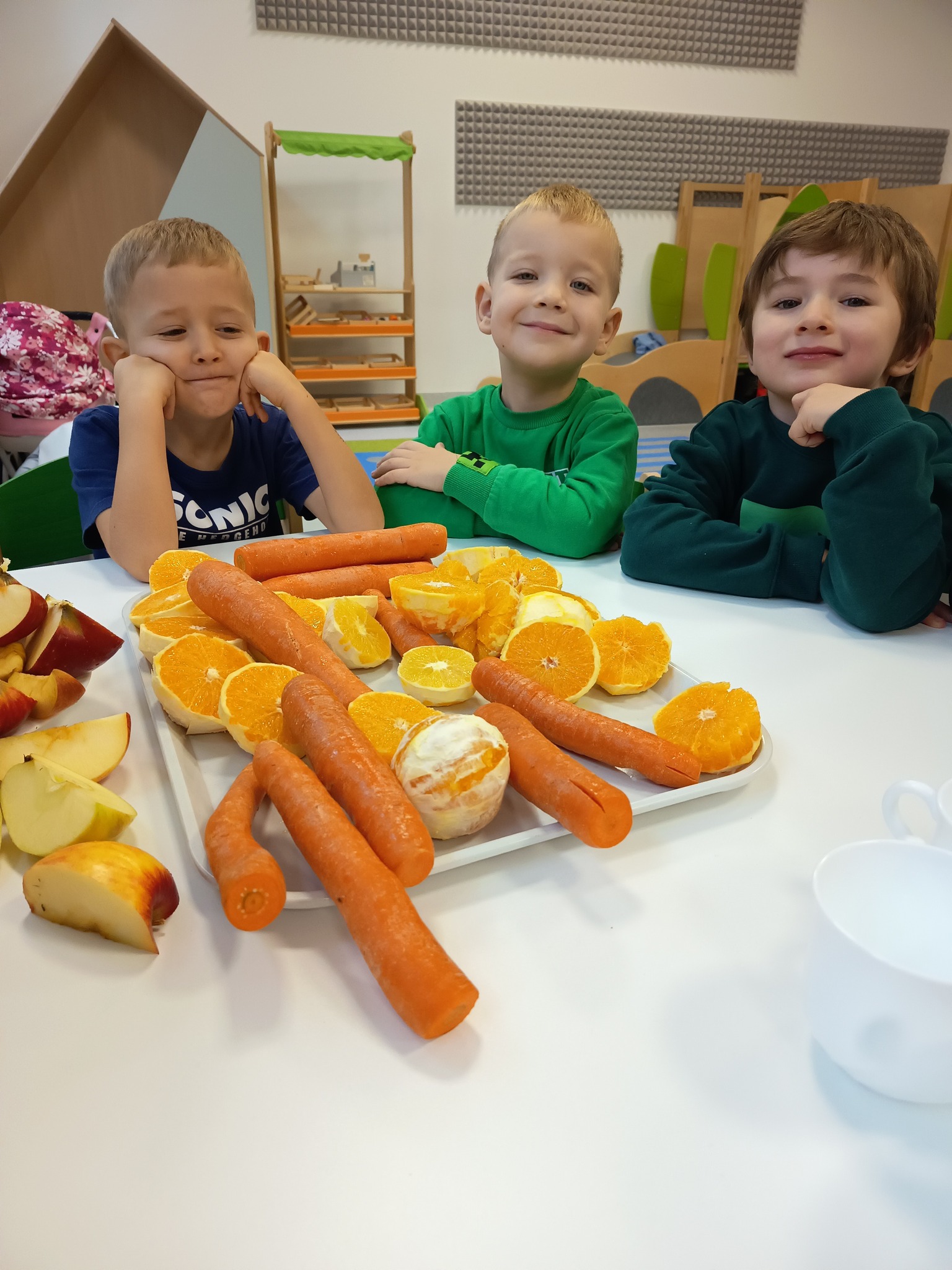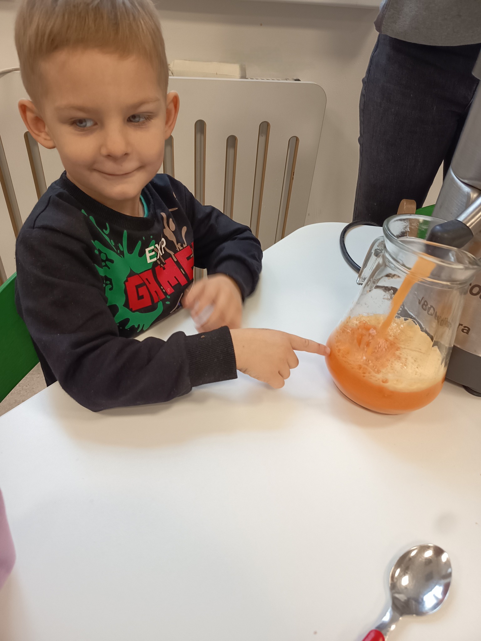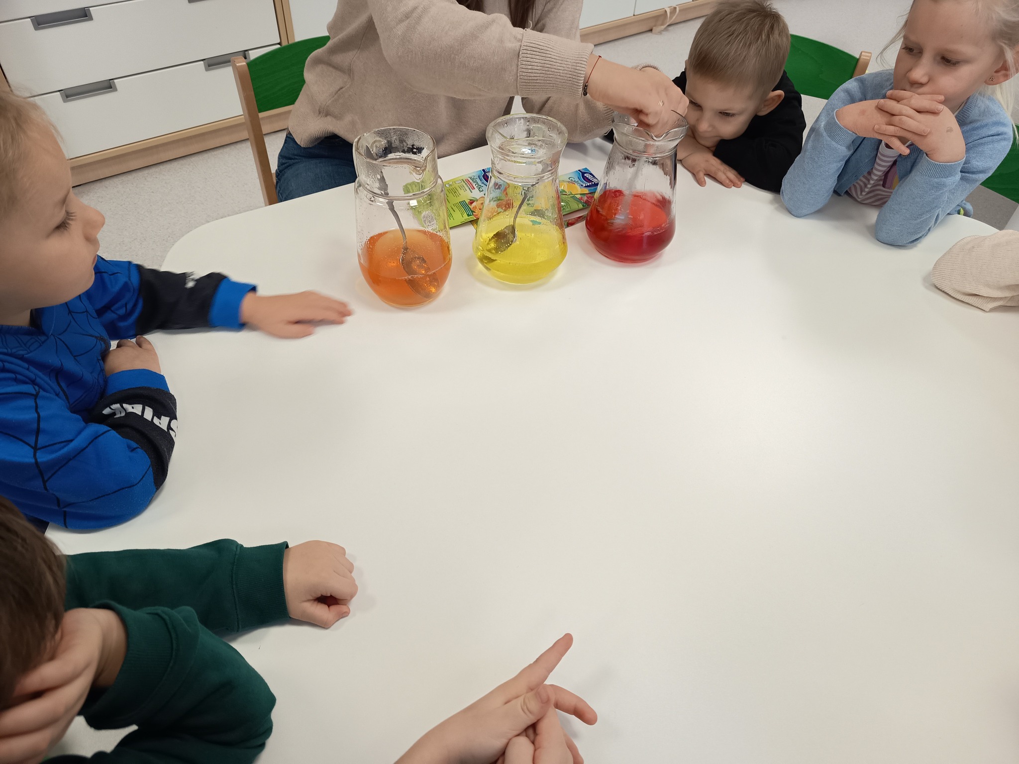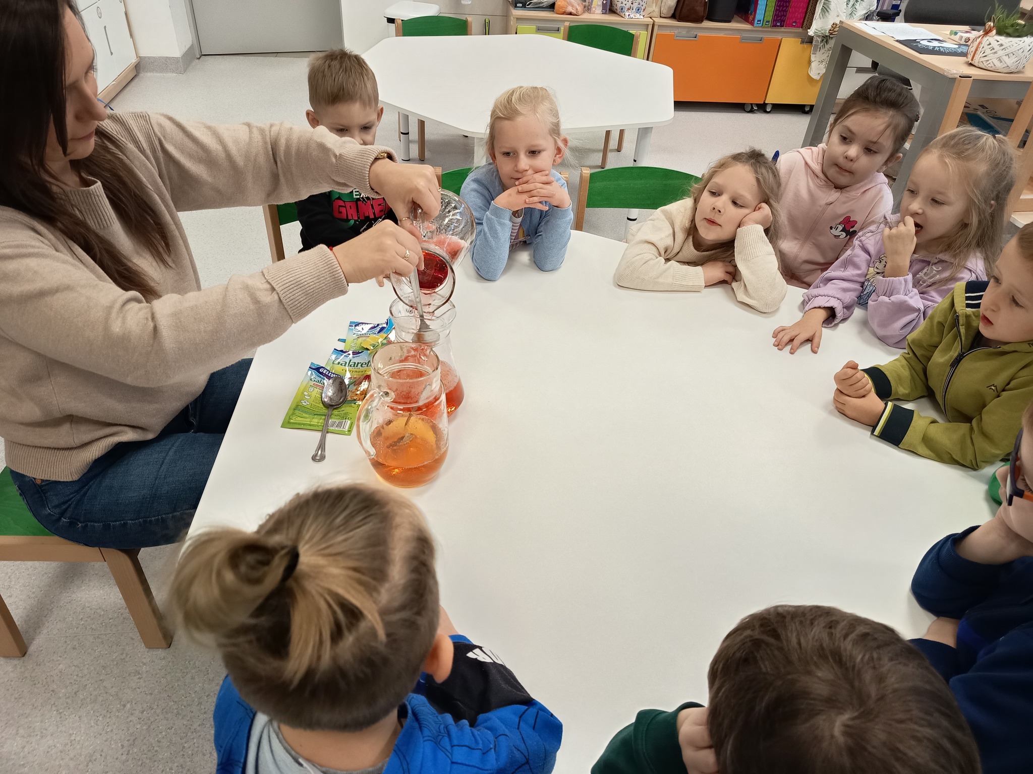 Dzisiaj przedszkolaki z grupy "Żabek" bawiły się z kolorem pomarańczowym. Pachniało, smakowało i "trzęsło się jak galareta". Dzieci piły świeżo wyciskany sok z pomarańczowych warzyw i owoców, przeprowadziły eksperyment "Czy galaretka w kolorze pomarańczowym musi spakować pomarańczami?" oraz miały okazję przypomnieć sobie z jakich kolorów tworzymy kolor pomarańczowy. To był bardzo pomarańczowy dzień 😉.