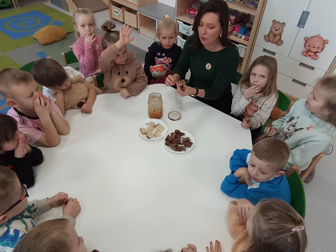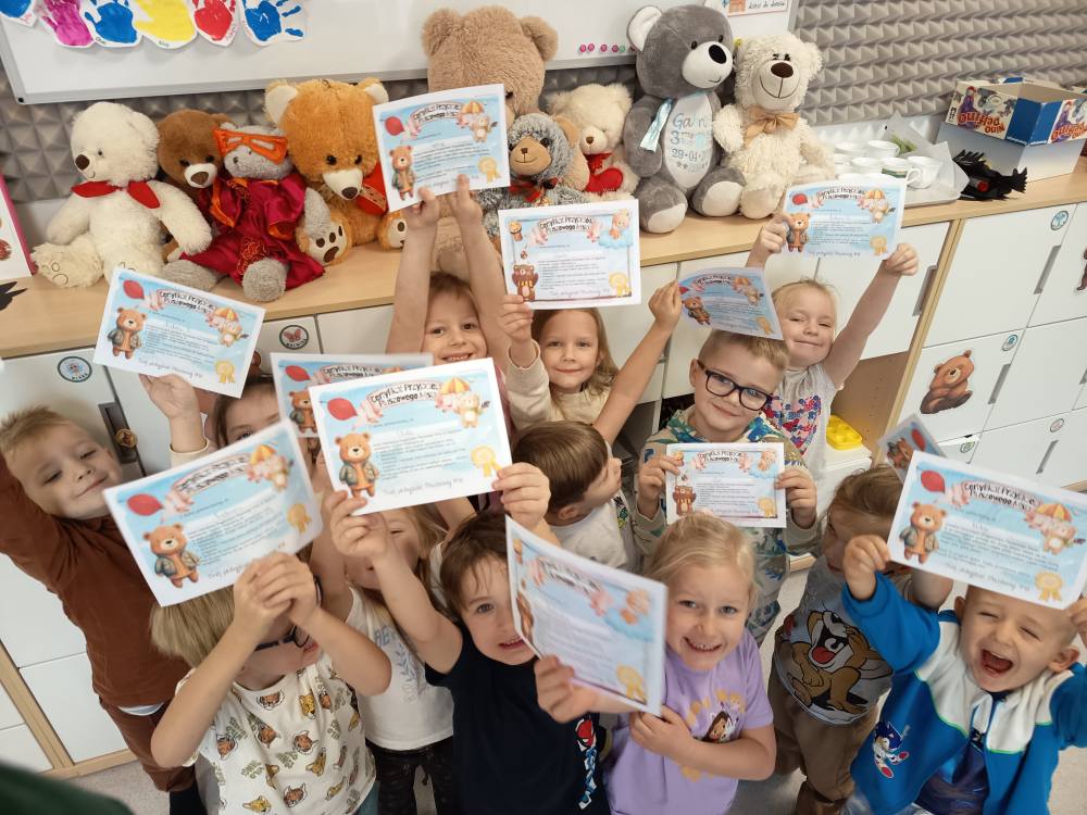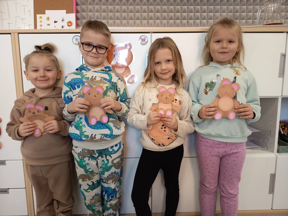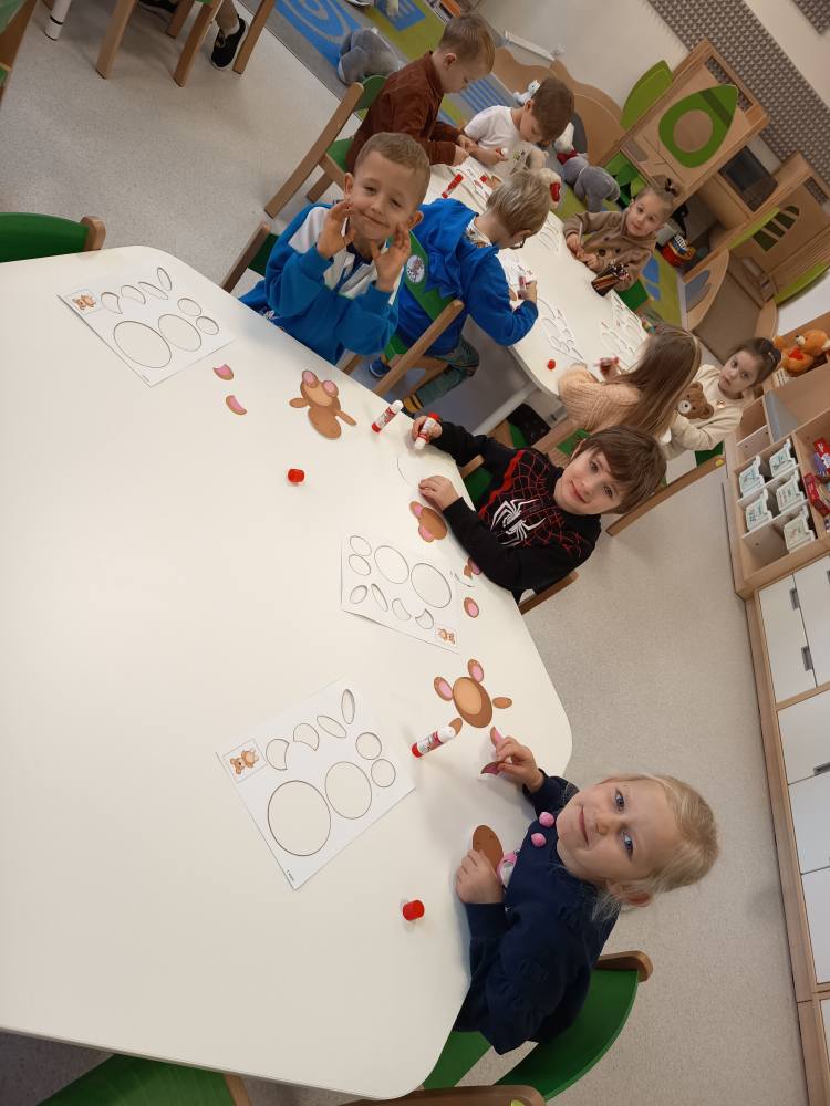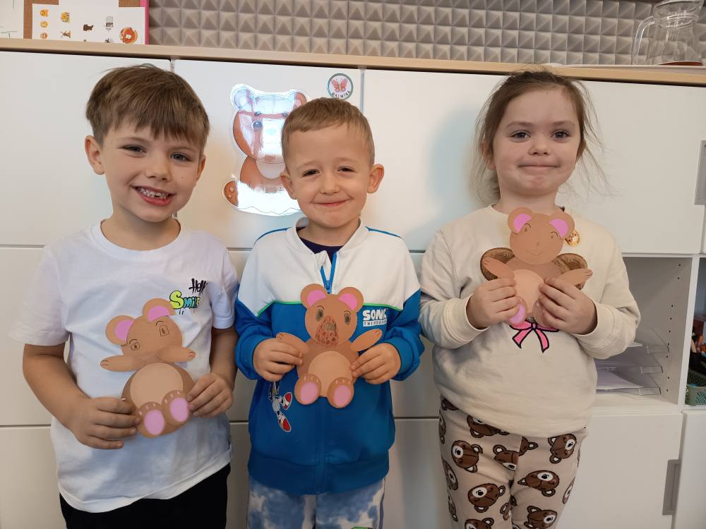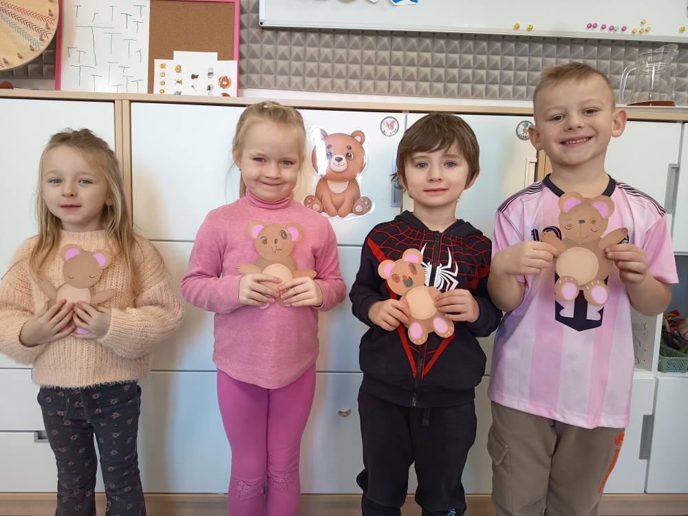 Dzisiaj Żabki rozpoczęły dzień od gimnastyki z Pluszowym Misiem, następnie czekały na nie zagadki obrazkowe ze sławnymi misiami. Po całej zabawie mały głodek zaspokoiły misiowym przysmakiem - miodkiem. Każde z dzieci otrzymało "Certyfikat Przyjaciela Pluszowego Misia". To był bardzo intensywny dzień z mnóstwem śmiechu.